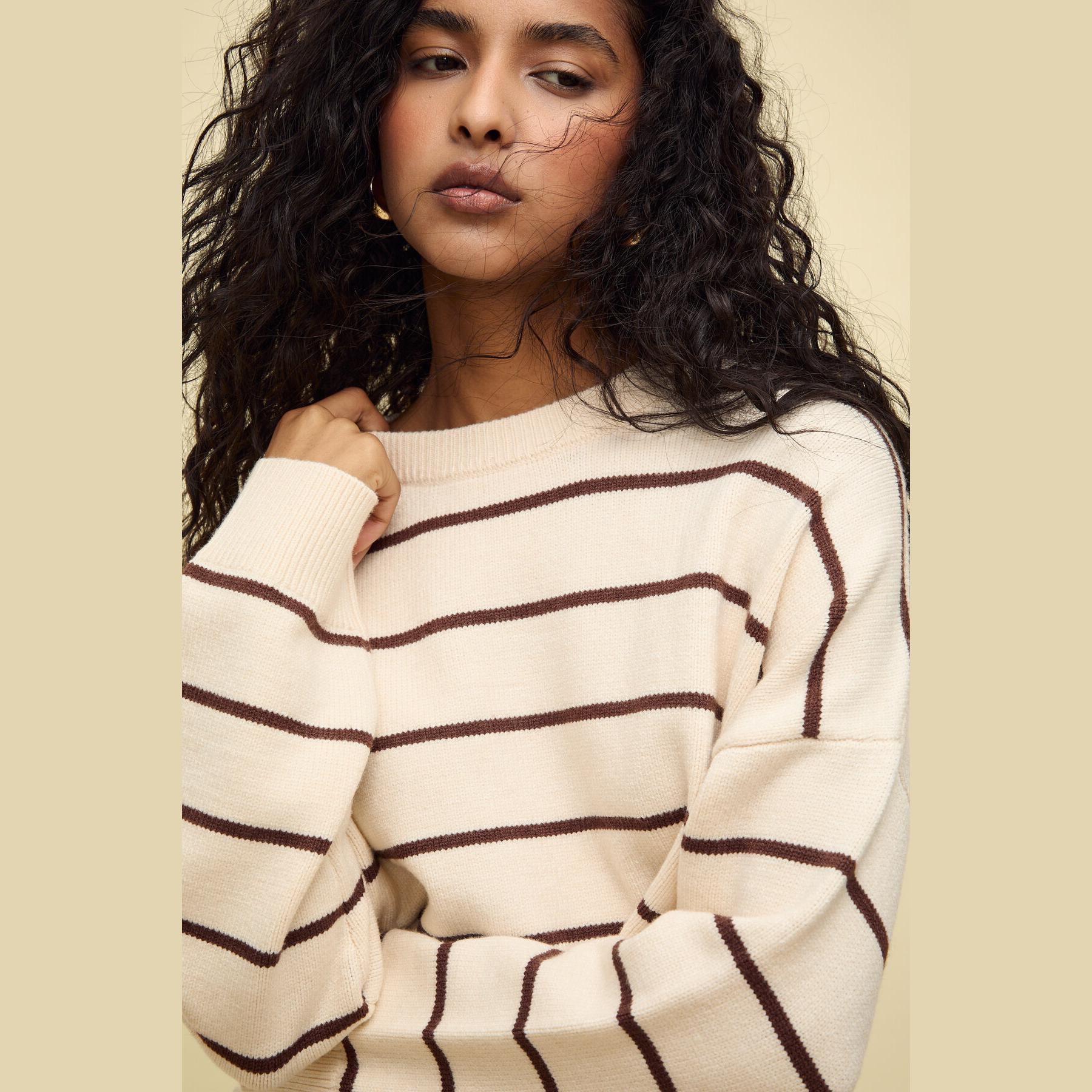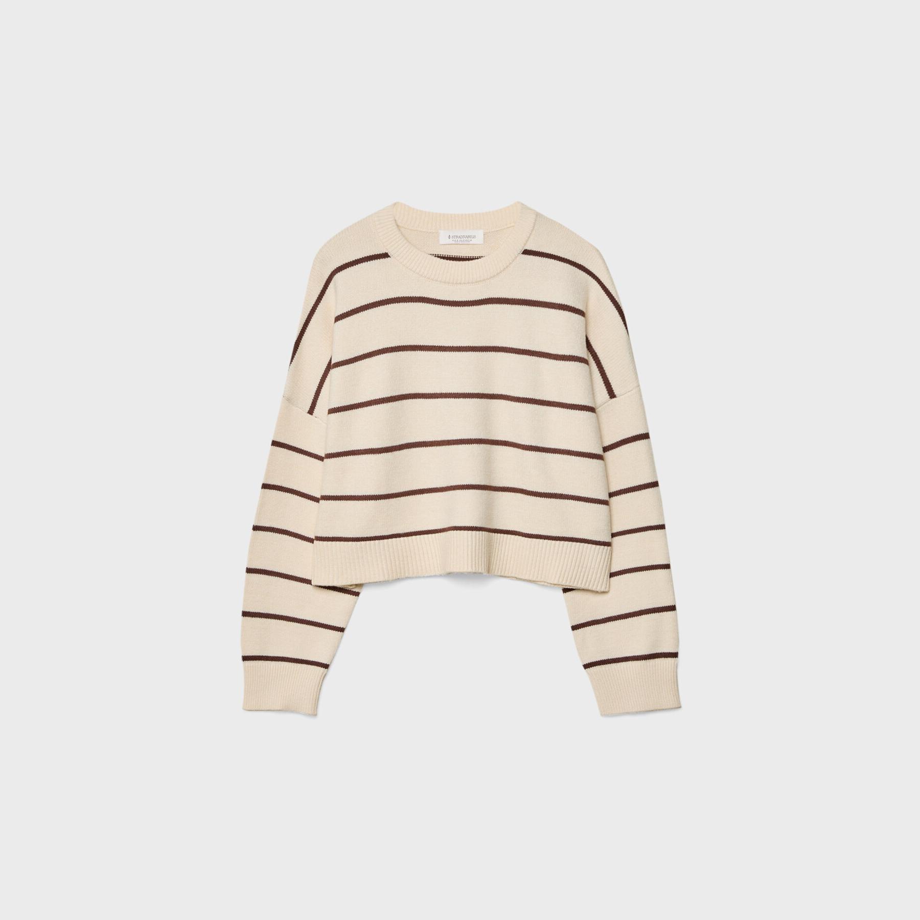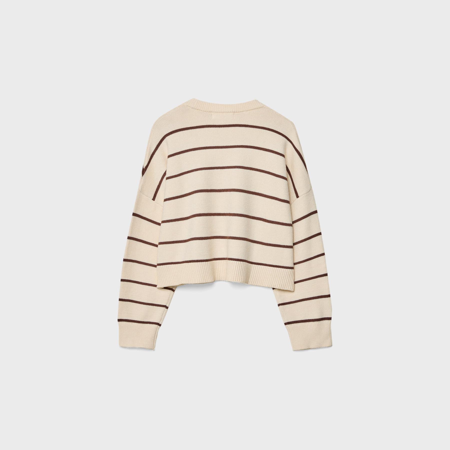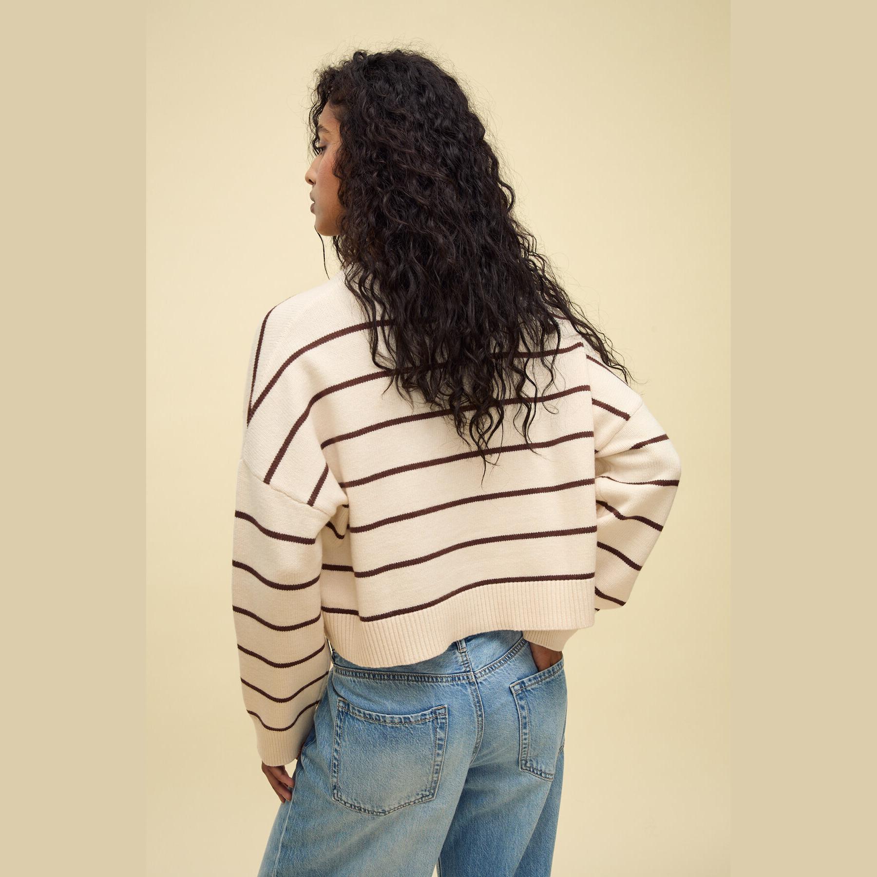 كنزة قصيرة أنيقة من Stradivarius بلون إكرو مع نقشة مخططة، مصنوعة من خامة تريكو ناعمة ومرنة، بتصميم Crop Fit وياقة مستديرة، مزودة بأكمام طويلة وأطراف مضلعة، تمنحك إطلالة شبابية وعصرية مثالية للاستخدام اليومي أو الكاجوال.
