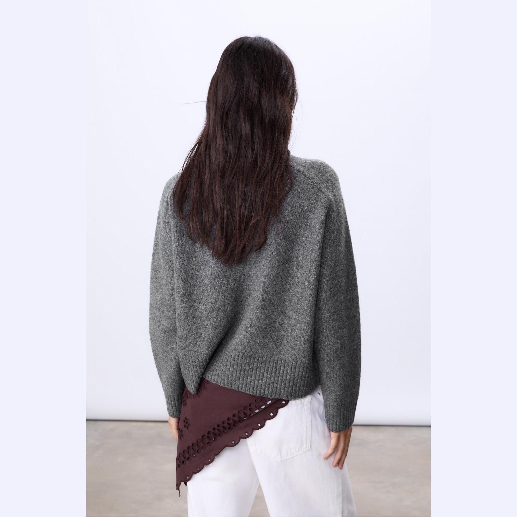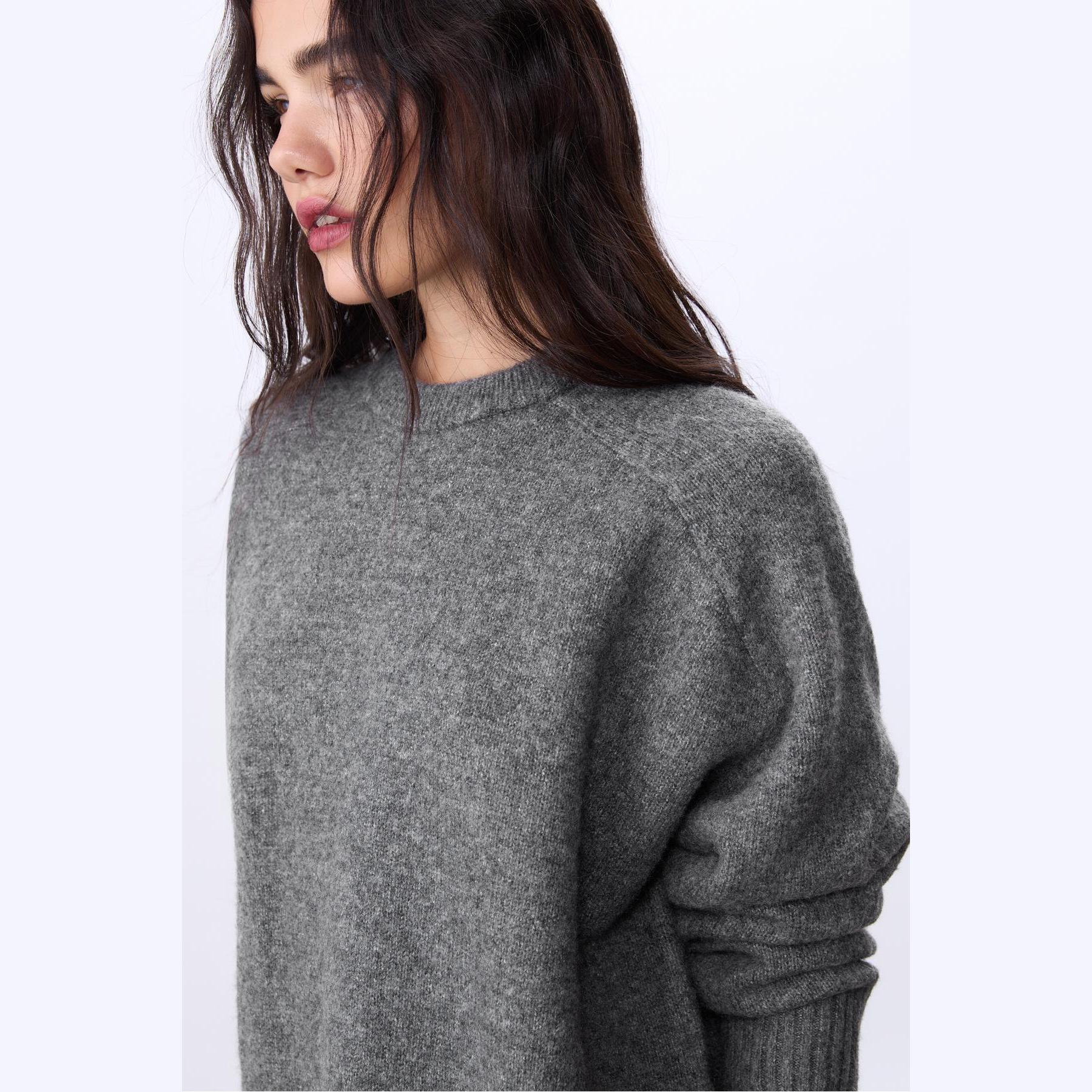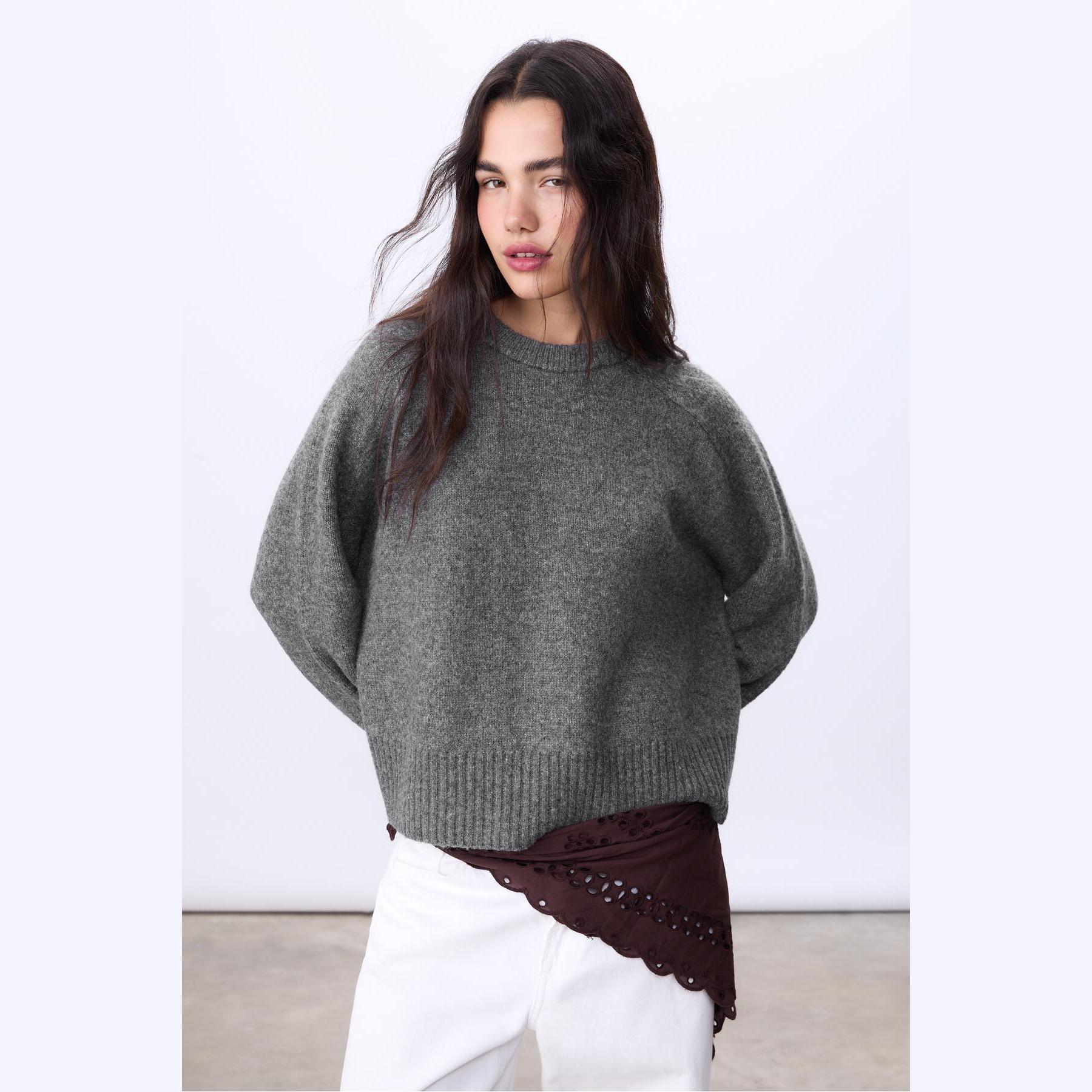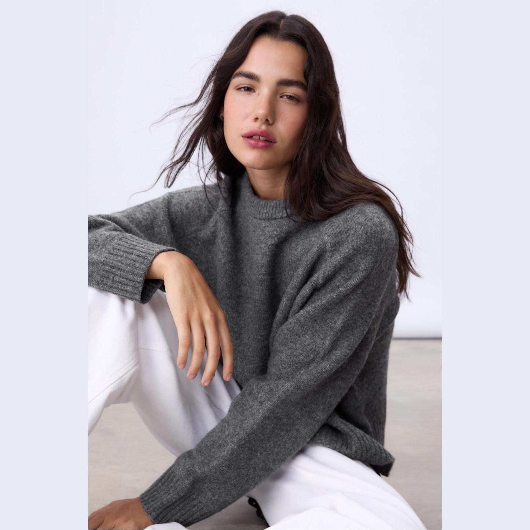 كنزة أنيقة من Stradivarius بلون رمادي داكن، مصنوعة من خامة تريكو ناعمة بملمس مريح، بتصميم Straight Fit وياقة مستديرة، مزودة بأكمام طويلة وأطراف مضلعة، تمنحك إطلالة دافئة وعصرية مثالية للاستخدام اليومي أو المكتبي.