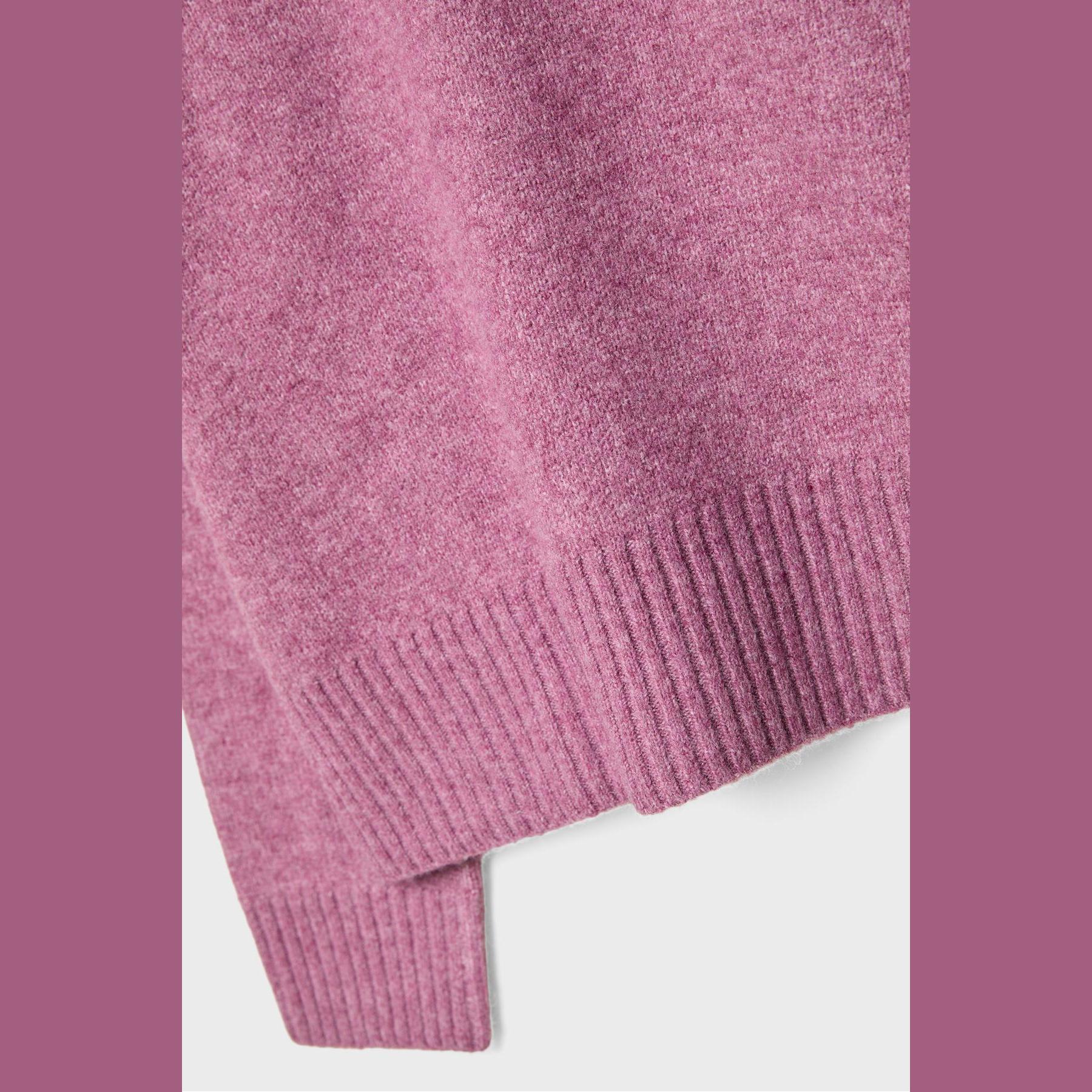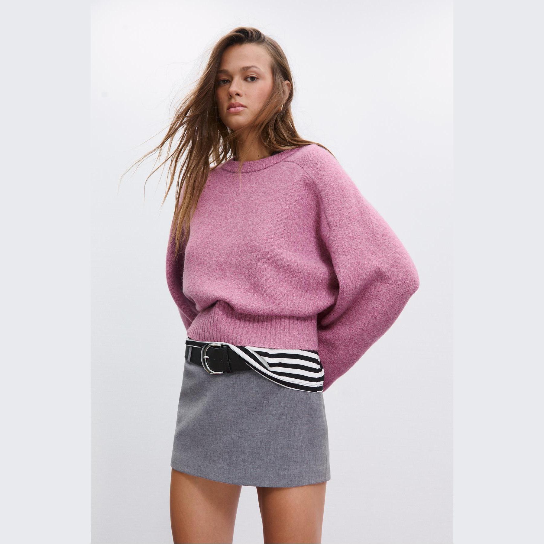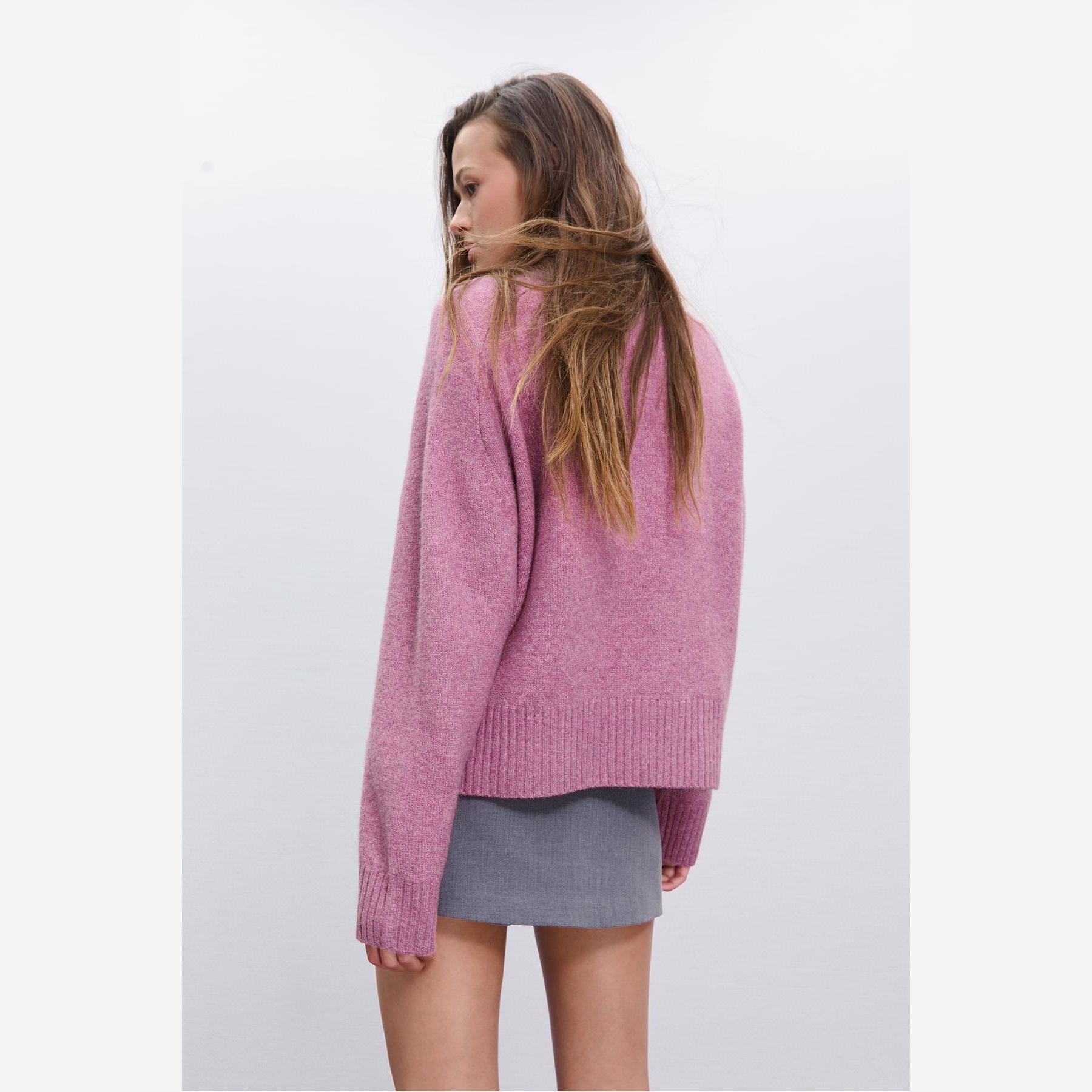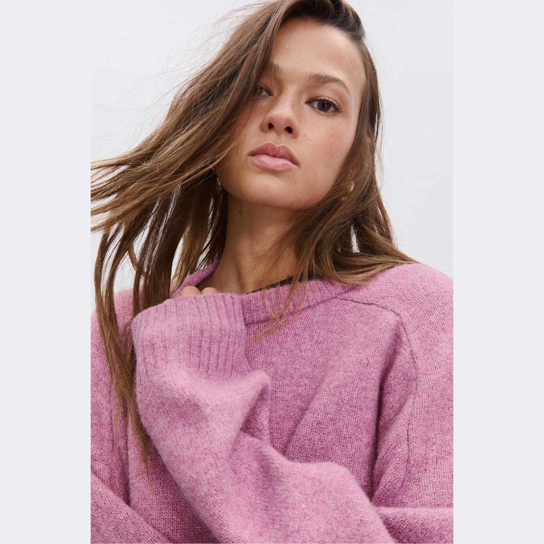كنزة أنيقة من Stradivarius بلون بنفسجي مع نقشة مخططة، مصنوعة من خامة تريكو ناعمة بملمس مريح، بتصميم Straight Fit وياقة مستديرة، مزودة بأكمام طويلة وأطراف مضلعة، تمنحك إطلالة دافئة وعصرية مثالية للاستخدام اليومي أو المكتبي.