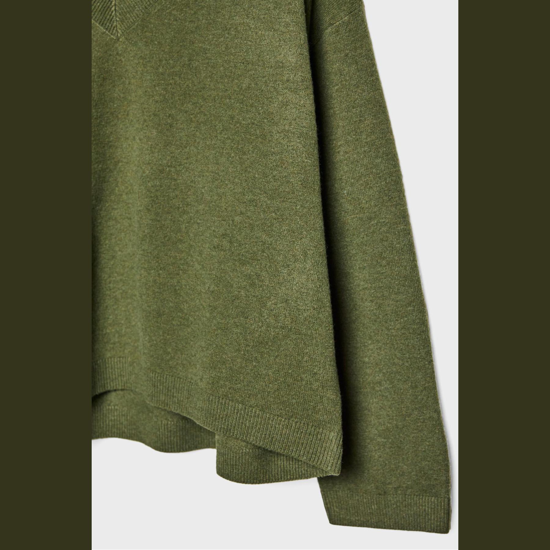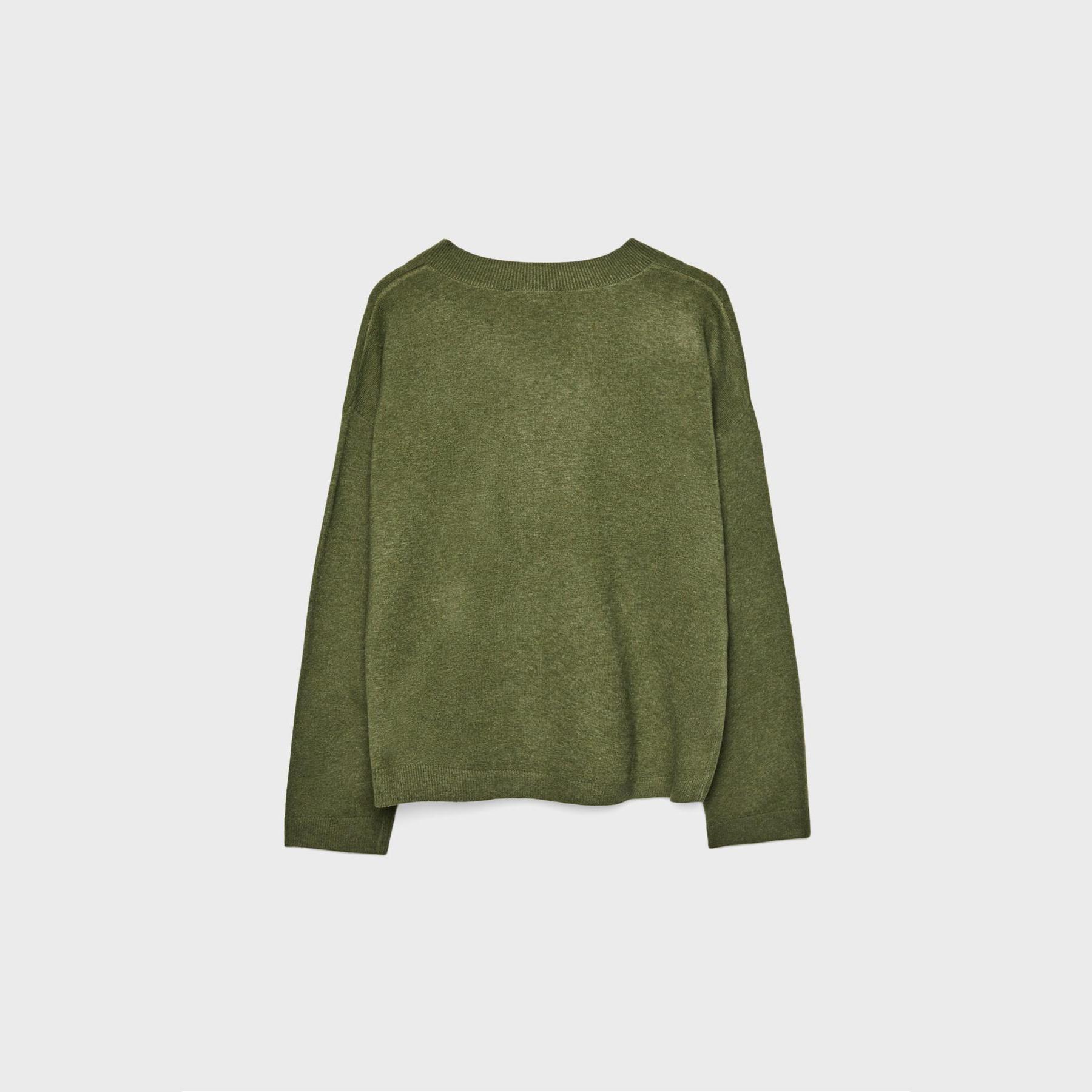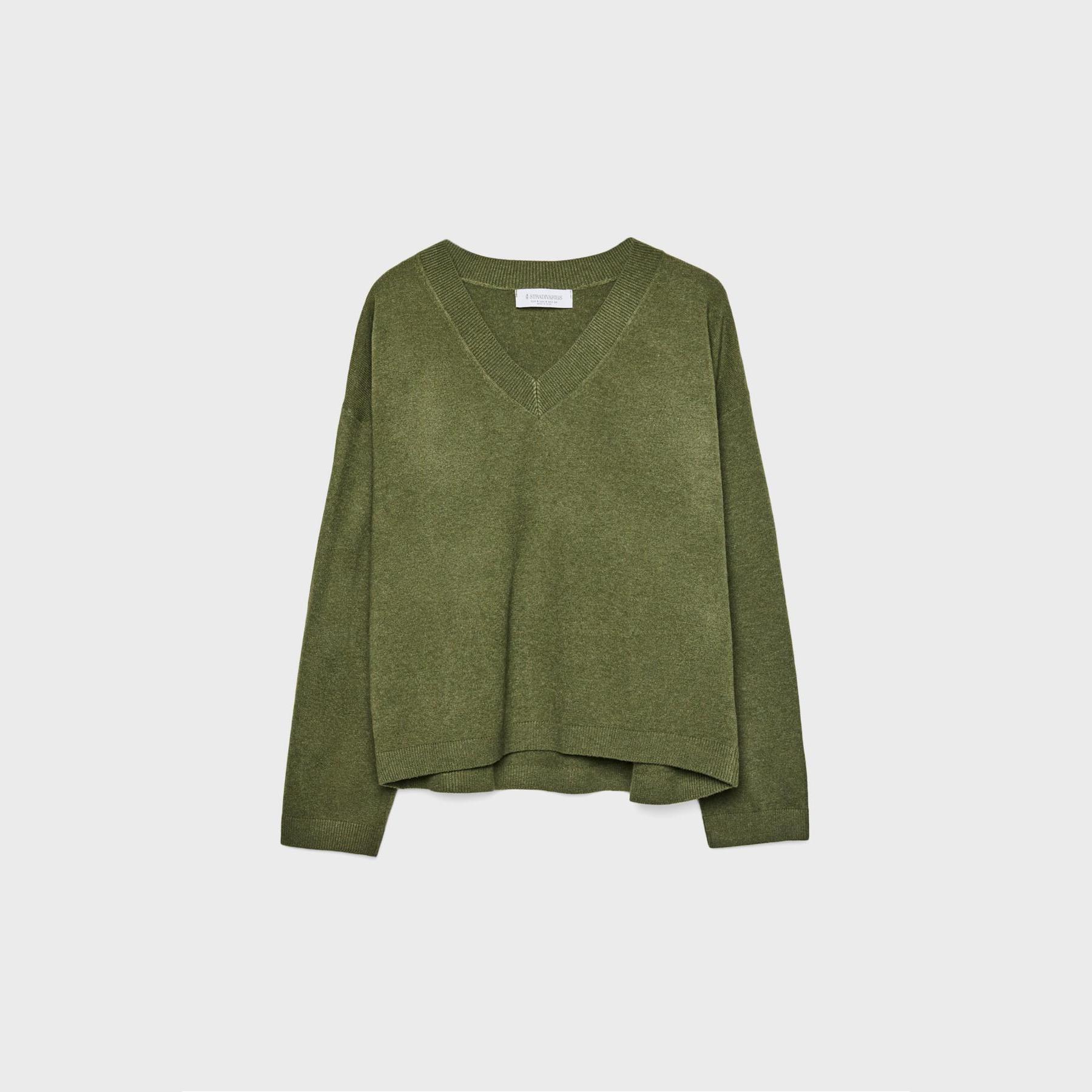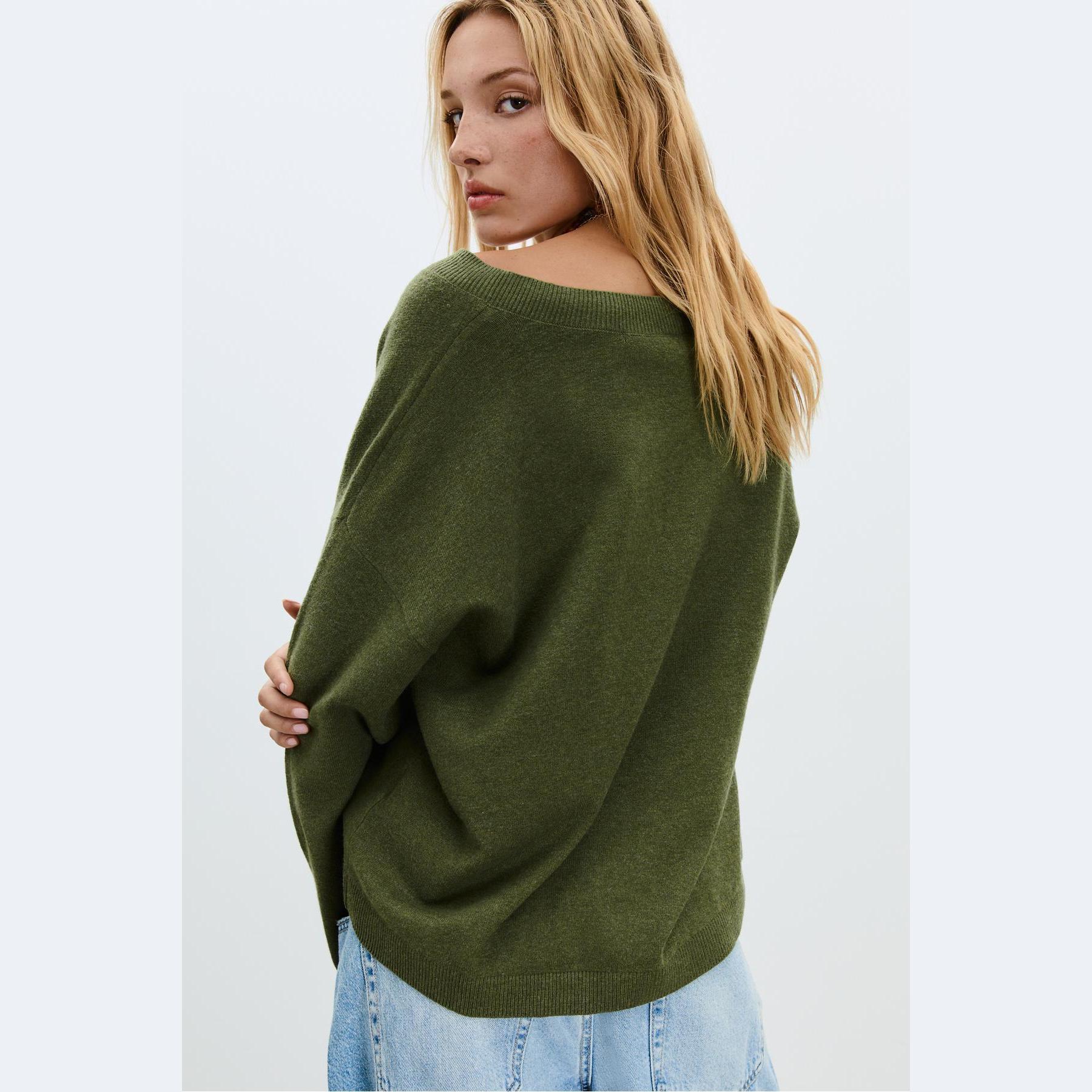 كنزة أنيقة من Stradivarius بلون أخضر داكن، مصنوعة من خامة تريكو ناعمة بملمس مريح، بتصميم Straight Fit وياقة V، مزودة بأكمام طويلة وأطراف مضلعة، تمنحك إطلالة دافئة وعصرية مثالية للاستخدام اليومي أو المكتبي.
