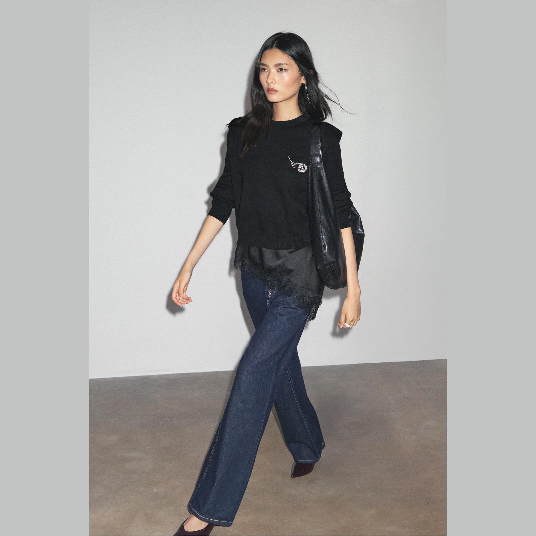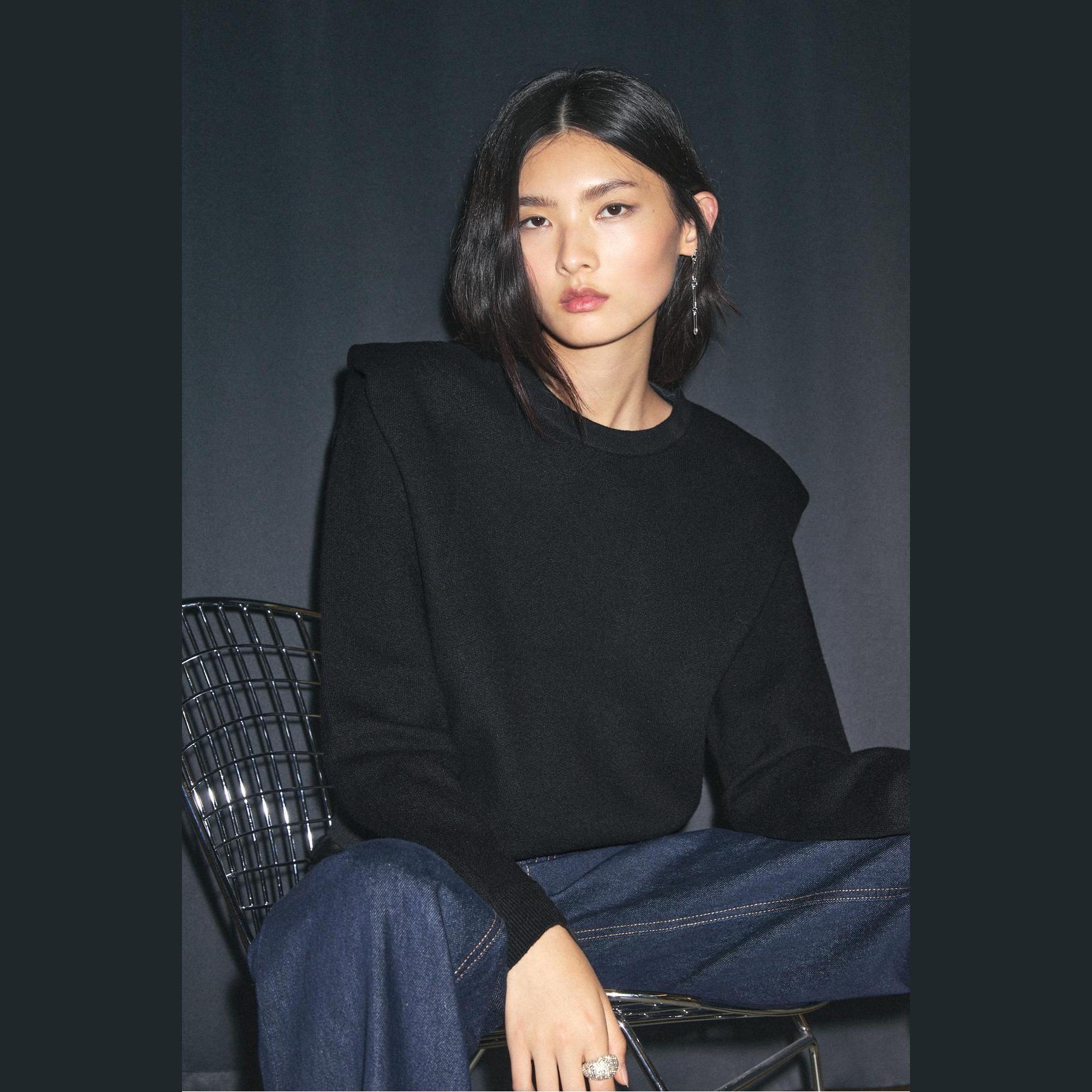كنزة أنيقة من Stradivarius بلون أسود، مصنوعة من خامة تريكو ناعمة بتركيبة مرنة، بتصميم Regular Fit وياقة مستديرة، مزودة بأكمام طويلة وكتف مبطن، مع أطراف مضلعة تمنحك إطلالة قوية وعصرية مثالية للاستخدام اليومي أو المكتبي.