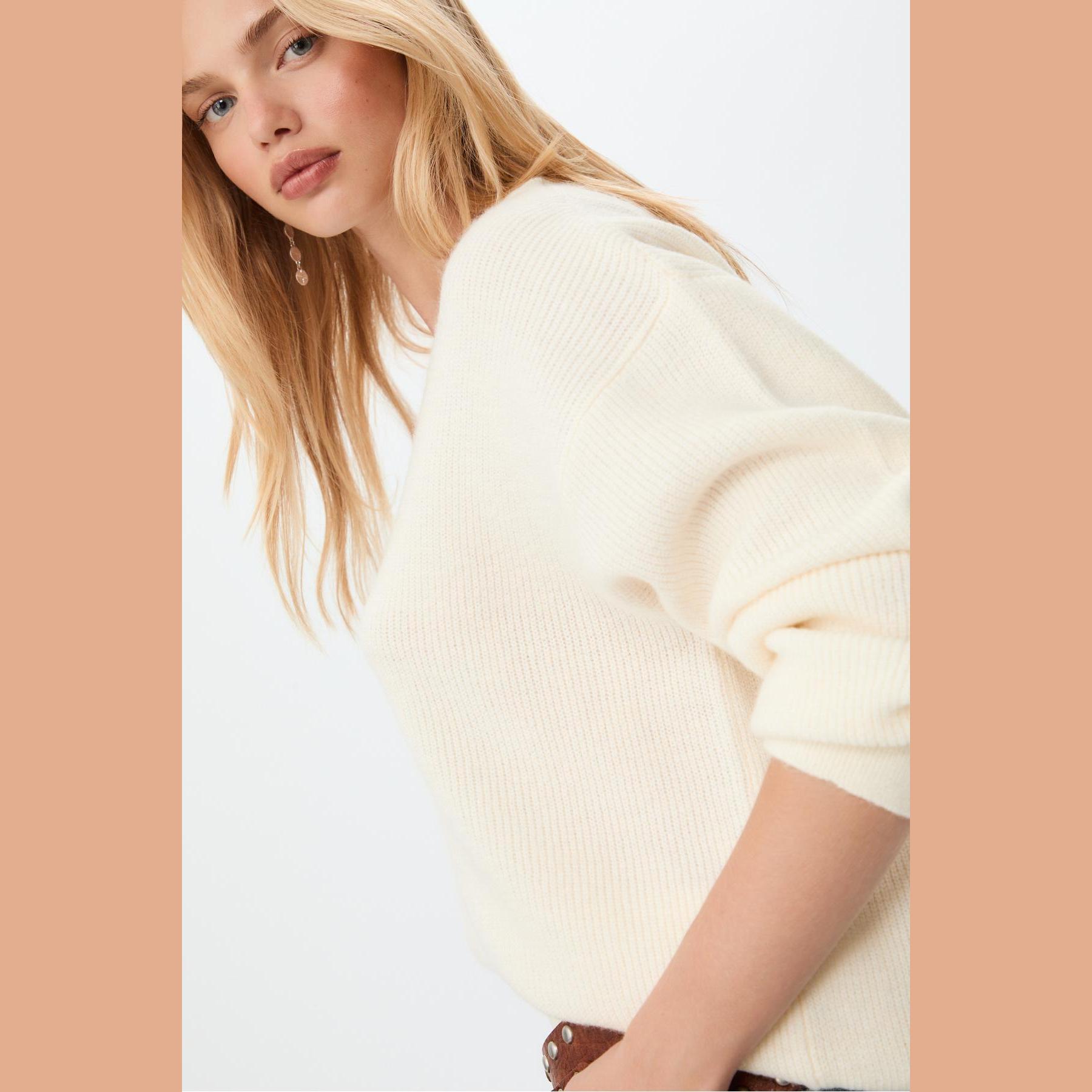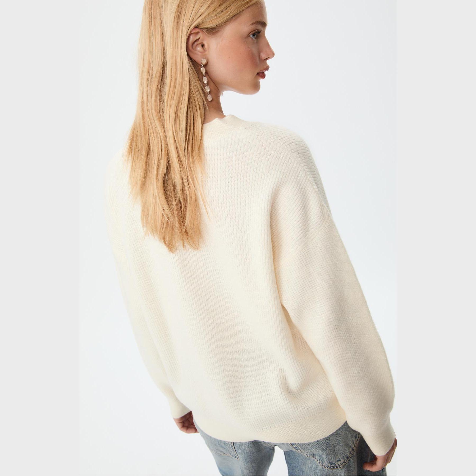 كنزة أنيقة من Stradivarius بلون إكرو، مصنوعة من خامة تريكو ملبدة بتركيبة دافئة، بتصميم Regular Fit وياقة V، مزودة بأكمام طويلة وأطراف مضلعة، تمنحك إطلالة مريحة وعصرية مثالية للاستخدام اليومي أو المكتبي.