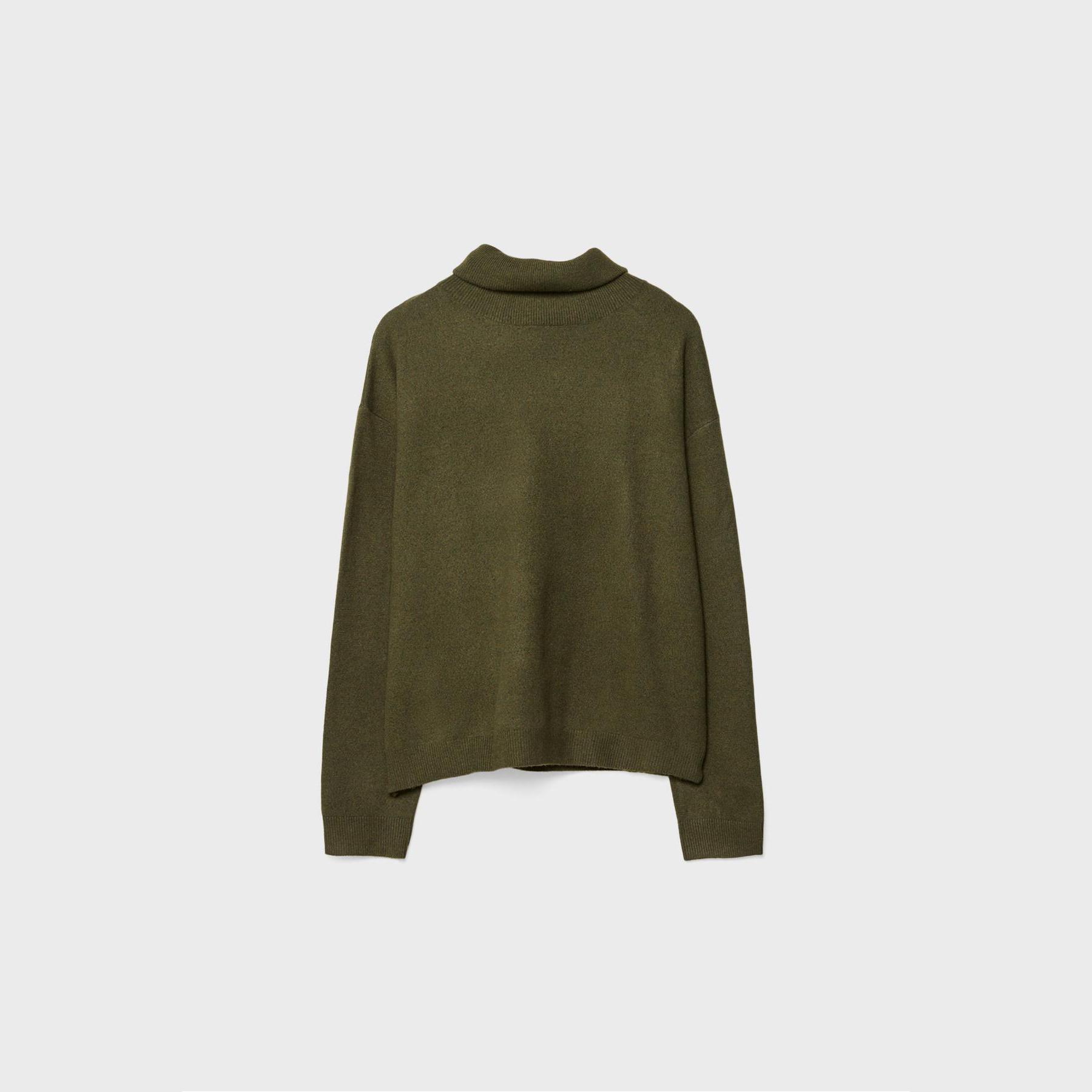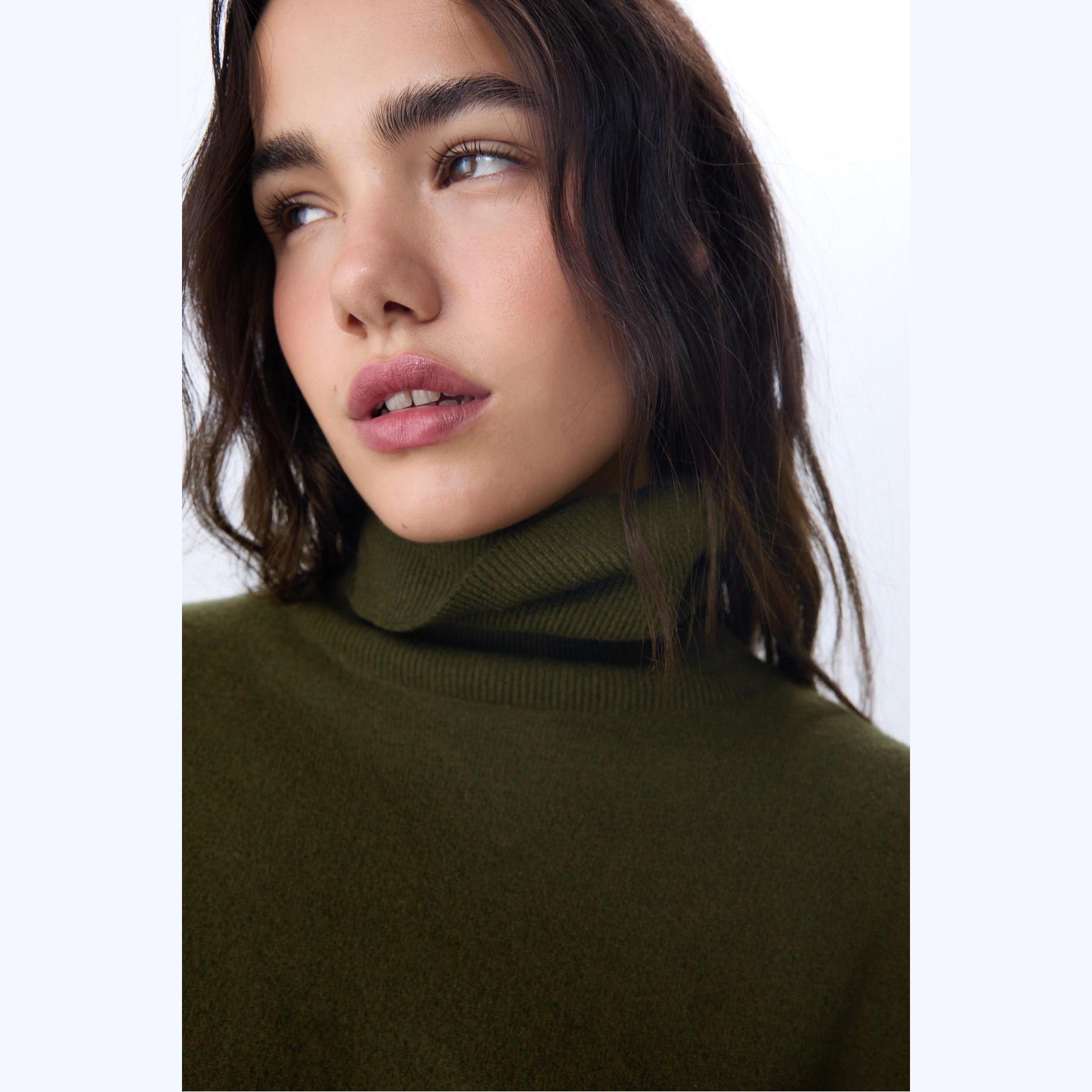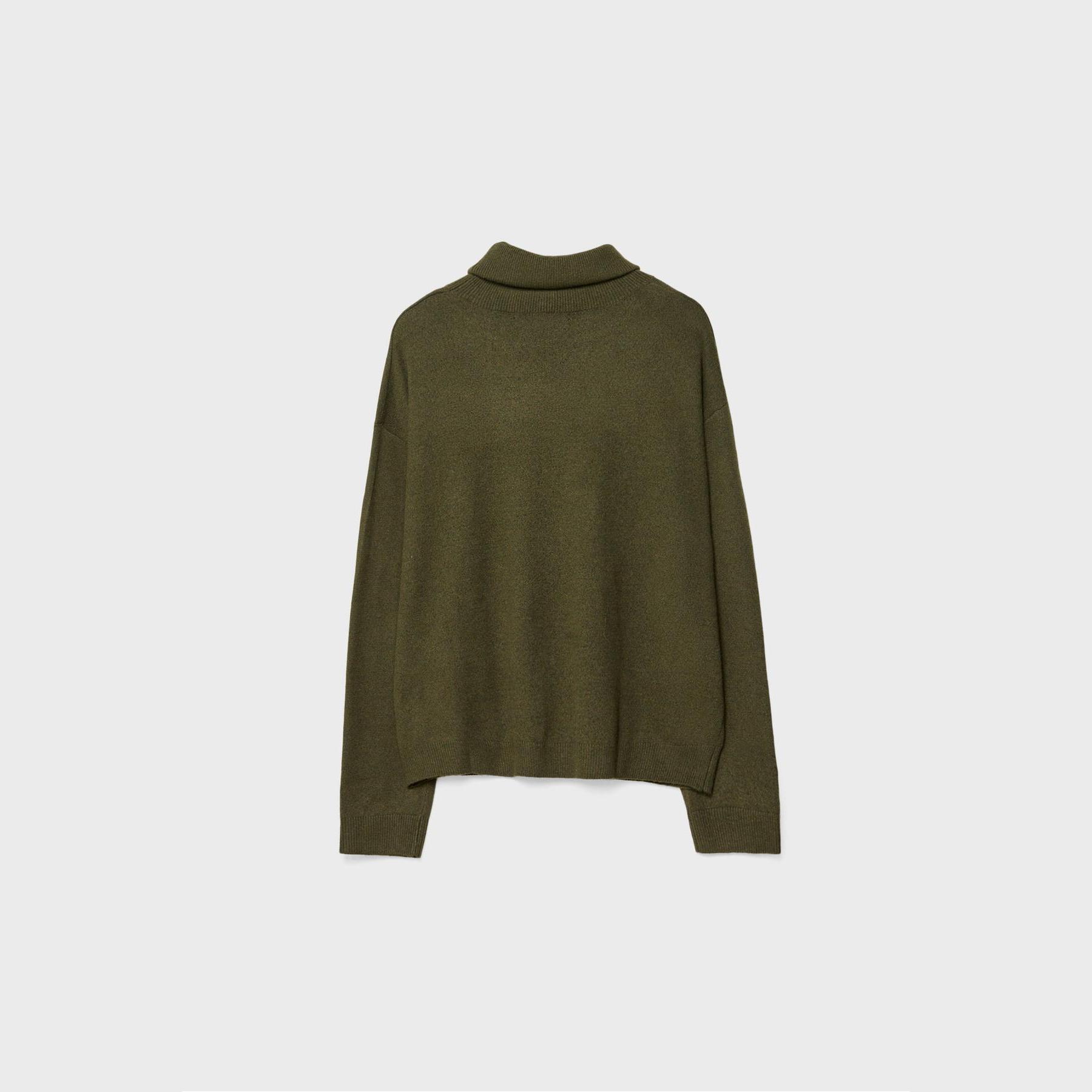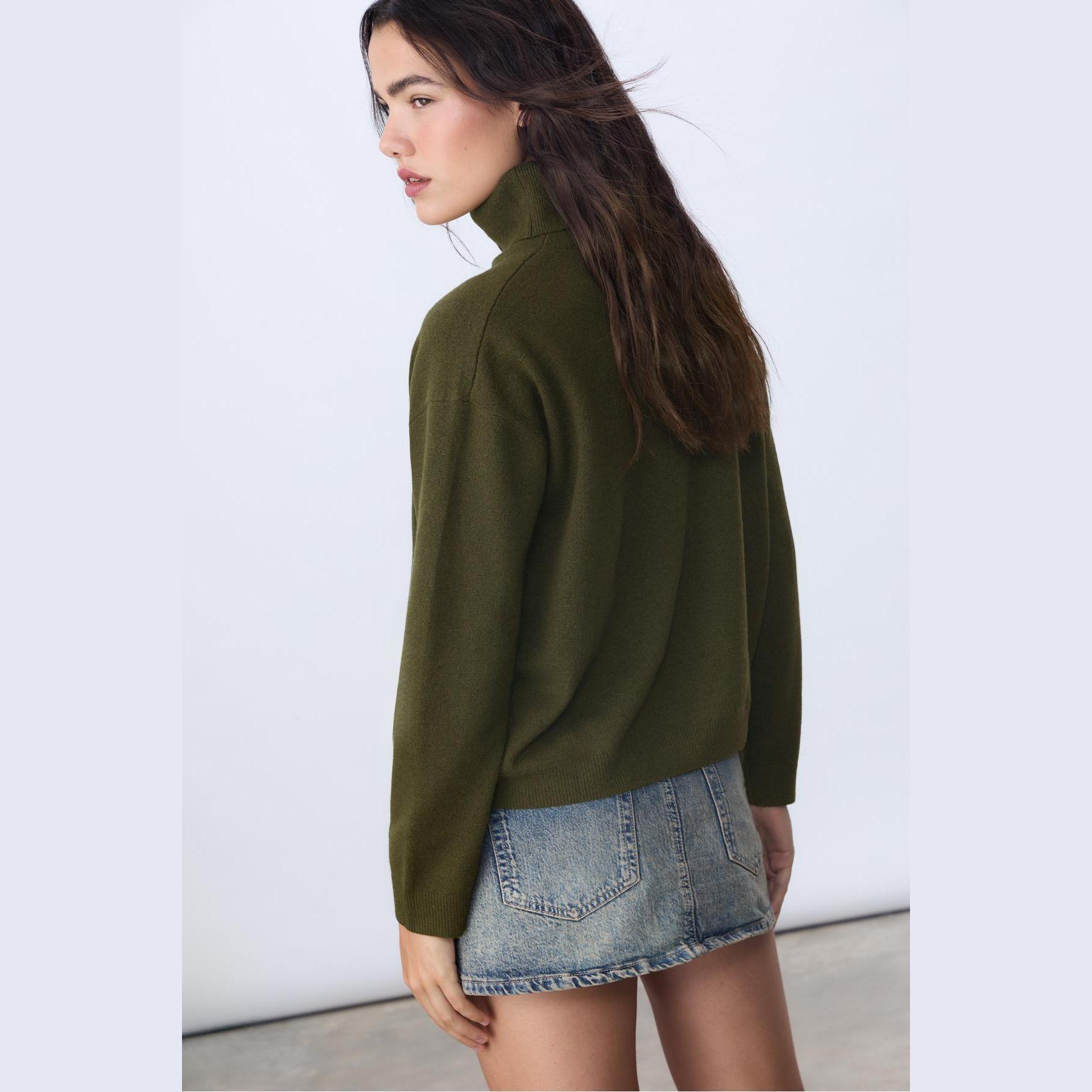 كنزة أنيقة من Stradivarius بلون زيتي، مصنوعة من خامة تريكو ناعمة بتركيبة دافئة، بتصميم Regular Fit وياقة مستقيمة قابلة للطي، مزودة بأكمام طويلة وأطراف مضلعة، تمنحك إطلالة مريحة وعصرية مثالية للاستخدام اليومي أو المكتبي.
