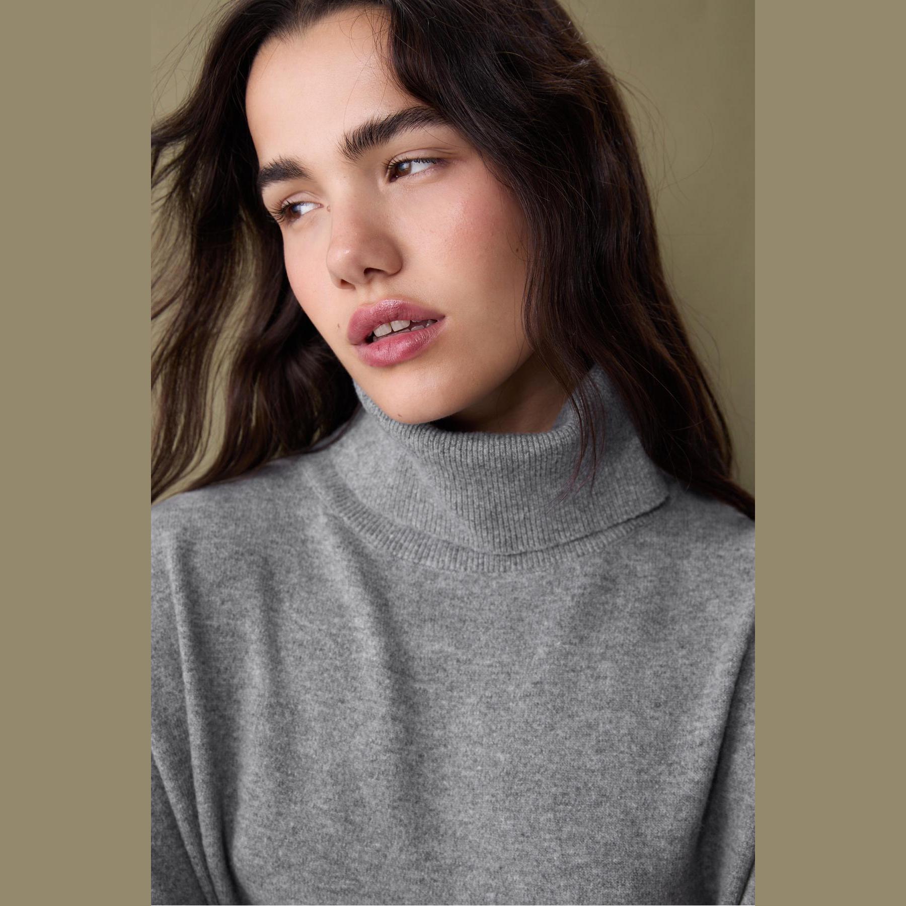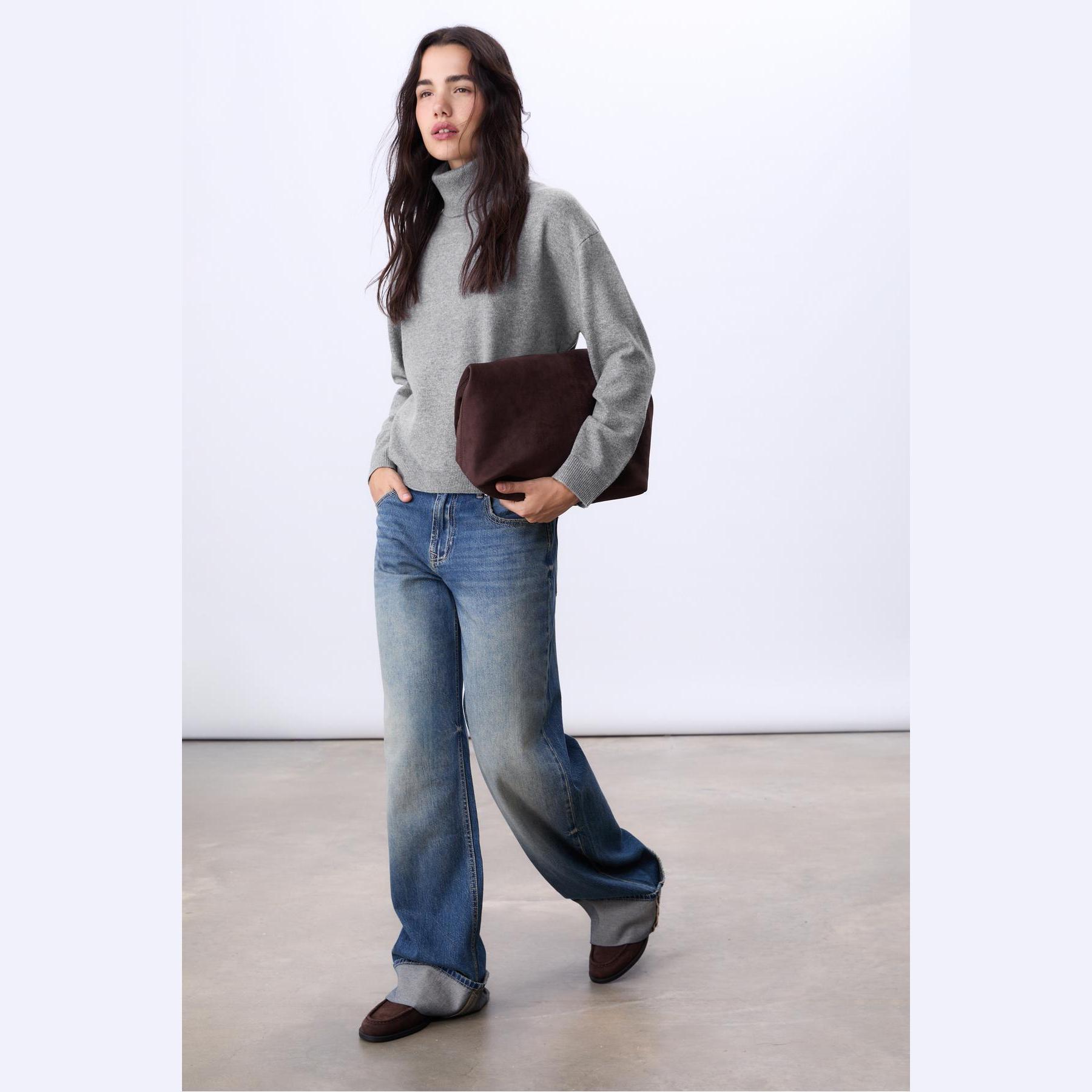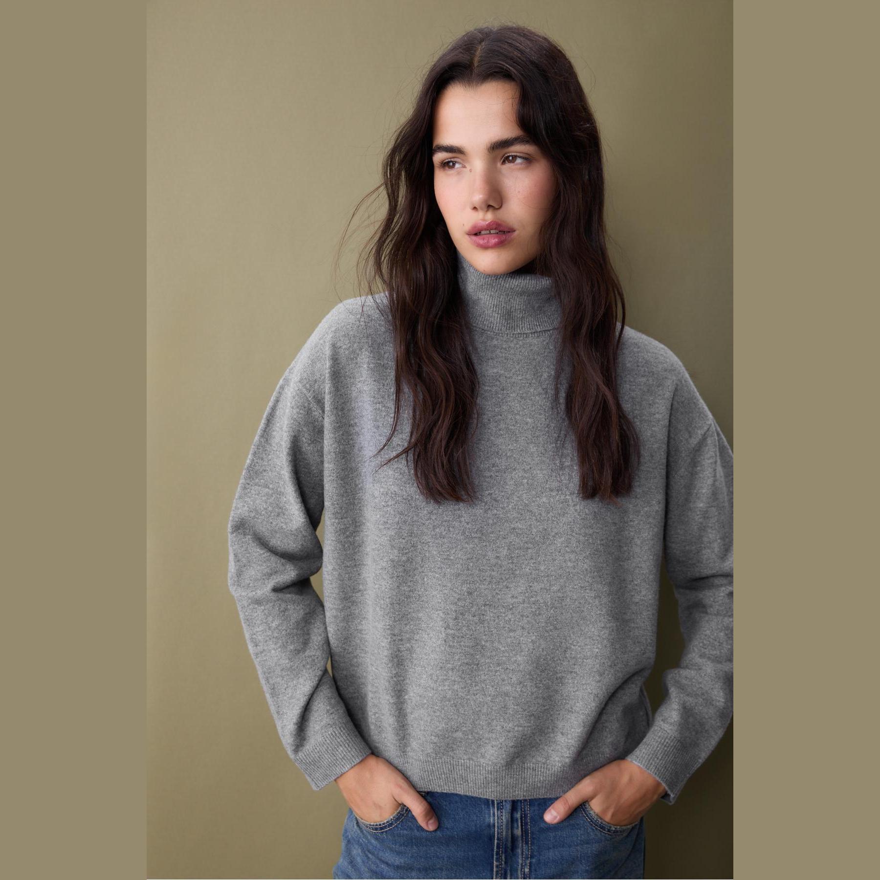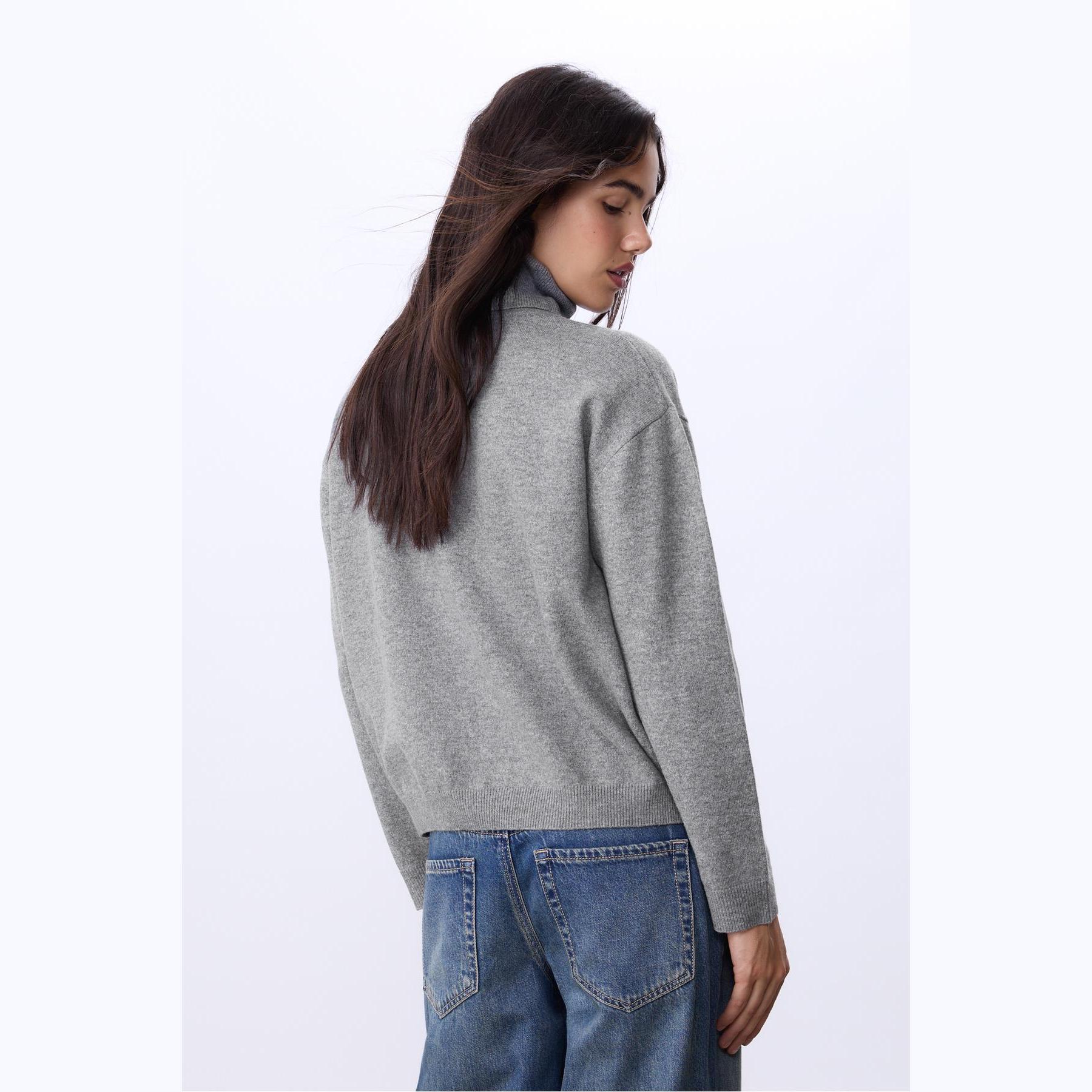 كنزة أنيقة من Stradivarius بلون رمادي غامق، مصنوعة من خامة تريكو ناعمة بتركيبة دافئة، بتصميم Regular Fit وياقة مستقيمة قابلة للطي، مزودة بأكمام طويلة وأطراف مضلعة، تمنحك إطلالة مريحة وعصرية مثالية للاستخدام اليومي أو المكتبي.
