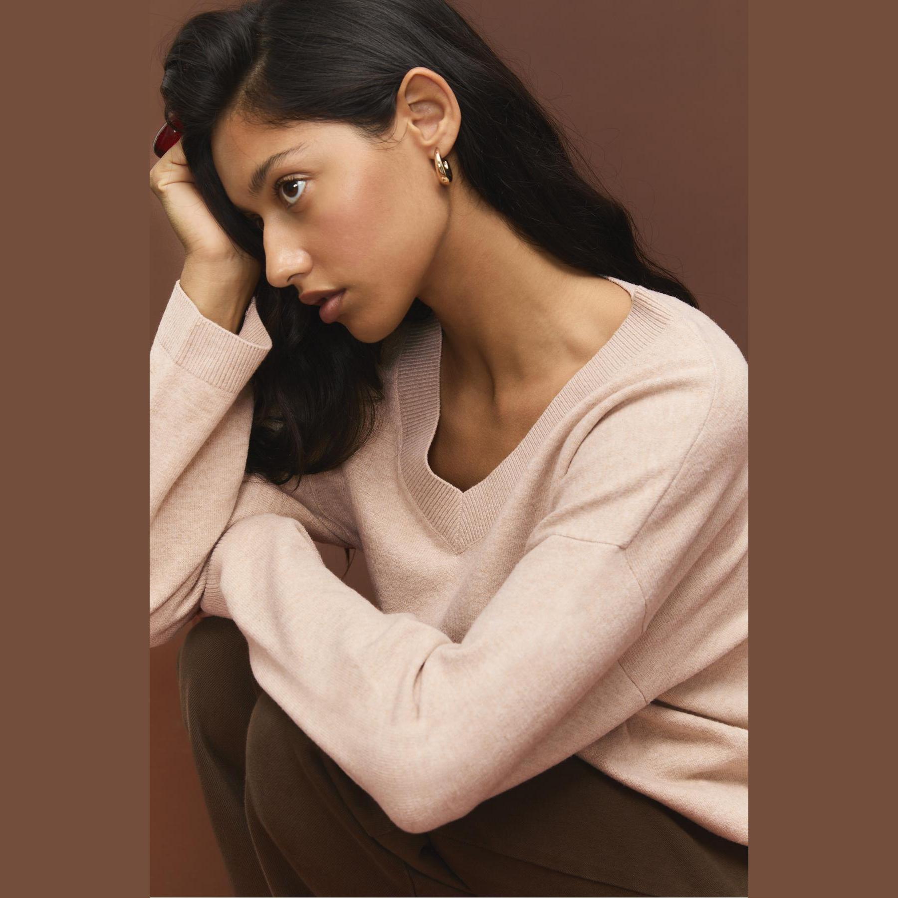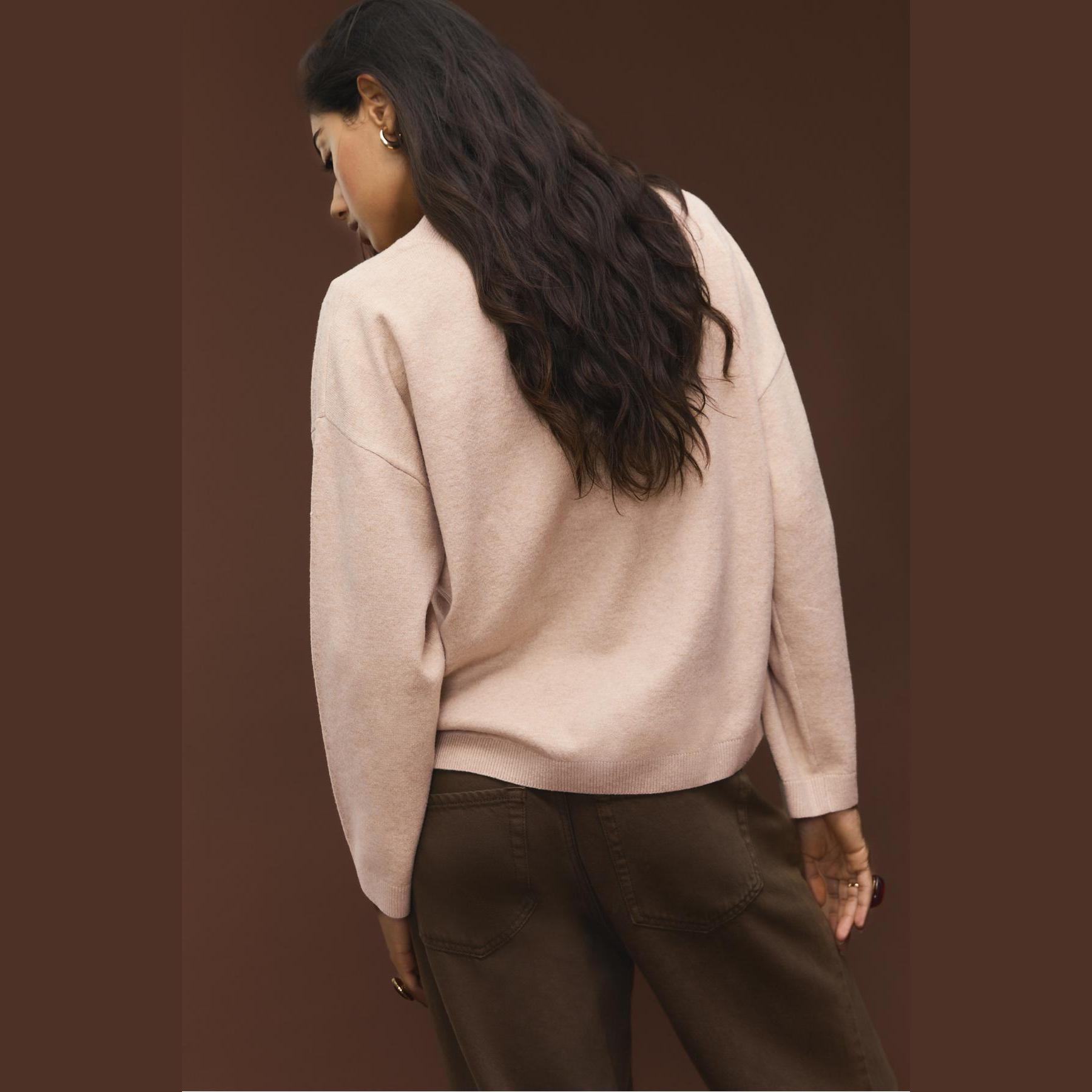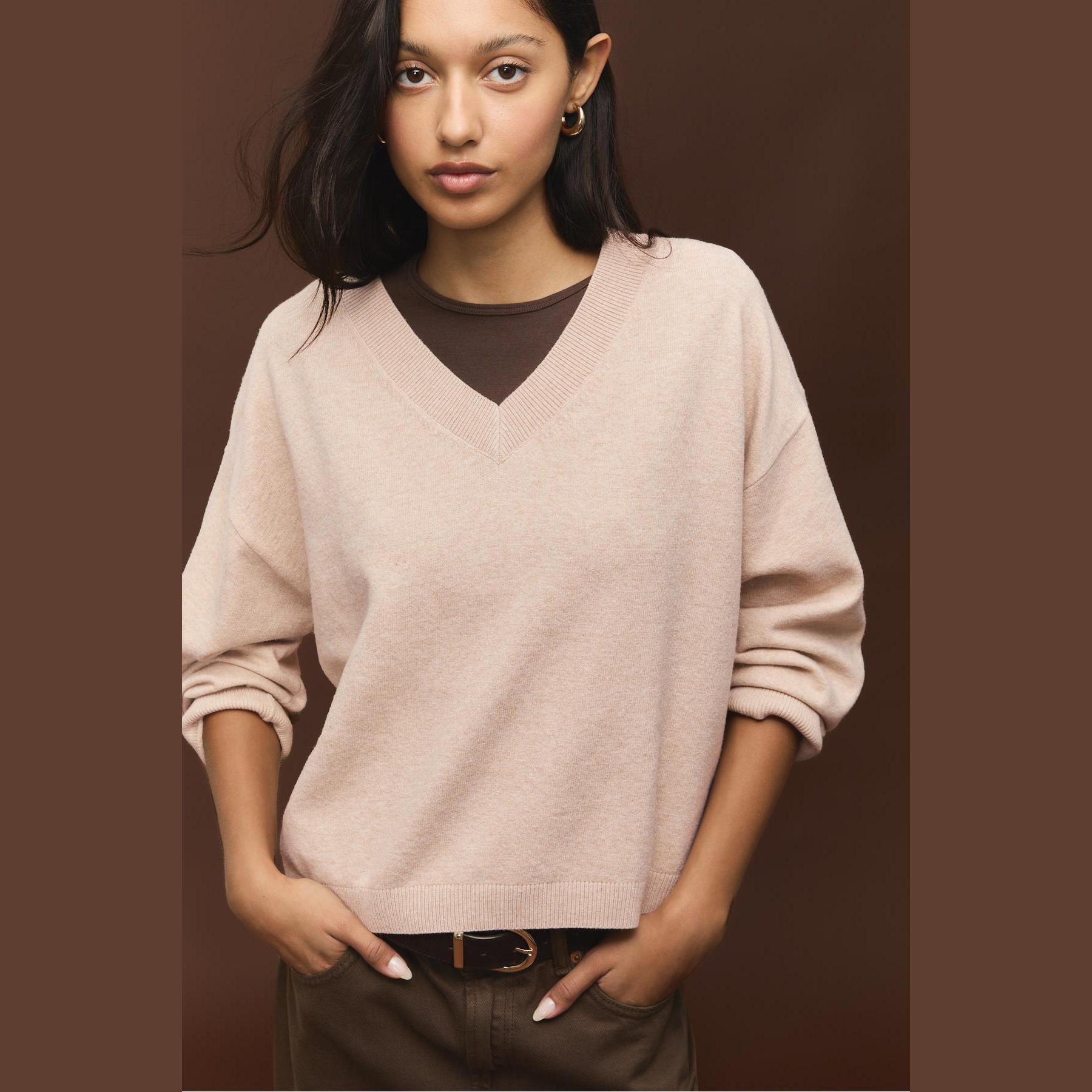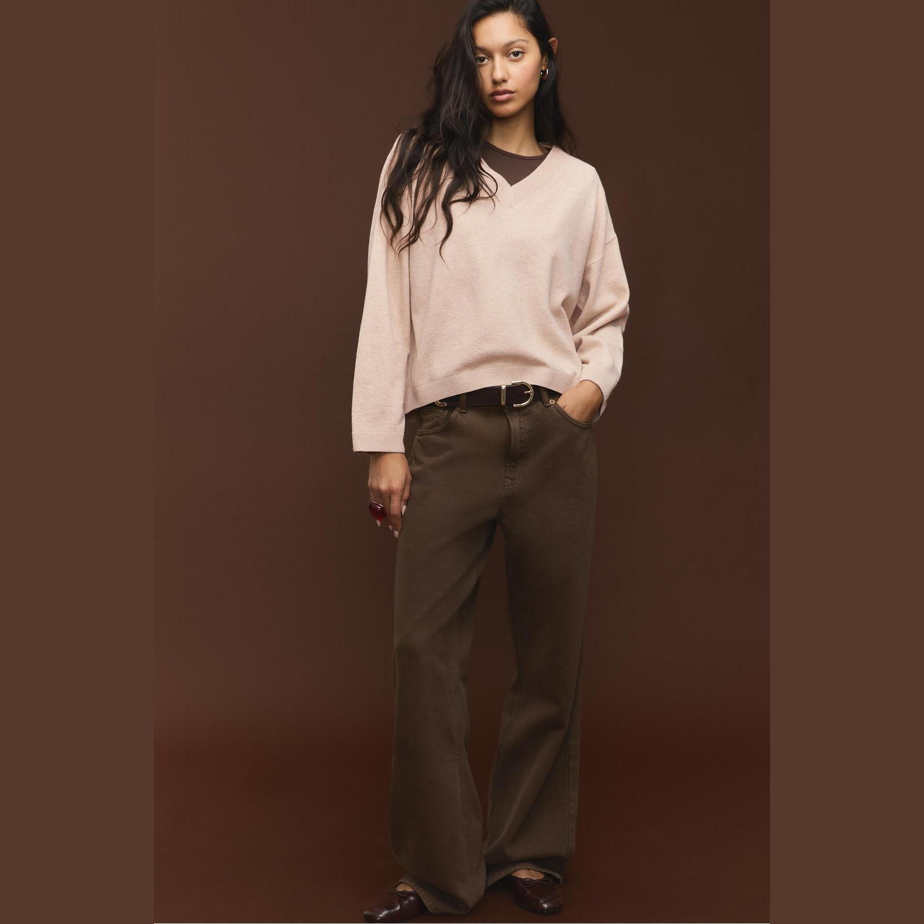 كنزة أنيقة من Stradivarius بلون بيج دافئ، مصنوعة من خامة تريكو ناعمة بملمس مريح، بتصميم Straight Fit وياقة V، مزودة بأكمام طويلة وأطراف مضلعة، تمنحك إطلالة دافئة وعصرية مثالية للاستخدام اليومي أو المكتبي.