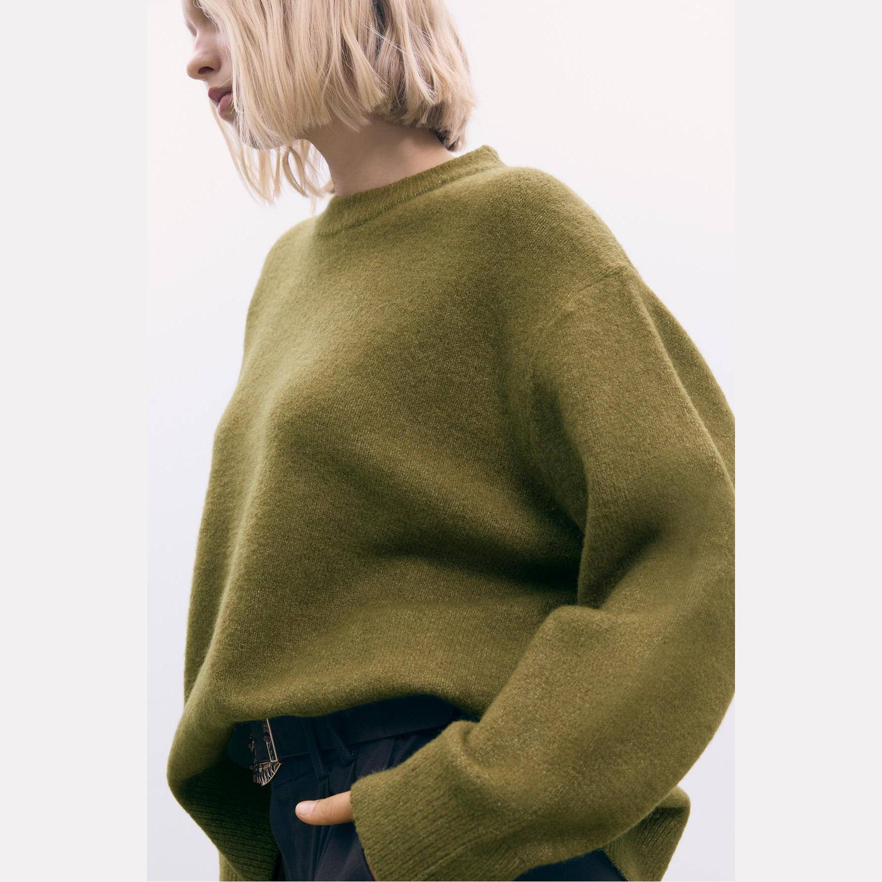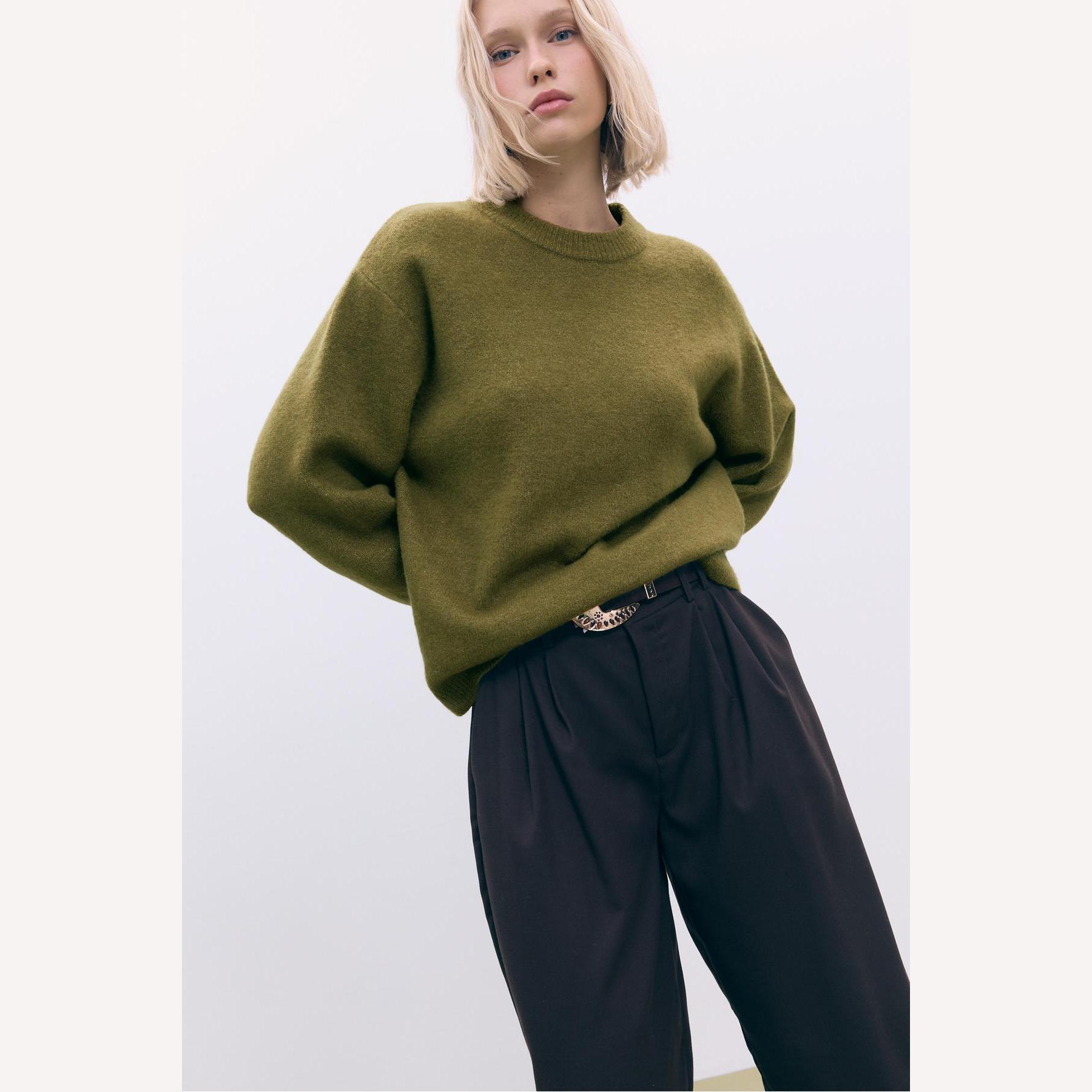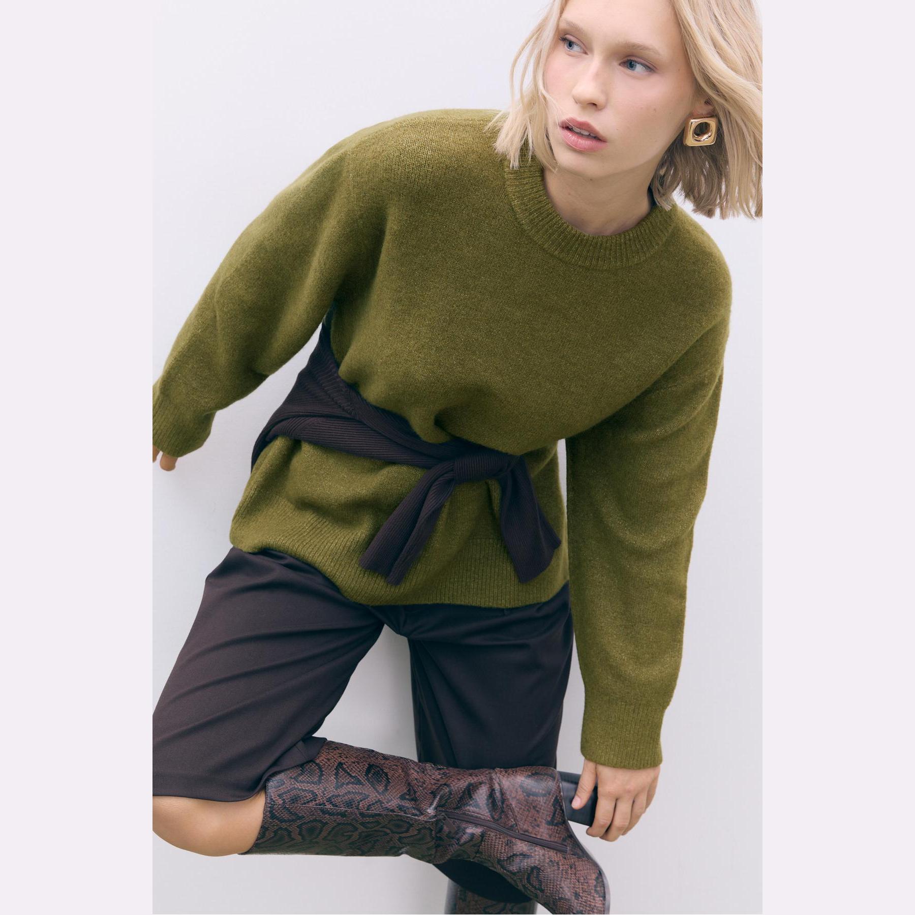 كنزة أنيقة من Stradivarius بلون أخضر زيتي، مصنوعة من خامة تريكو ناعمة بتركيبة دافئة، بتصميم Oversize Fit وياقة مستديرة، مزودة بأكمام طويلة وأطراف مضلعة، تمنحك إطلالة مريحة وعصرية مثالية للاستخدام اليومي أو المكتبي.