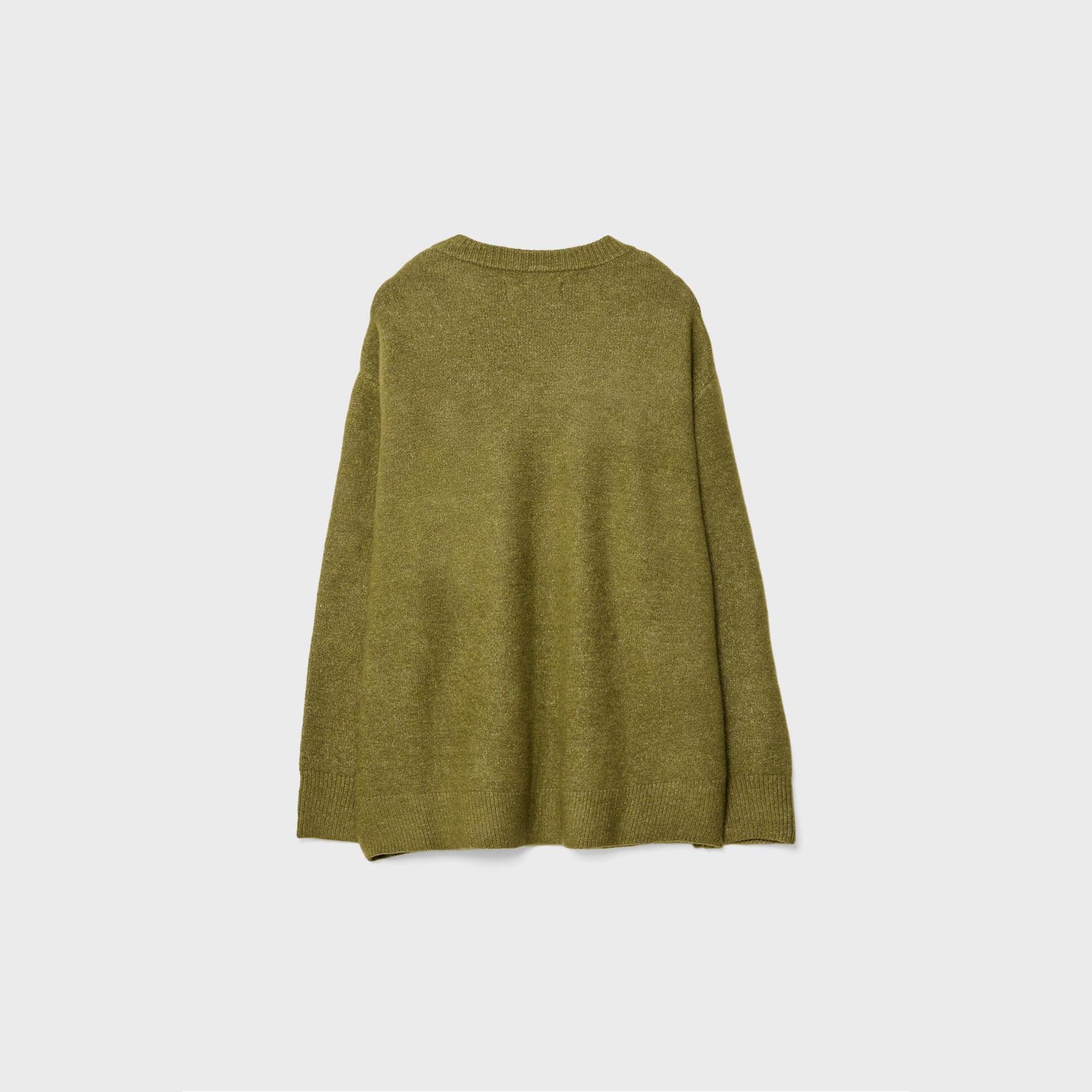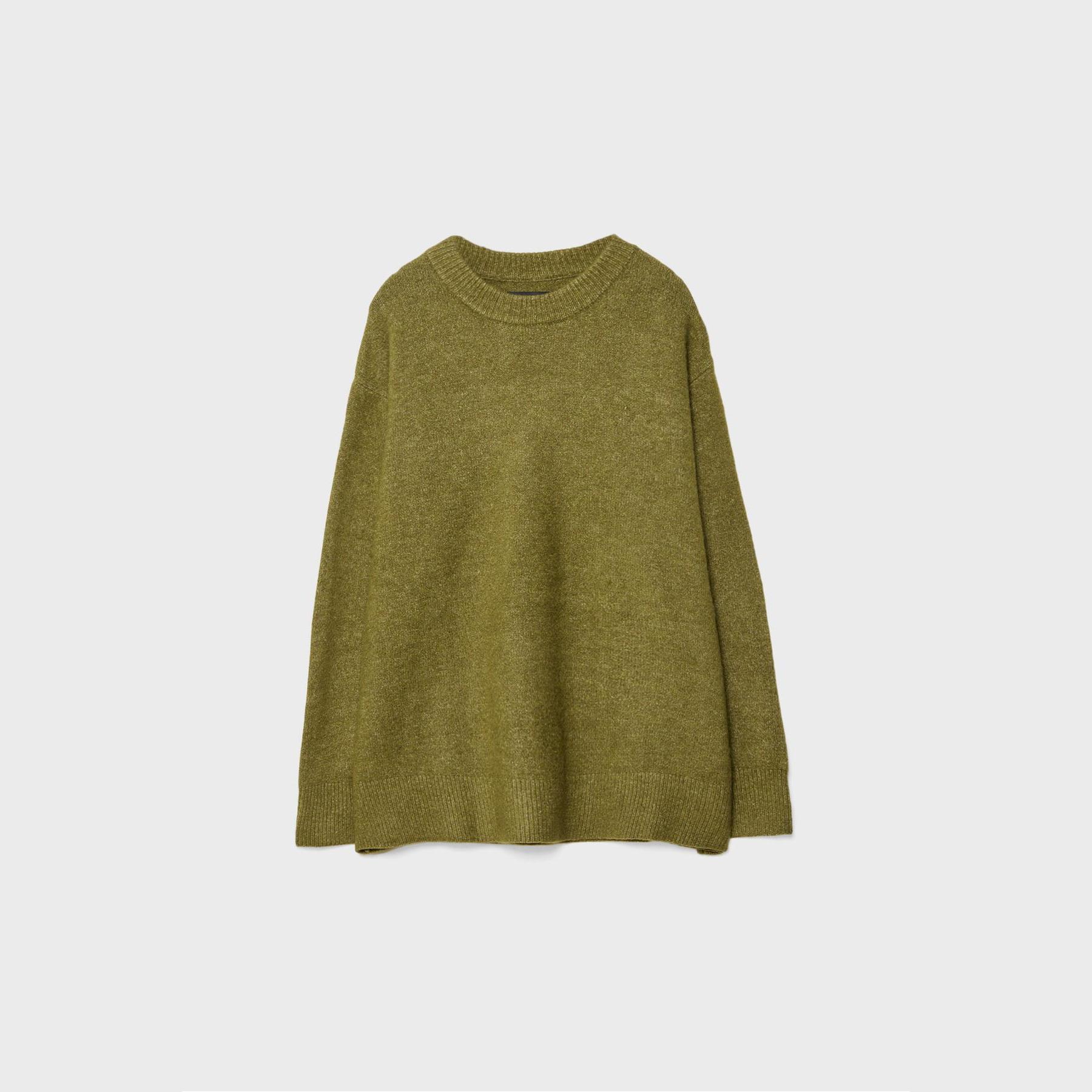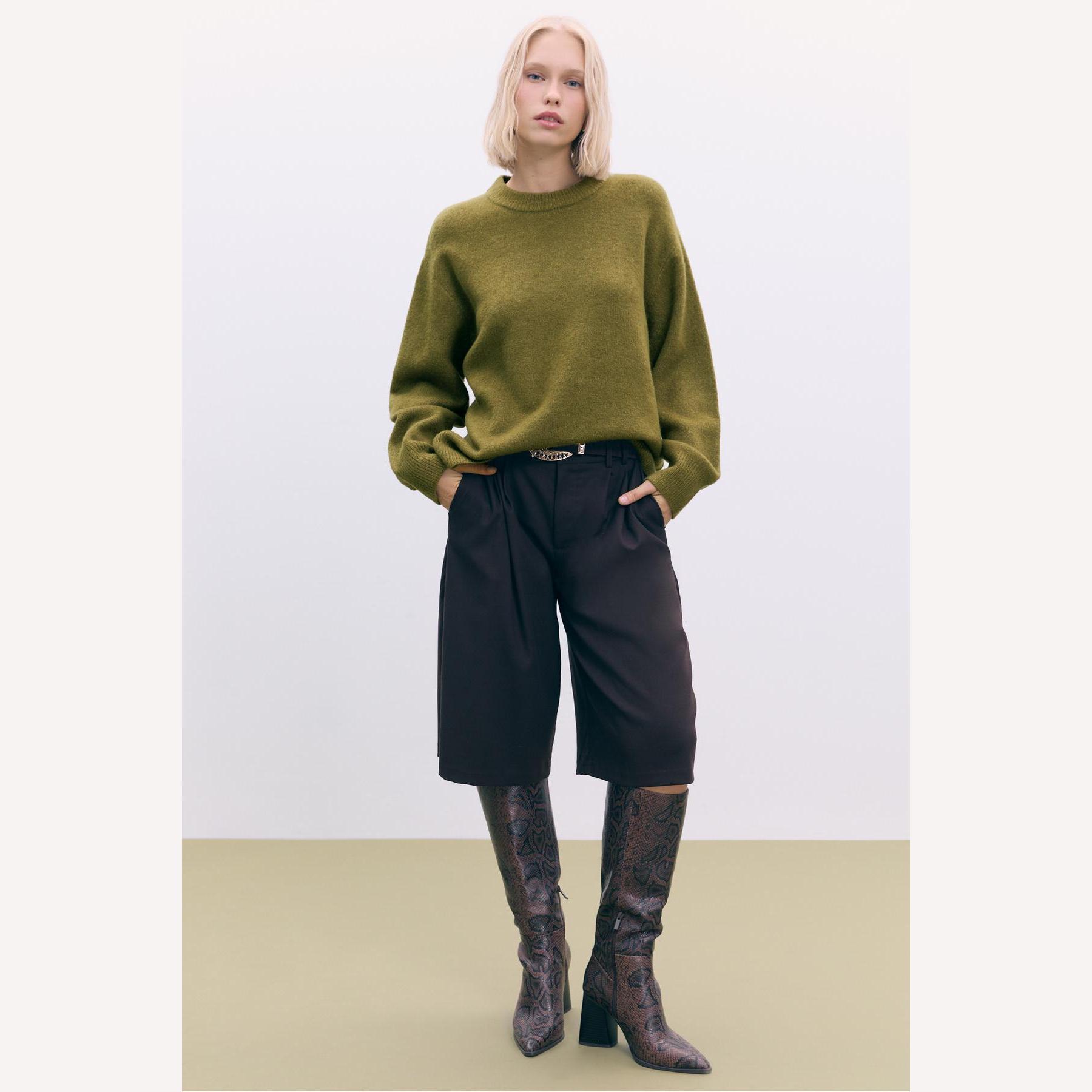 كنزة أنيقة من Stradivarius بلون أخضر زيتي، مصنوعة من خامة تريكو ناعمة بتركيبة دافئة، بتصميم Oversize Fit وياقة مستديرة، مزودة بأكمام طويلة وأطراف مضلعة، تمنحك إطلالة مريحة وعصرية مثالية للاستخدام اليومي أو المكتبي.