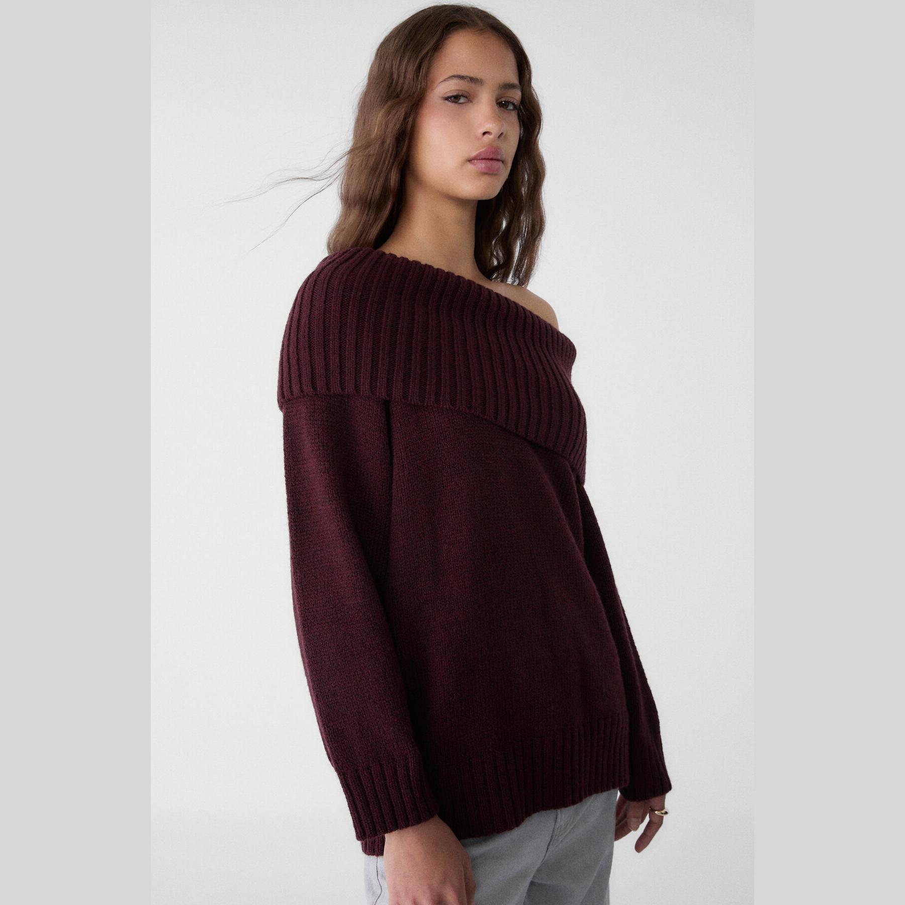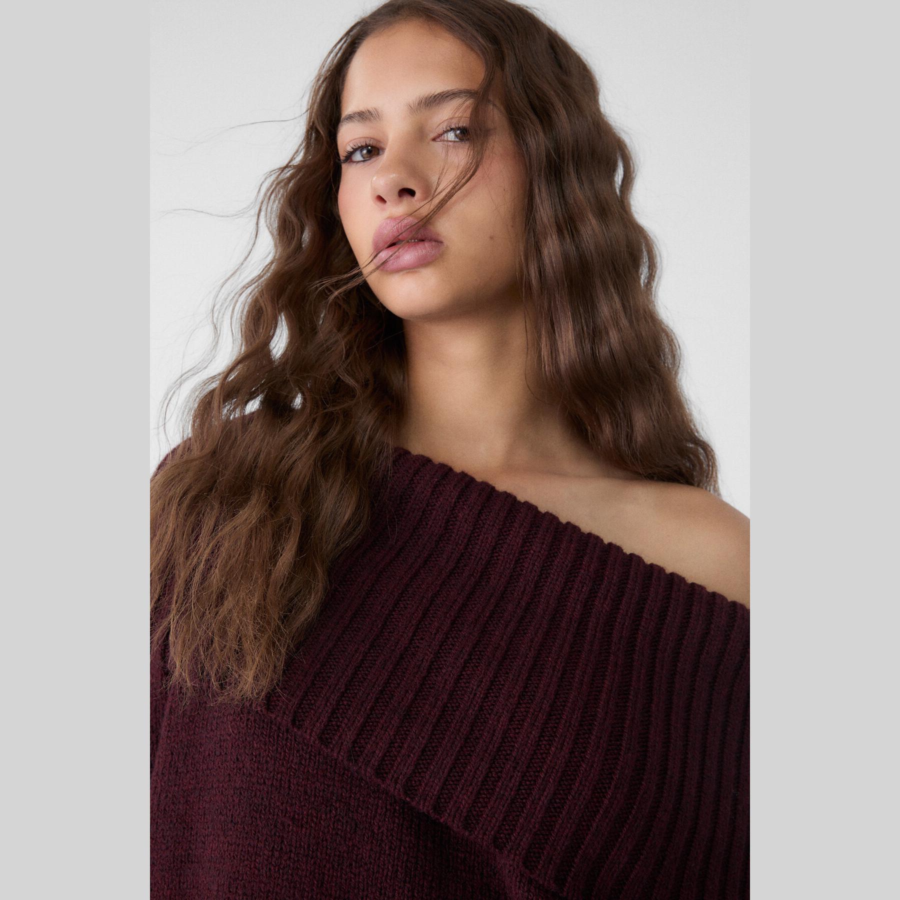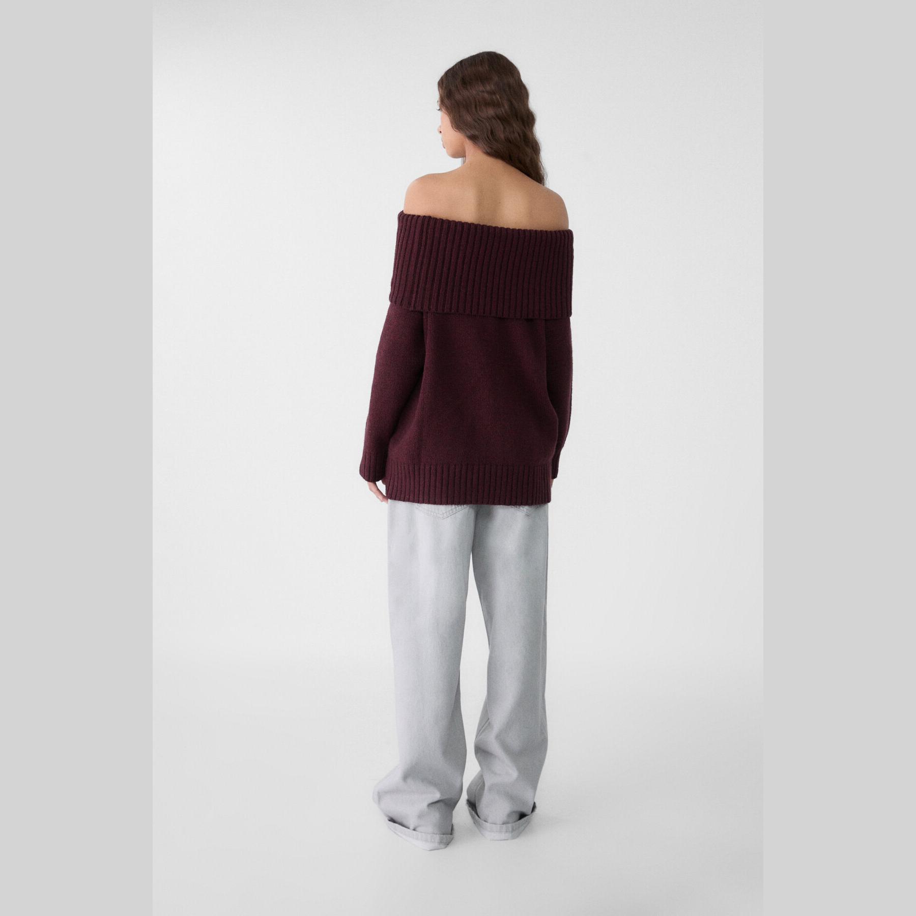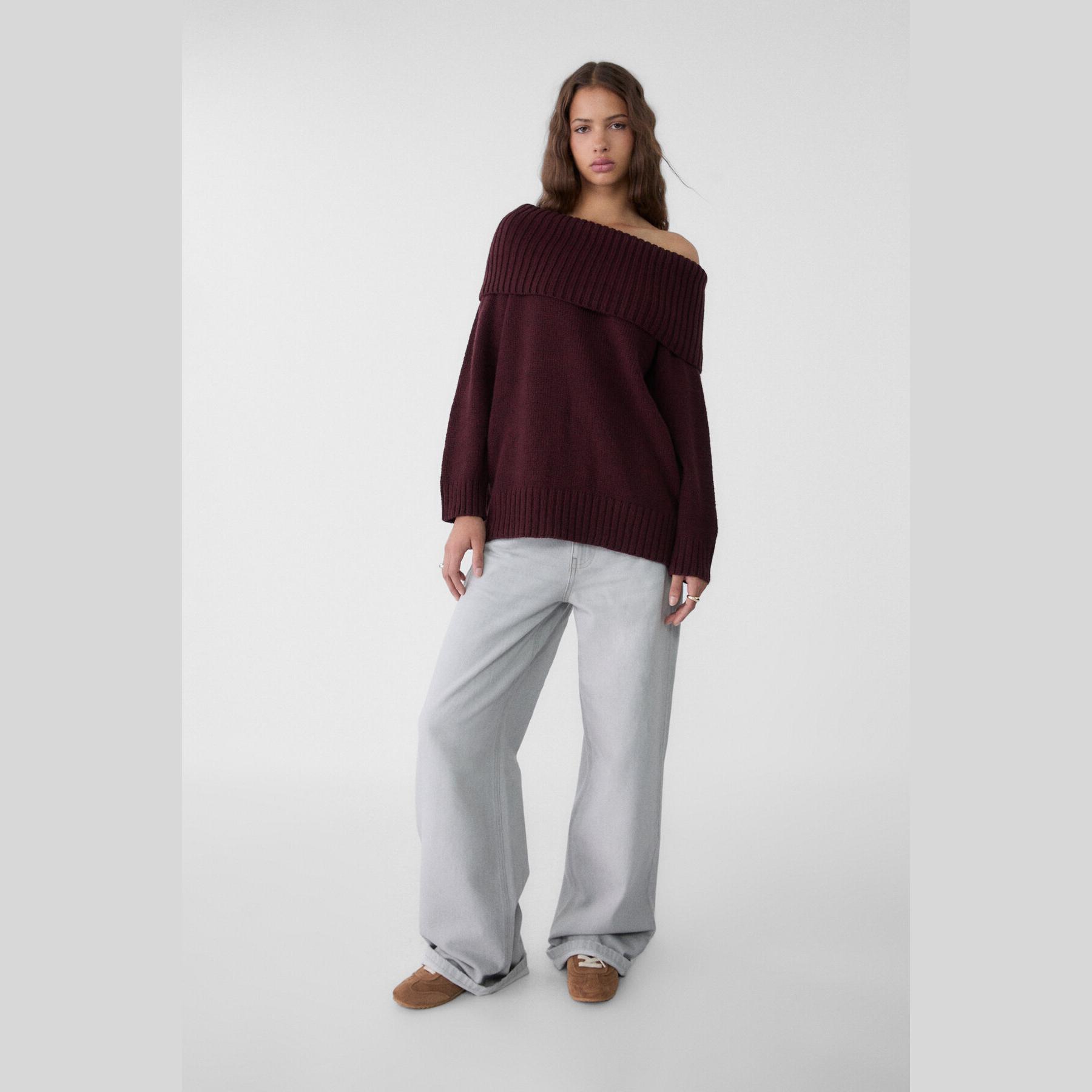 كنزة تريكو بأكتاف مكشوفة وياقة مستقيمة – بوردو من Stradivarius