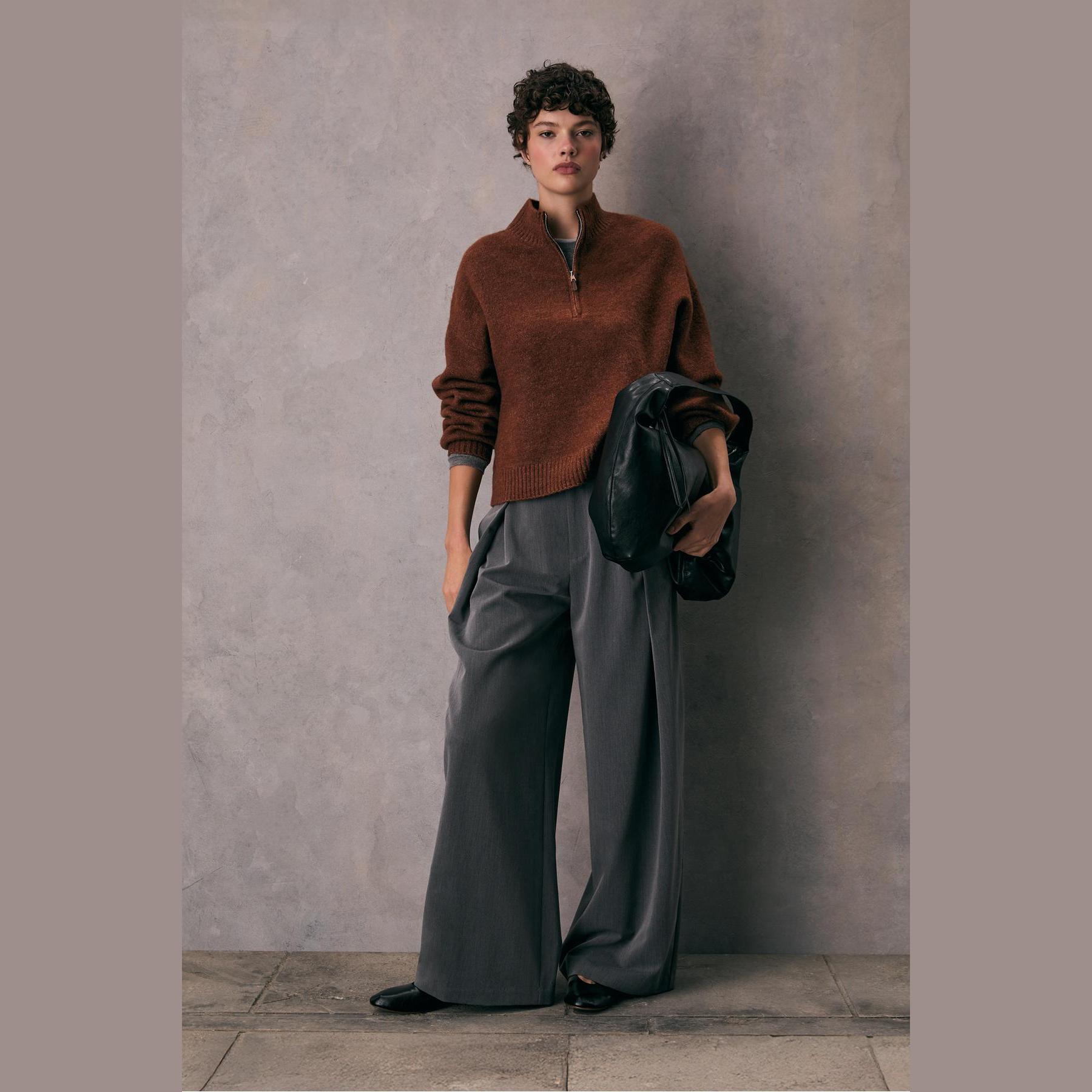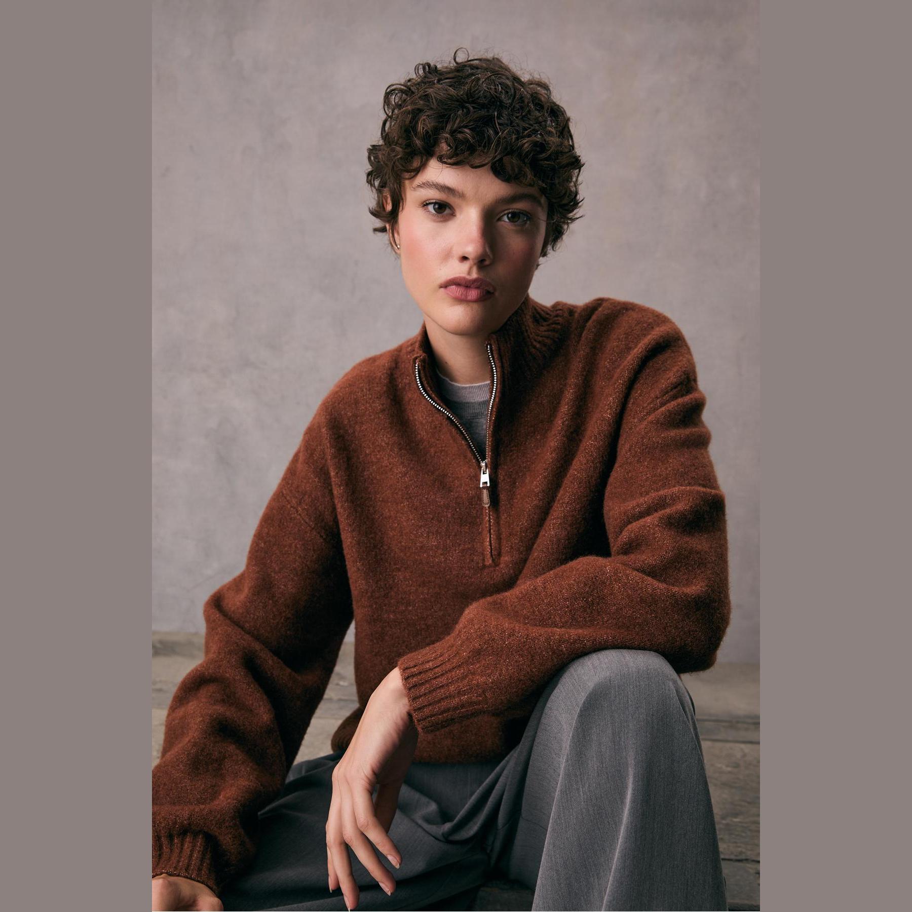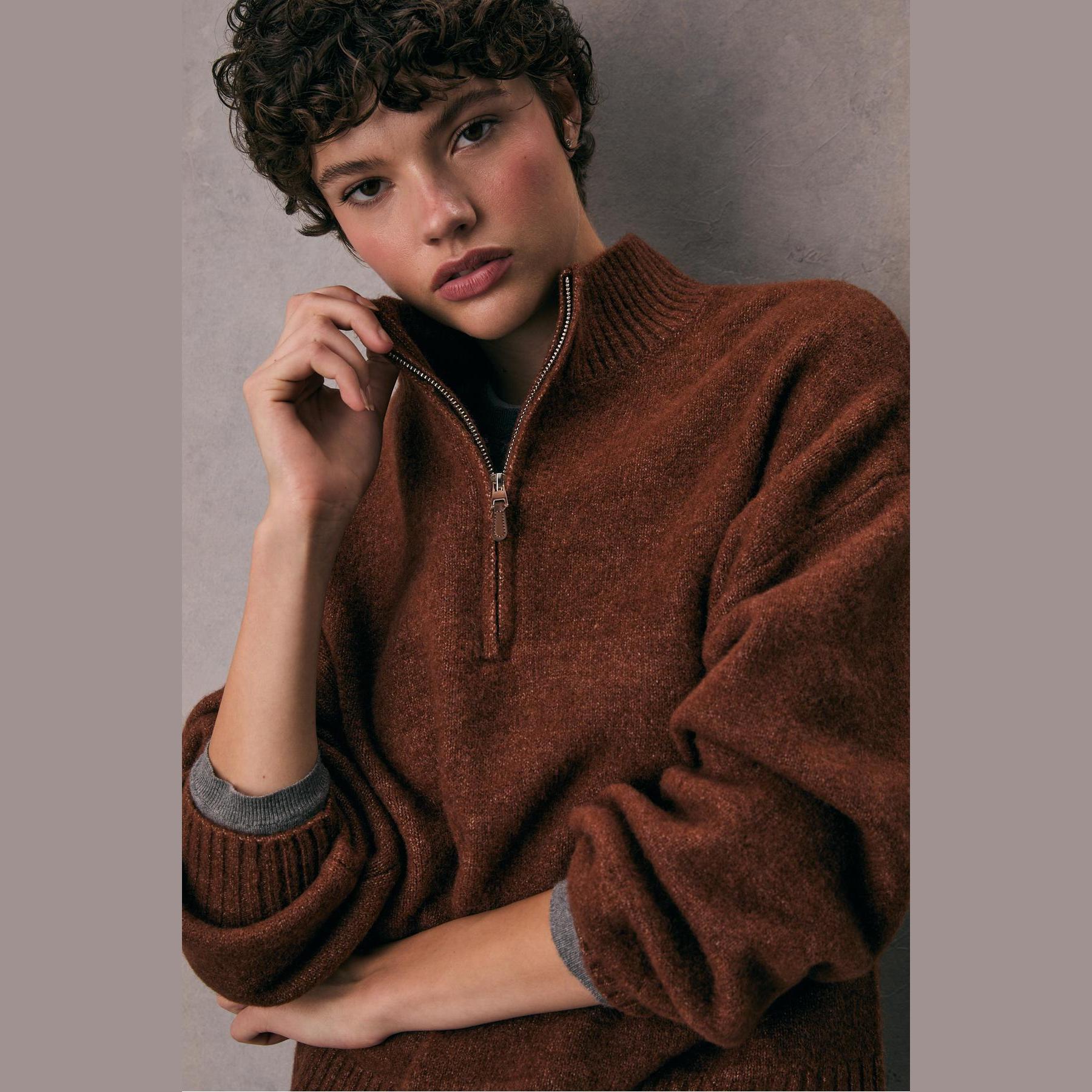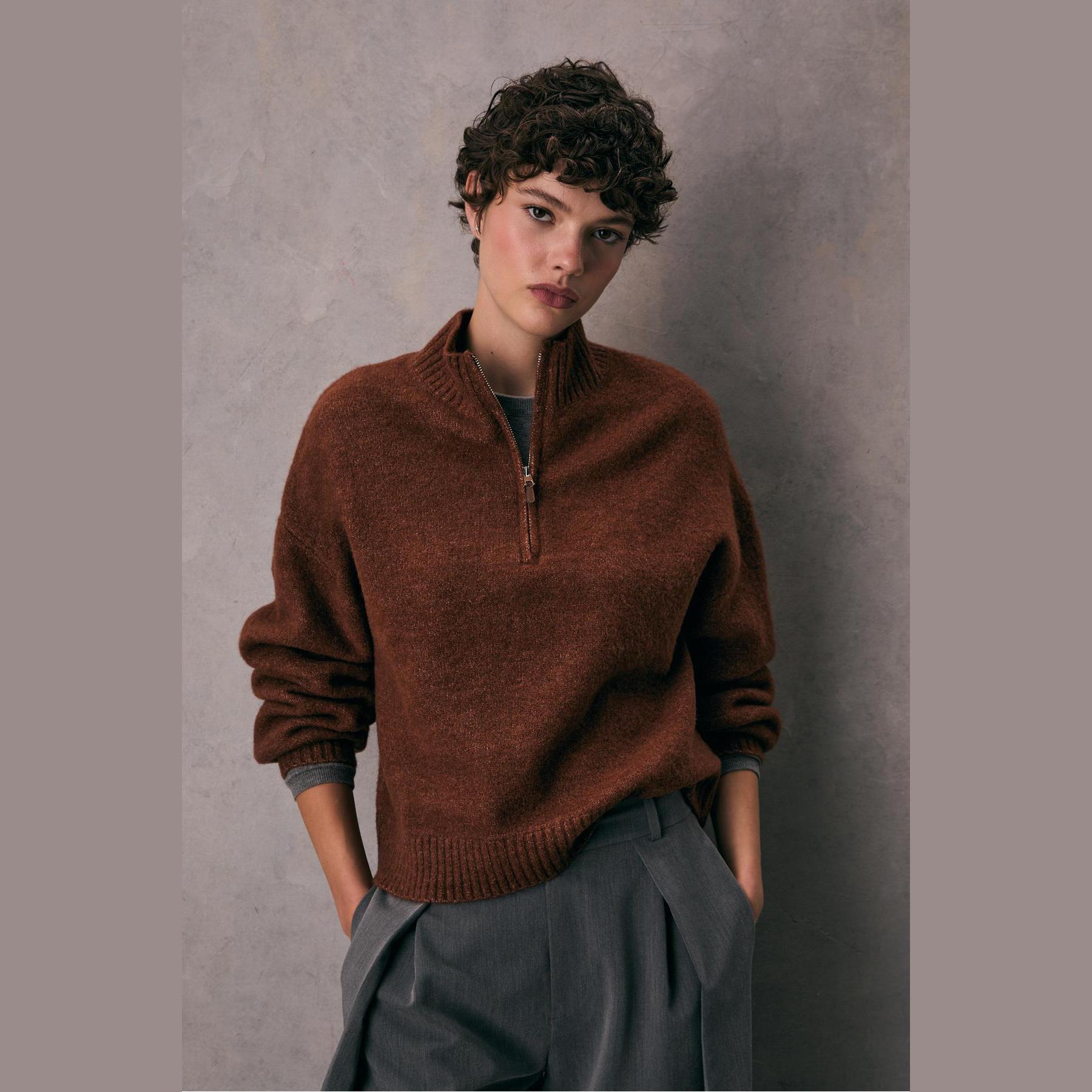 كنزة أنيقة من Stradivarius بلون بني دافئ، مصنوعة من خامة تريكو ناعمة بتركيبة دافئة، بياقة قابلة للطي وسحاب أمامي، مزودة بأكمام طويلة وأطراف مضلعة، تمنحك إطلالة مريحة وعصرية مثالية للاستخدام اليومي أو المكتبي.