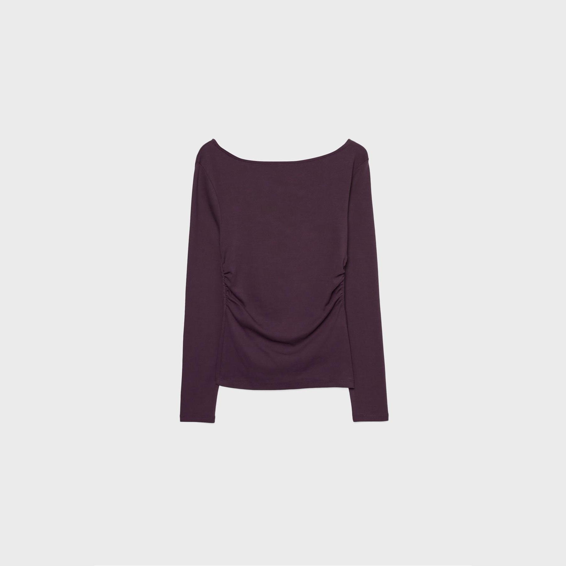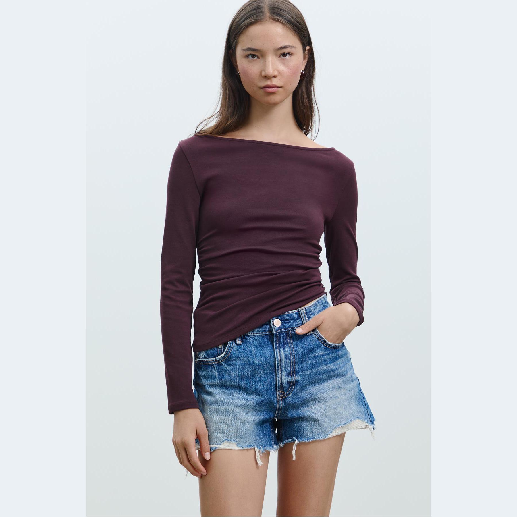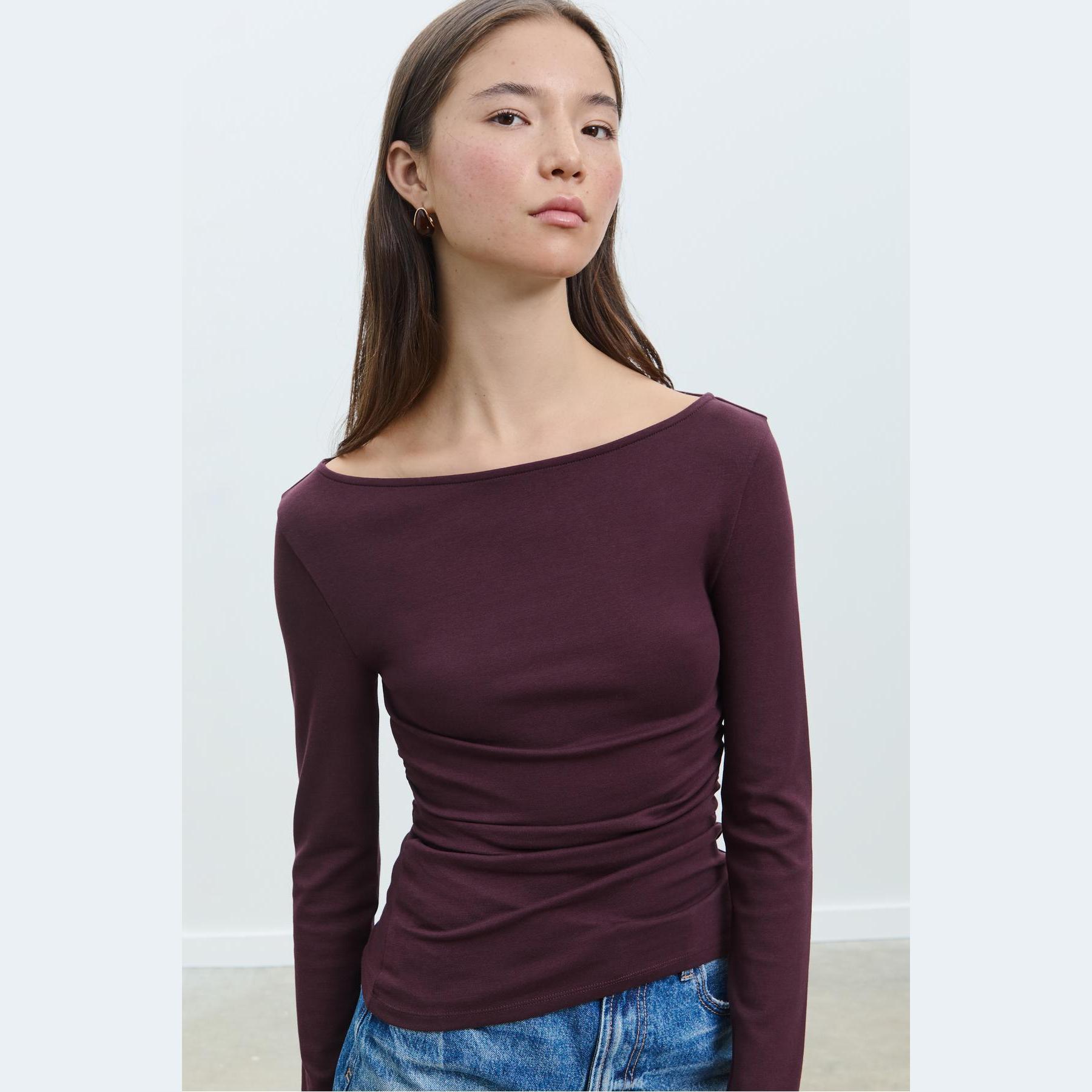 تيشيرت أنيق من Stradivarius بلون بنفسجي غني، مصنوع من خامة ناعمة بتركيبة مرنة، بياقة دائرية وأكمام طويلة، مزود بتفاصيل بُزُوز جانبية تضيف لمسة أنثوية وعصرية، مثالي للإطلالات اليومية أو التنسيقات الكاجوال.