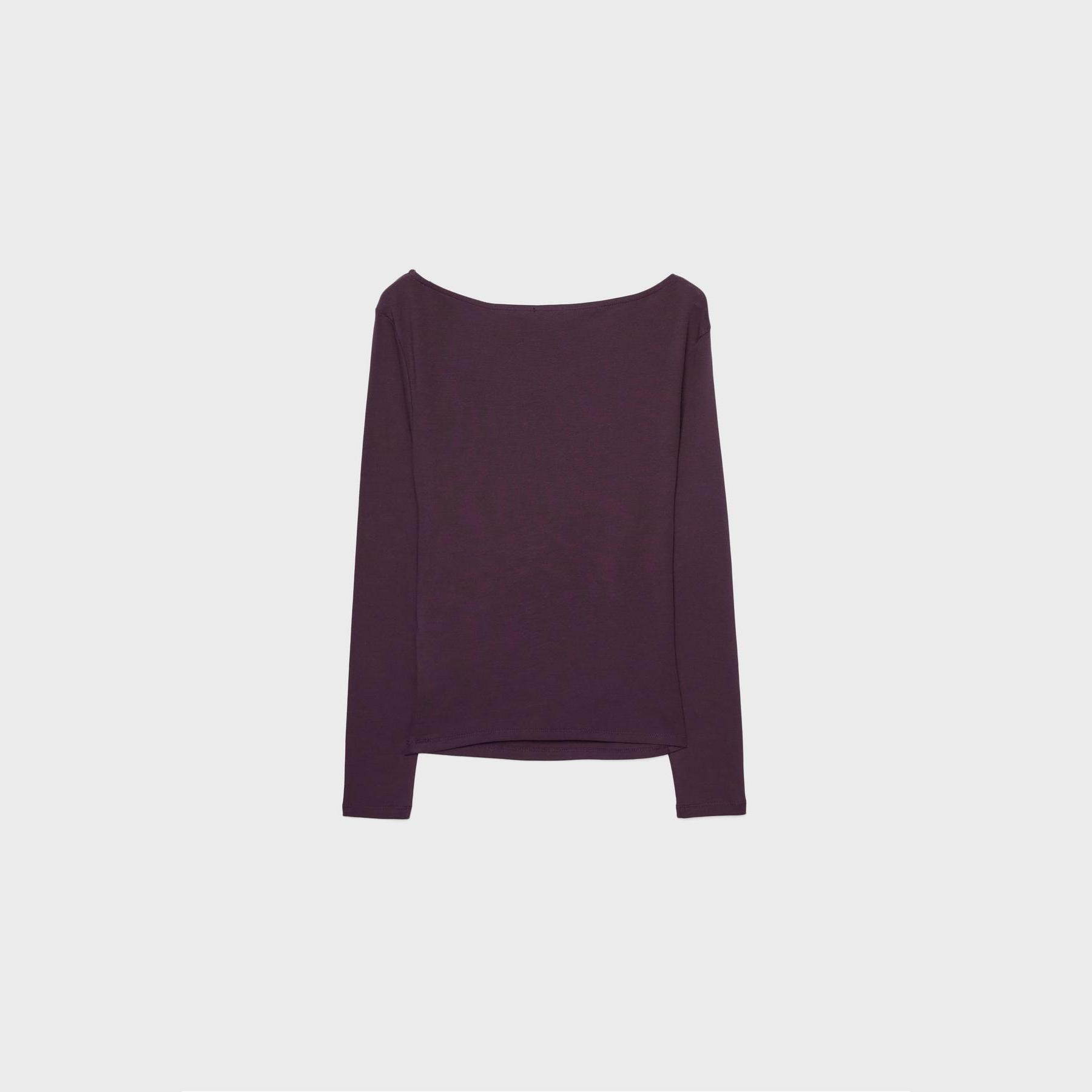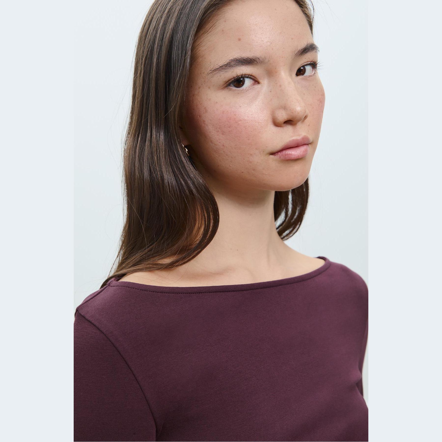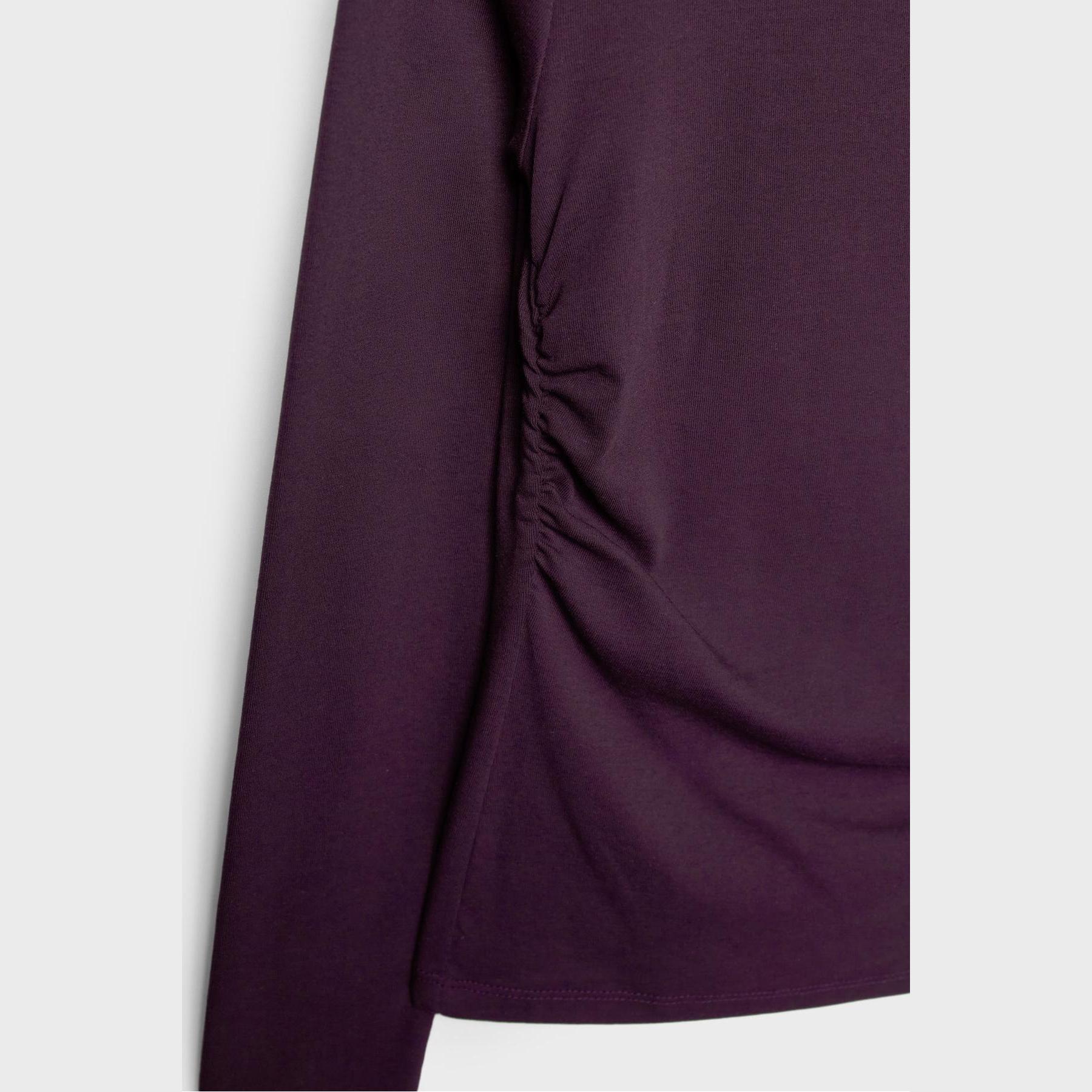 تيشيرت أنيق من Stradivarius بلون بنفسجي غني، مصنوع من خامة ناعمة بتركيبة مرنة، بياقة دائرية وأكمام طويلة، مزود بتفاصيل بُزُوز جانبية تضيف لمسة أنثوية وعصرية، مثالي للإطلالات اليومية أو التنسيقات الكاجوال.