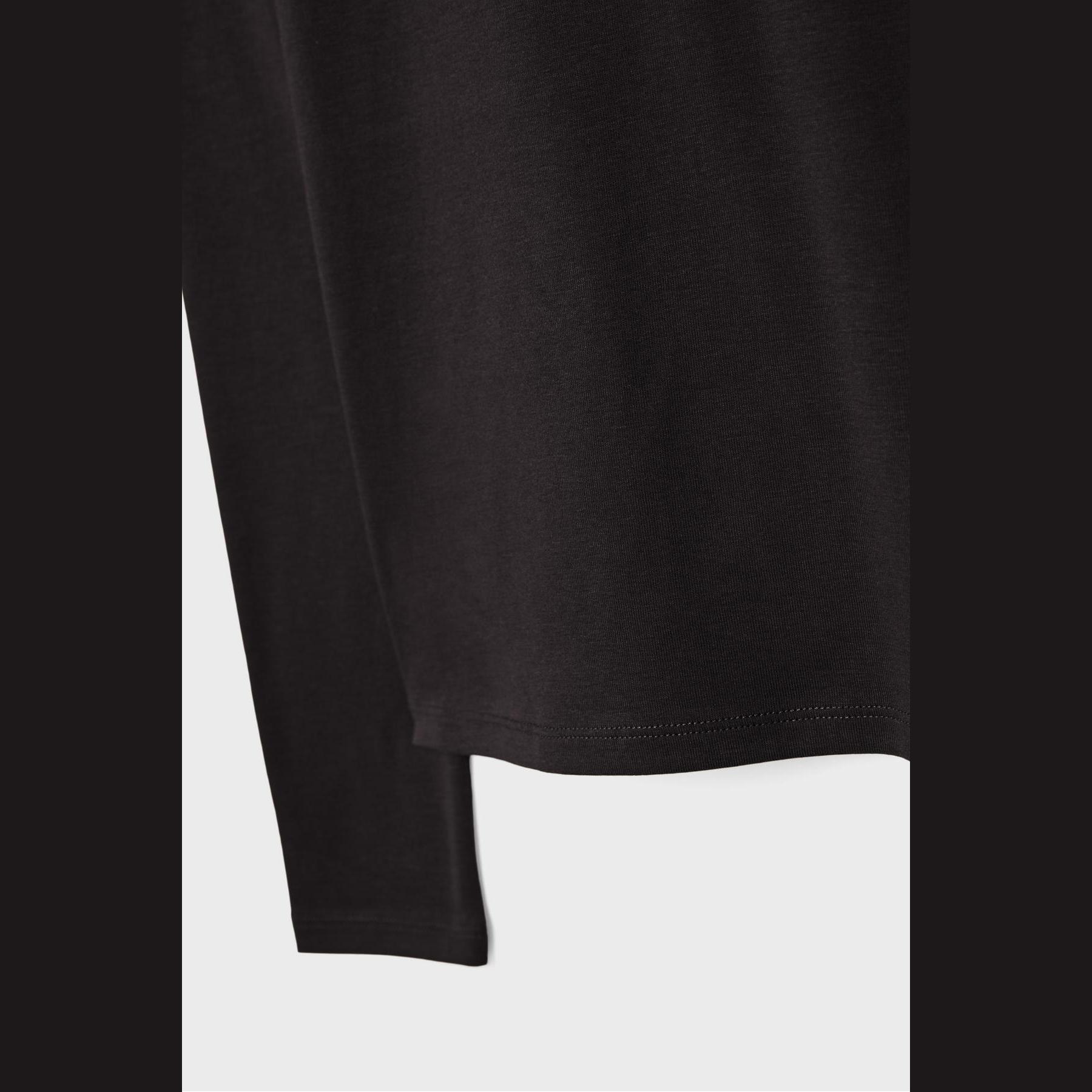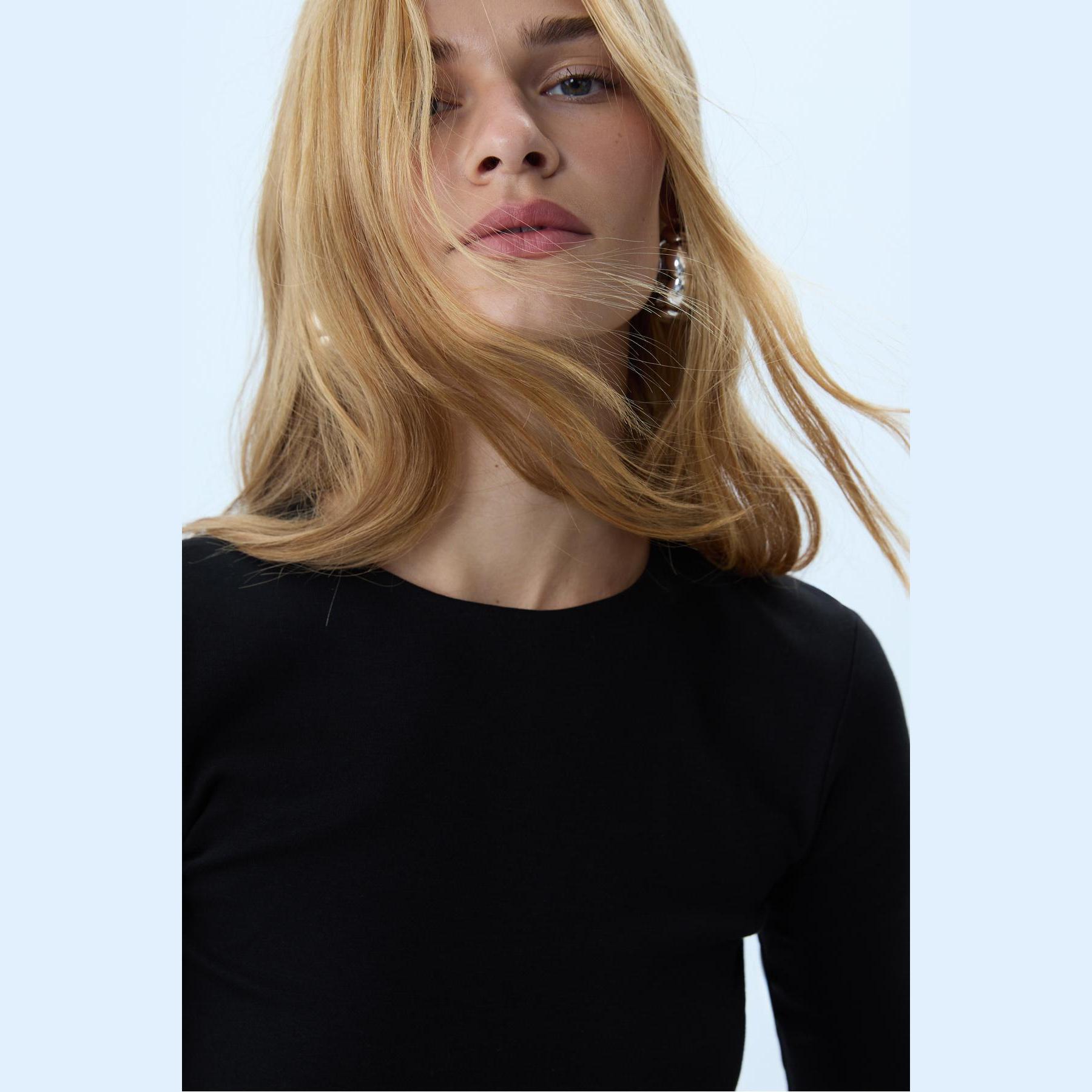 تيشيرت عملي من Stradivarius بلون أسود كلاسيكي، مصنوع من خامة ناعمة بتركيبة مرنة، بياقة دائرية وأكمام طويلة، يمنحك إطلالة بسيطة ومريحة مثالية للاستخدام اليومي أو كقطعة أساسية ضمن تنسيقات متعددة.