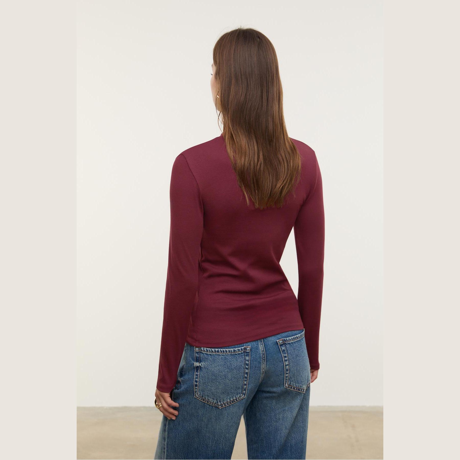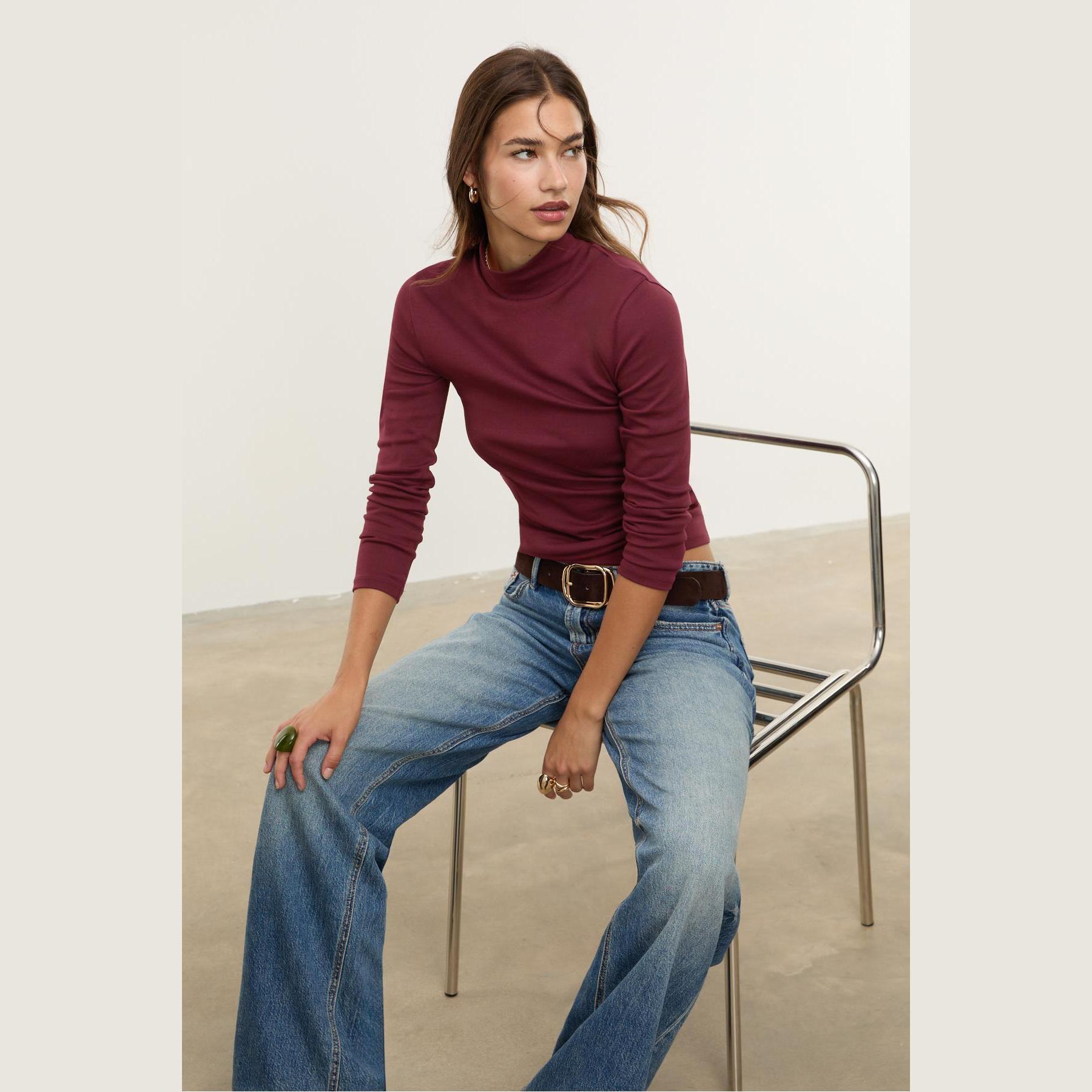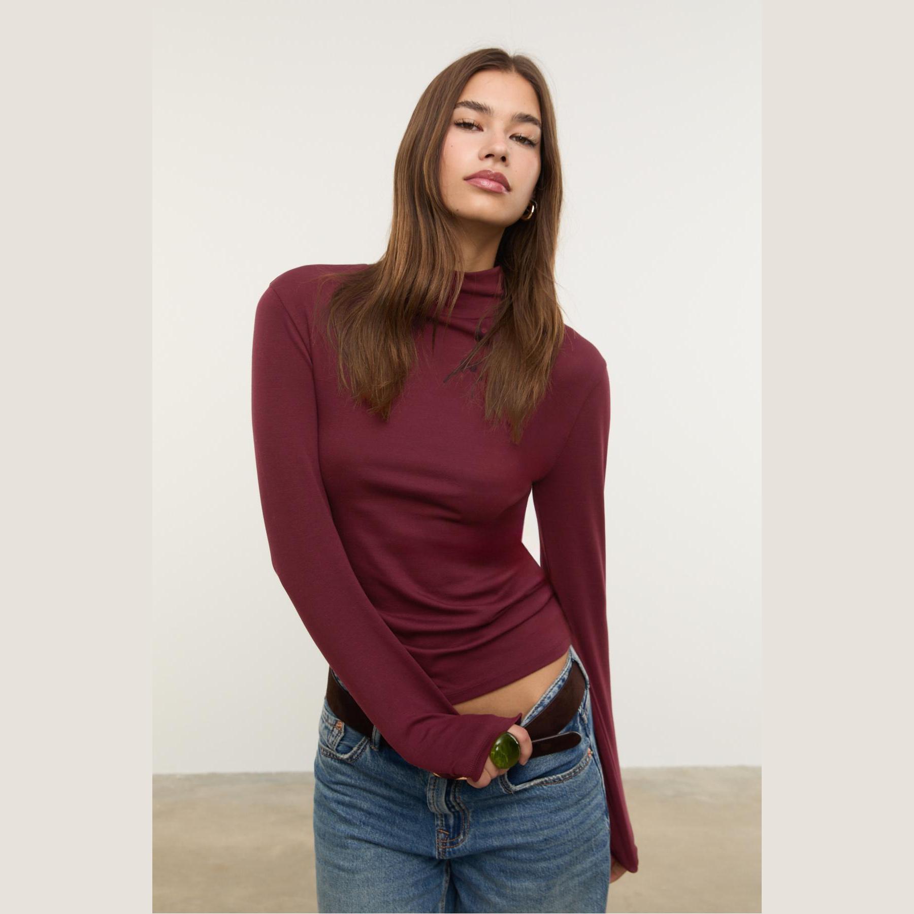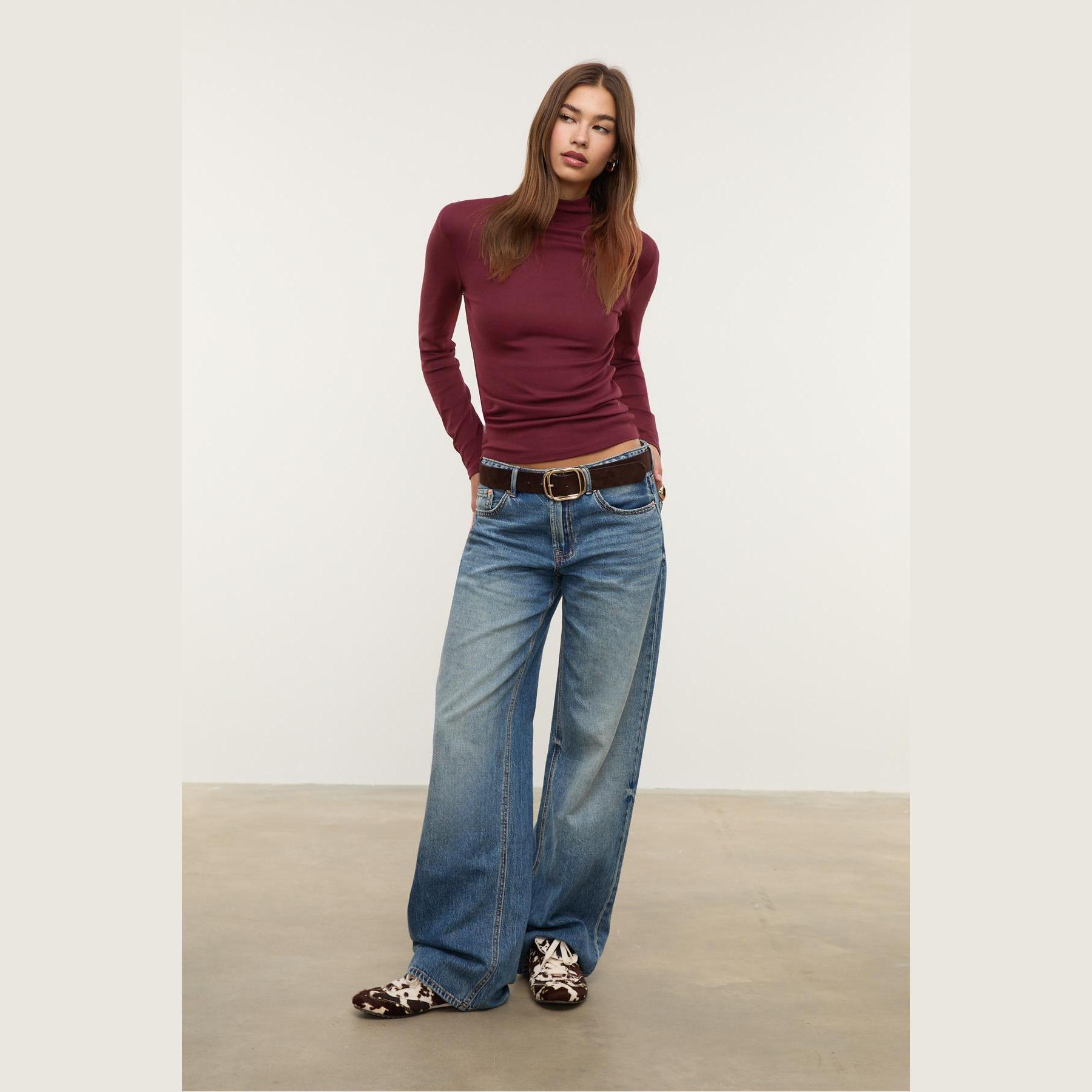 تيشيرت عملي من Stradivarius بلون بنفسجي غني، مصنوع من خامة ناعمة بتركيبة مرنة، بياقة عالية وأكمام قصيرة، يمنحك إطلالة بسيطة وعصرية مثالية للاستخدام اليومي أو كقطعة أساسية ضمن تنسيقات متعددة.