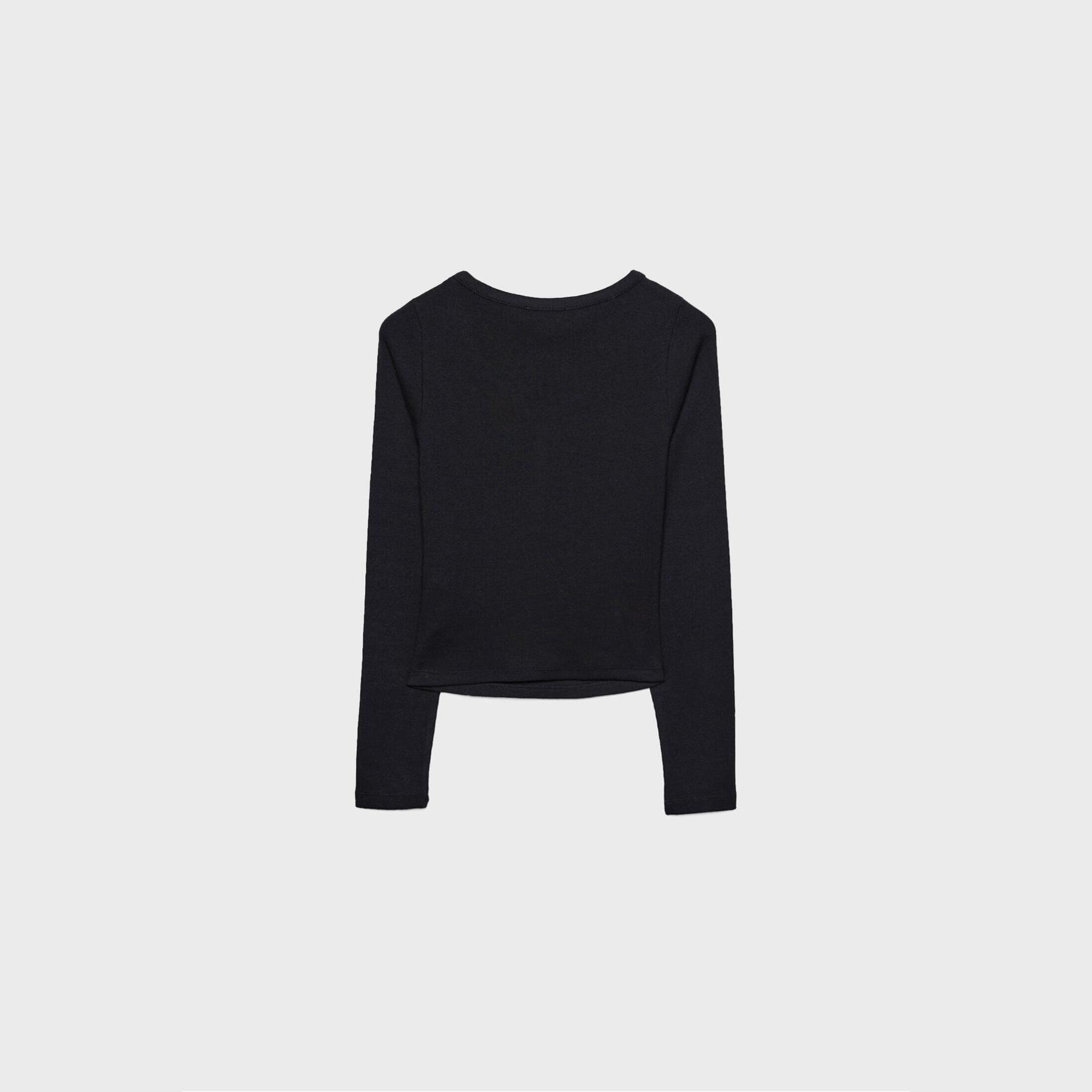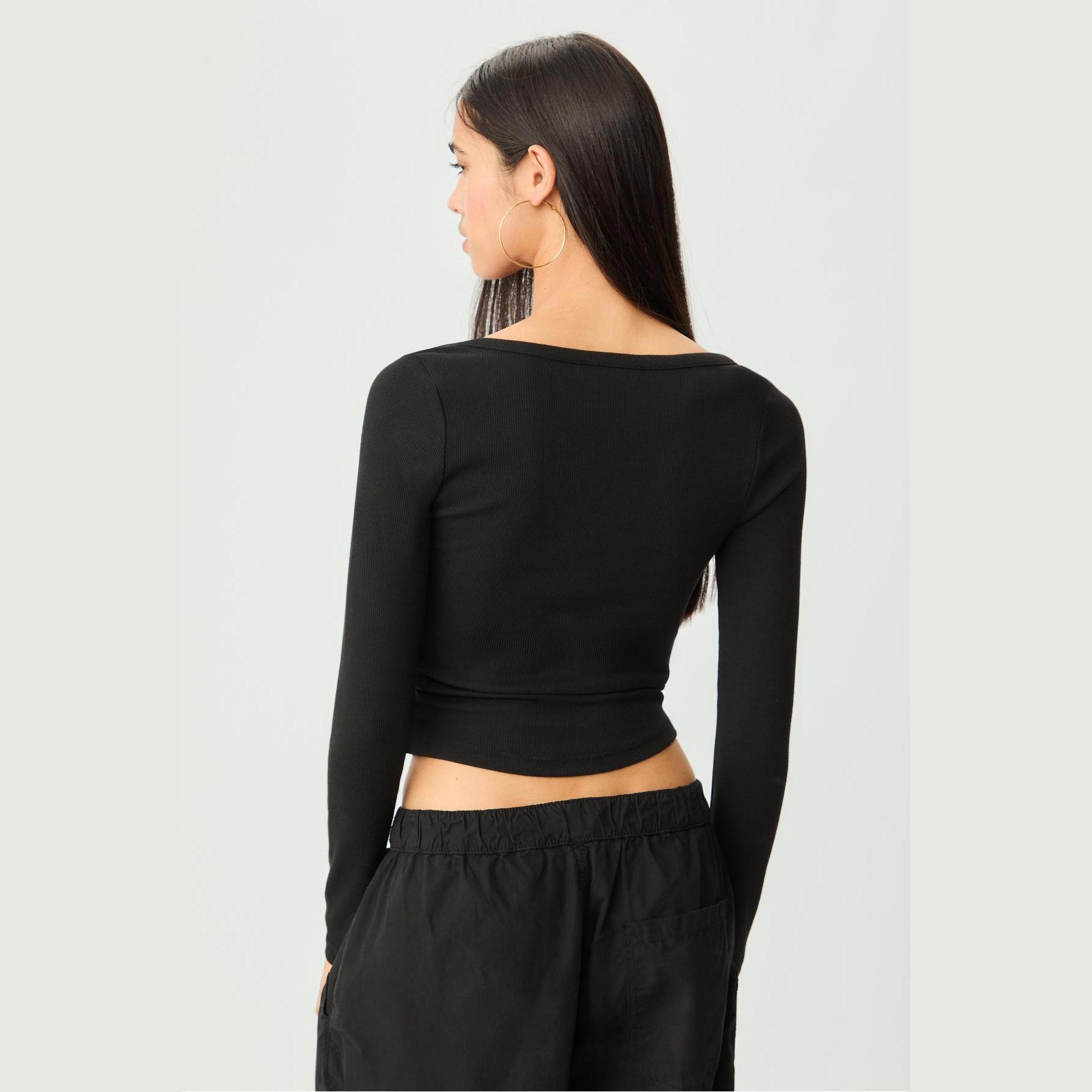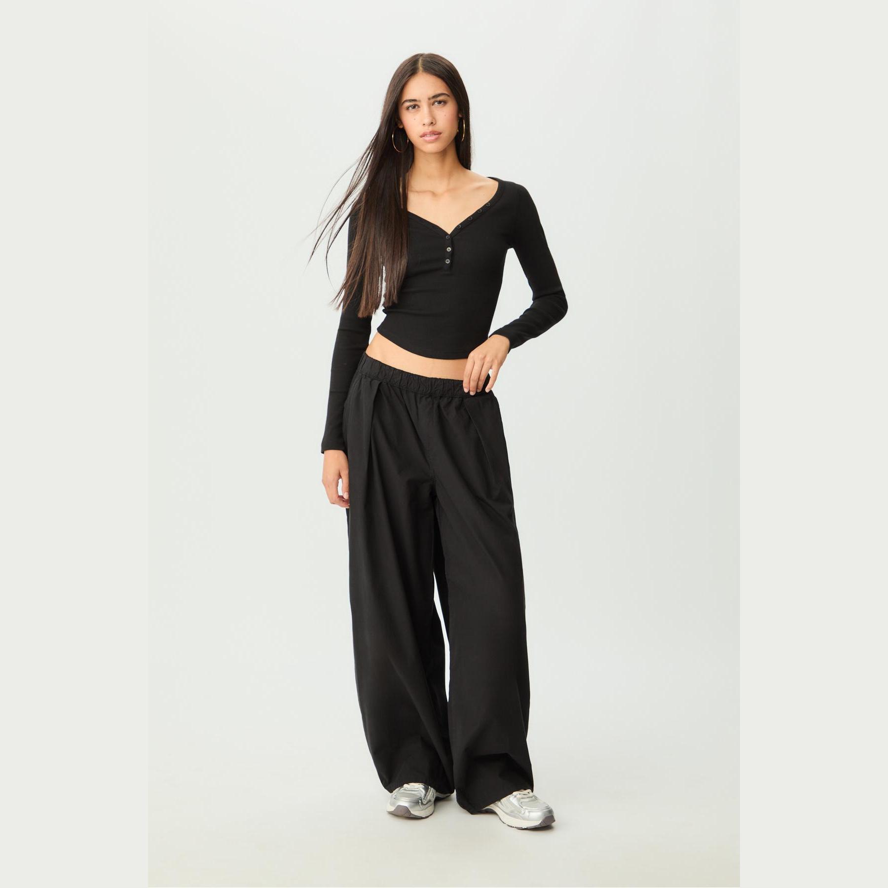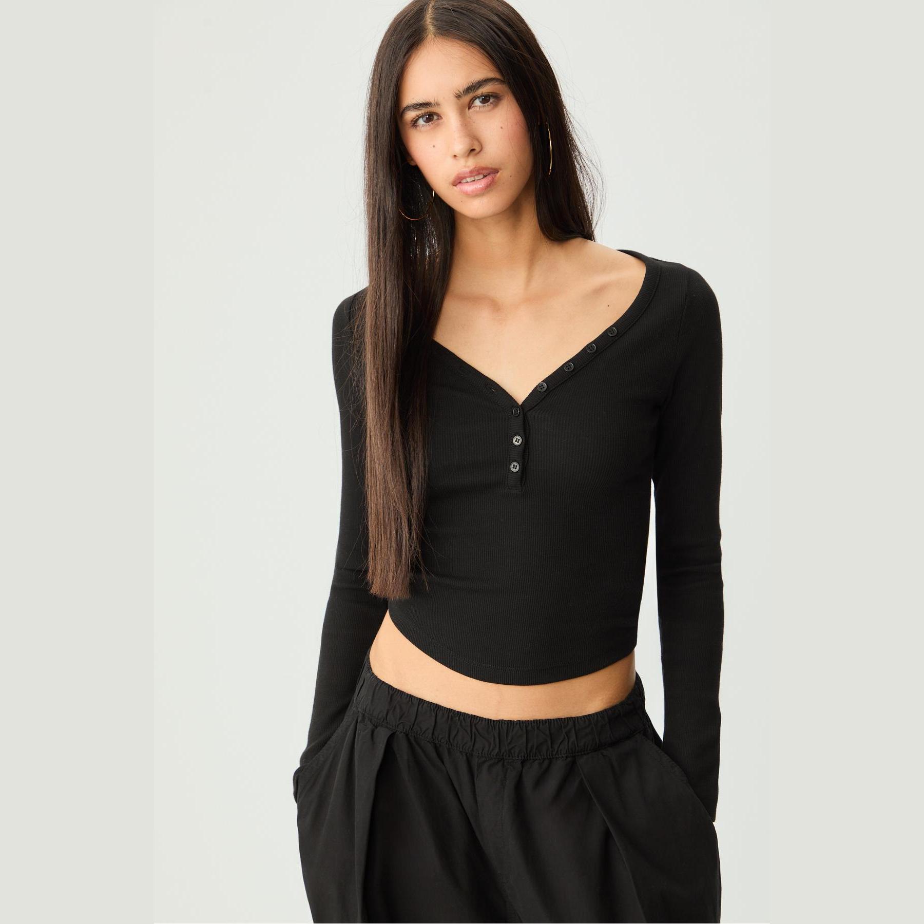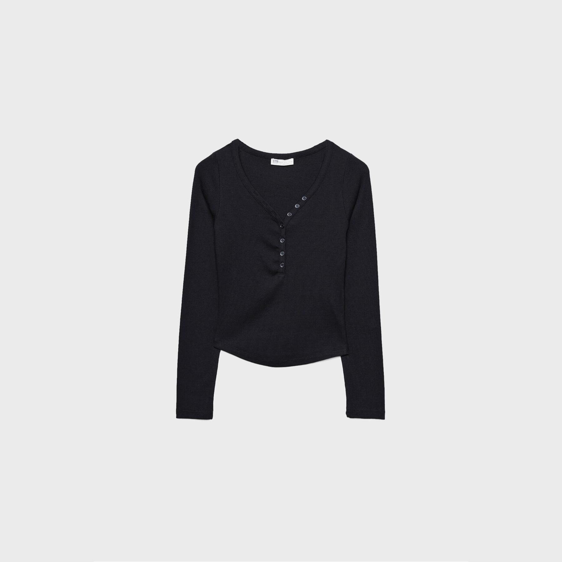 تيشيرت أنيق من Stradivarius بلون أسود كلاسيكي، مصنوع من خامة ناعمة بتركيبة مرنة، بياقة V وأكمام طويلة، مزود بأزرار أمامية تضيف لمسة أنثوية وعصرية، يمنحك إطلالة مريحة ومثالية للاستخدام اليومي أو الكاجوال.