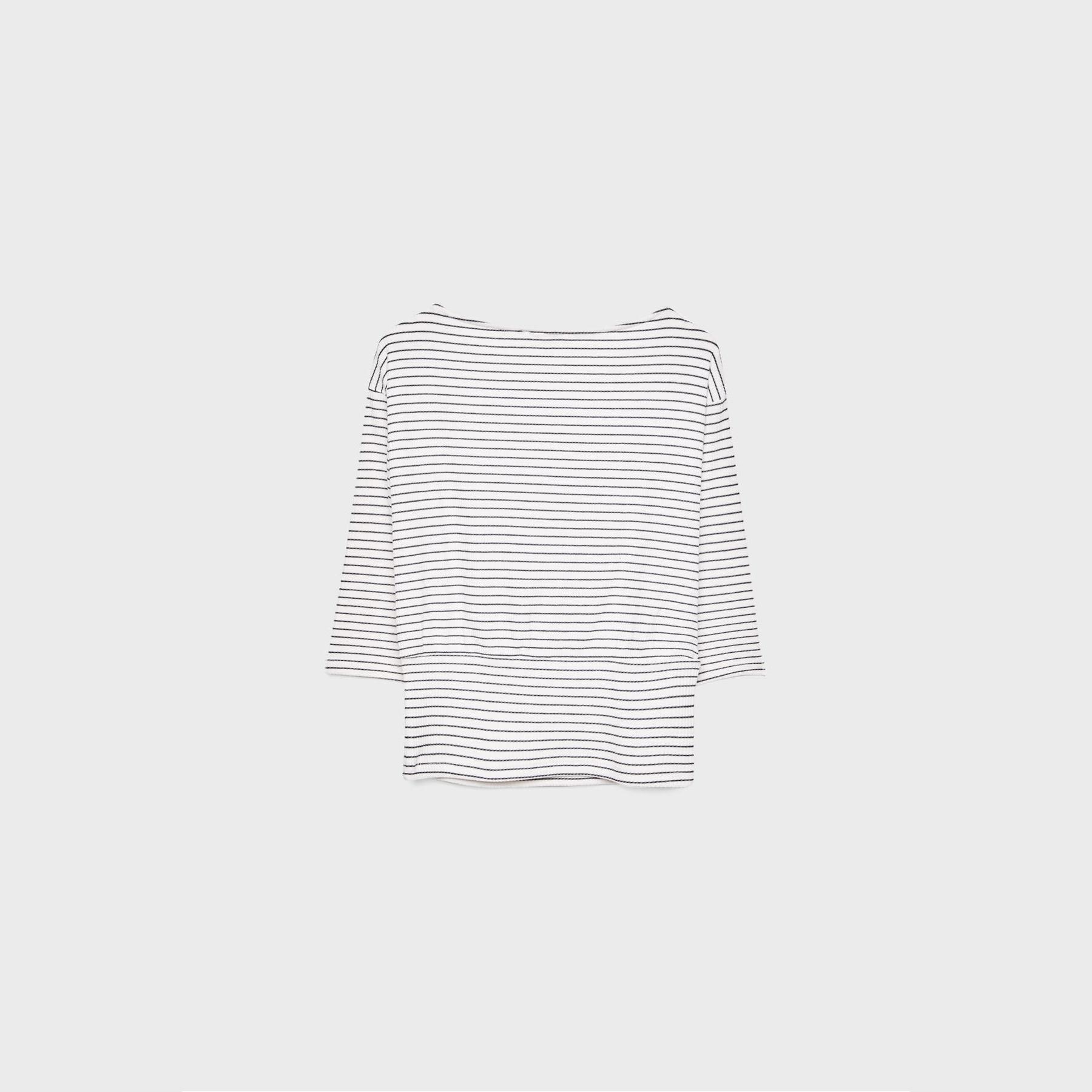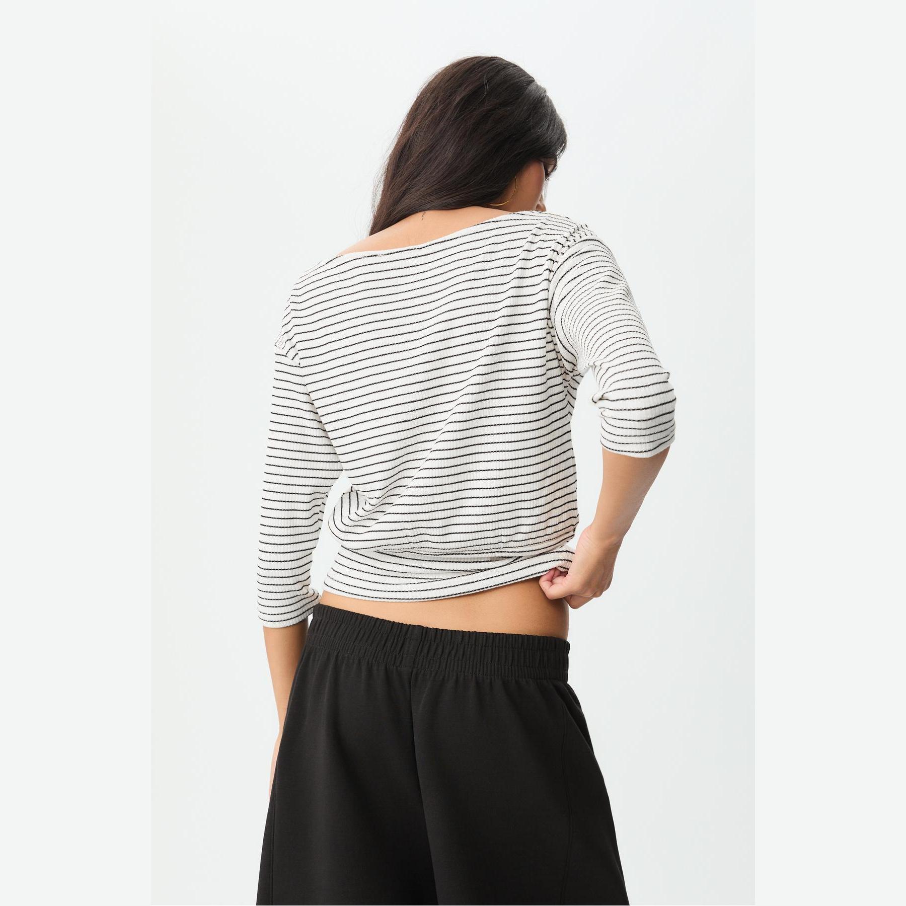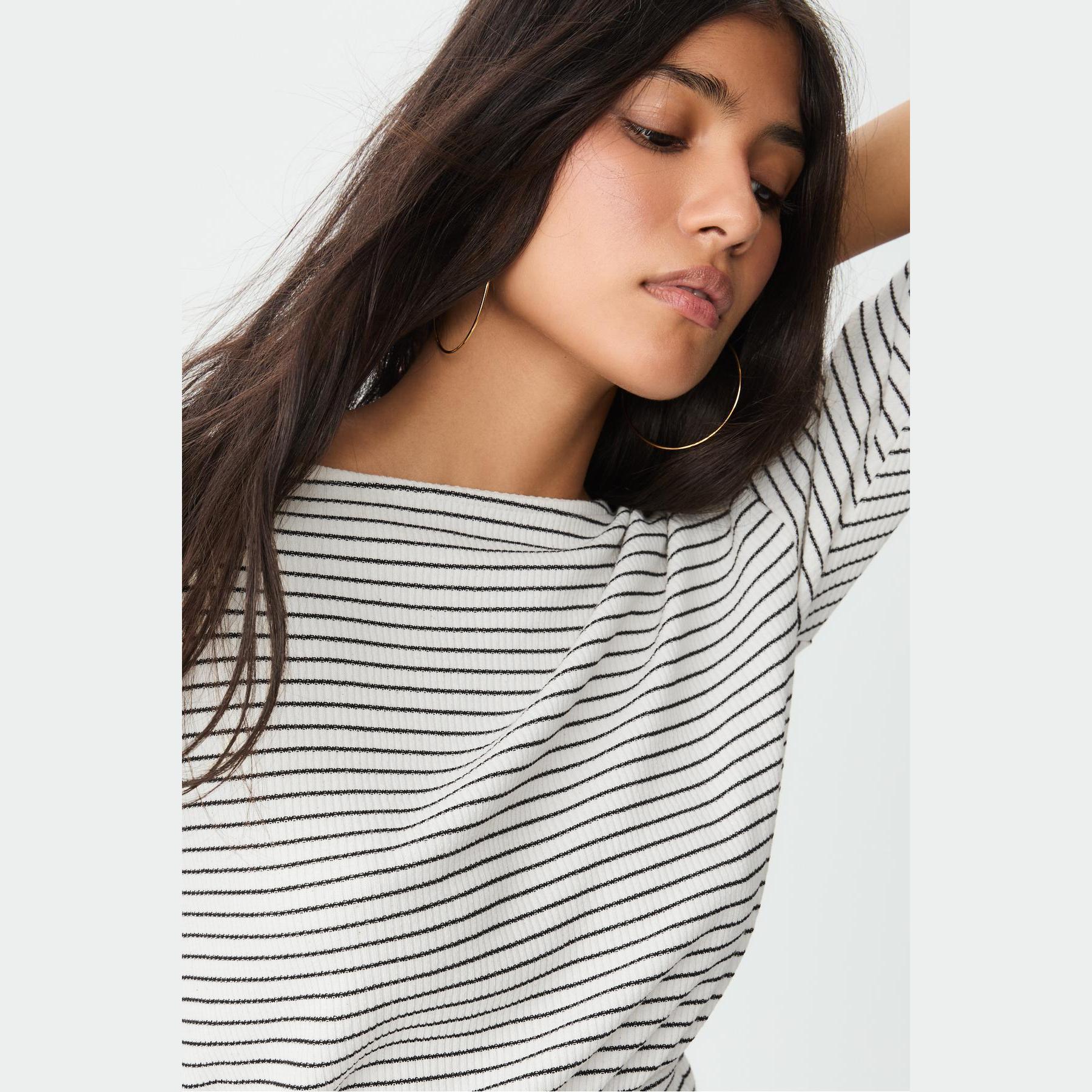 تيشيرت عملي من Stradivarius بنقشة مخططة باللون الرمادي، مصنوع من خامة ناعمة بتركيبة منسوجة، بياقة دائرية وأكمام طويلة، مزود بقصة مريحة وتفاصيل جانبية قابلة للتعديل عند الحافة، يمنحك إطلالة كاجوال أنيقة ومثالية للاستخدام اليومي.