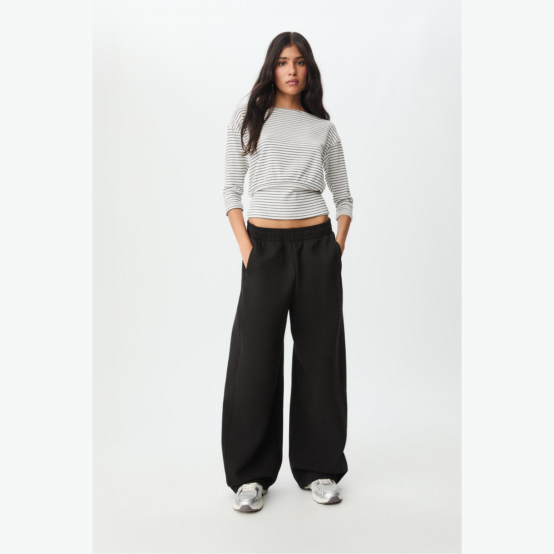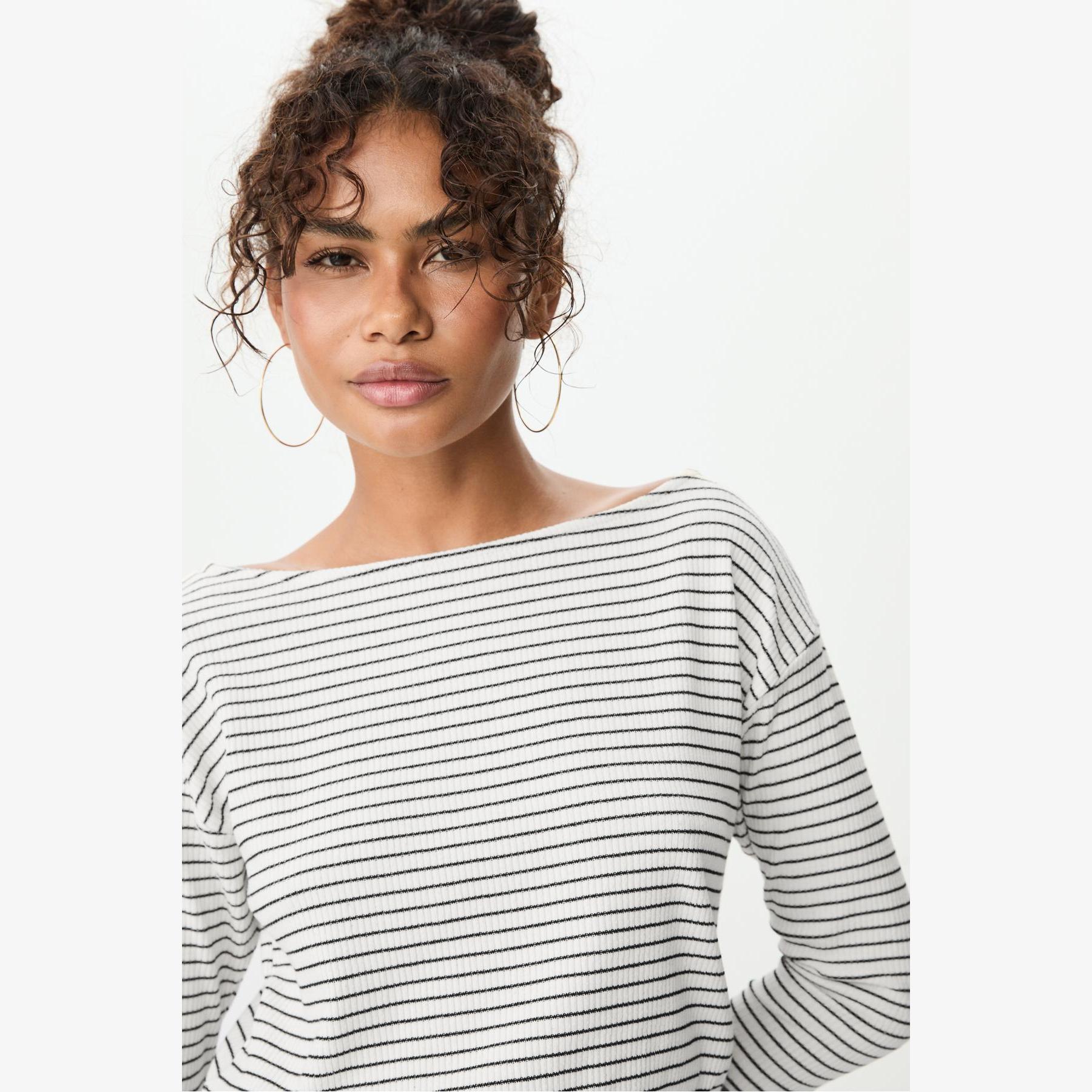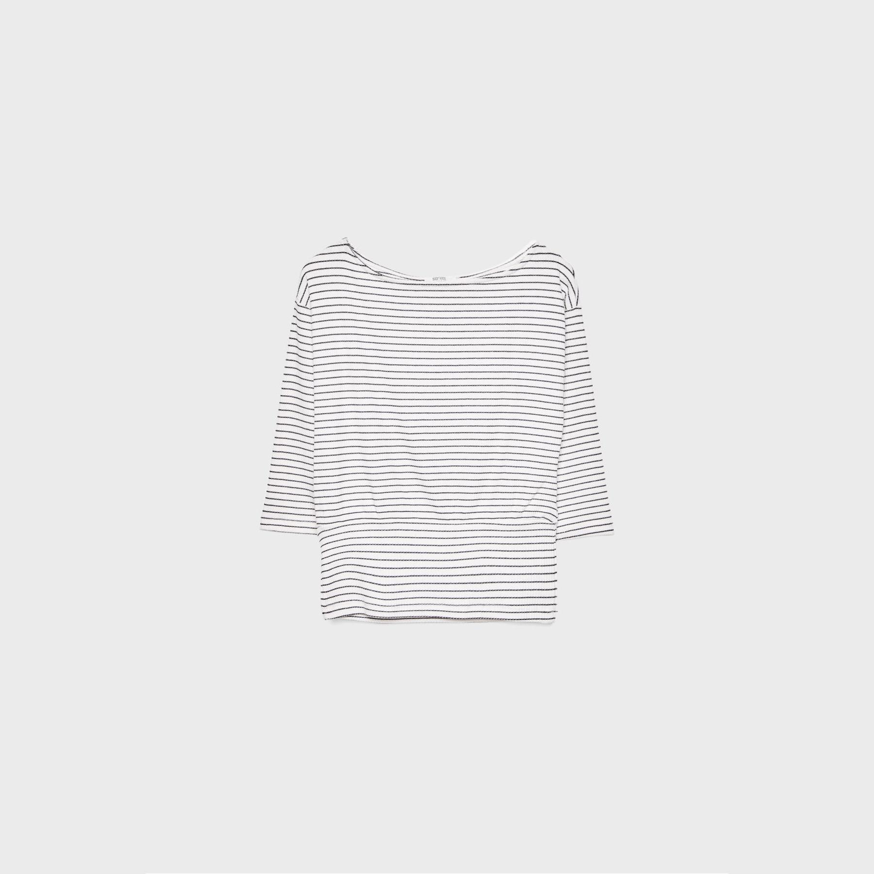 تيشيرت عملي من Stradivarius بنقشة مخططة باللون الرمادي، مصنوع من خامة ناعمة بتركيبة منسوجة، بياقة دائرية وأكمام طويلة، مزود بقصة مريحة وتفاصيل جانبية قابلة للتعديل عند الحافة، يمنحك إطلالة كاجوال أنيقة ومثالية للاستخدام اليومي.