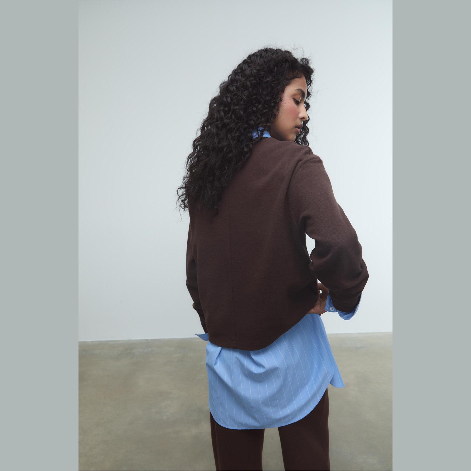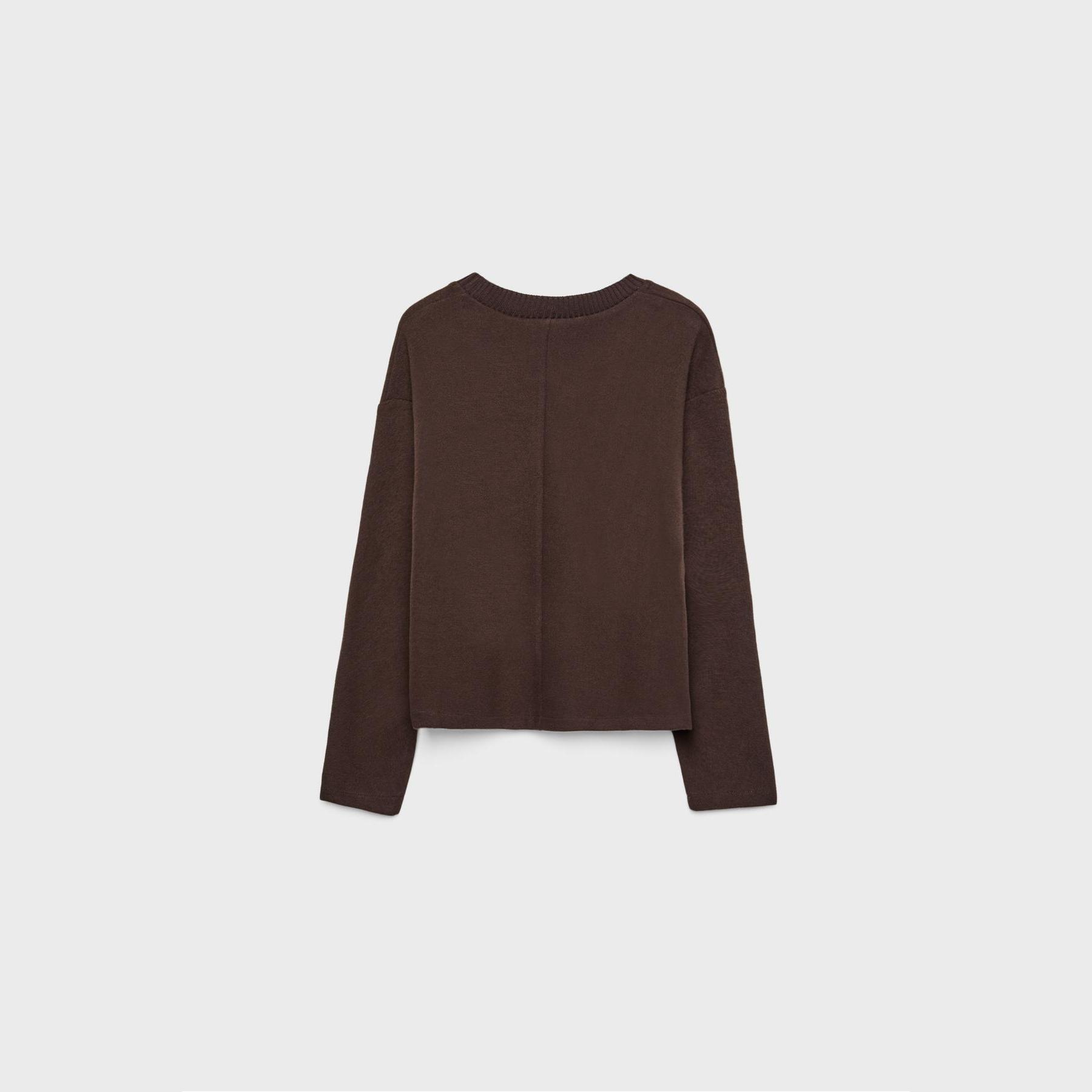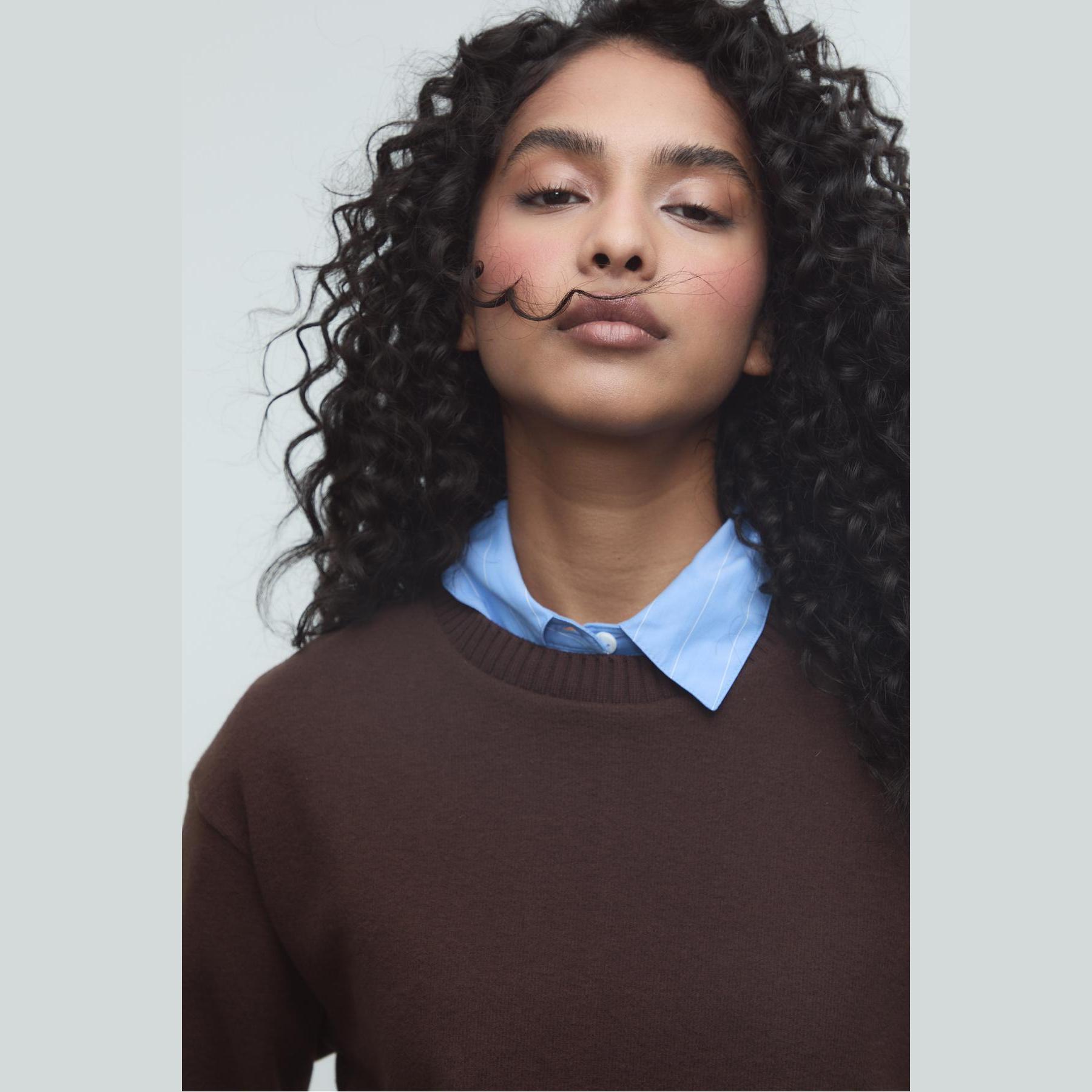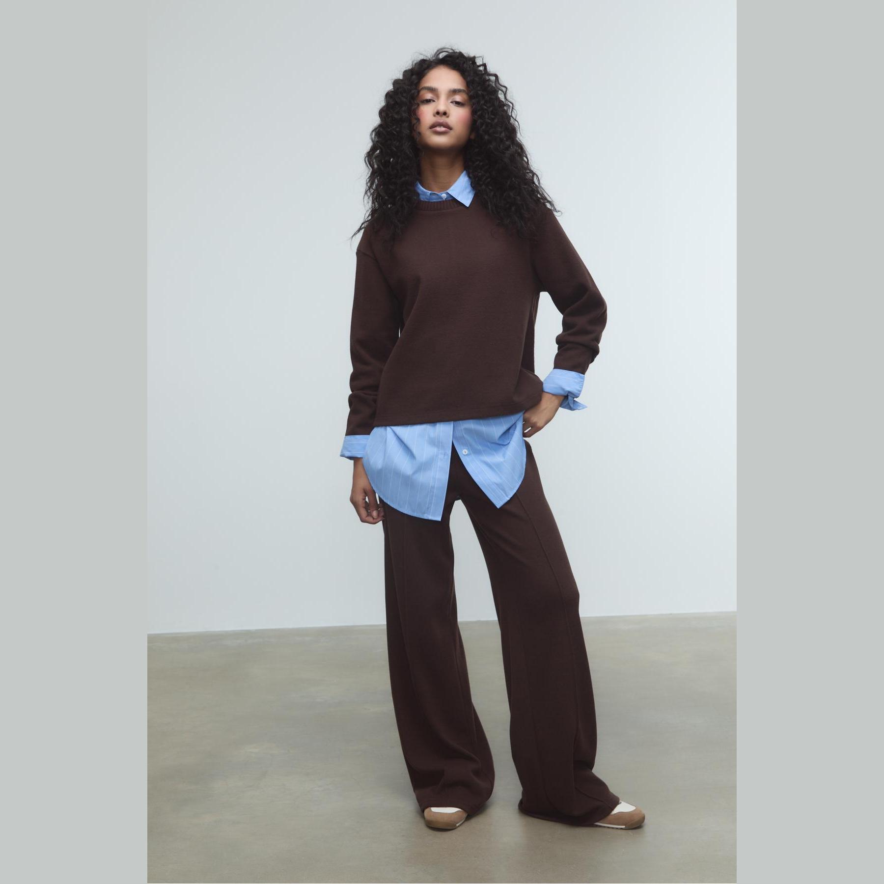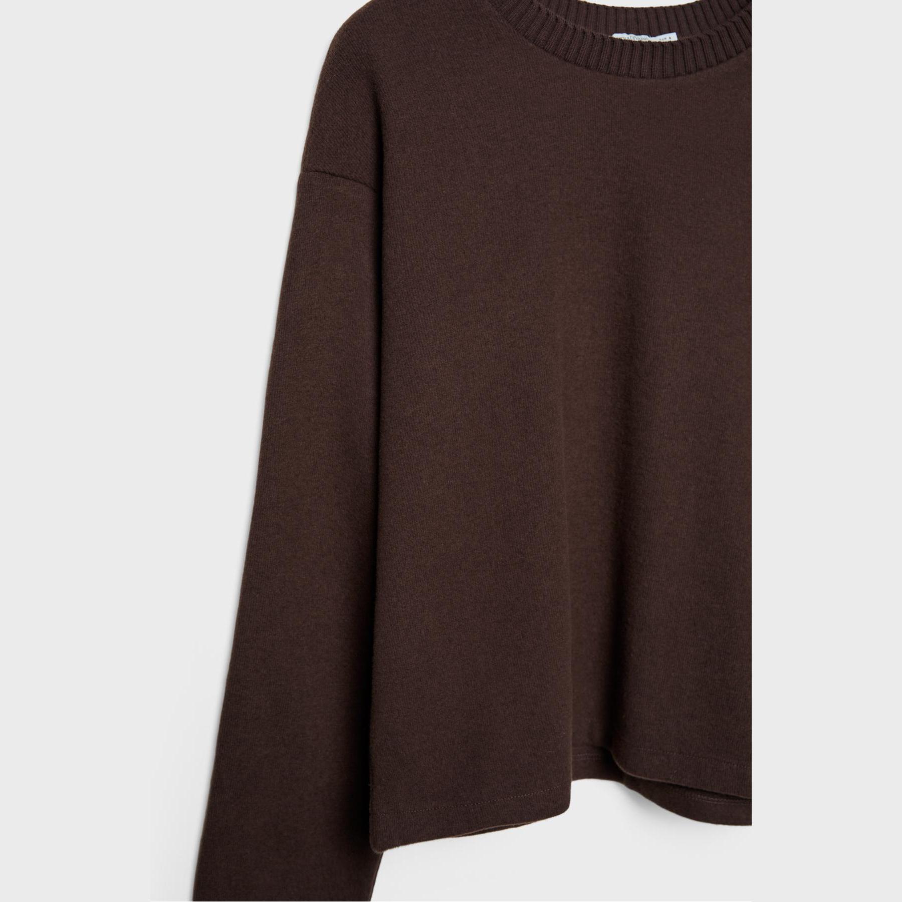 تيشيرت عملي من Stradivarius بلون بني دافئ، مصنوع من خامة محبوكة ناعمة، بياقة دائرية وأكمام طويلة، يتميز بقصة واسعة تمنحك راحة وانسيابية، مثالي للتنسيق مع بناطيل مستقيمة أو تنانير قصيرة لإطلالة كاجوال أنيقة.