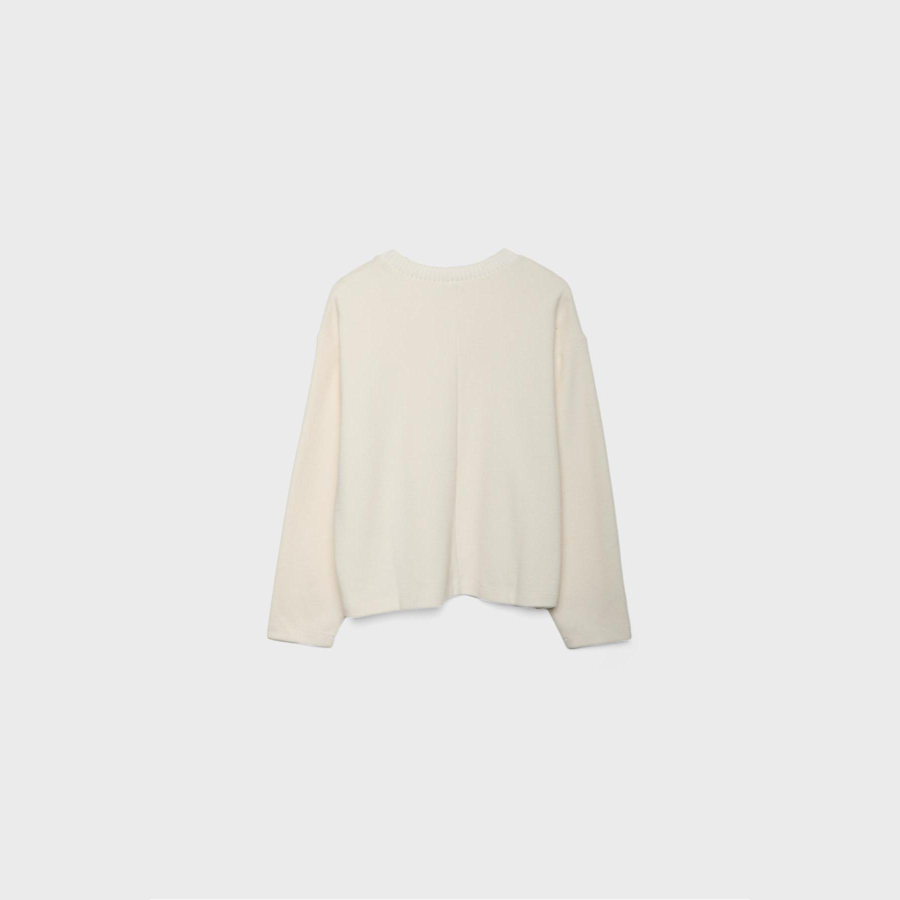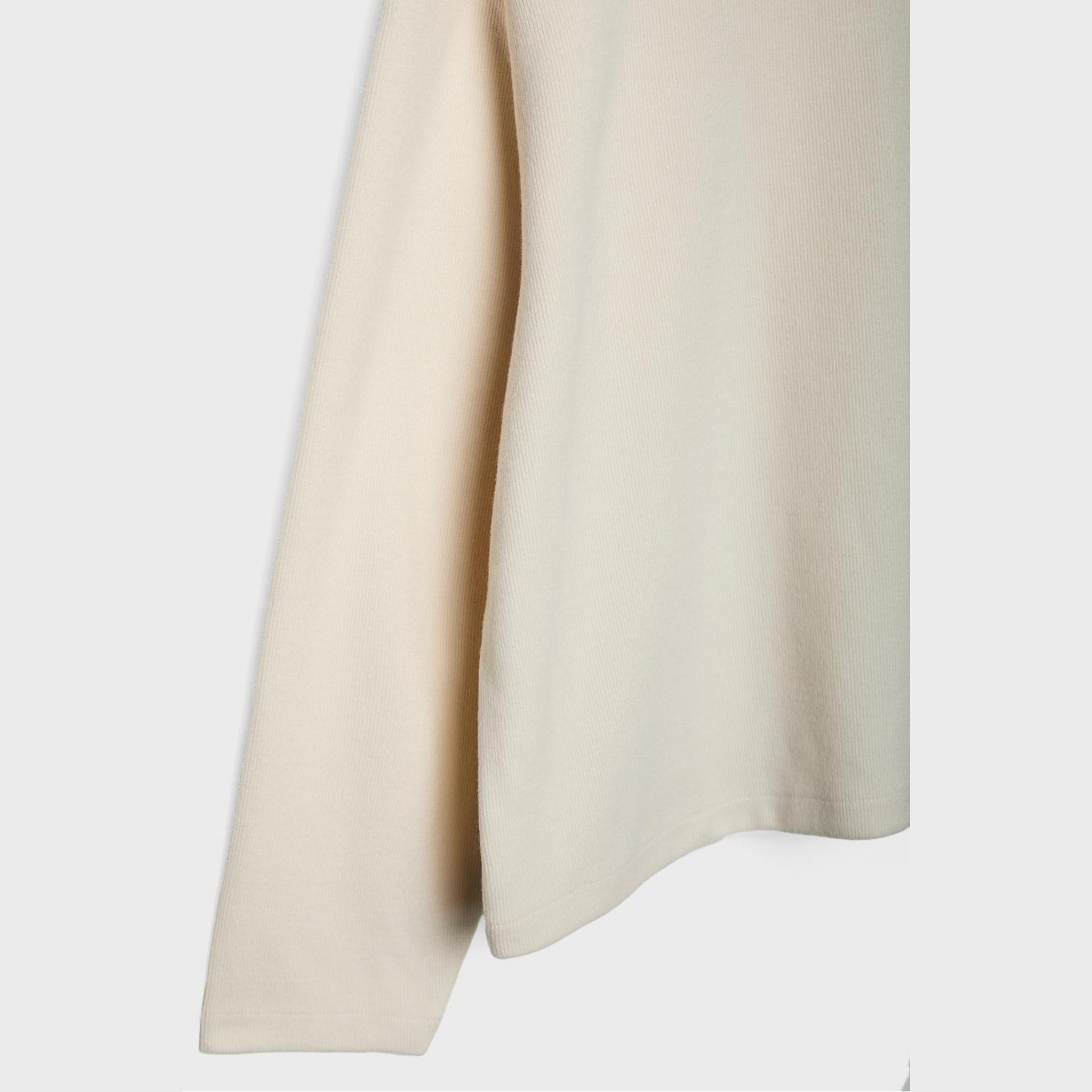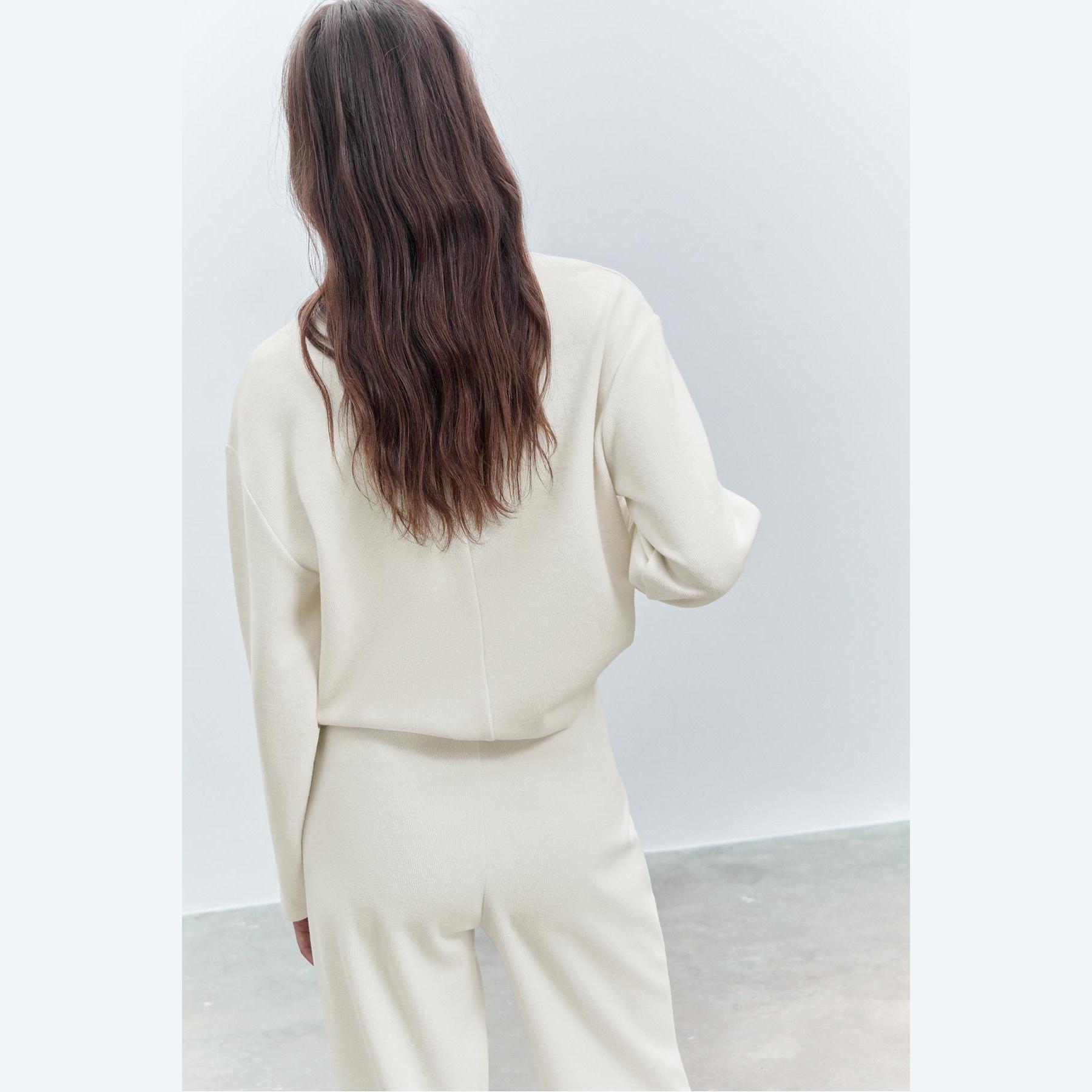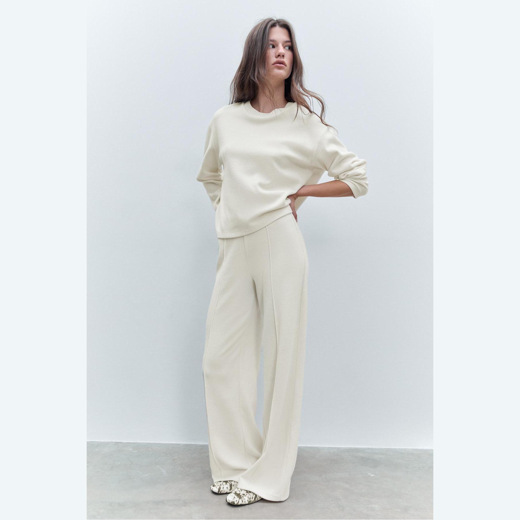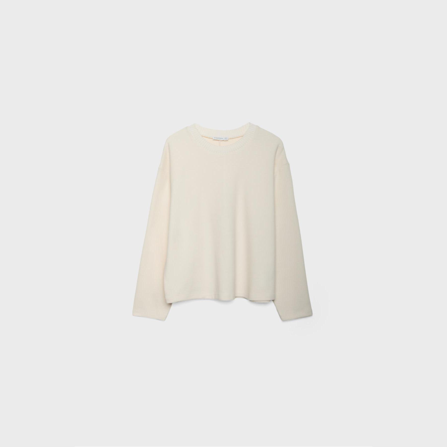 تيشيرت أنيق من Stradivarius بلون إكرو هادئ، مصنوع من خامة تريكو ناعمة بتركيبة منسوجة، بياقة دائرية وأكمام طويلة، يتميز بقصة واسعة تمنحك راحة وانسيابية، مثالي للتنسيق مع بناطيل مستقيمة أو تنانير قصيرة لإطلالة كاجوال أنيقة.