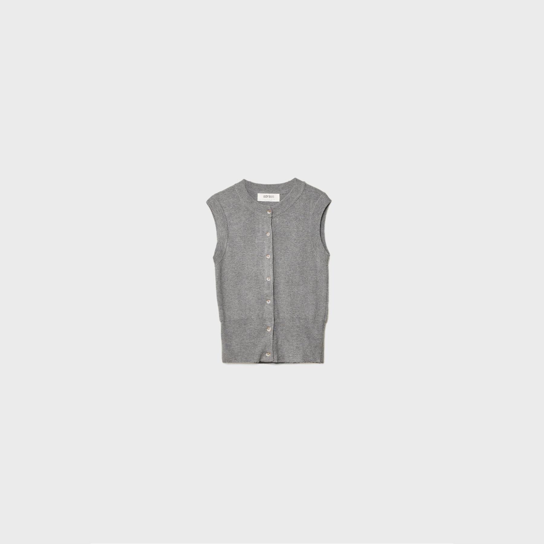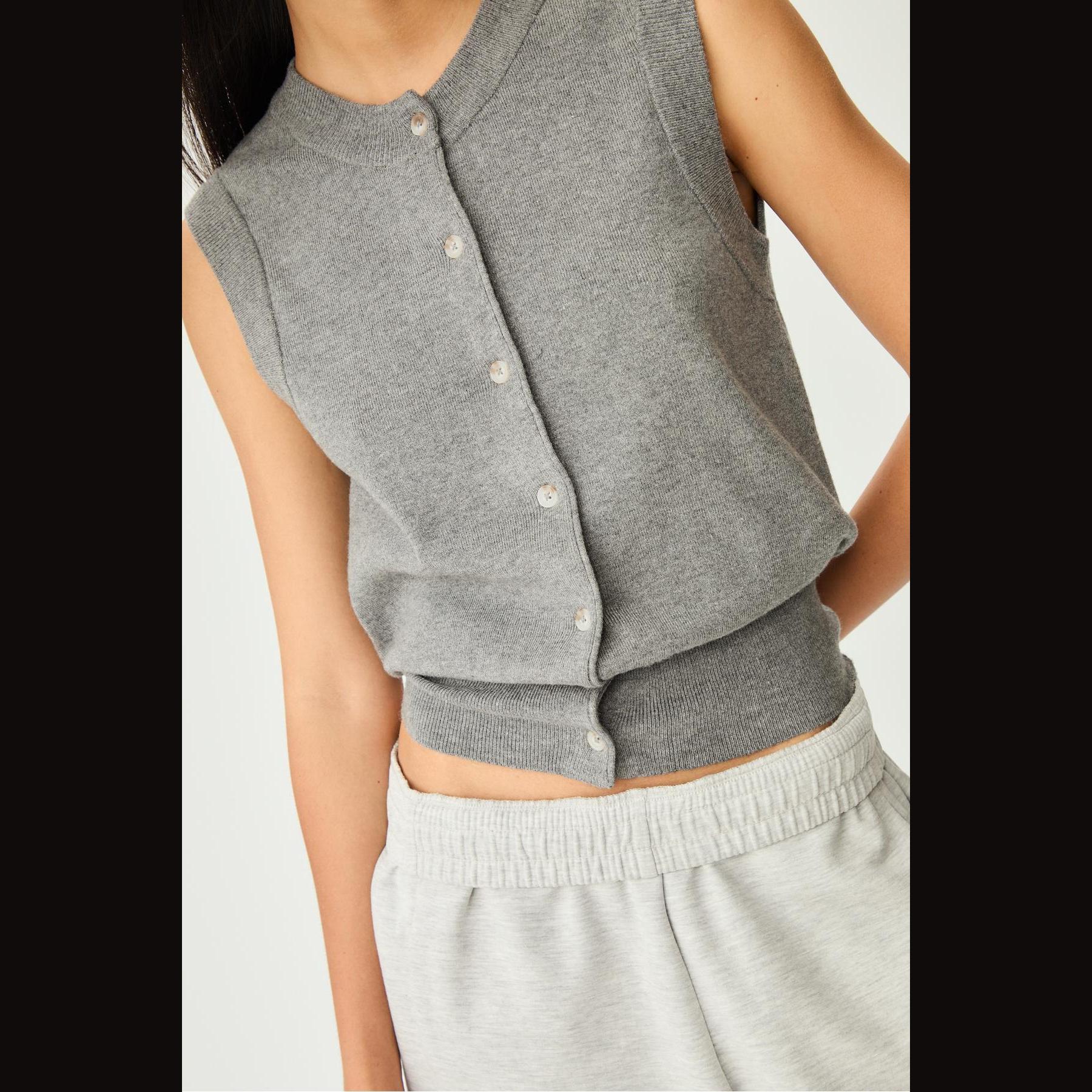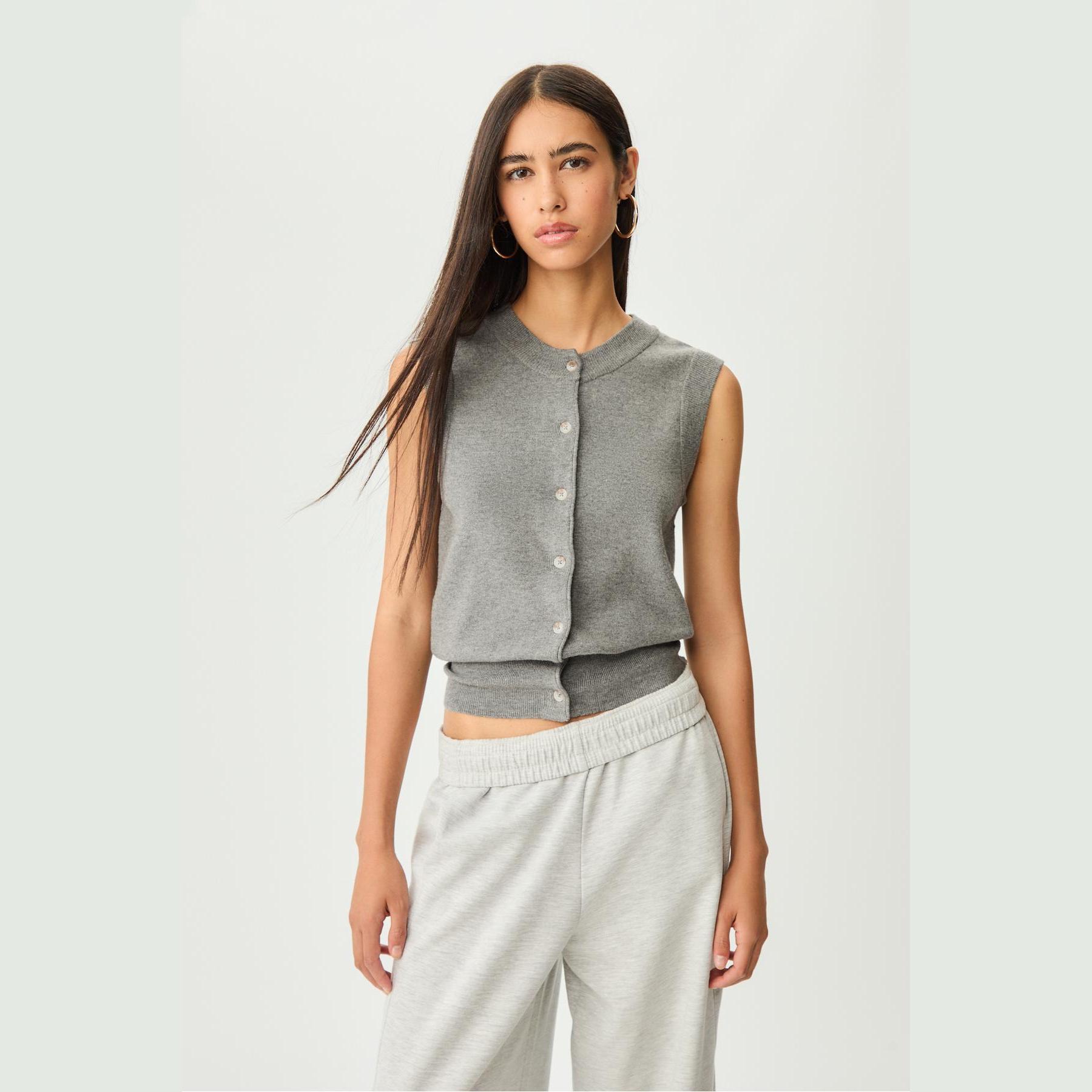 فيست أنيق من Stradivarius بلون رمادي هادئ، مصنوع من خامة محبوكة ناعمة، بياقة دائرية وقصة ضيقة، يتميز بتفاصيل ريب على الحواف وإغلاق أمامي بأزرار، مثالي للتنسيق فوق تيشيرتات أو بلوزات خفيفة لإطلالة كاجوال أنيقة وعصرية.