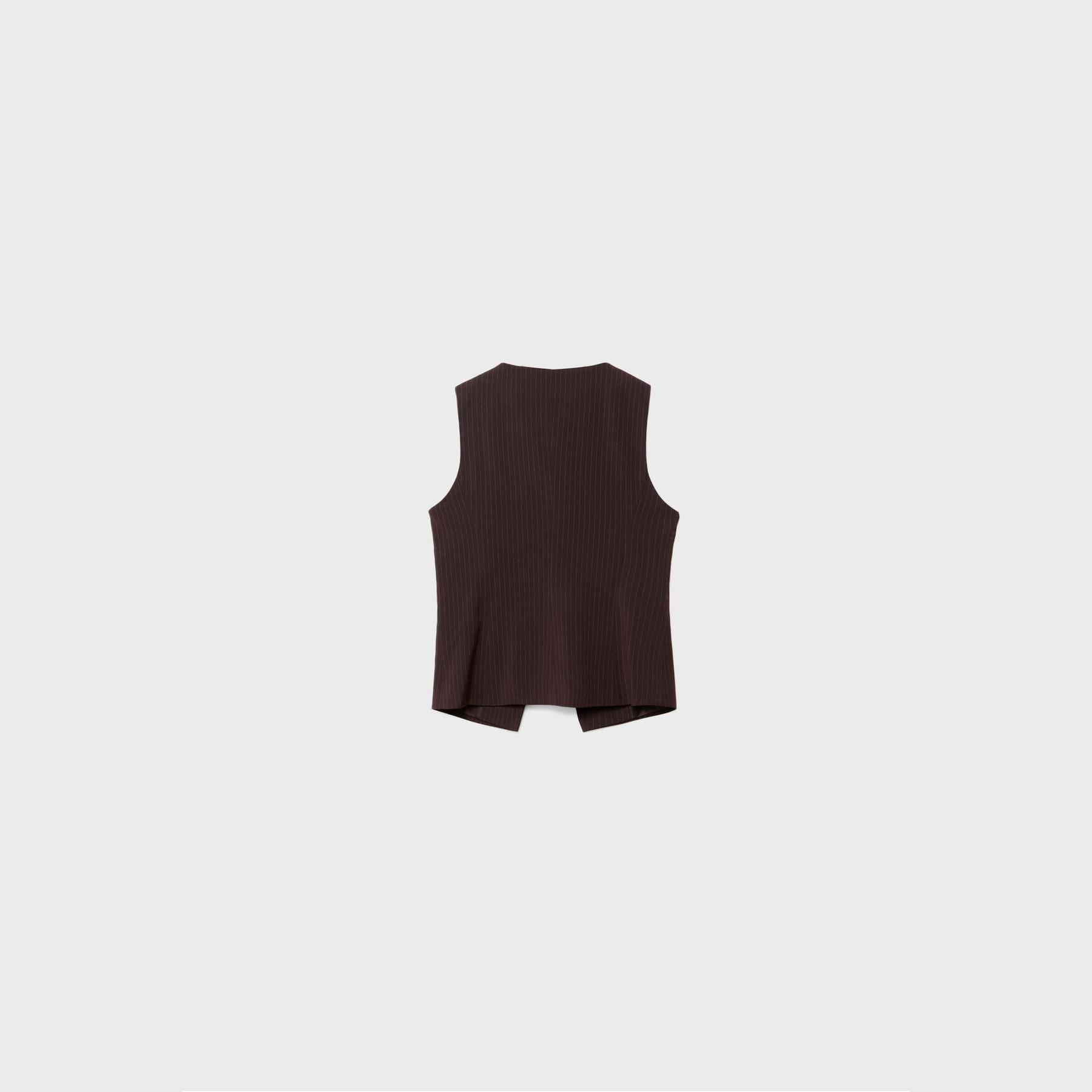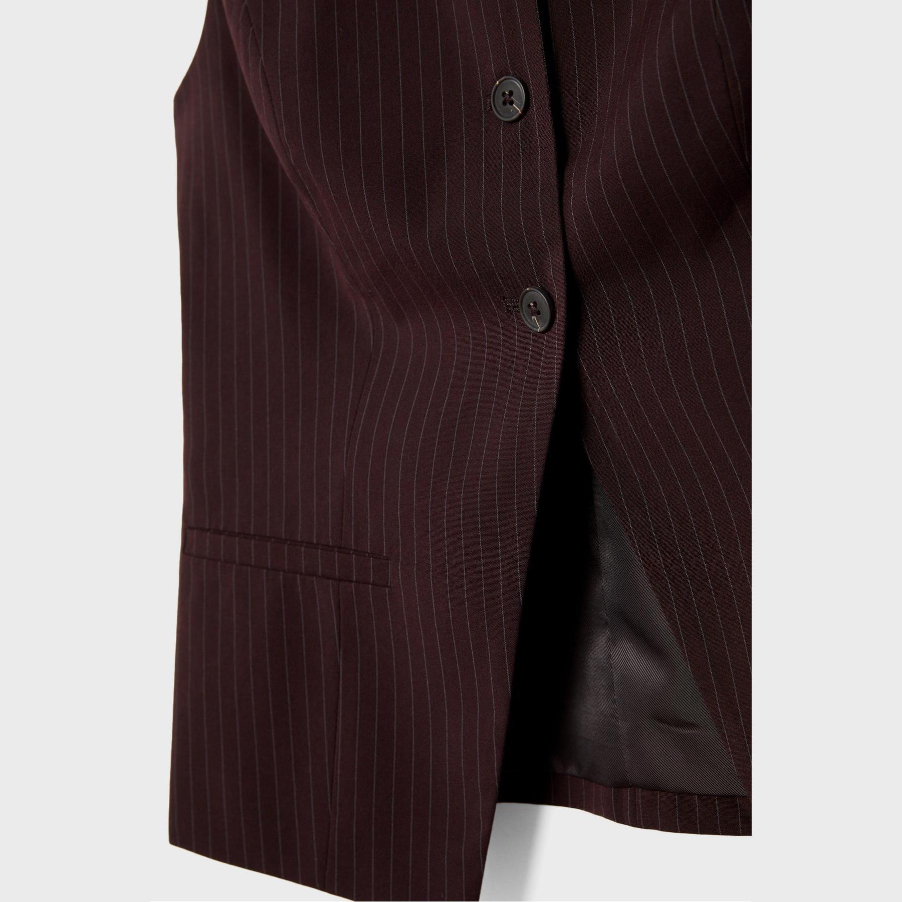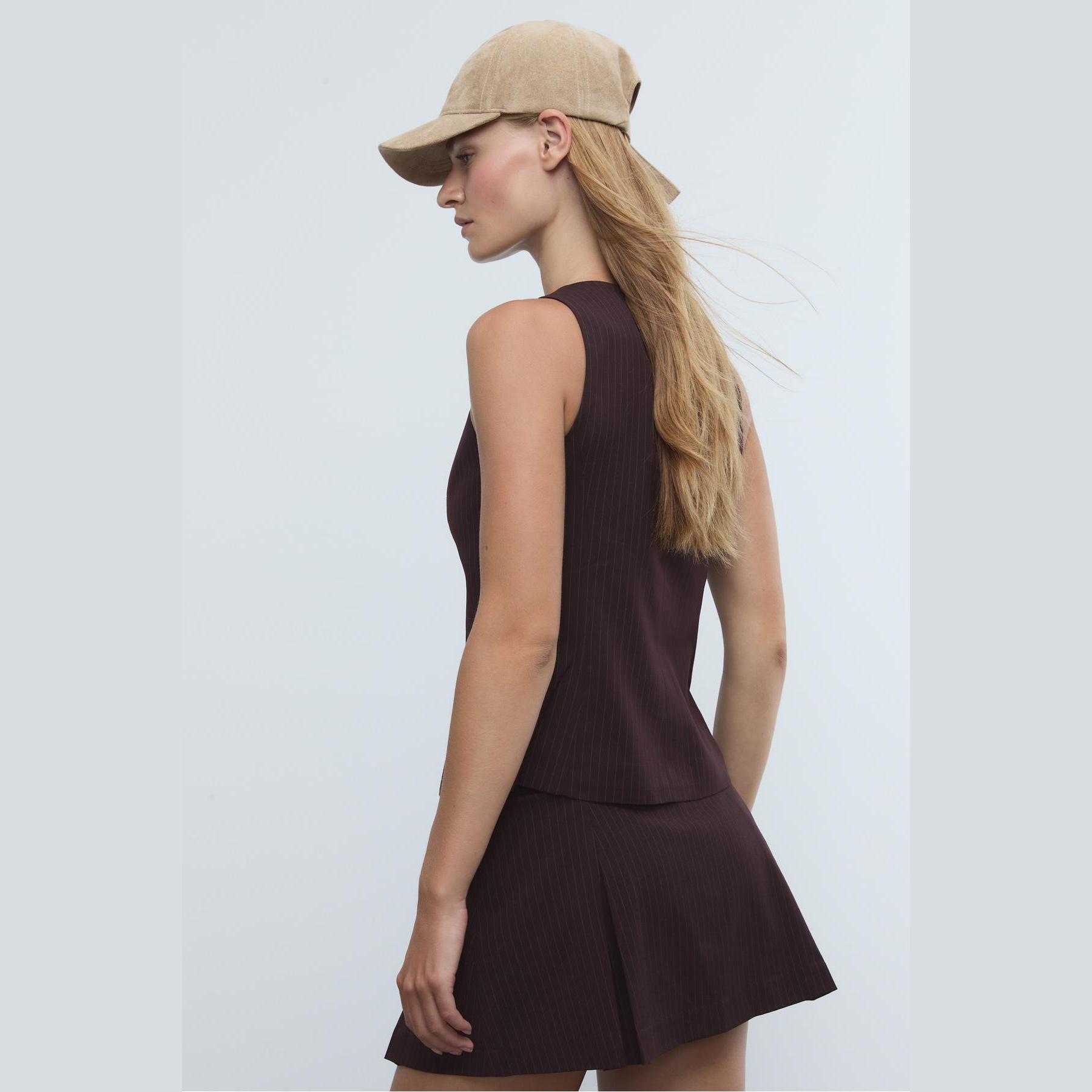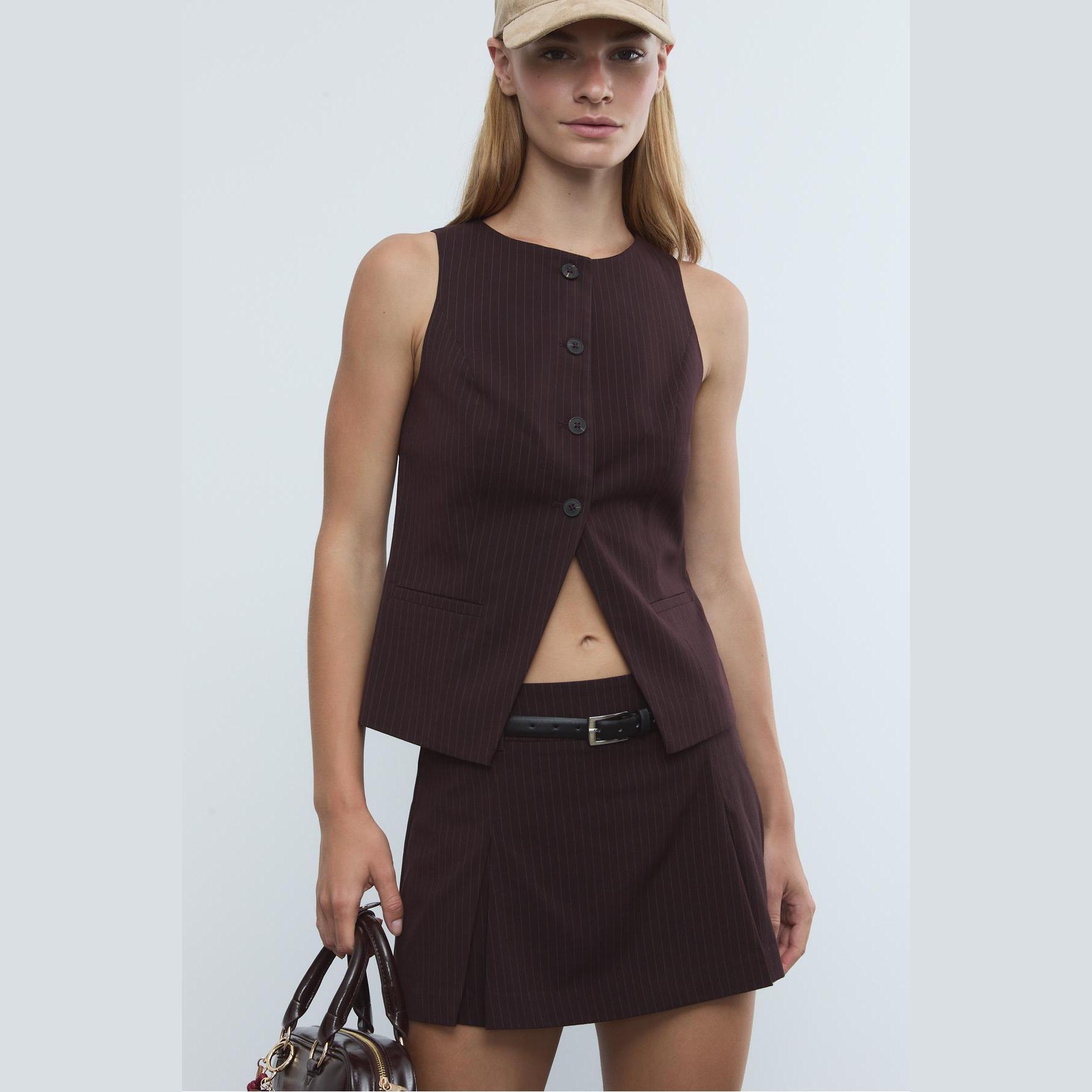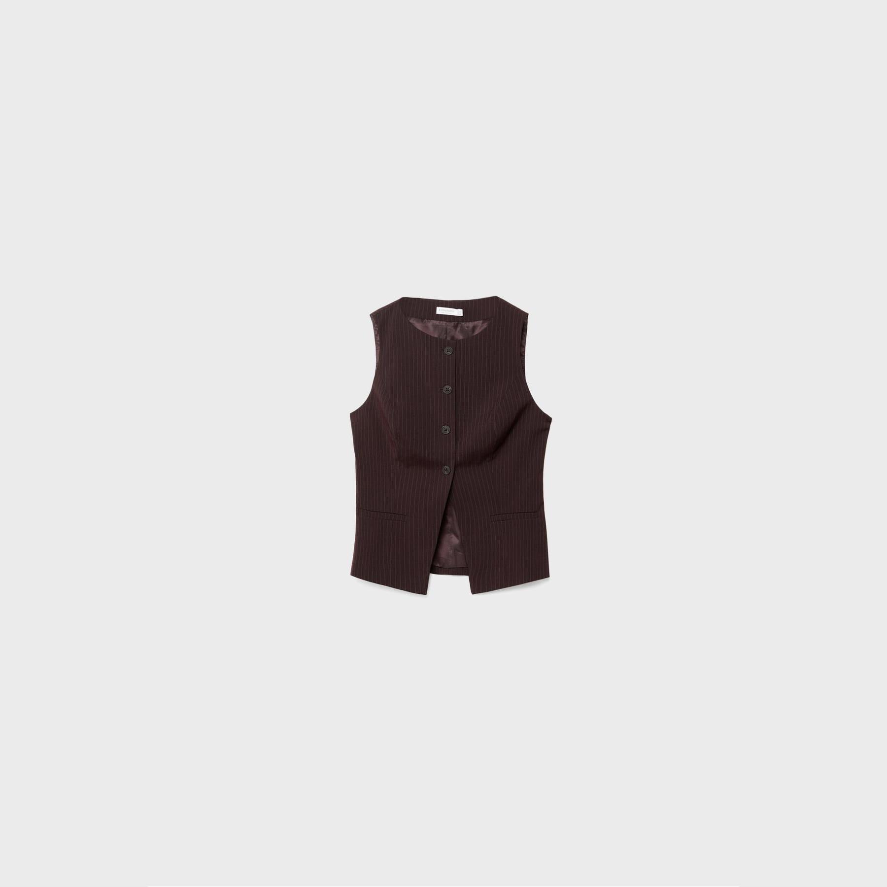 فيست أنيق من Stradivarius بلون بنفسجي غني، مصنوع من خامة منسوجة بنقشة خطوط دقيقة، بياقة دائرية وقصة ضيقة، يتميز بإغلاق أمامي بالأزرار وجيوب ديكورية مزدوجة، مثالي للتنسيق فوق بلوزات أو تيشيرتات لإطلالة كاجوال أنيقة أو مكتبية متناسقة.