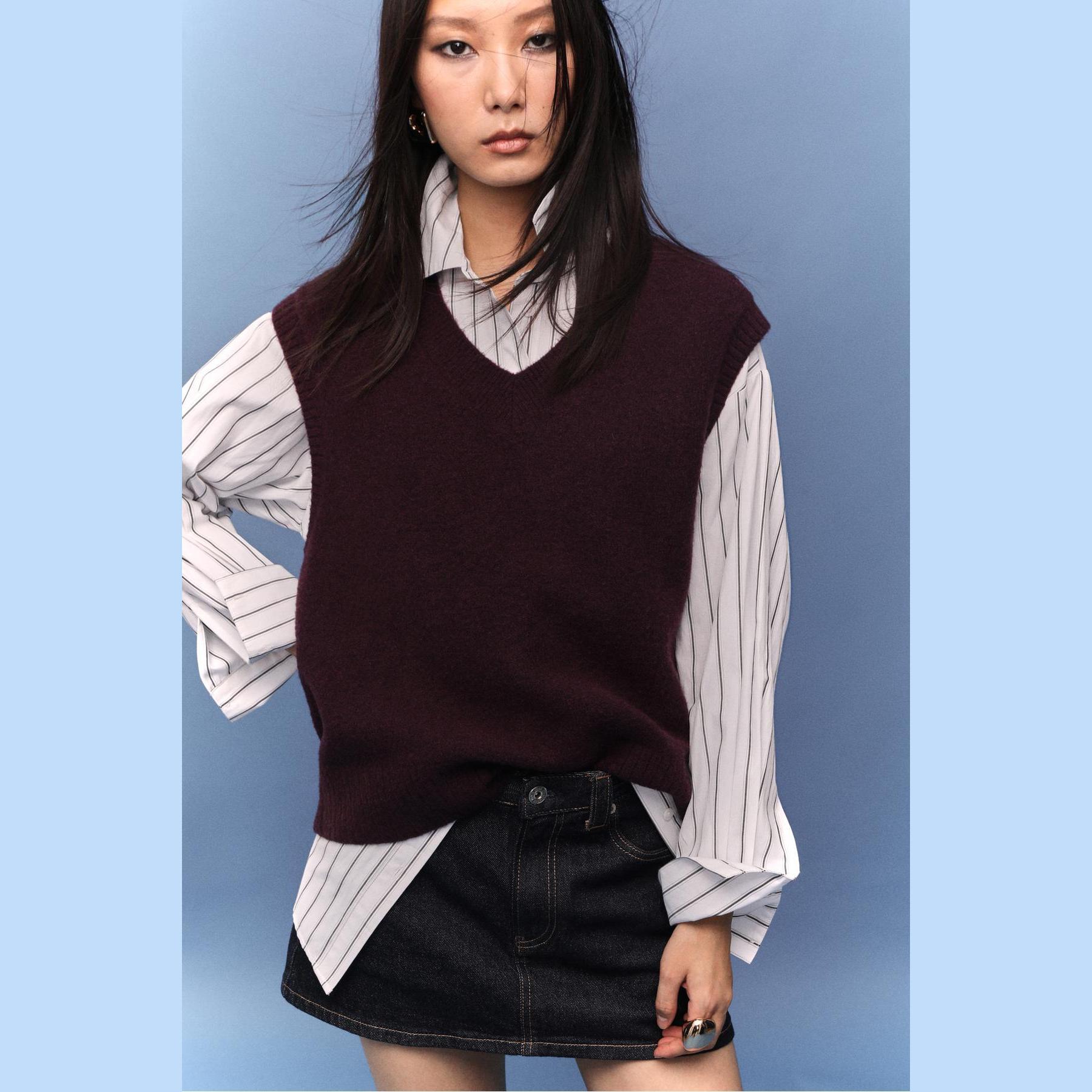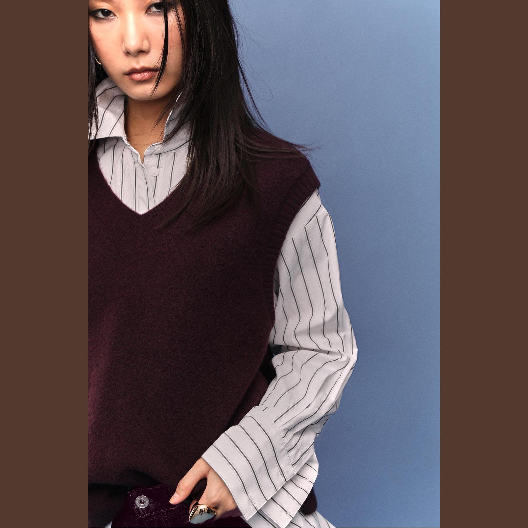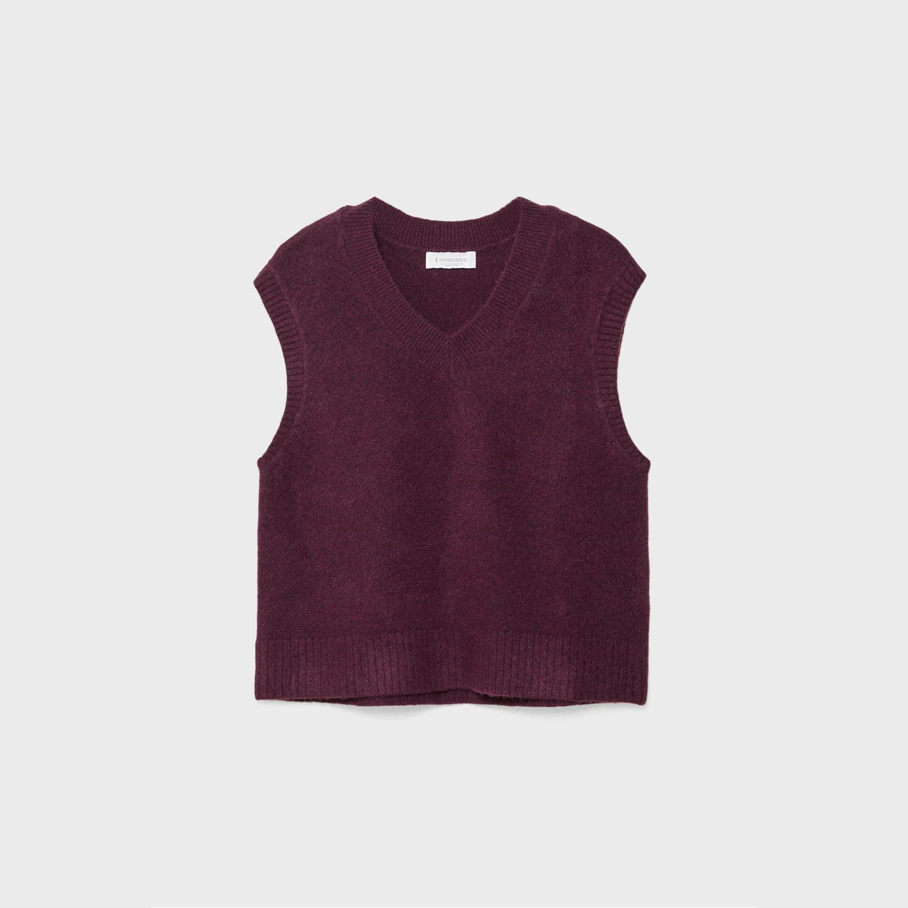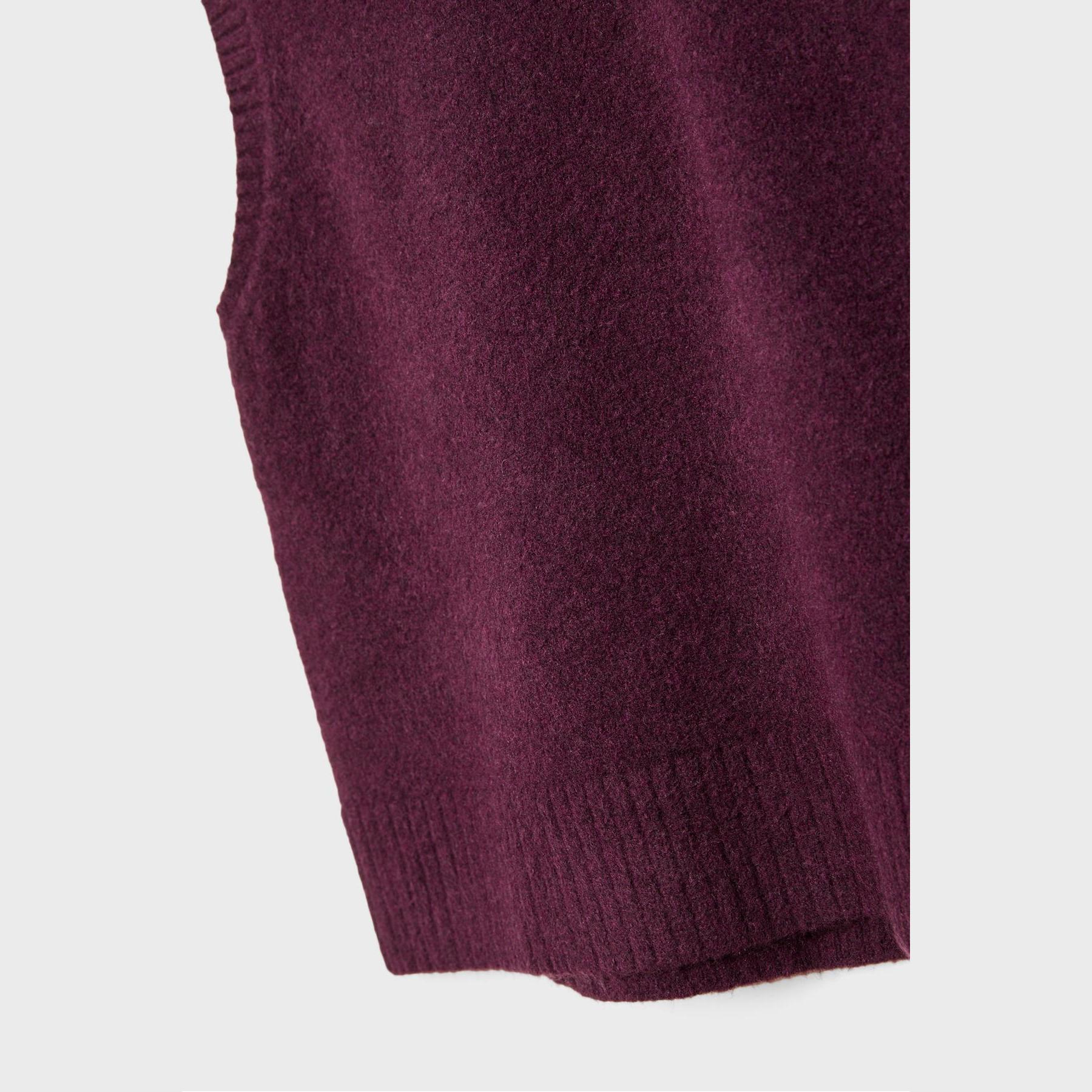 فيست عملي من Stradivarius بلون بنفسجي غني، مصنوع من خامة تريكو ناعمة بتركيبة مرنة، بياقة V وقصة عادية، يتميز بتفاصيل ريب على الحواف وسيلويت مريح، مثالي للتنسيق فوق تيشيرتات أو بلوزات خفيفة لإطلالة كاجوال أنيقة.