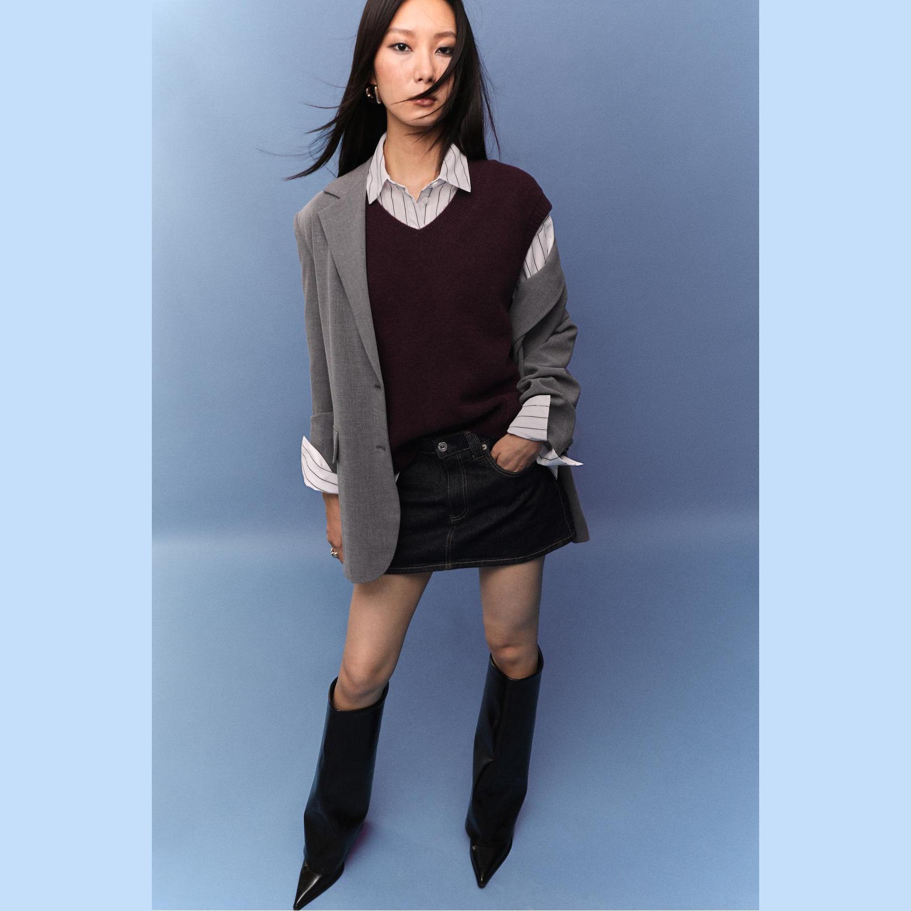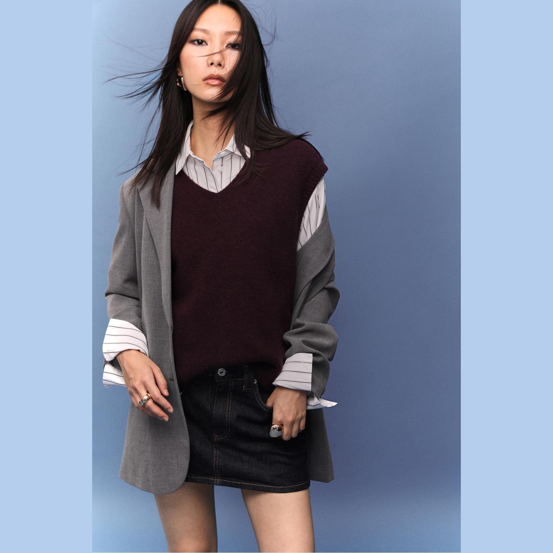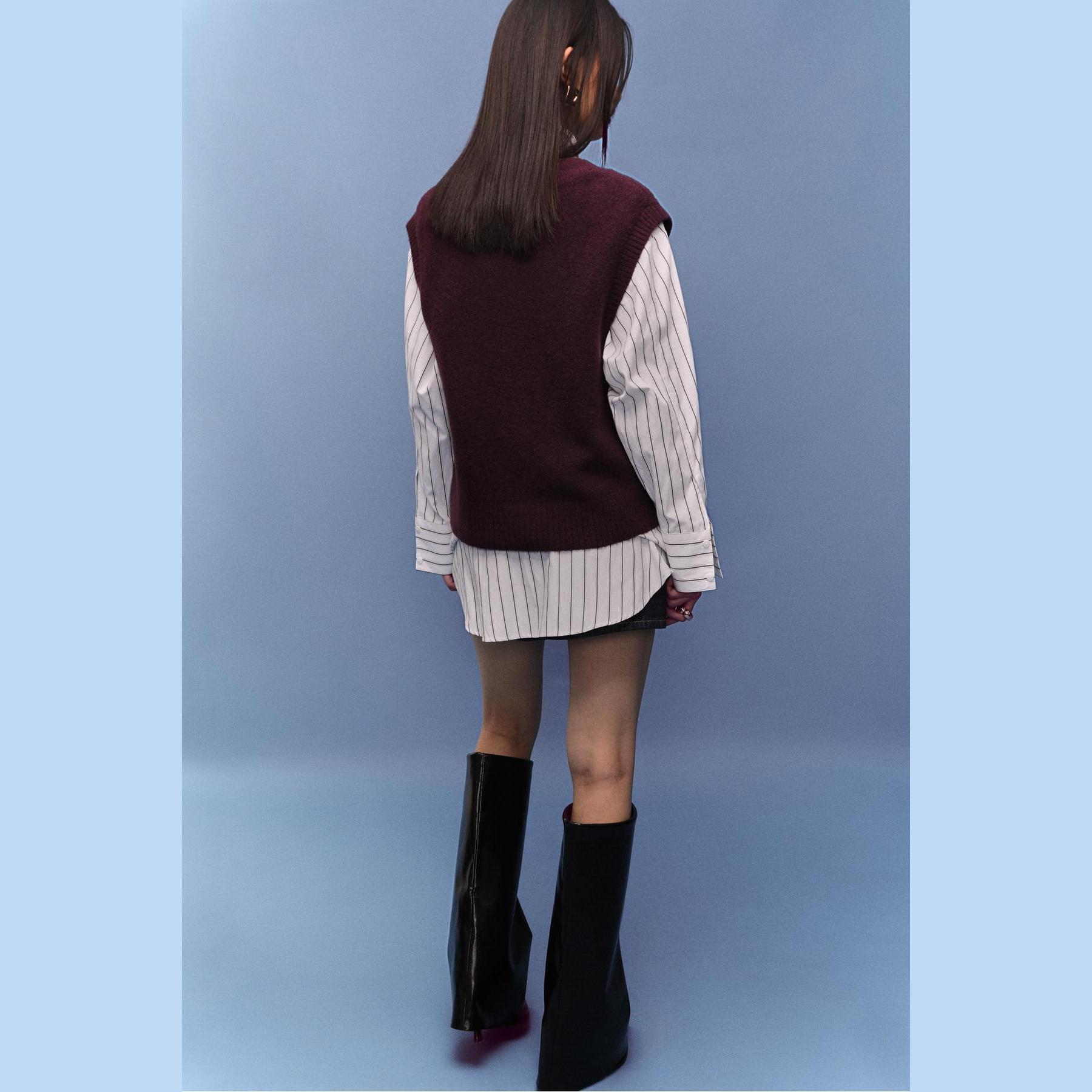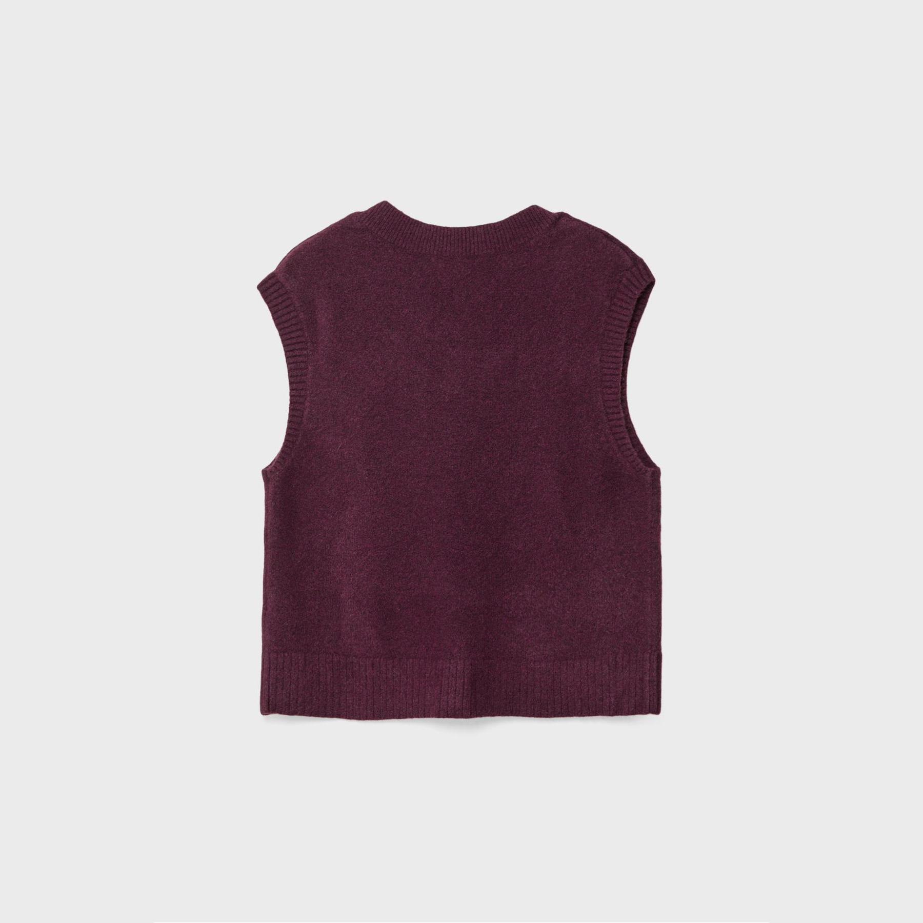 فيست عملي من Stradivarius بلون بنفسجي غني، مصنوع من خامة تريكو ناعمة بتركيبة مرنة، بياقة V وقصة عادية، يتميز بتفاصيل ريب على الحواف وسيلويت مريح، مثالي للتنسيق فوق تيشيرتات أو بلوزات خفيفة لإطلالة كاجوال أنيقة.