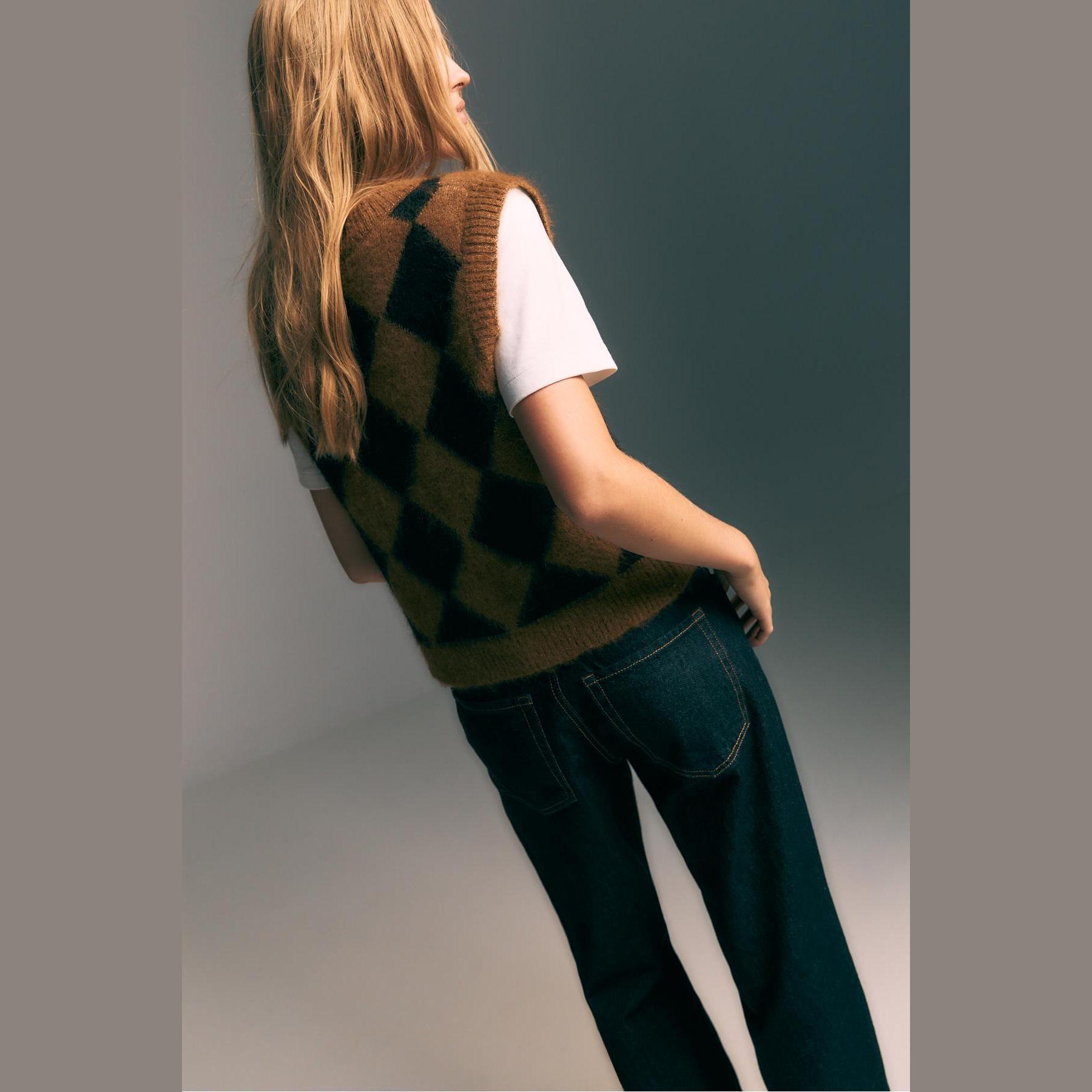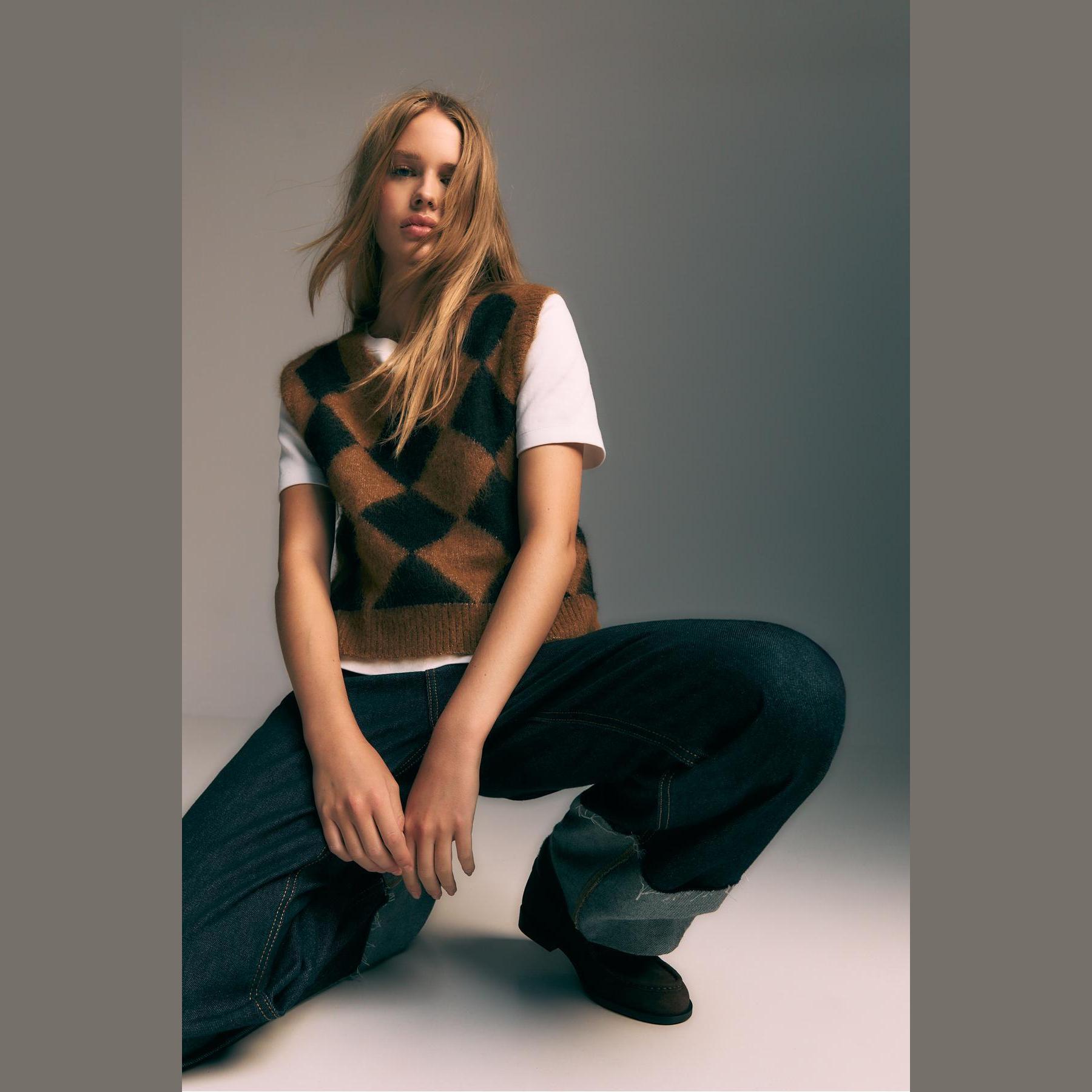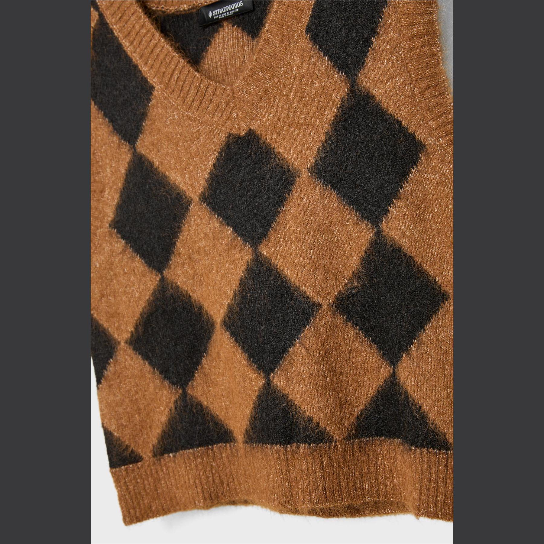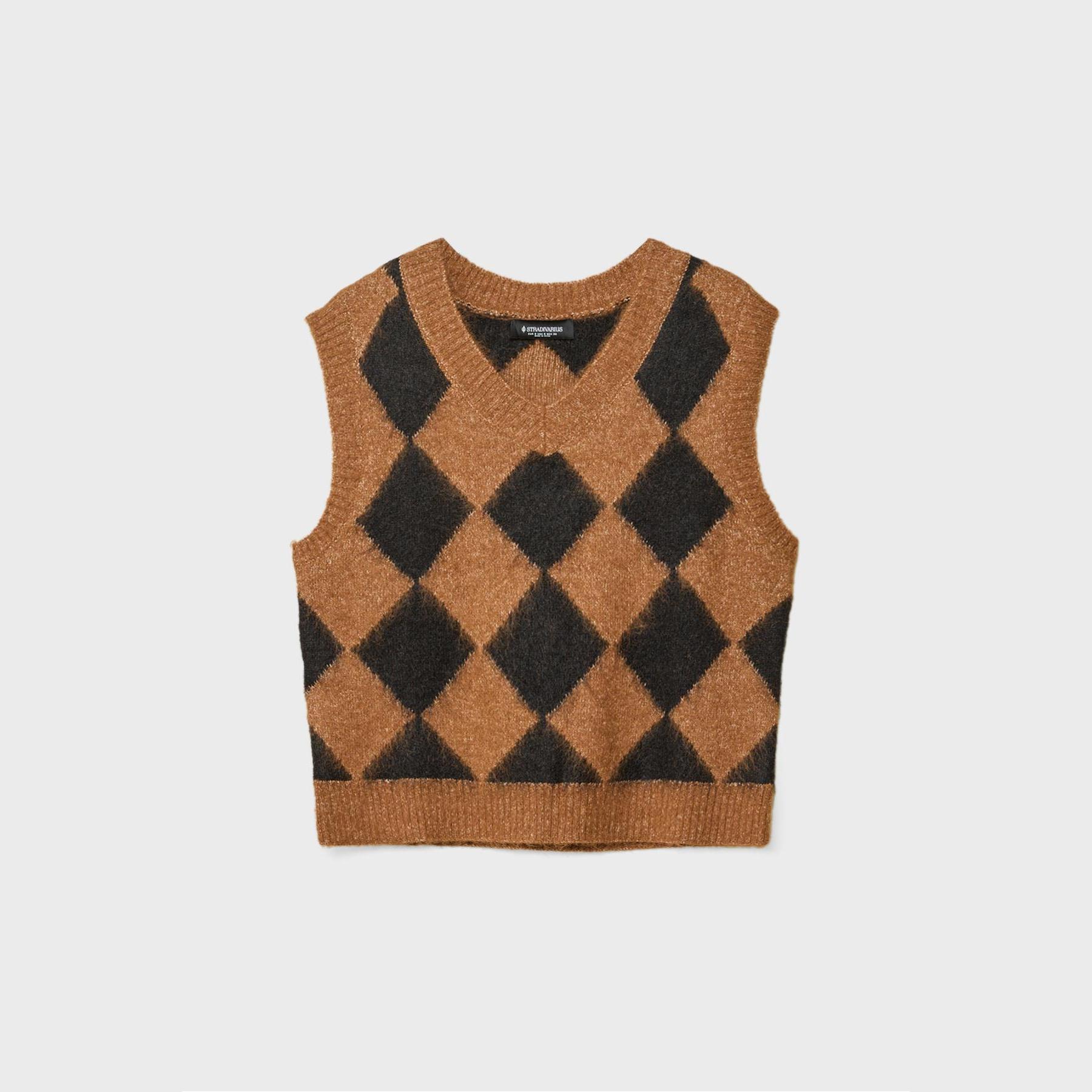 فيست مميز من Stradivarius بلون بني دافئ، مصنوع من خامة تريكو ناعمة بنقشة بقلاوة بارزة، بياقة V وقصة مستقيمة، بدون أكمام، بتفاصيل ريب على الحواف تمنحه لمسة عصرية، مثالي للتنسيق فوق تيشيرتات أو بلوزات خفيفة لإطلالة كاجوال أنيقة.