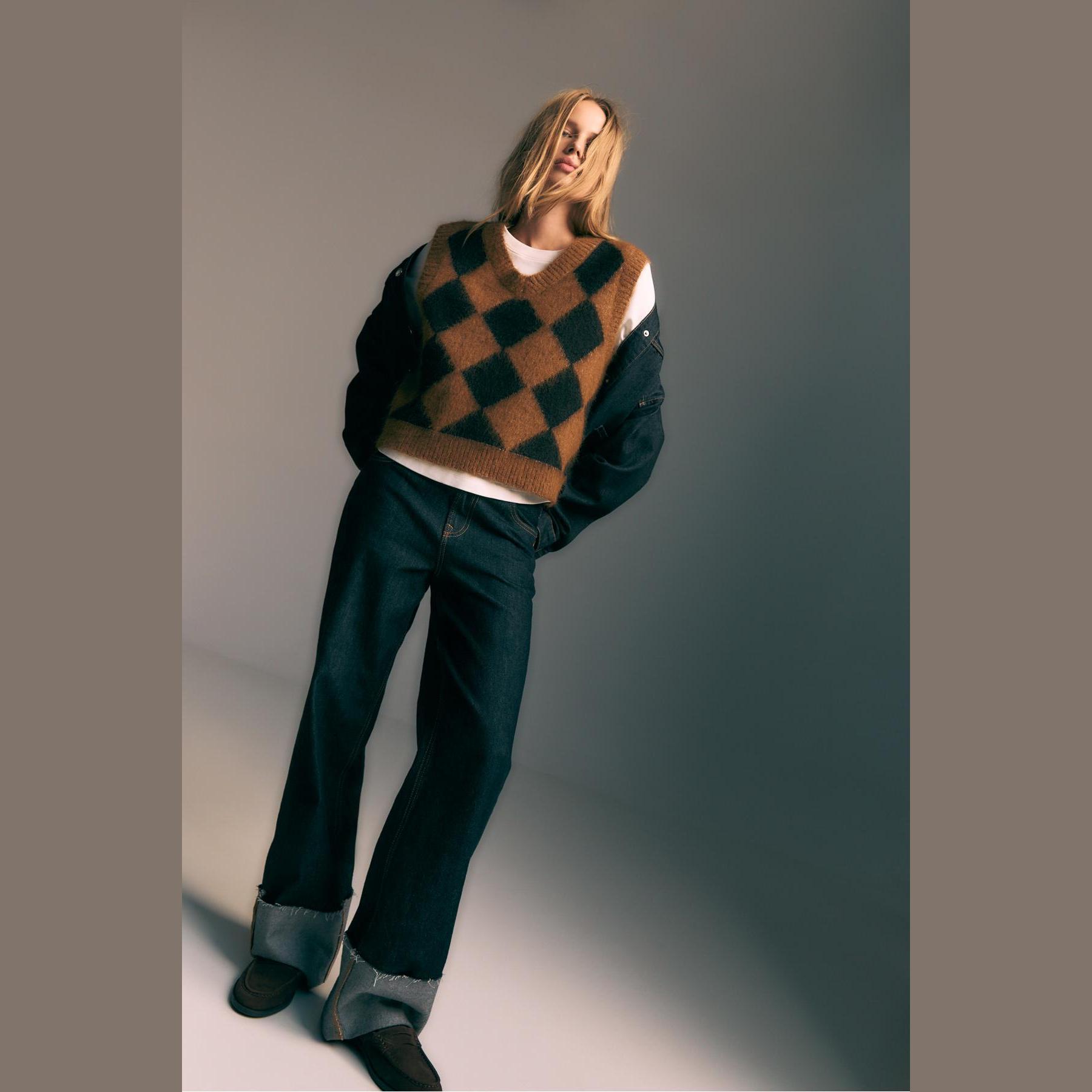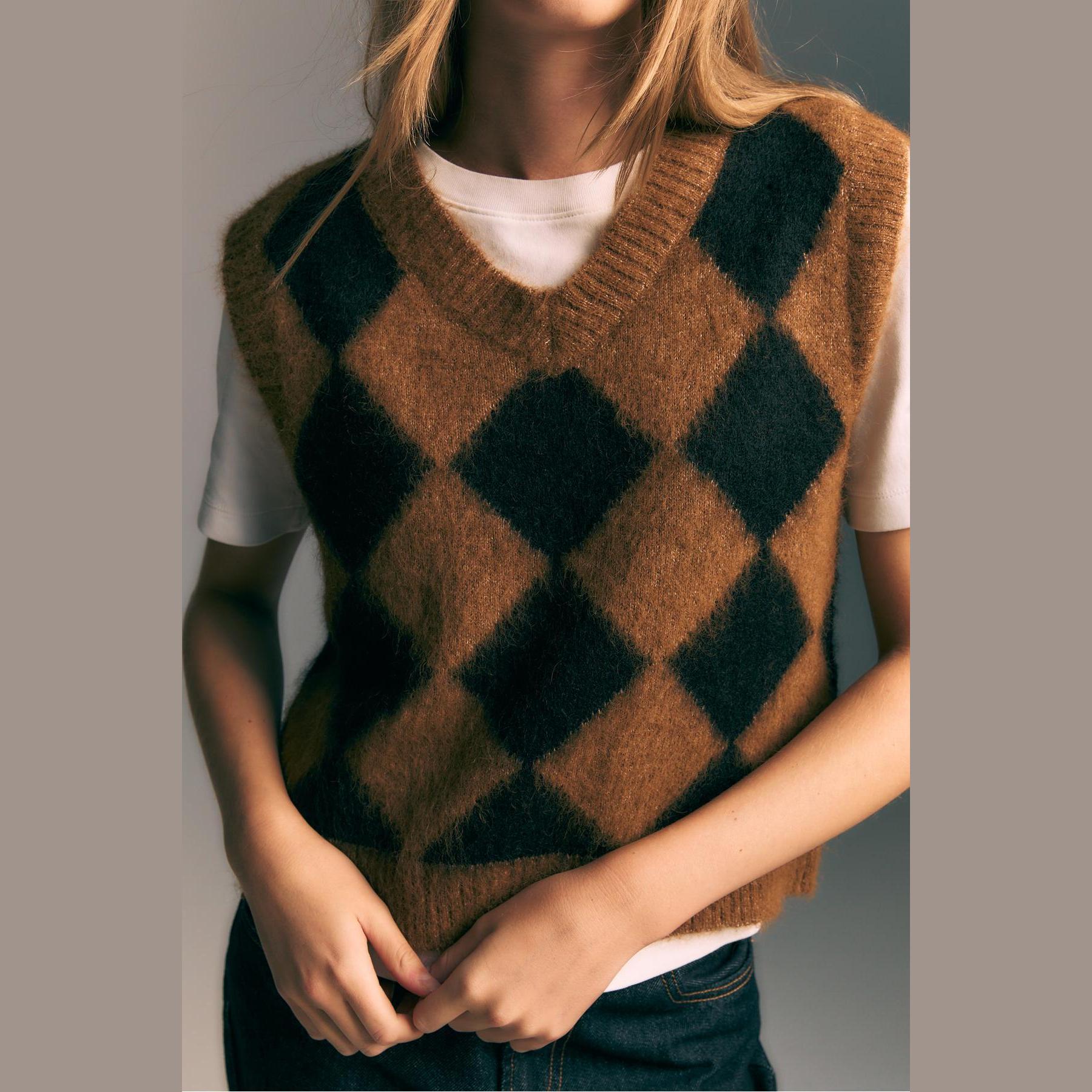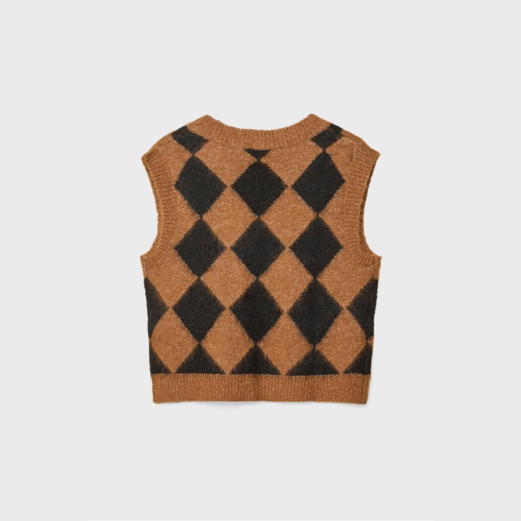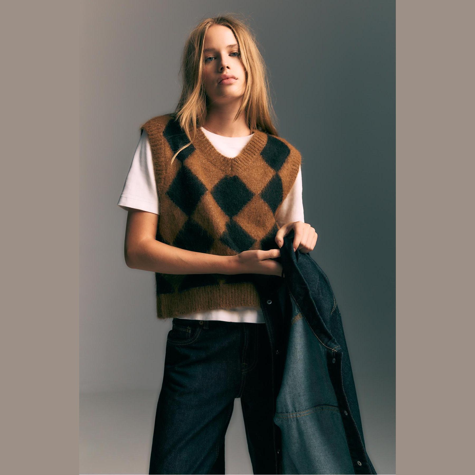 فيست مميز من Stradivarius بلون بني دافئ، مصنوع من خامة تريكو ناعمة بنقشة بقلاوة بارزة، بياقة V وقصة مستقيمة، بدون أكمام، بتفاصيل ريب على الحواف تمنحه لمسة عصرية، مثالي للتنسيق فوق تيشيرتات أو بلوزات خفيفة لإطلالة كاجوال أنيقة.