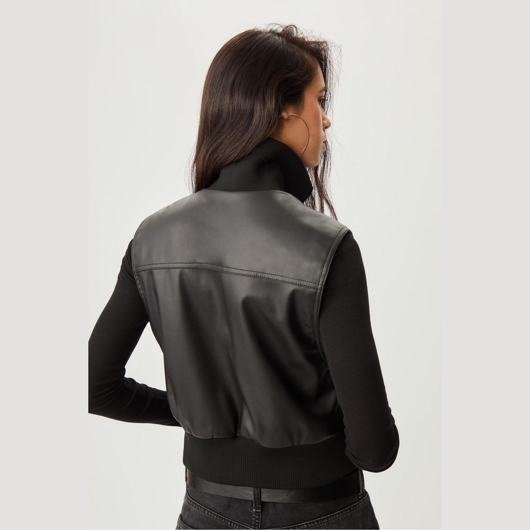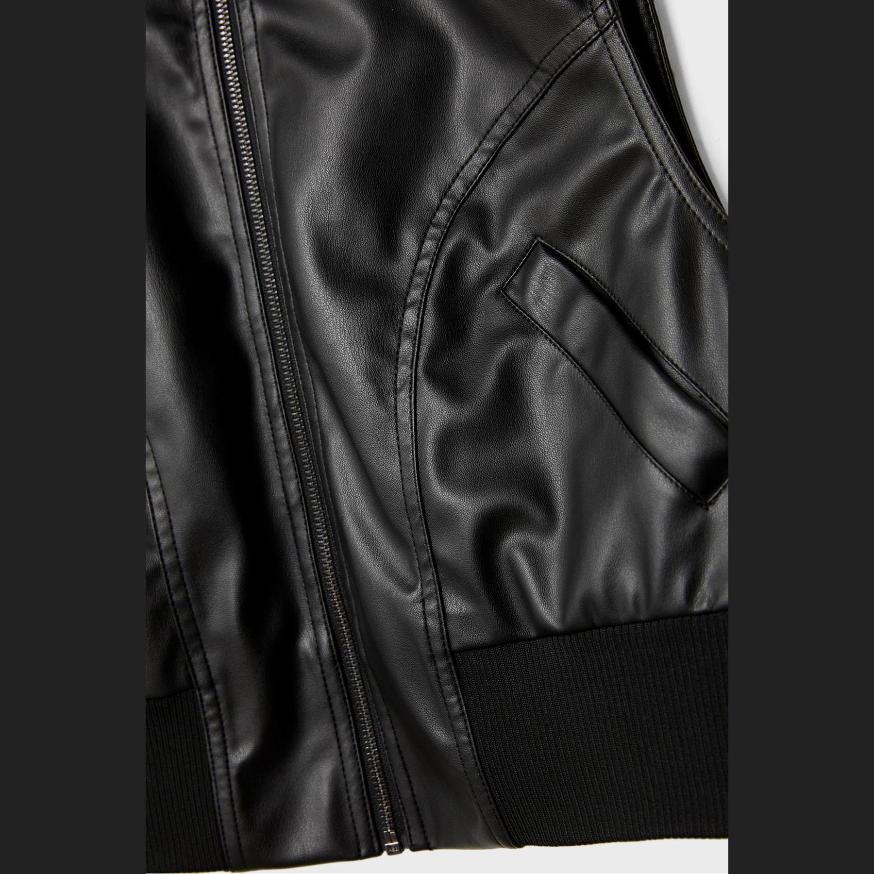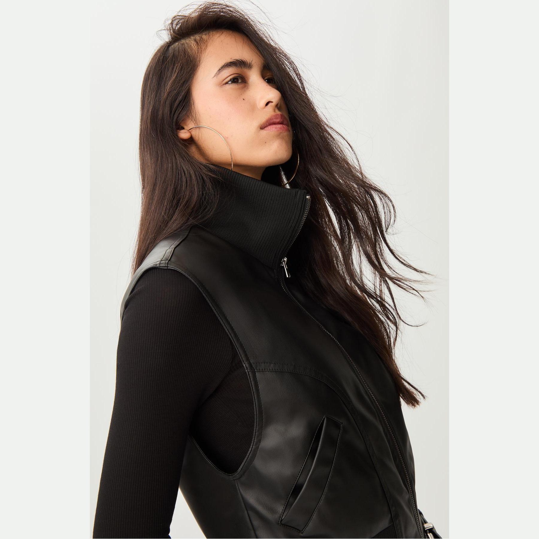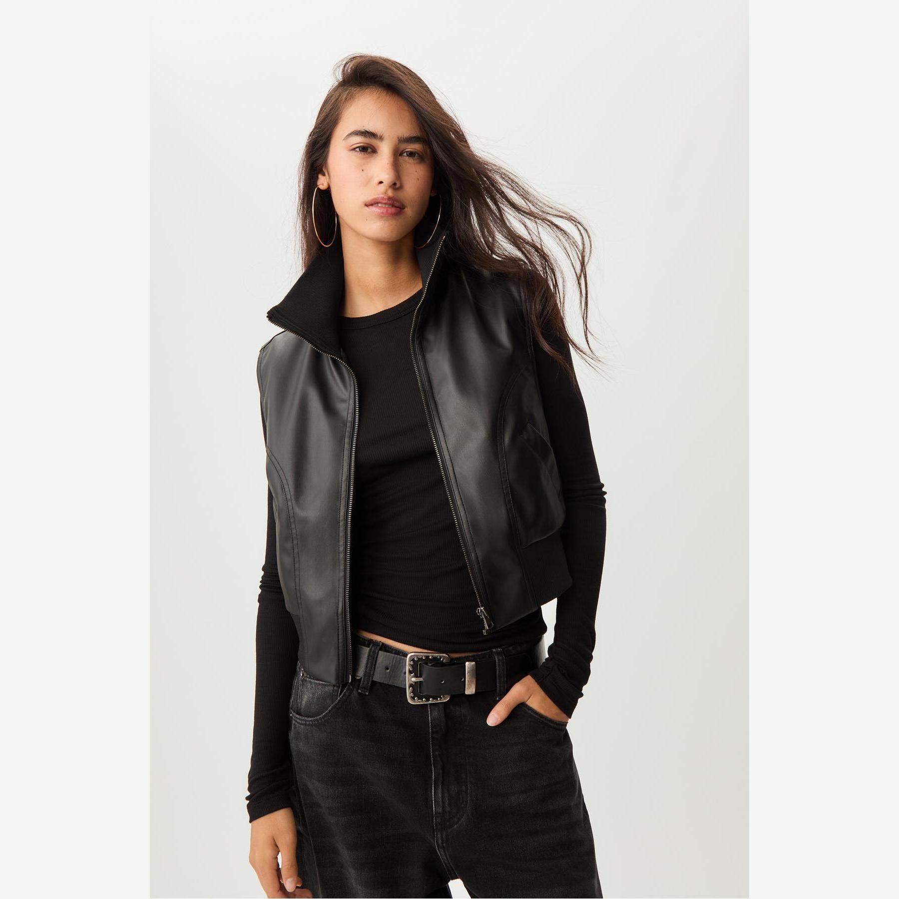 فيست مميز من Stradivarius بلون أسود أنيق، مصنوع من خامة جلد صناعي ناعمة، بياقة نصف عالية وقصة قياسية، يتميز بإغلاق أمامي بسحاب مخفي، وجيوب جانبية عملية، مع تفاصيل ريب منسوجة بلون متناسق تضيف لمسة عصرية، مثالي للتنسيق فوق تيشيرتات أو هوديز لإطلالة كاجوال جريئة.