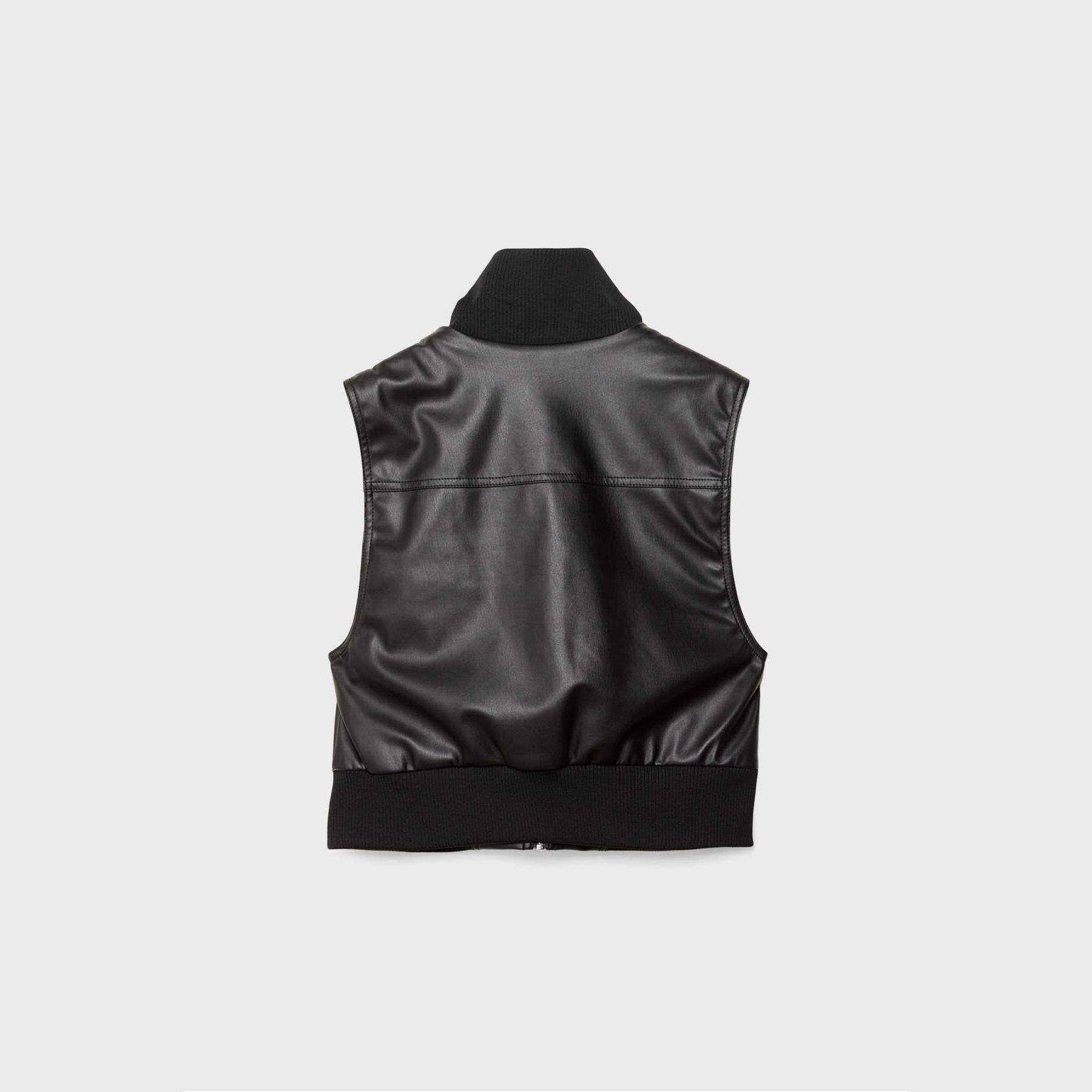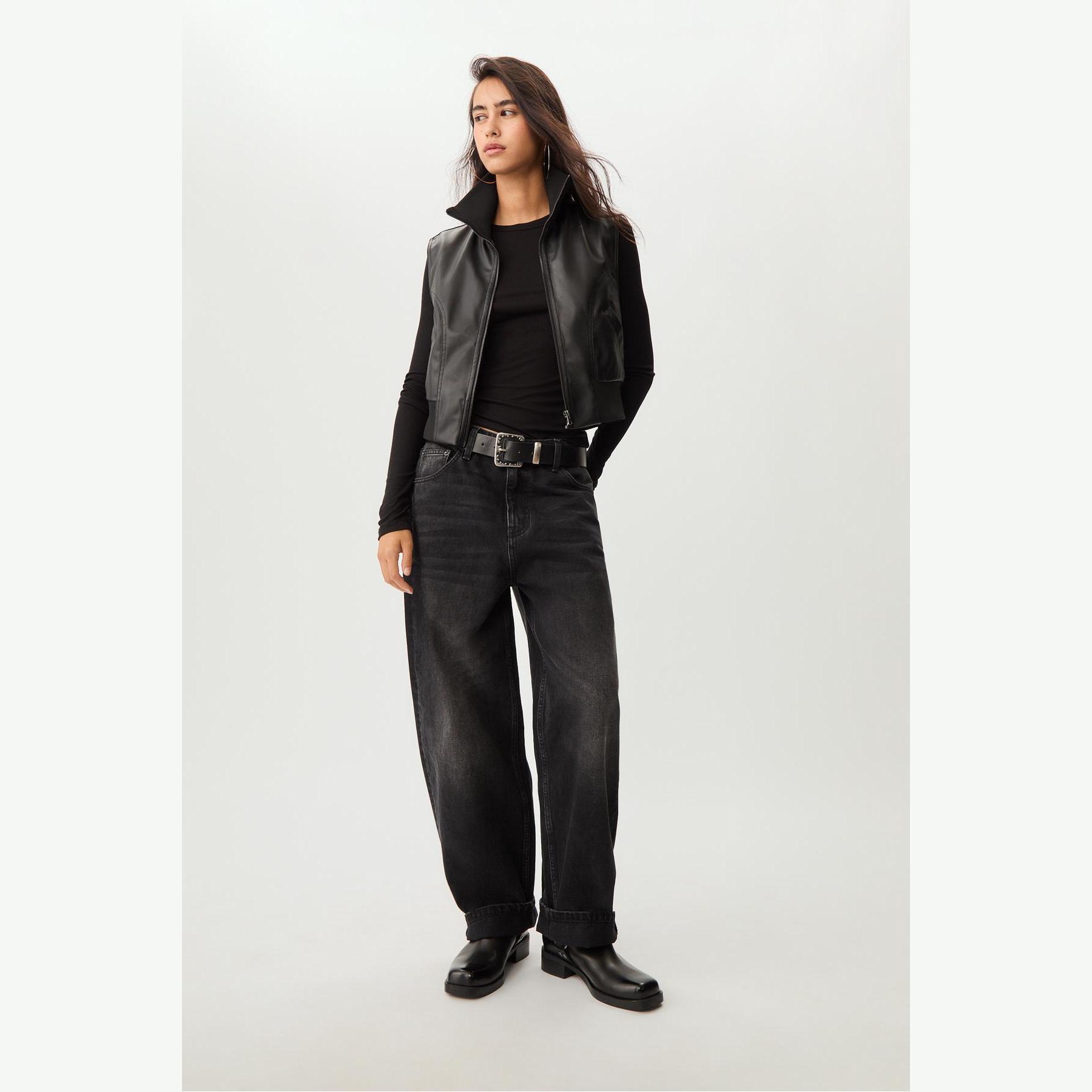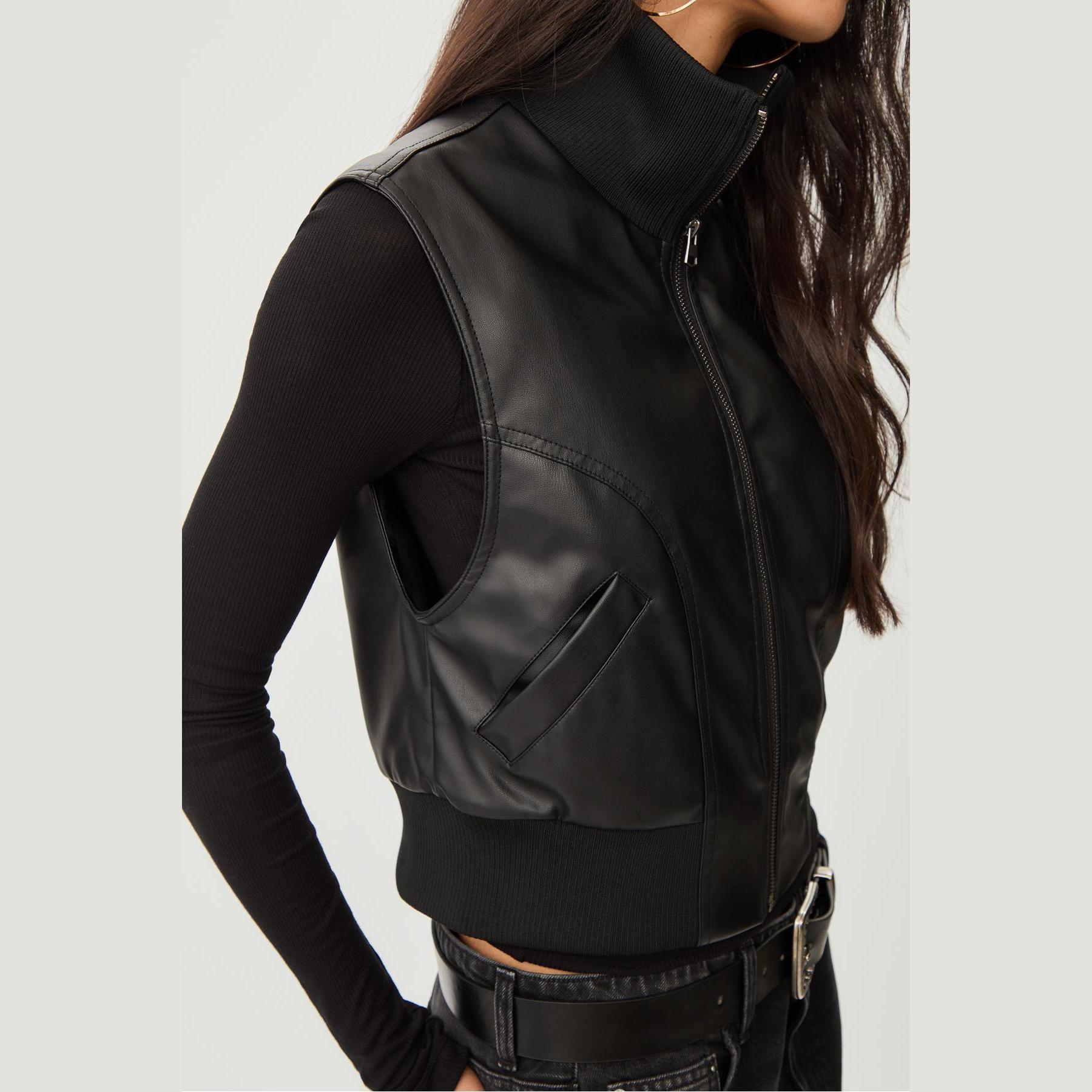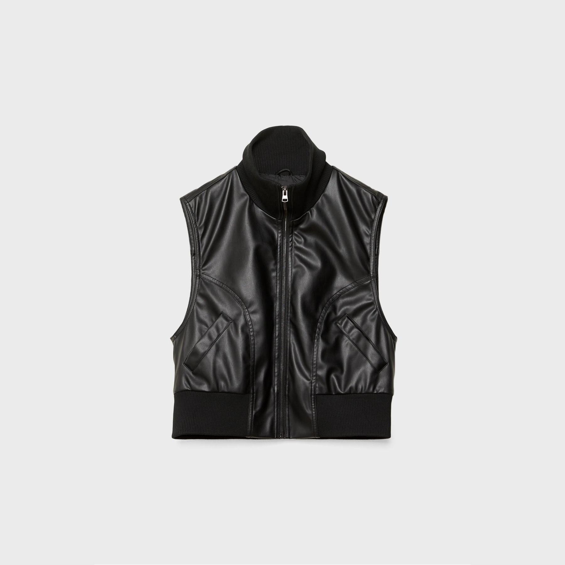 فيست مميز من Stradivarius بلون أسود أنيق، مصنوع من خامة جلد صناعي ناعمة، بياقة نصف عالية وقصة قياسية، يتميز بإغلاق أمامي بسحاب مخفي، وجيوب جانبية عملية، مع تفاصيل ريب منسوجة بلون متناسق تضيف لمسة عصرية، مثالي للتنسيق فوق تيشيرتات أو هوديز لإطلالة كاجوال جريئة.