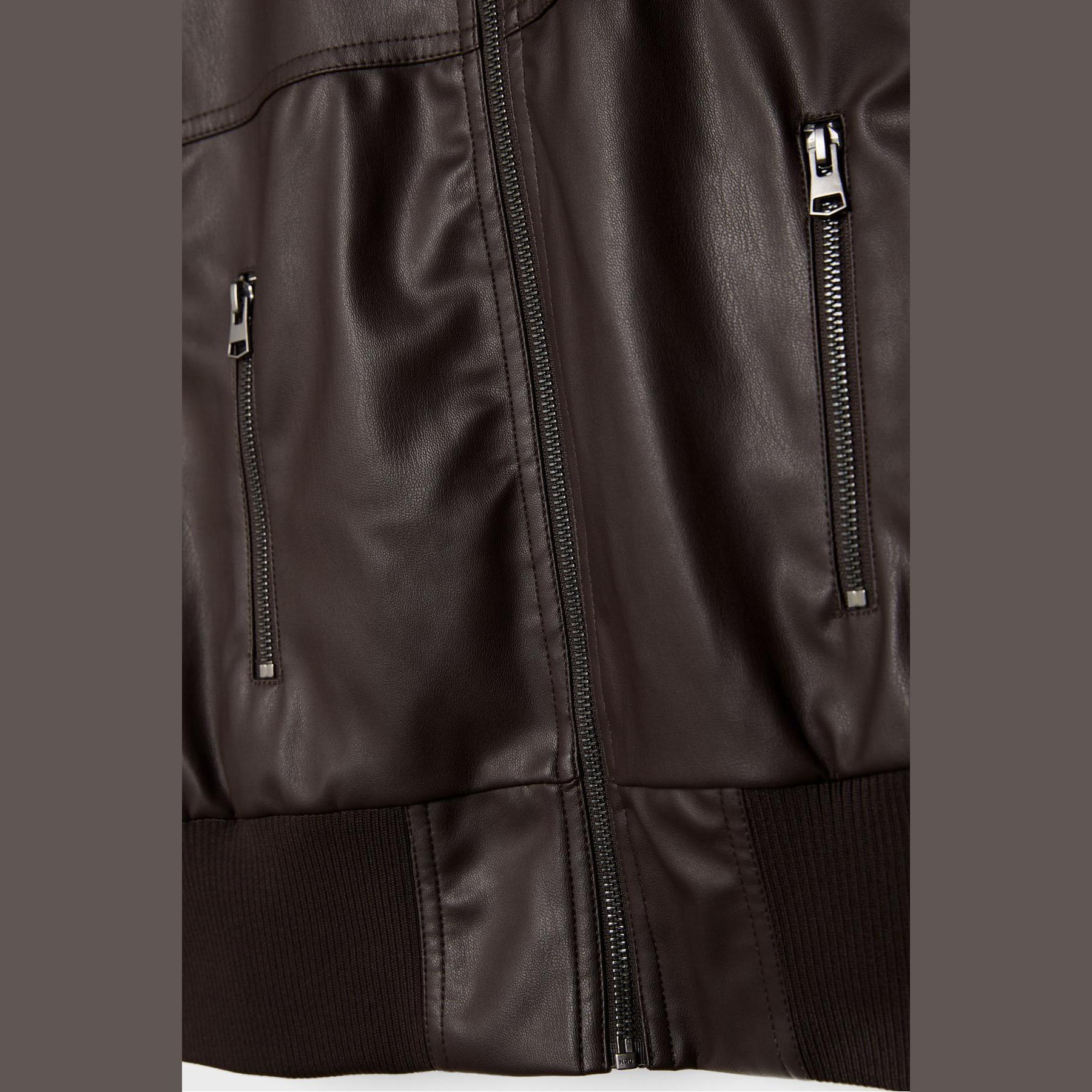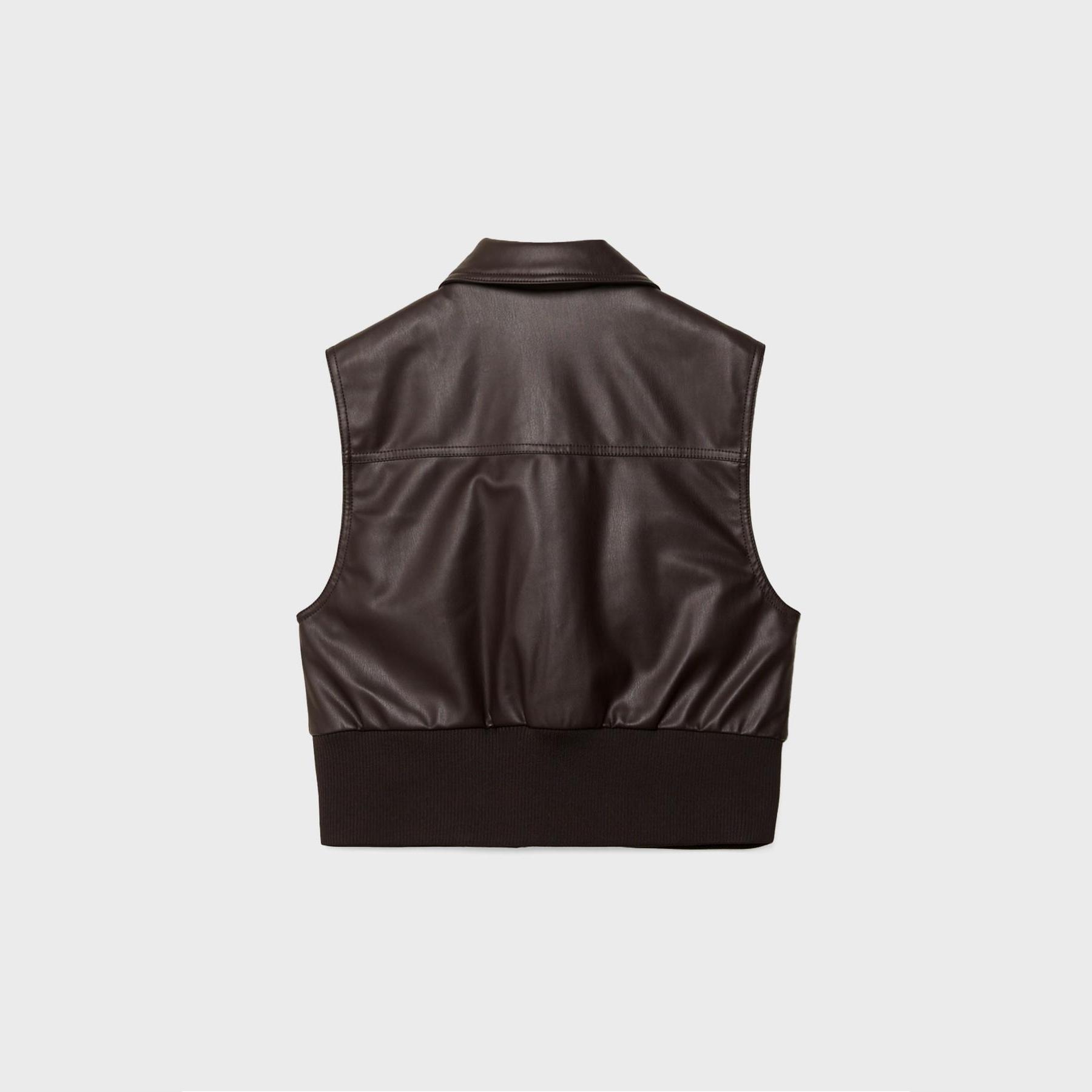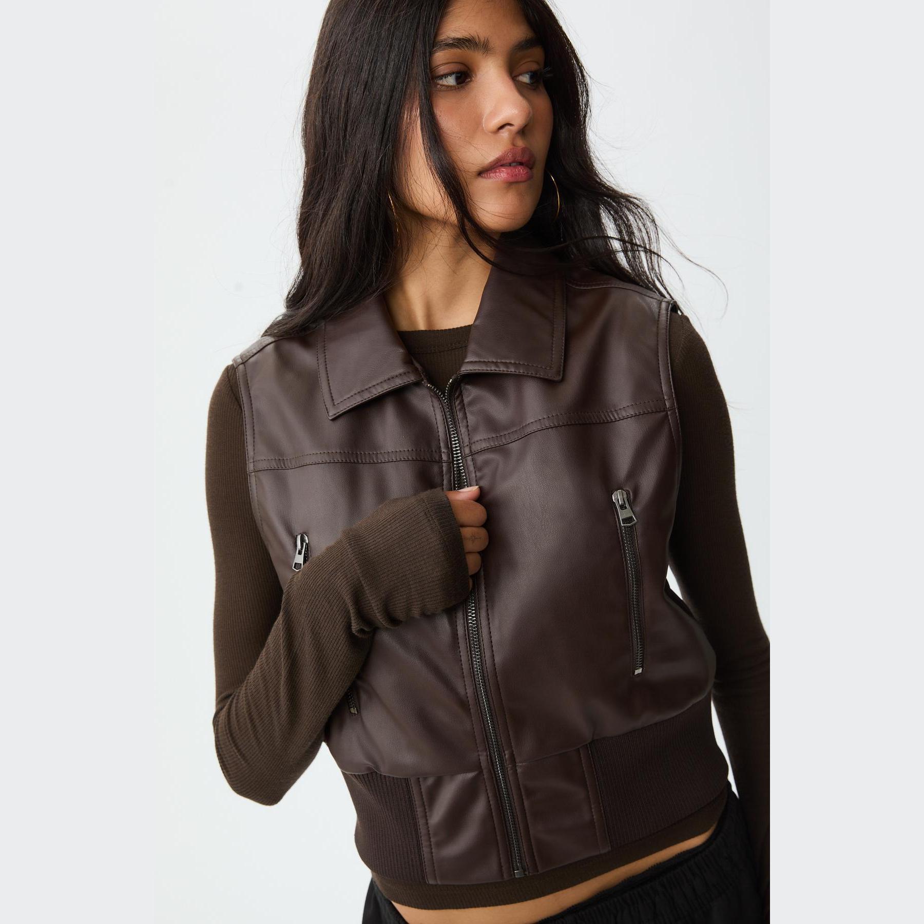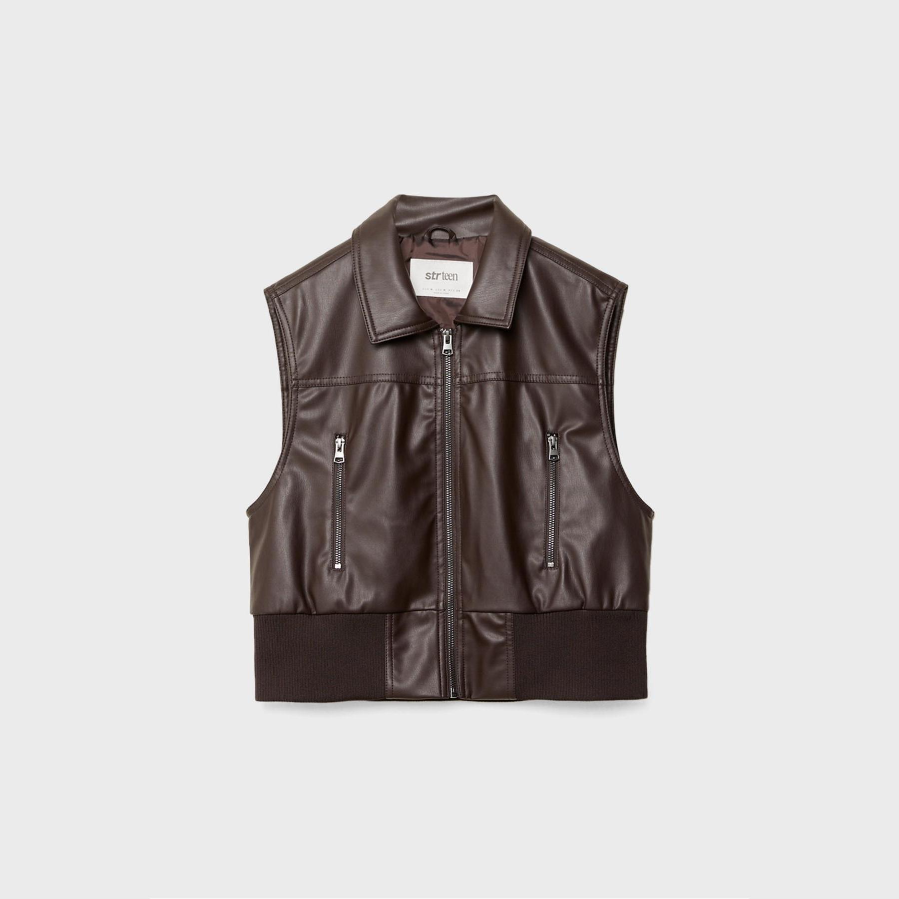 فيست مميز من Stradivarius بلون بني دافئ، مصنوع من خامة جلد صناعي ناعمة، بياقة قميص كلاسيكية وقصة قياسية، يتميز بسحاب أمامي معدني وجيوب جانبية عملية، مع حافة سفلية من خامة ريب مطاطية بلون متناسق تمنحك ملاءمة مثالية، مثالي للتنسيق فوق تيشيرتات أو هوديز لإطلالة كاجوال جريئة.