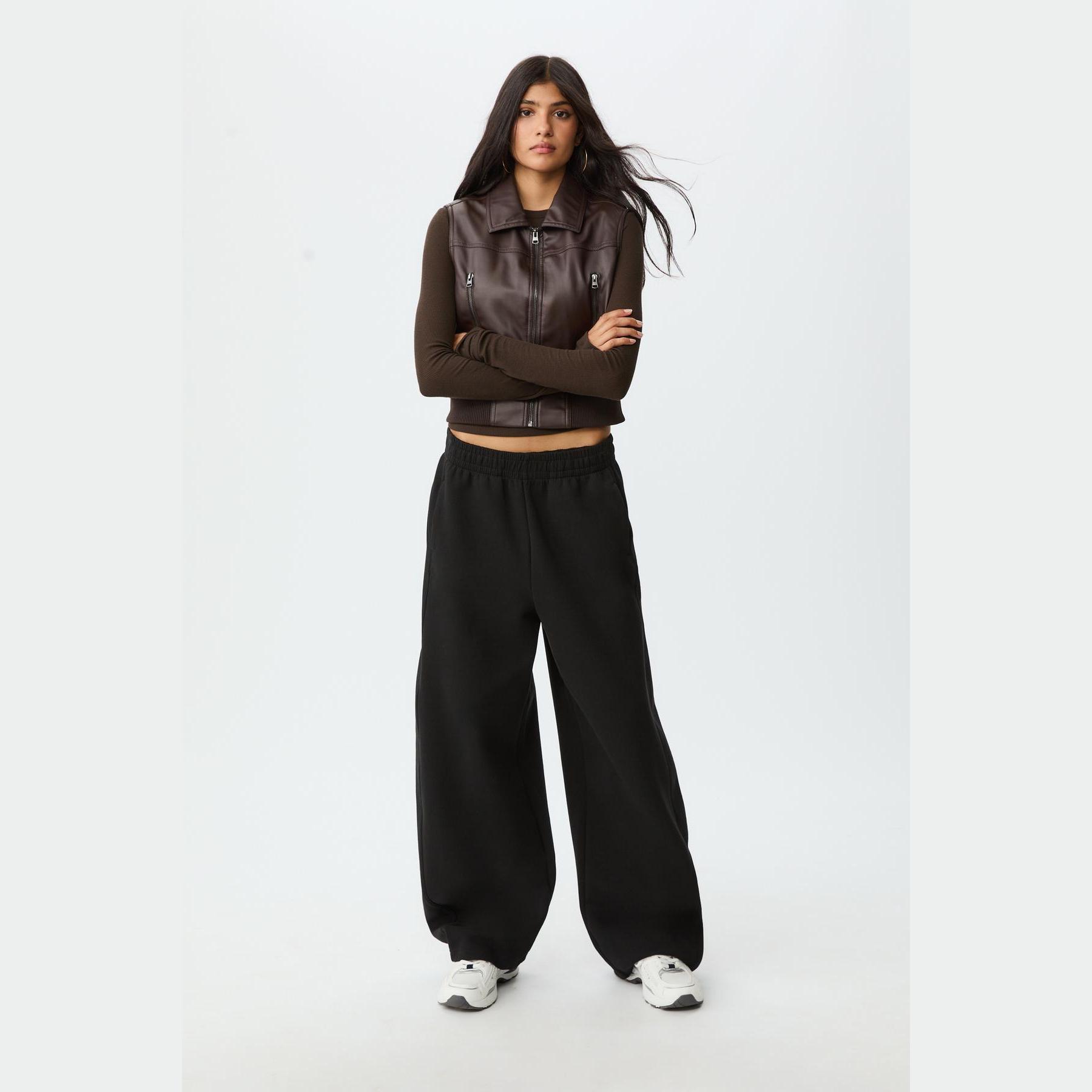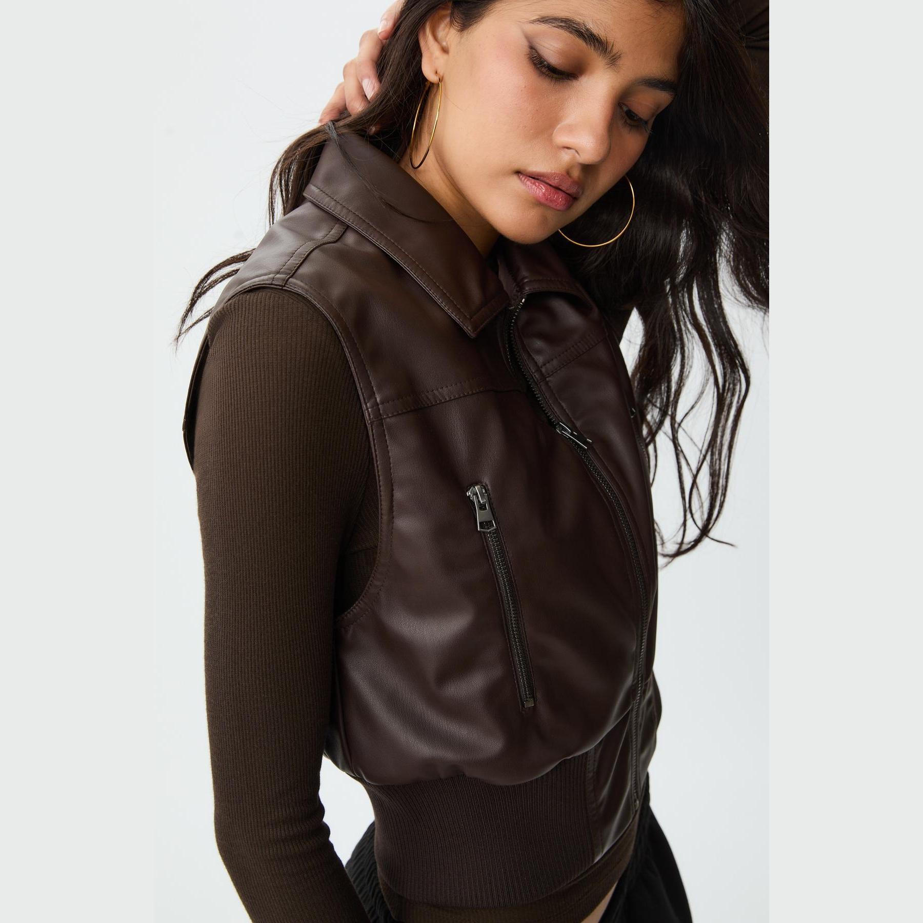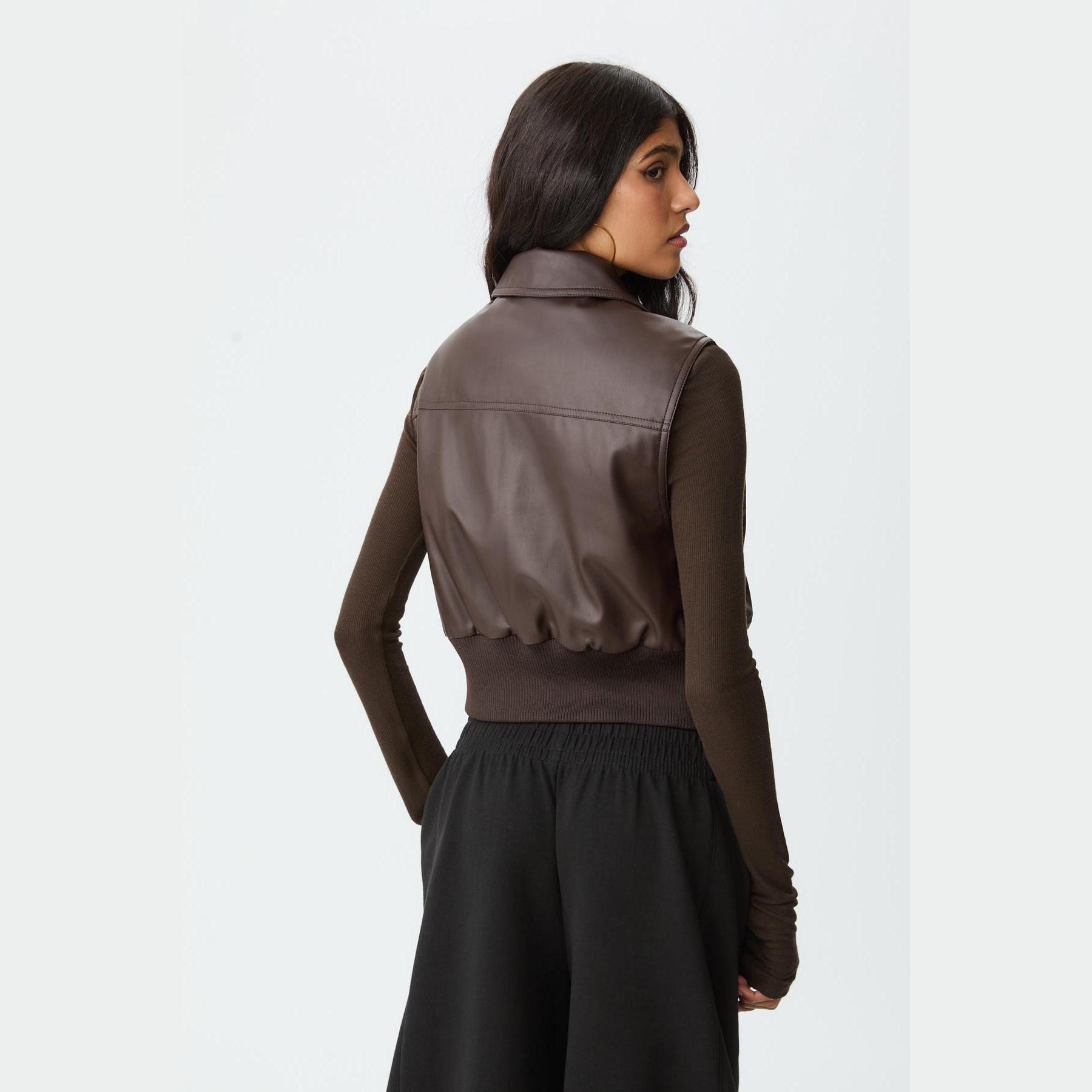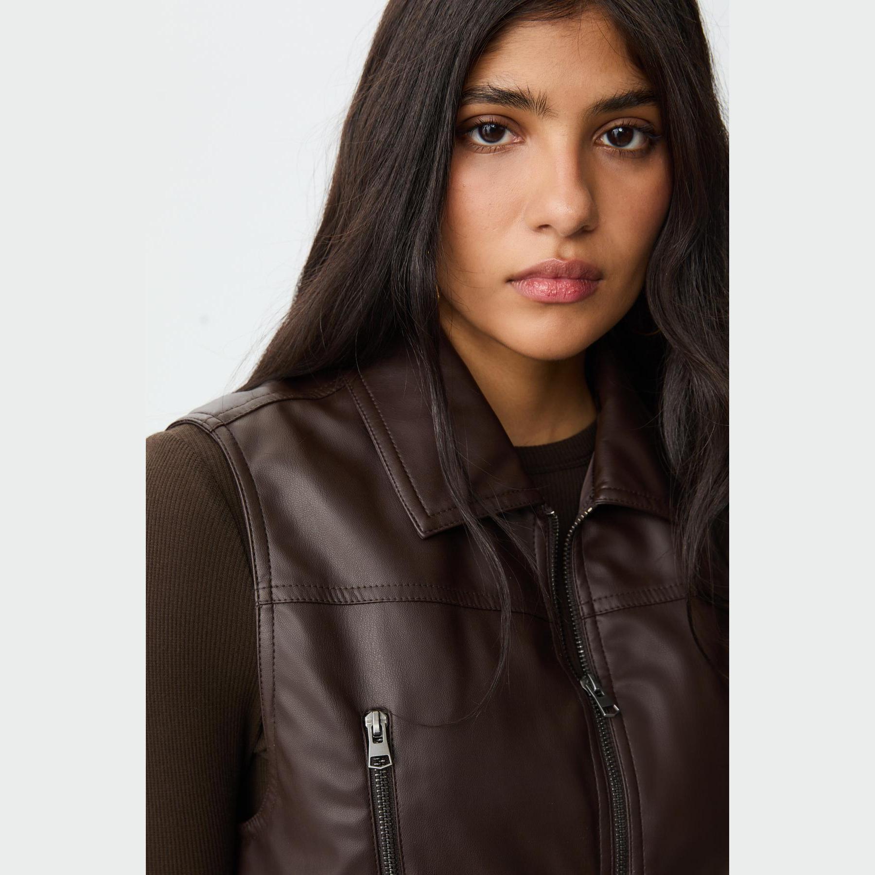 فيست مميز من Stradivarius بلون بني دافئ، مصنوع من خامة جلد صناعي ناعمة، بياقة قميص كلاسيكية وقصة قياسية، يتميز بسحاب أمامي معدني وجيوب جانبية عملية، مع حافة سفلية من خامة ريب مطاطية بلون متناسق تمنحك ملاءمة مثالية، مثالي للتنسيق فوق تيشيرتات أو هوديز لإطلالة كاجوال جريئة.