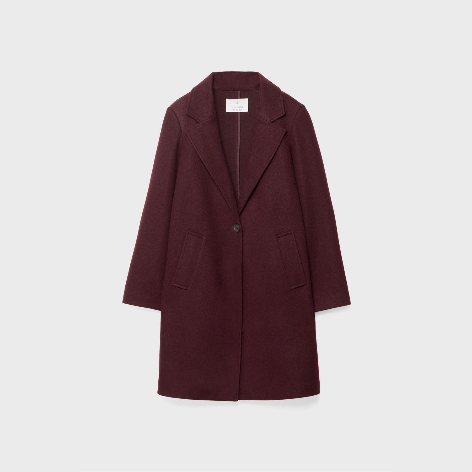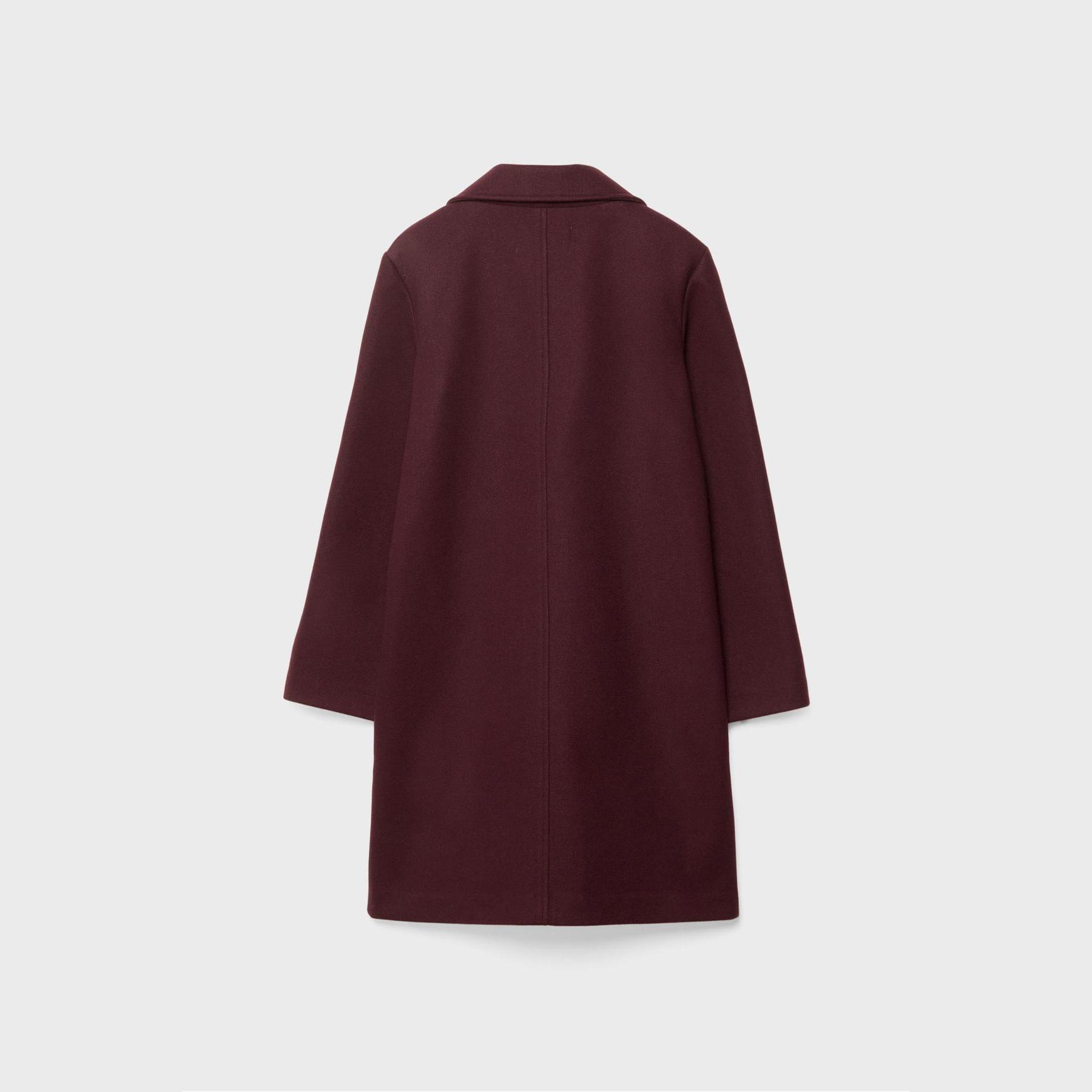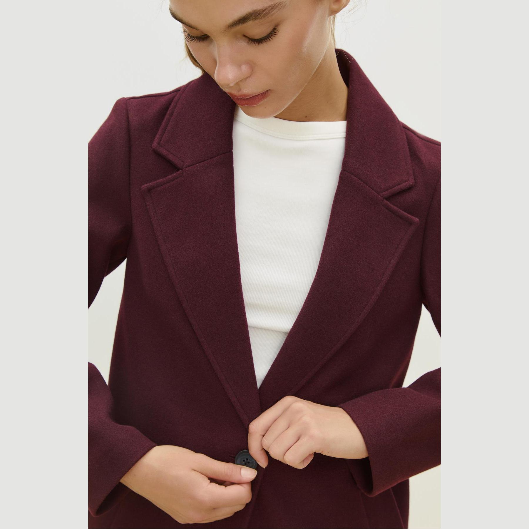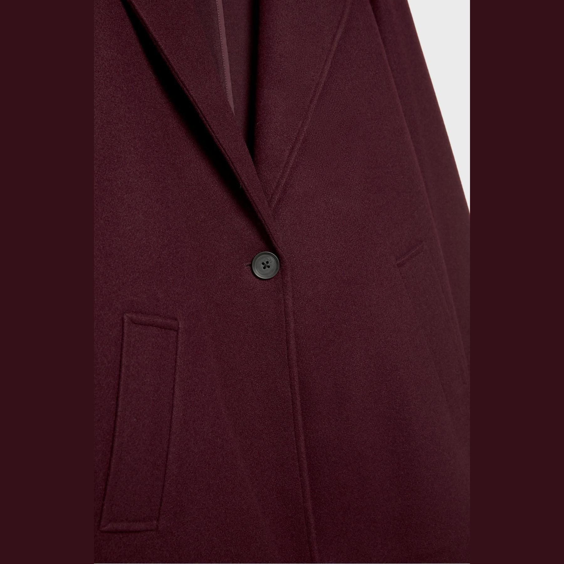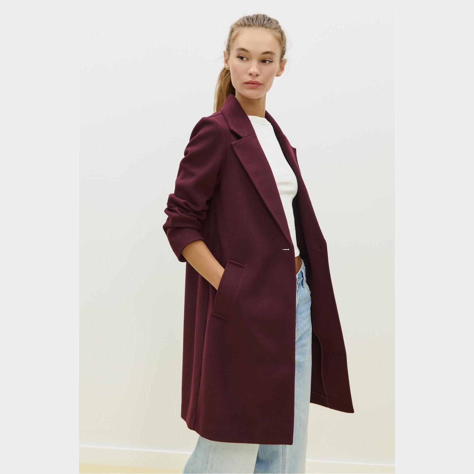 كابان أنيق من Stradivarius بلون بوردو غني، مصنوع من خامة منسوجة ناعمة بملمس مريح، بياقة جاكيت كلاسيكية وقصة كروڤاز، يتميز بإغلاق أمامي بأزرار متعددة وجيوب جانبية عملية، مثالي للتنسيق مع بناطيل رسمية أو جينز لإطلالة شتوية أنيقة وعملية.