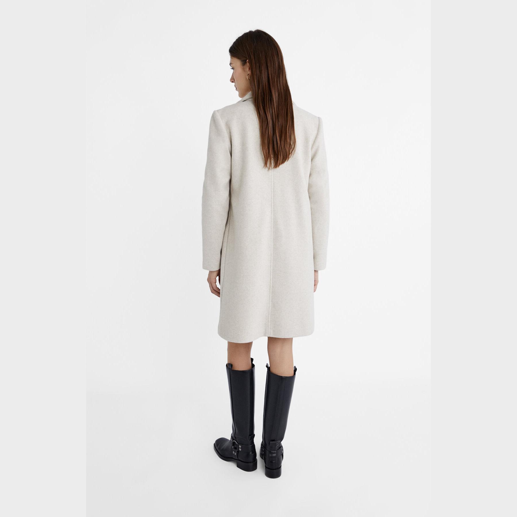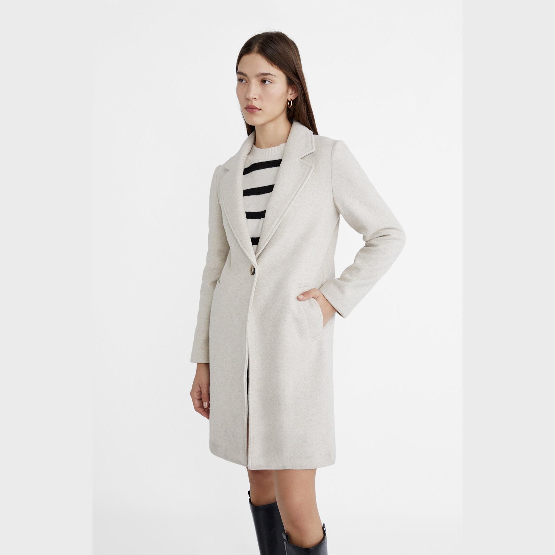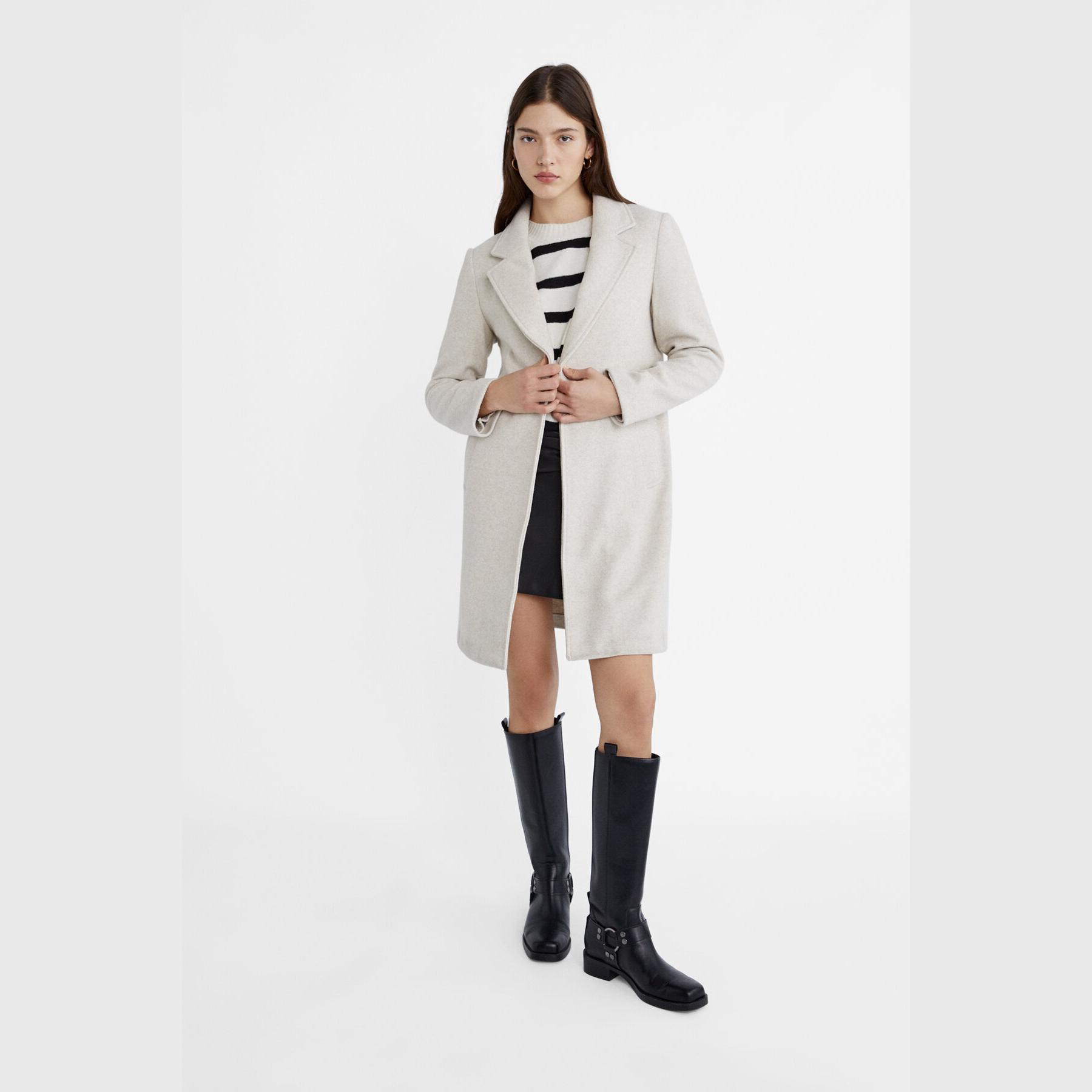 كابان أنيق من Stradivarius بلون إكرو ناعم، مصنوع من خامة منسوجة ناعمة بملمس مريح، بياقة جاكيت كلاسيكية وقصة Slim، يتميز بزر واحد للإغلاق الأمامي وجيوب جانبية عملية، يمنحك إطلالة أنيقة وعملية من النهار حتى المساء.