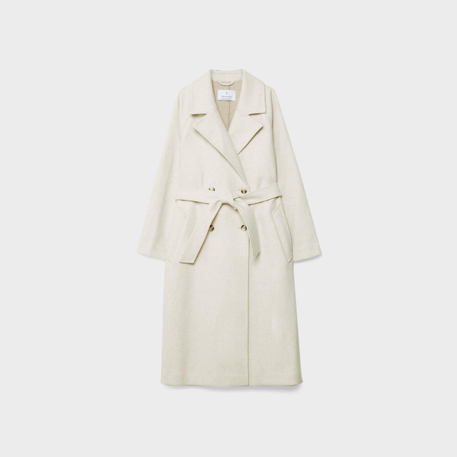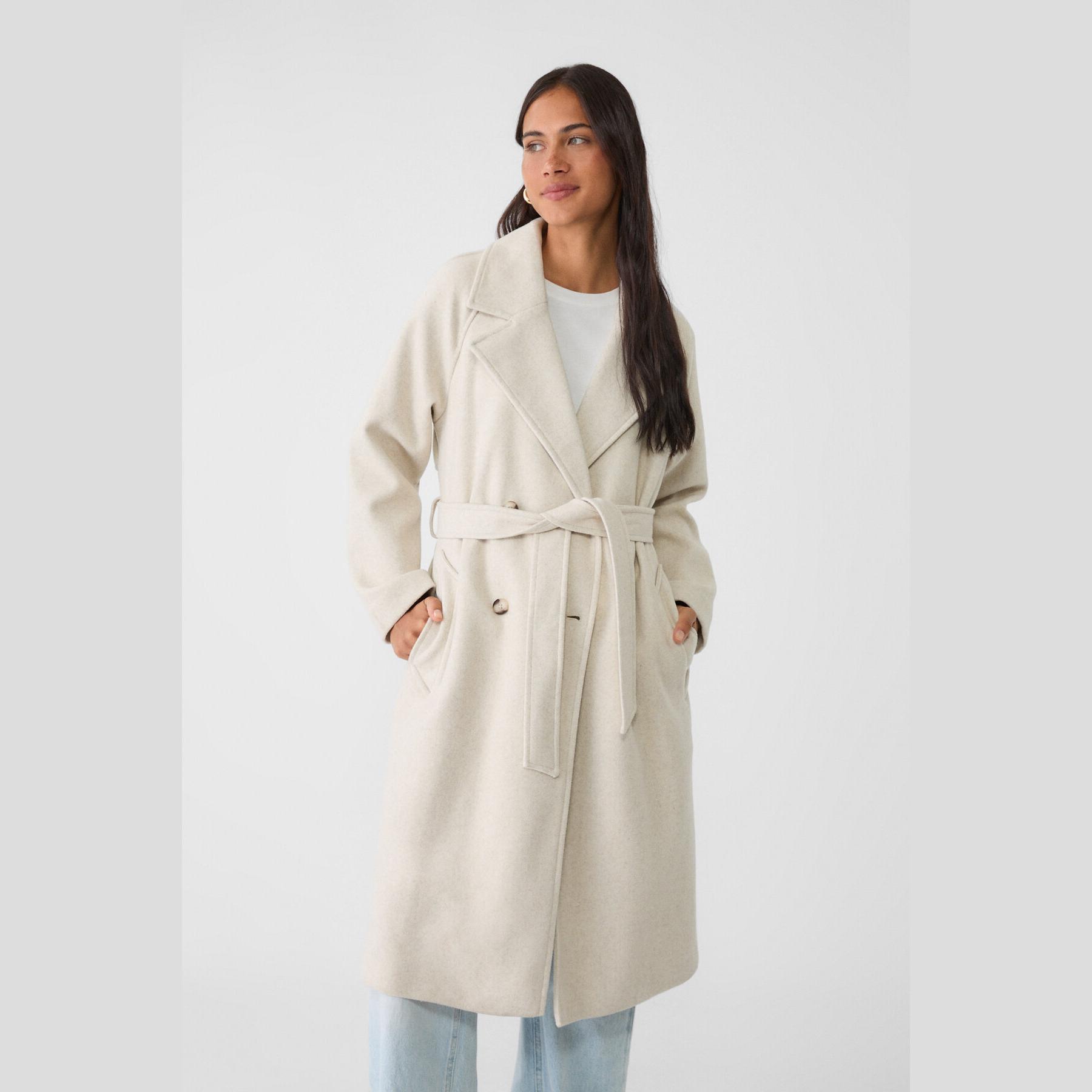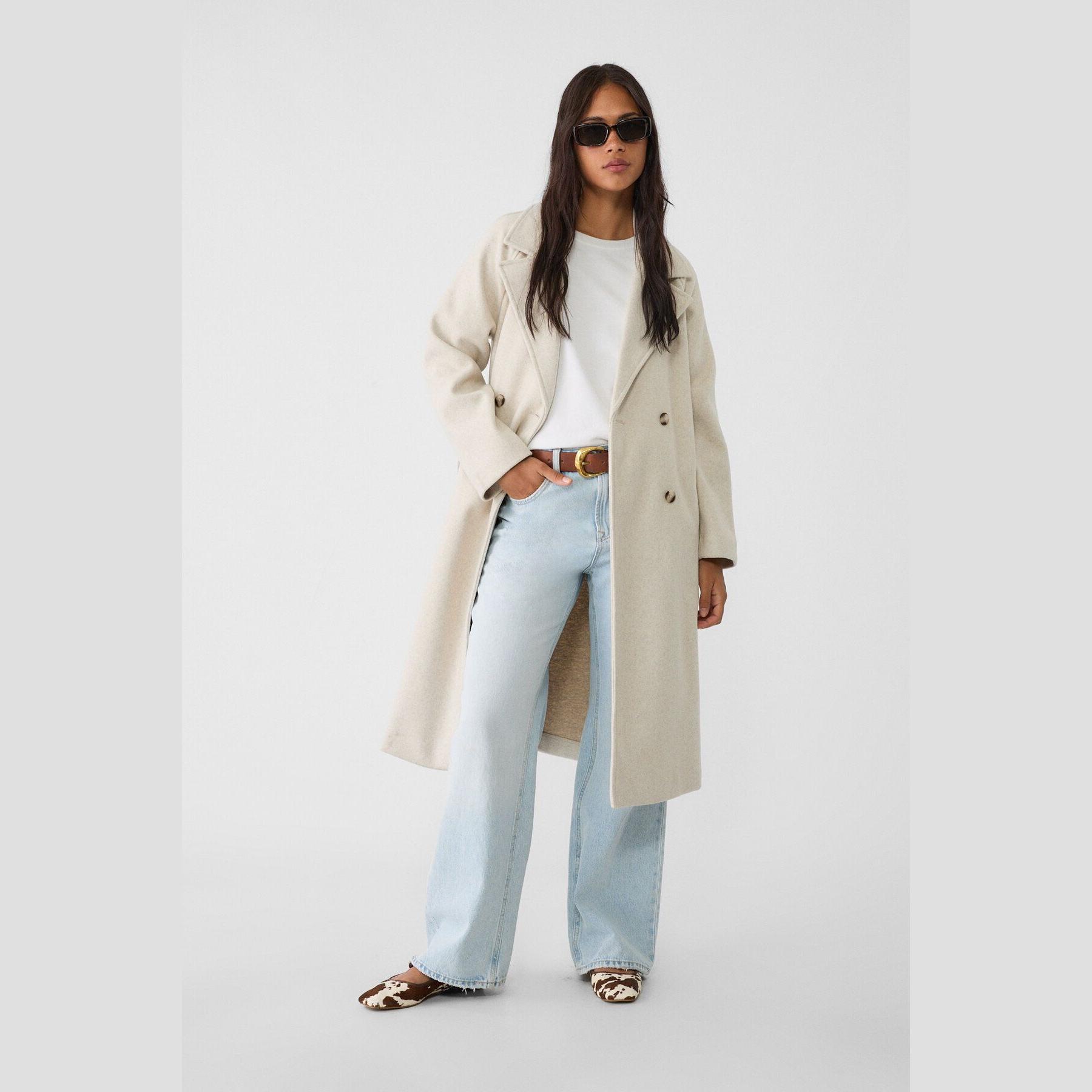ترنش كوت أنيق من Stradivarius بلون إكرو ناعم، مصنوع من خامة منسوجة ناعمة بملمس مريح، بياقة جاكيت كلاسيكية وقصة كروڤاز، يتميز بإغلاق أمامي بالأزرار وحزام خصر قابل للتعديل يمنحك سيلويت أنثوي، مع جيوب جانبية عملية وتصميم ميدي مثالي للمواسم الانتقالية.