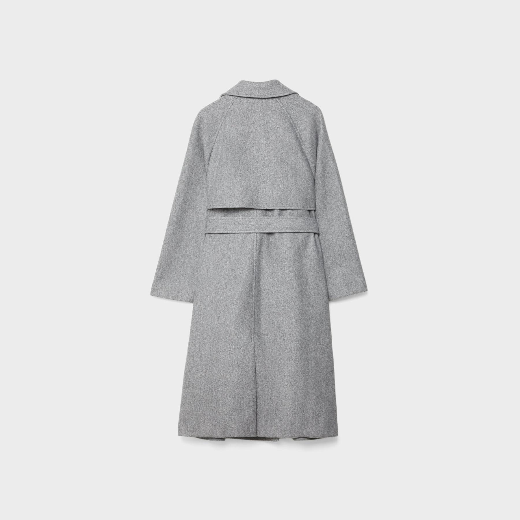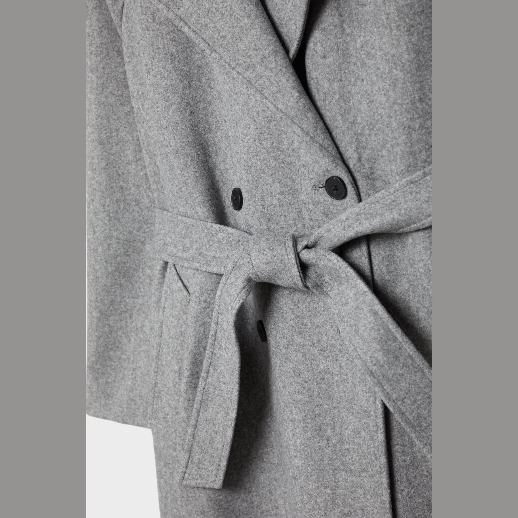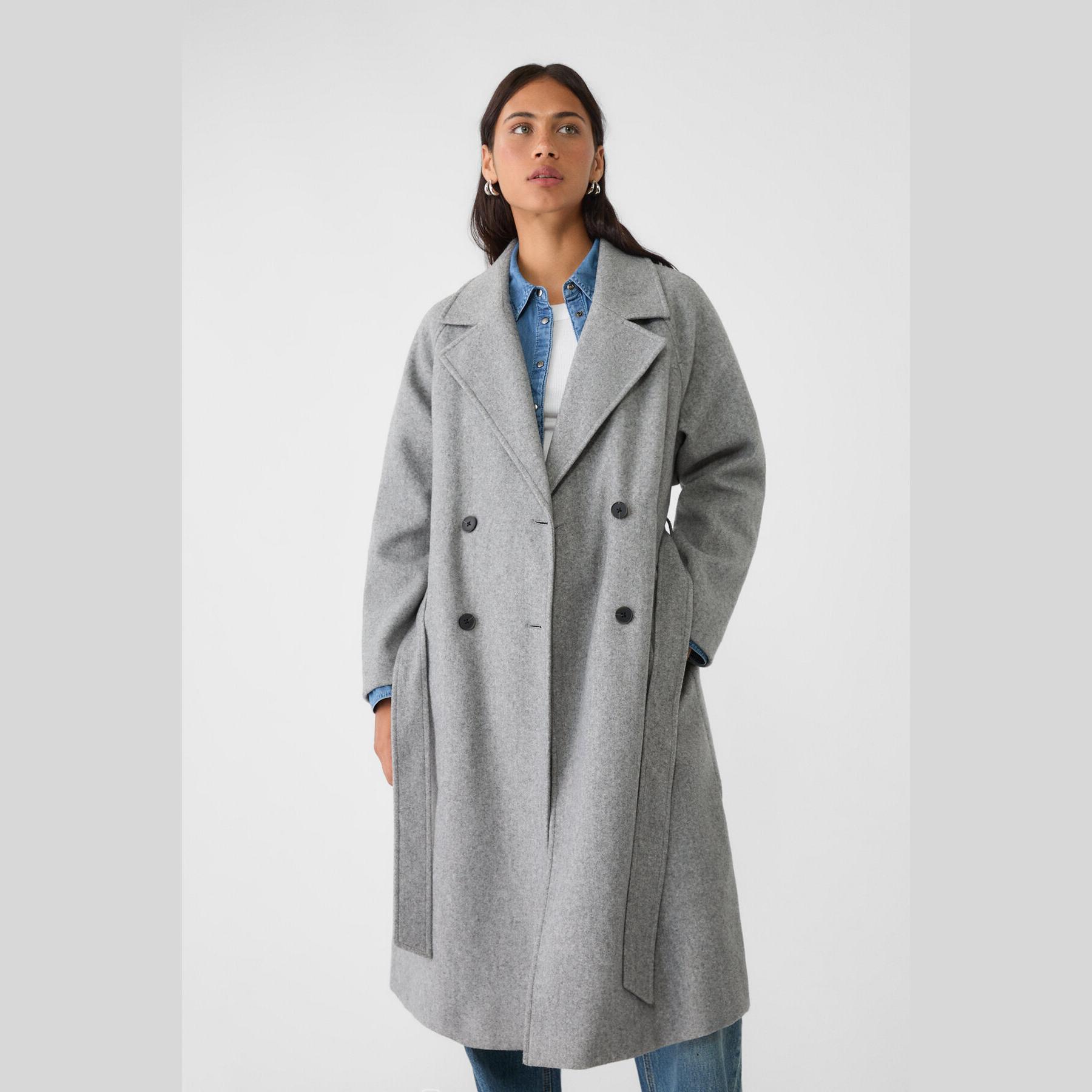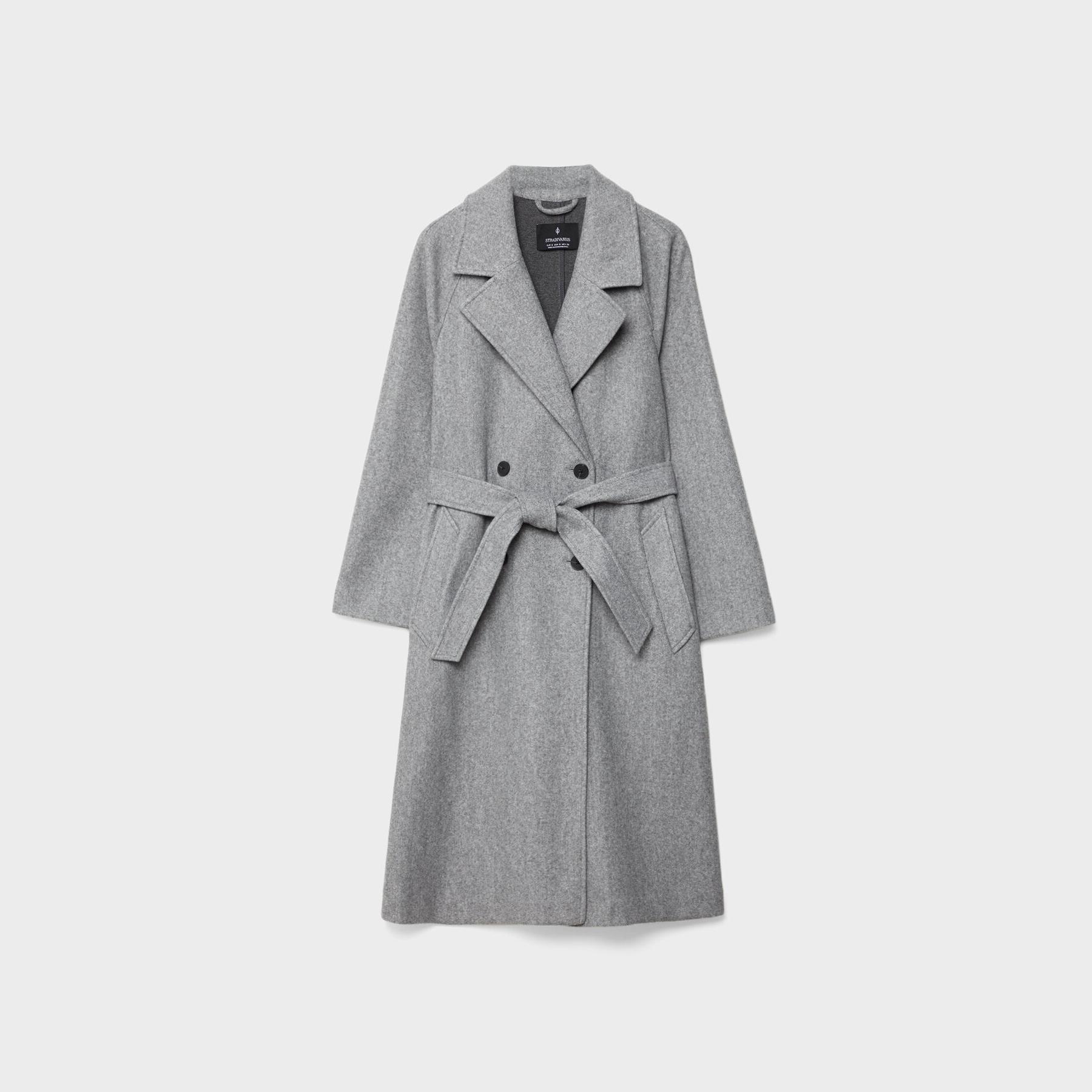 كابان أنيق من Stradivarius بلون رمادي ميلانج، مصنوع من خامة منسوجة ناعمة بملمس مريح، بياقة كروڤاز كلاسيكية وقصة مستقيمة، يتميز بإغلاق أمامي بالأزرار وجيوب جانبية مزدوجة، مثالي للتنسيق مع بناطيل رسمية أو جينز لإطلالة شتوية أنيقة وعملية.