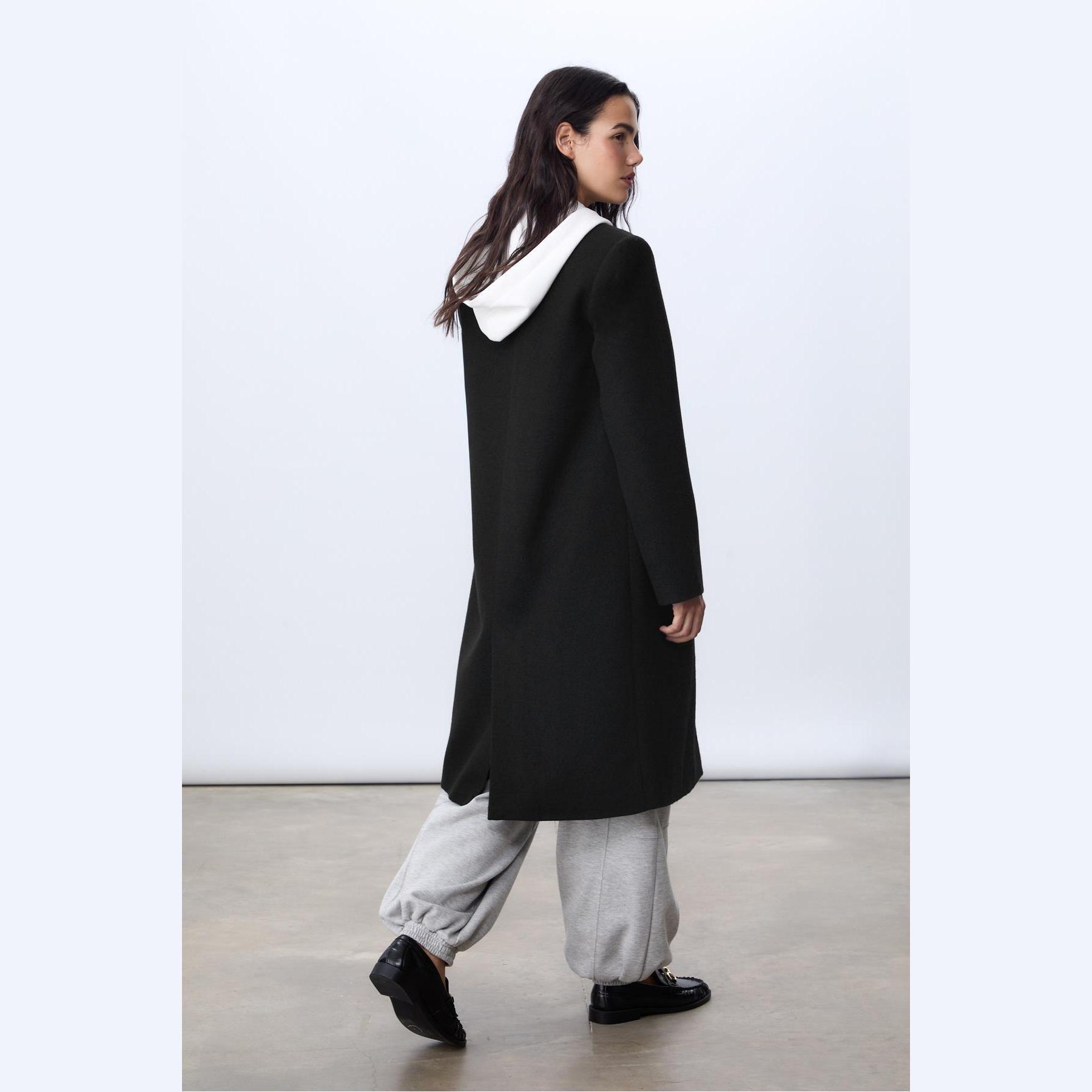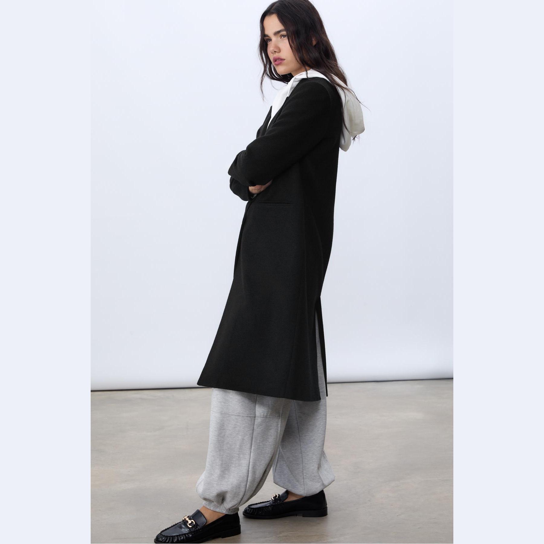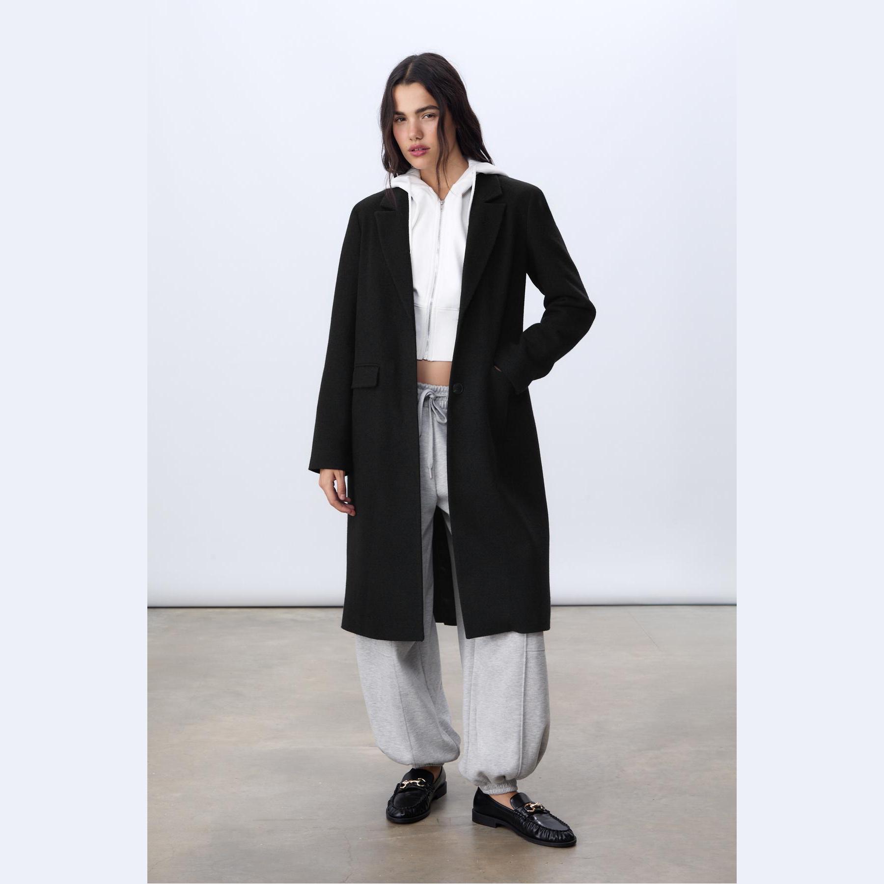 بالطو أنيق من Stradivarius بلون أسود كلاسيكي، مصنوع من خامة منسوجة ناعمة بتركيبة متعددة الألياف، بياقة جاكيت وقصة مستقيمة، يتميز بإغلاق أمامي بالأزرار وجيوب بيات ديكورية، مثالي للتنسيق مع بناطيل رسمية أو جينز لإطلالة شتوية أنيقة وعملية.