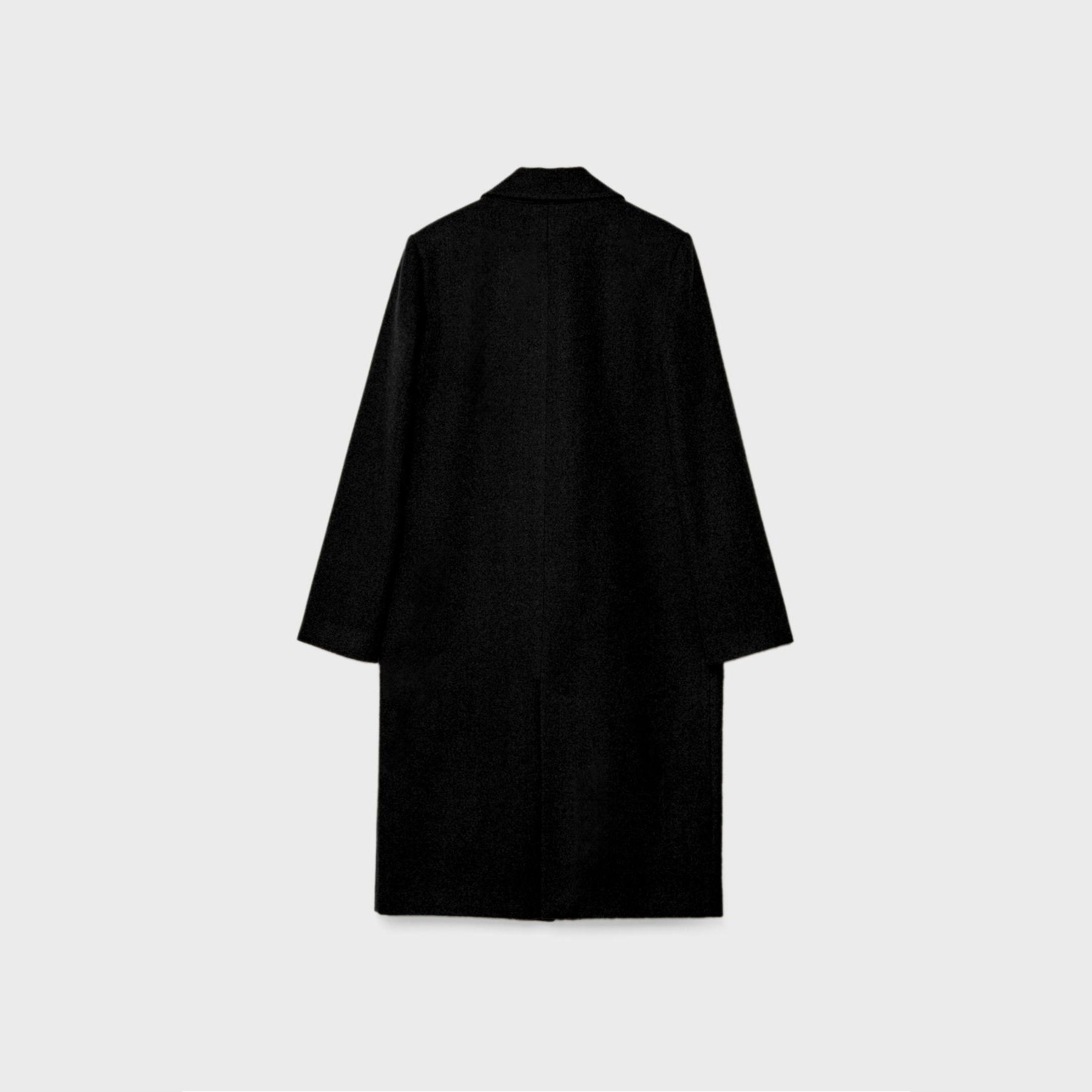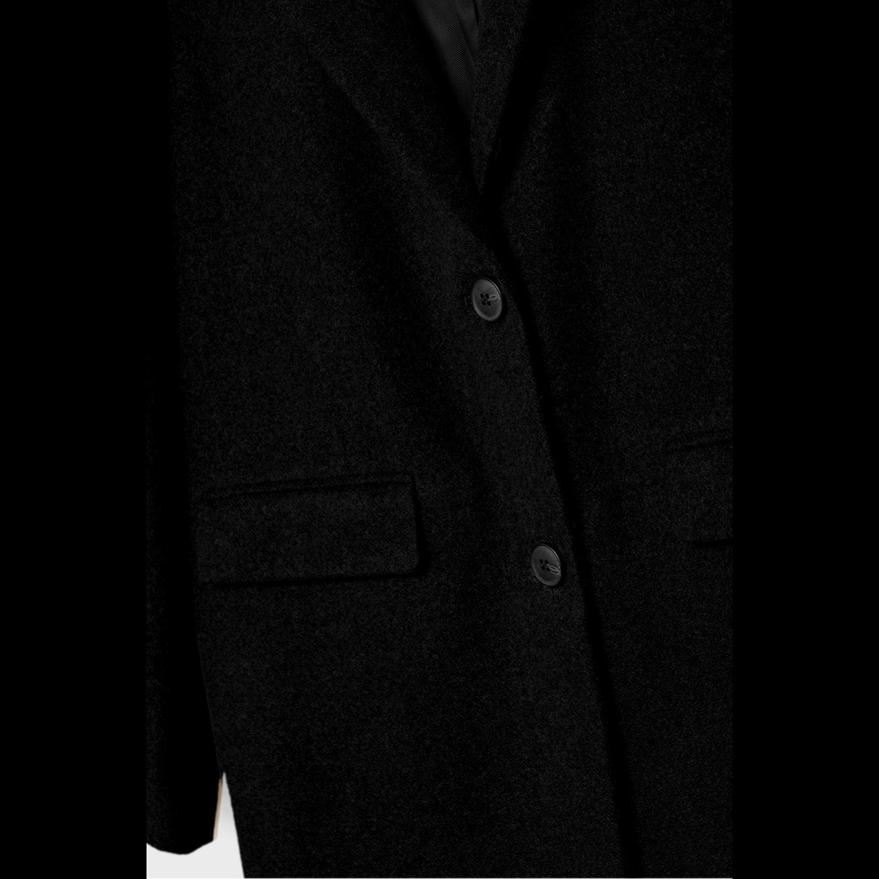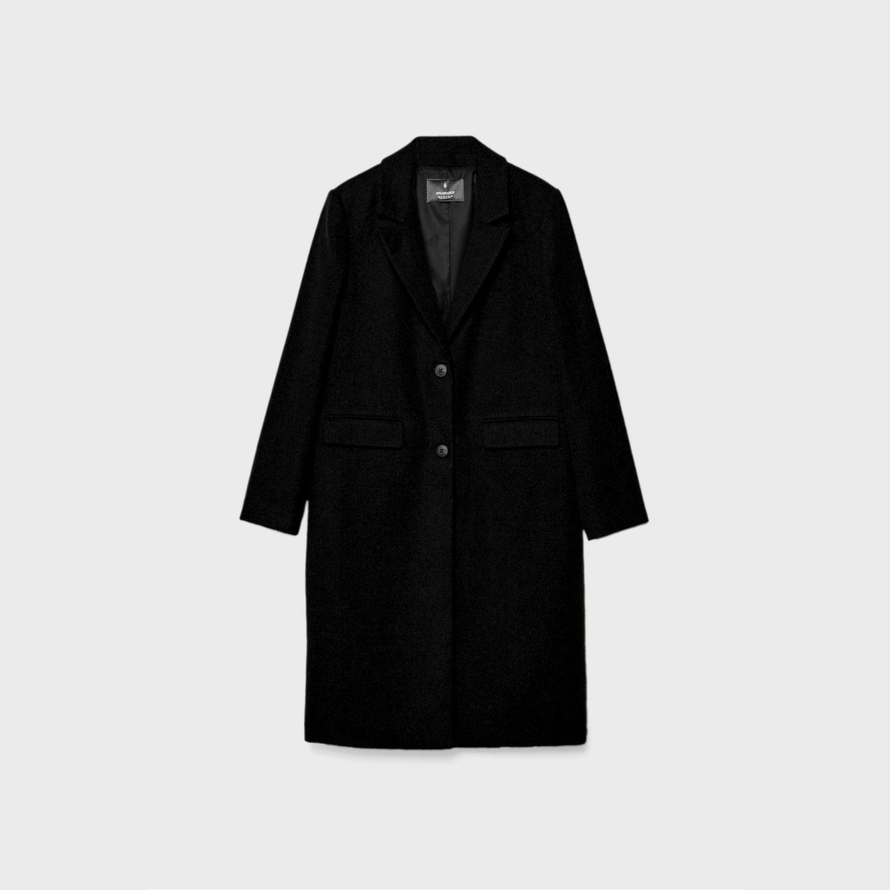 بالطو أنيق من Stradivarius بلون أسود كلاسيكي، مصنوع من خامة منسوجة ناعمة بتركيبة متعددة الألياف، بياقة جاكيت وقصة مستقيمة، يتميز بإغلاق أمامي بالأزرار وجيوب بيات ديكورية، مثالي للتنسيق مع بناطيل رسمية أو جينز لإطلالة شتوية أنيقة وعملية.