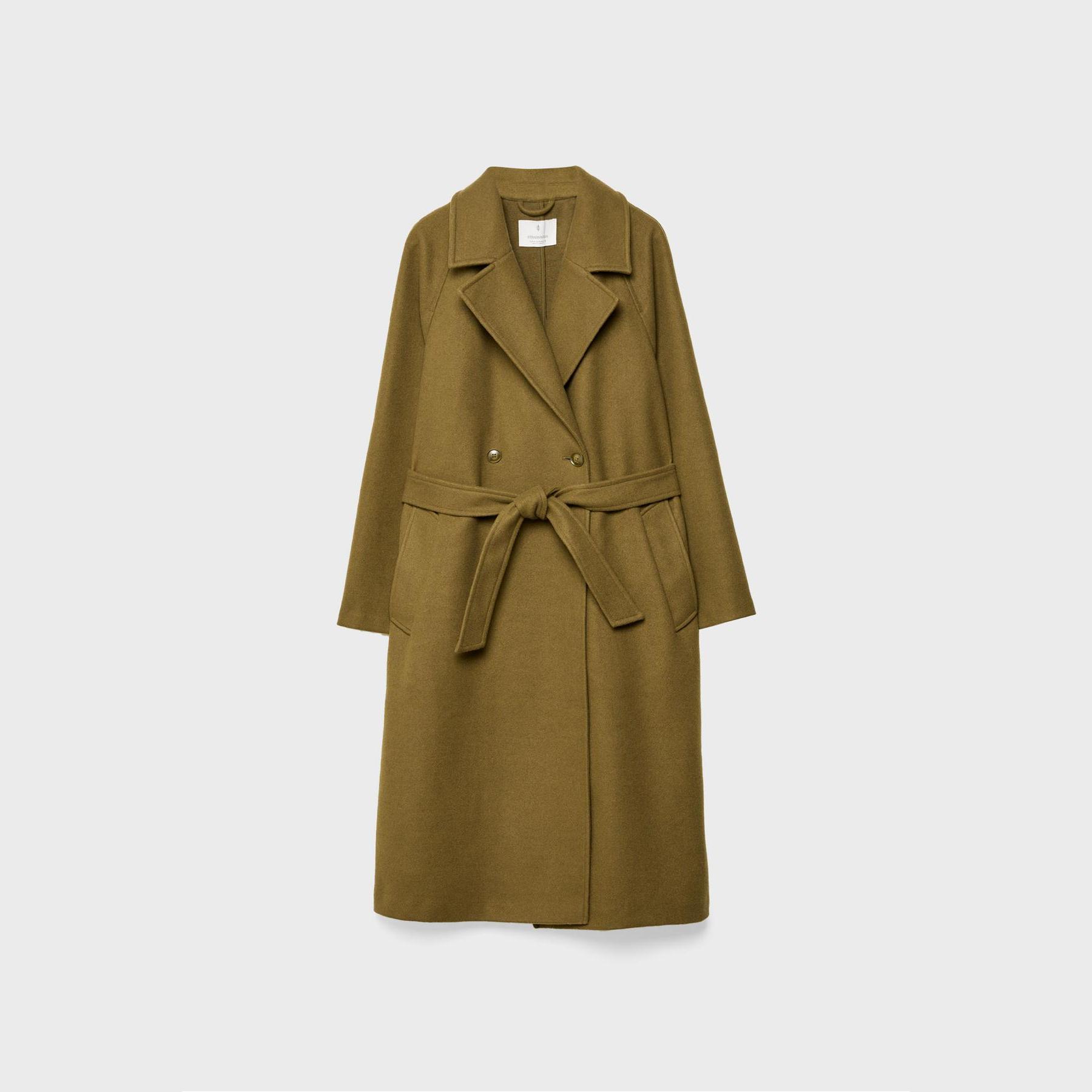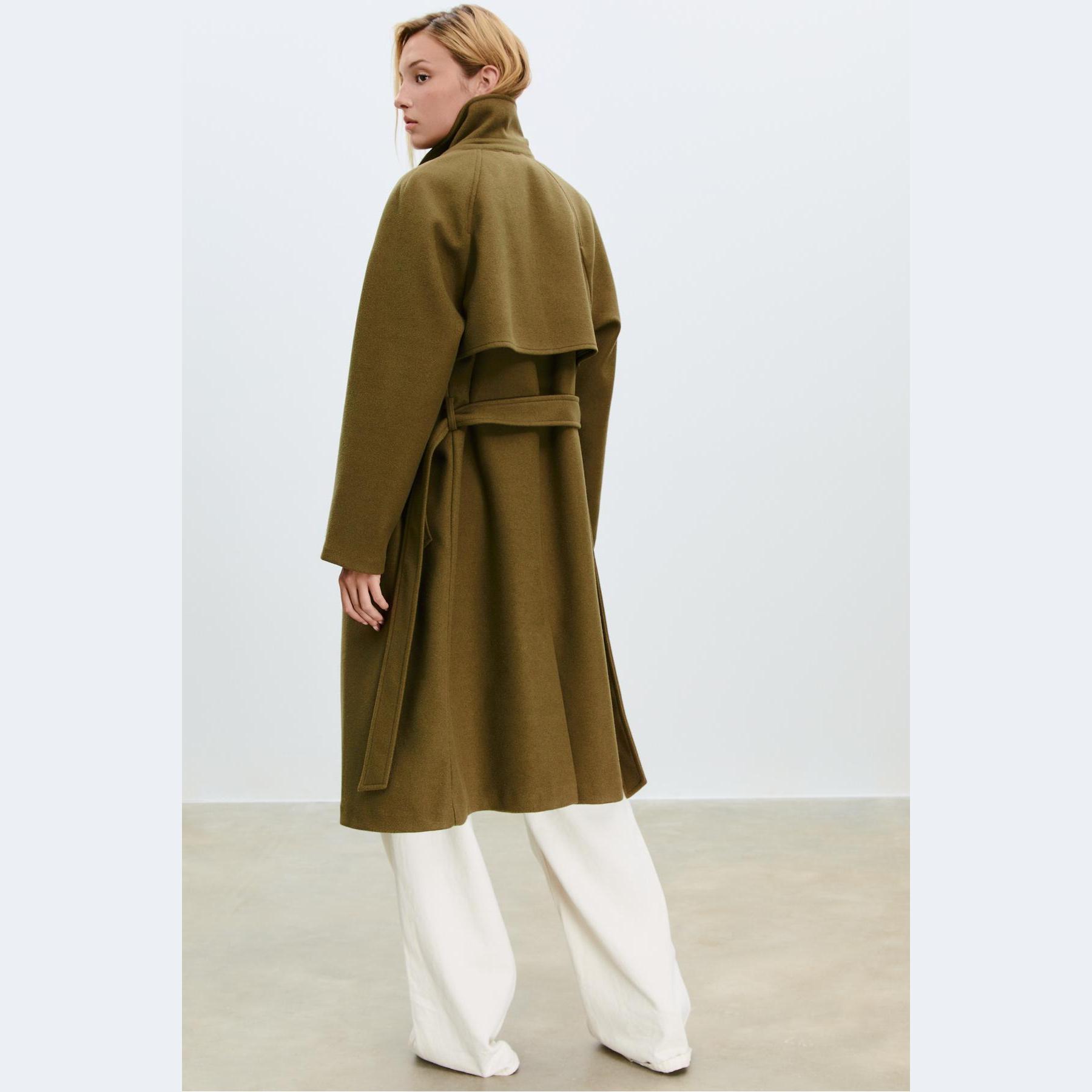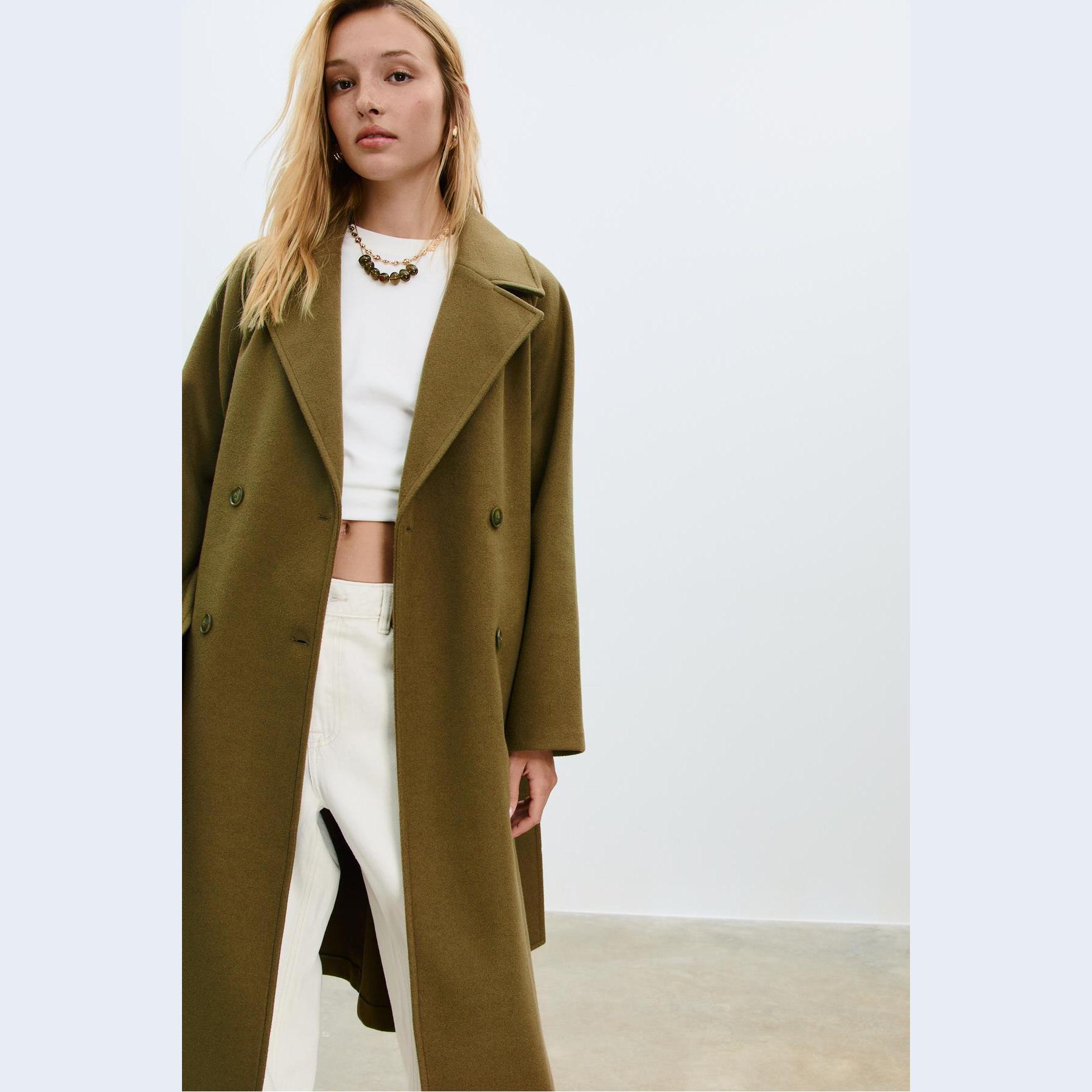كابان أنيق من Stradivarius بلون أخضر زيتي جذاب، مصنوع من خامة منسوجة ناعمة بملمس مريح، بياقة كروڤاز كلاسيكية وقصة مستقيمة، يتميز بإغلاق أمامي بأزرار متباينة وجيوب جانبية مزدوجة، مثالي للتنسيق مع بناطيل رسمية أو جينز لإطلالة شتوية أنيقة وعملية.