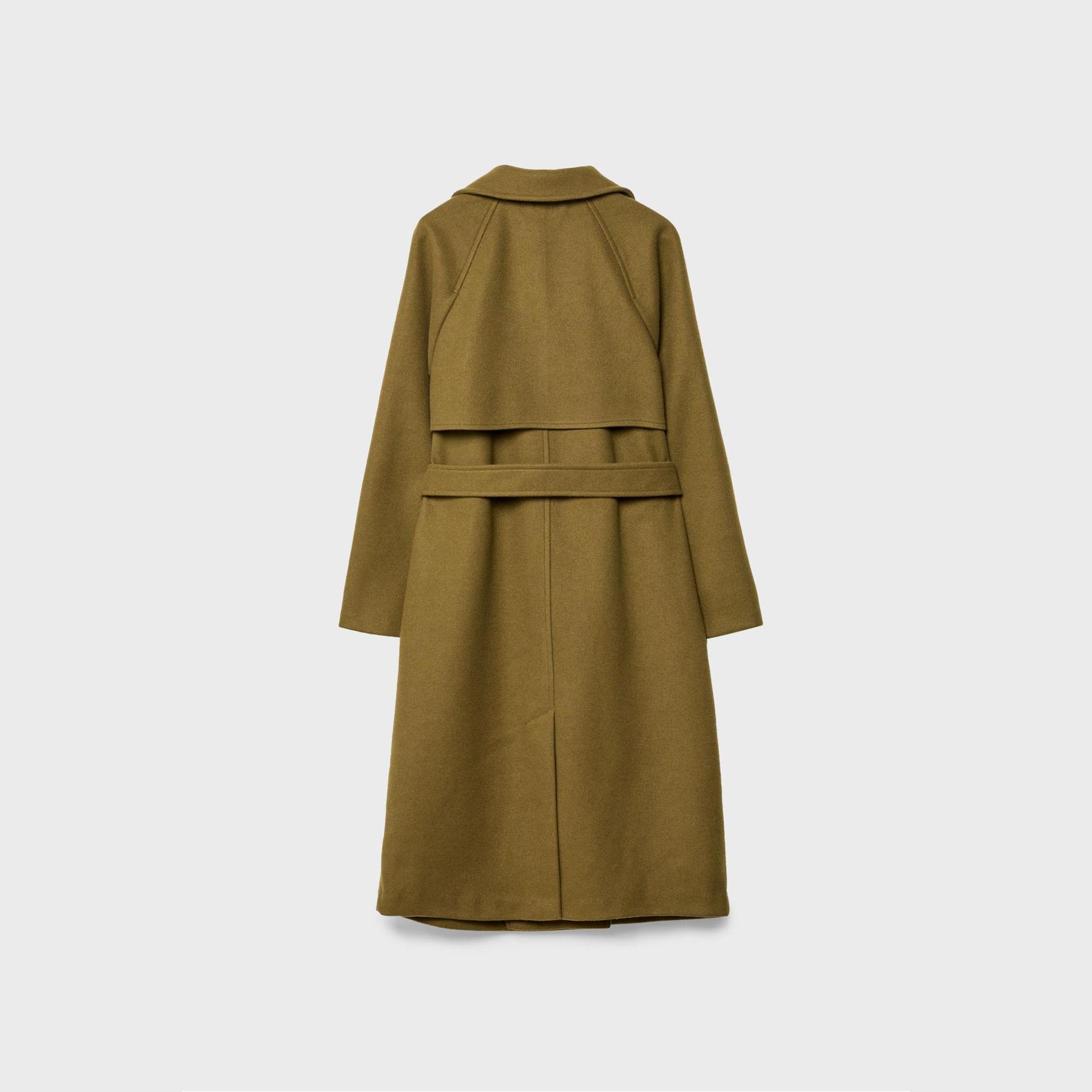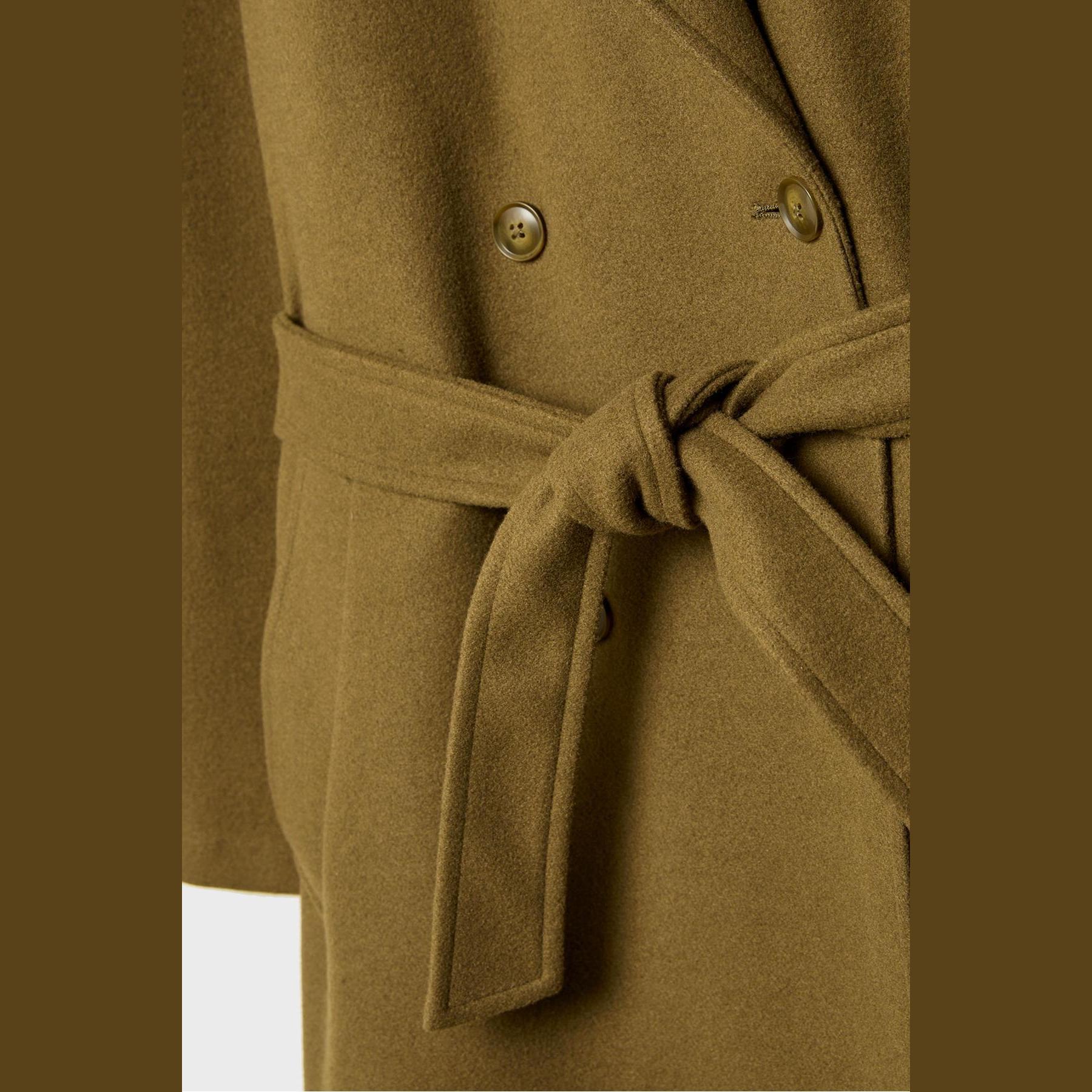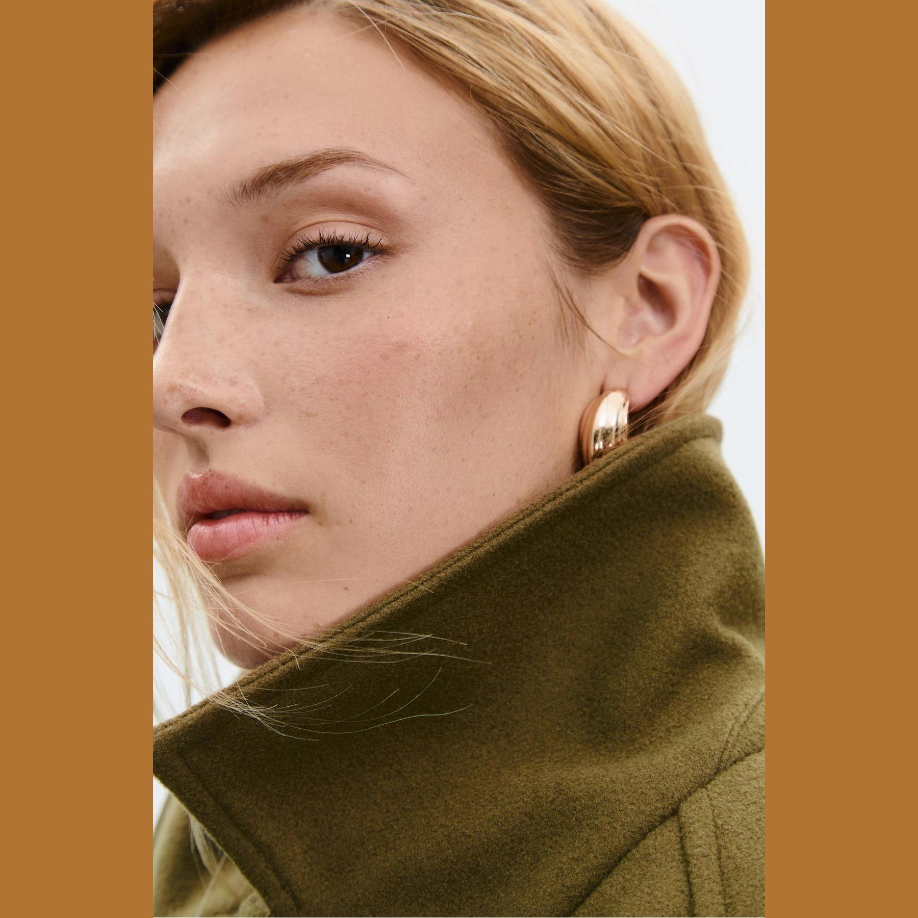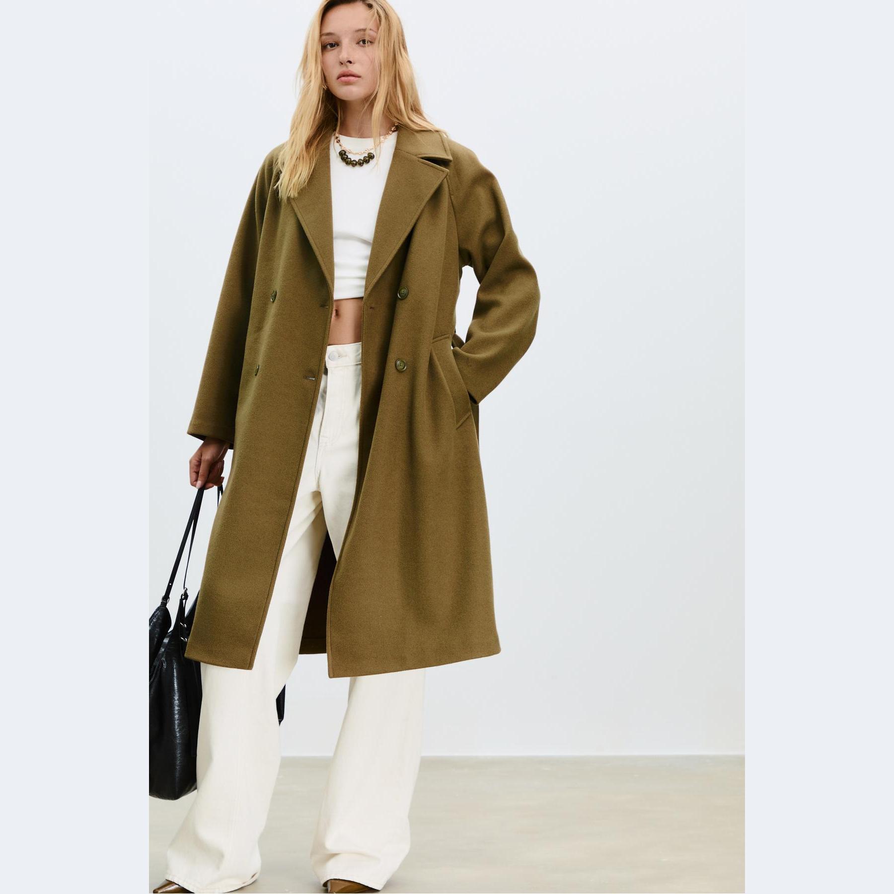 كابان أنيق من Stradivarius بلون أخضر زيتي جذاب، مصنوع من خامة منسوجة ناعمة بملمس مريح، بياقة كروڤاز كلاسيكية وقصة مستقيمة، يتميز بإغلاق أمامي بأزرار متباينة وجيوب جانبية مزدوجة، مثالي للتنسيق مع بناطيل رسمية أو جينز لإطلالة شتوية أنيقة وعملية.