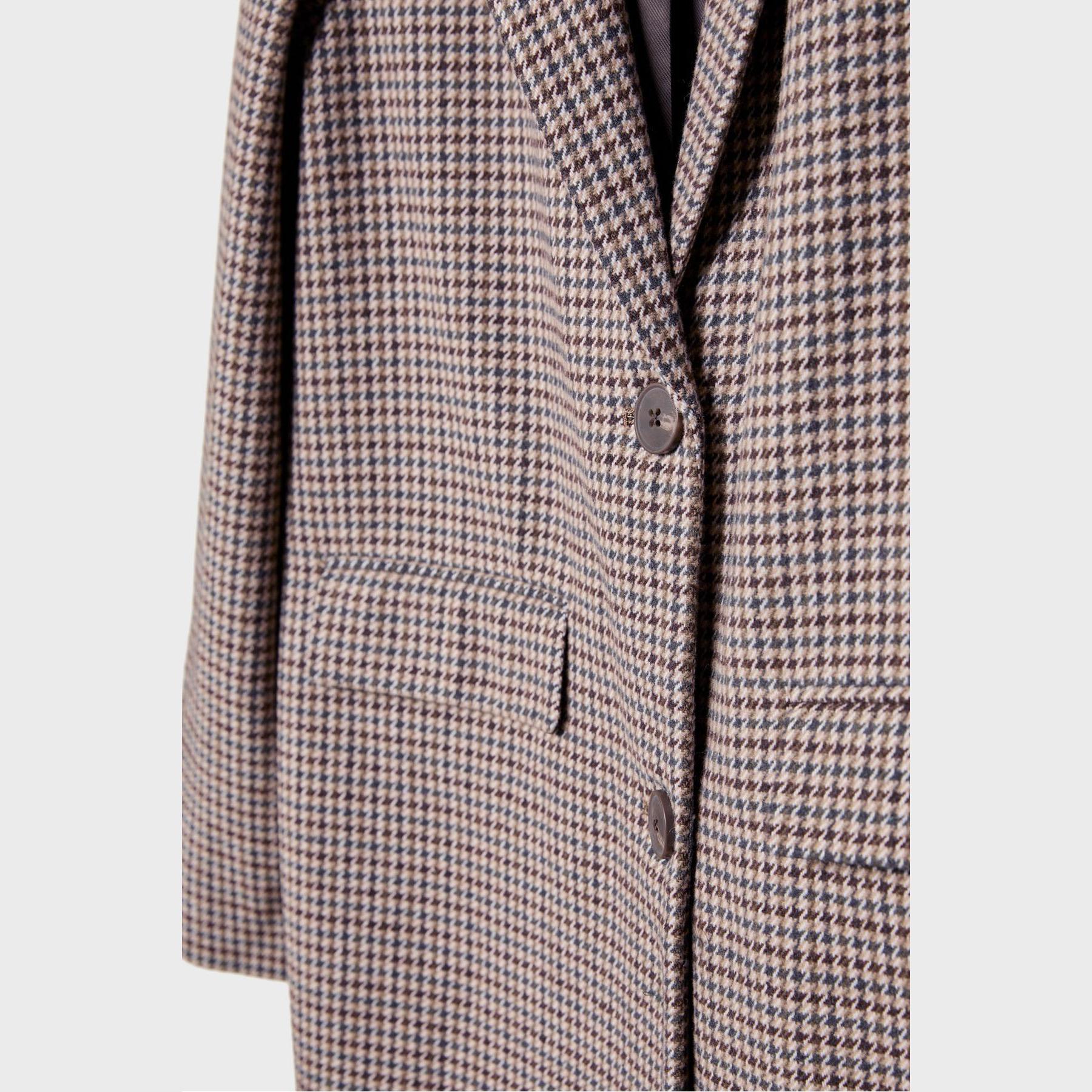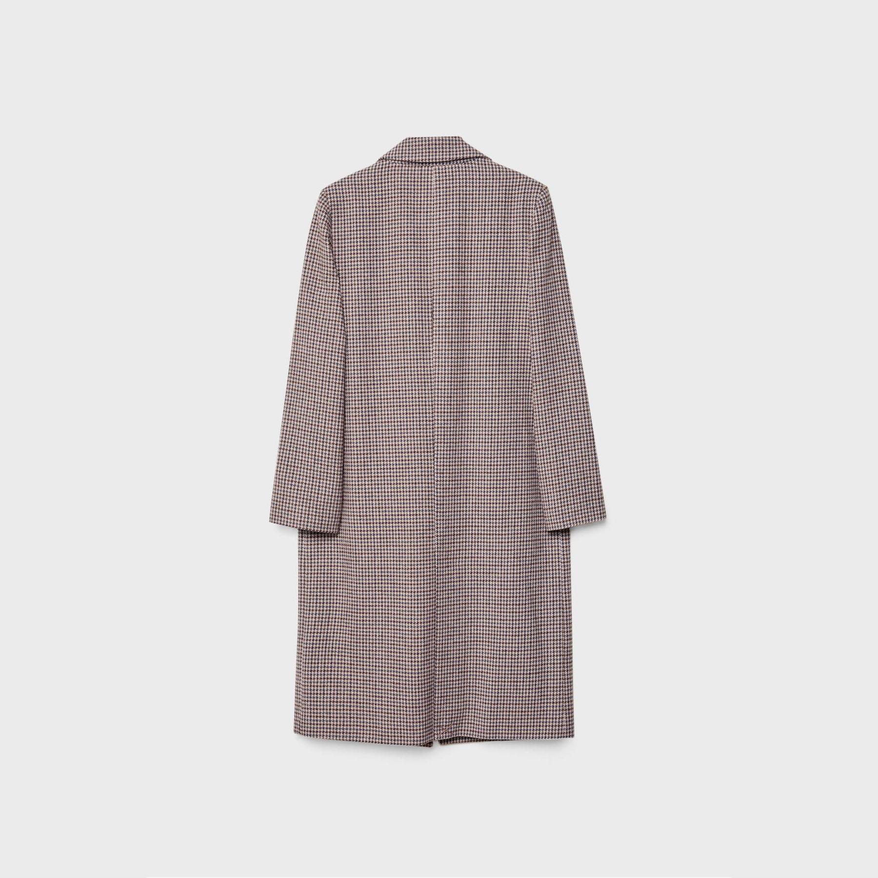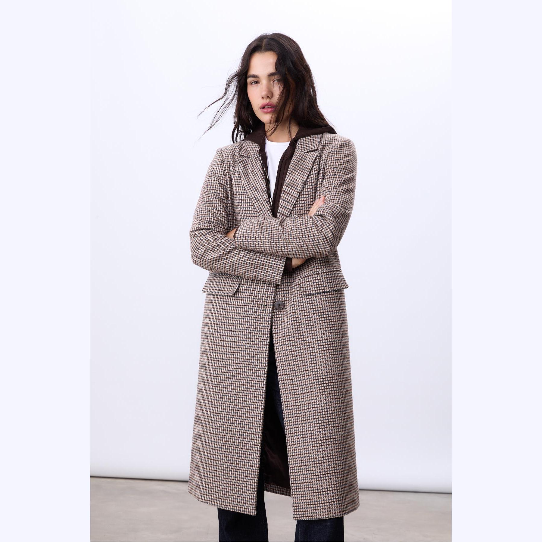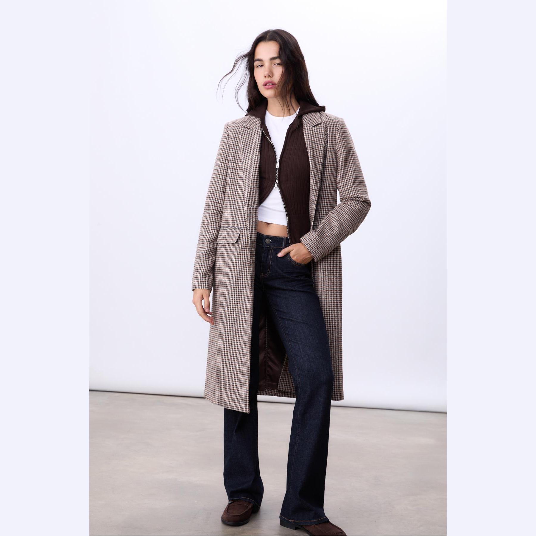 كابان أنيق من Stradivarius بلون بيج بنقشة مربعات، مصنوع من خامة منسوجة ناعمة بتركيبة متعددة الألياف، بياقة جاكيت كلاسيكية وقصة مستقيمة، يتميز بإغلاق أمامي بالأزرار وجيوب بيات ديكورية، مثالي للتنسيق مع بناطيل رسمية أو جينز لإطلالة شتوية أنيقة وعملية.