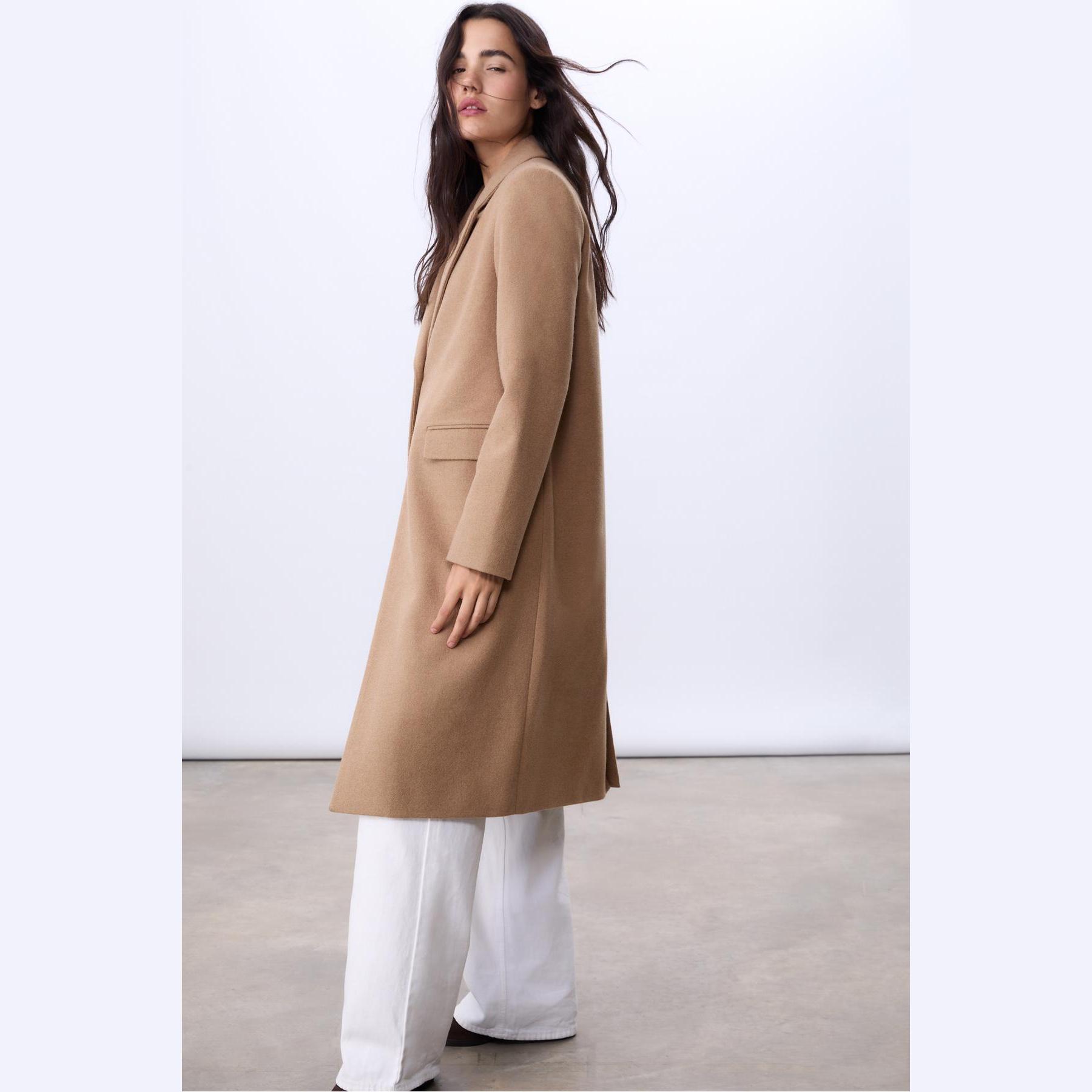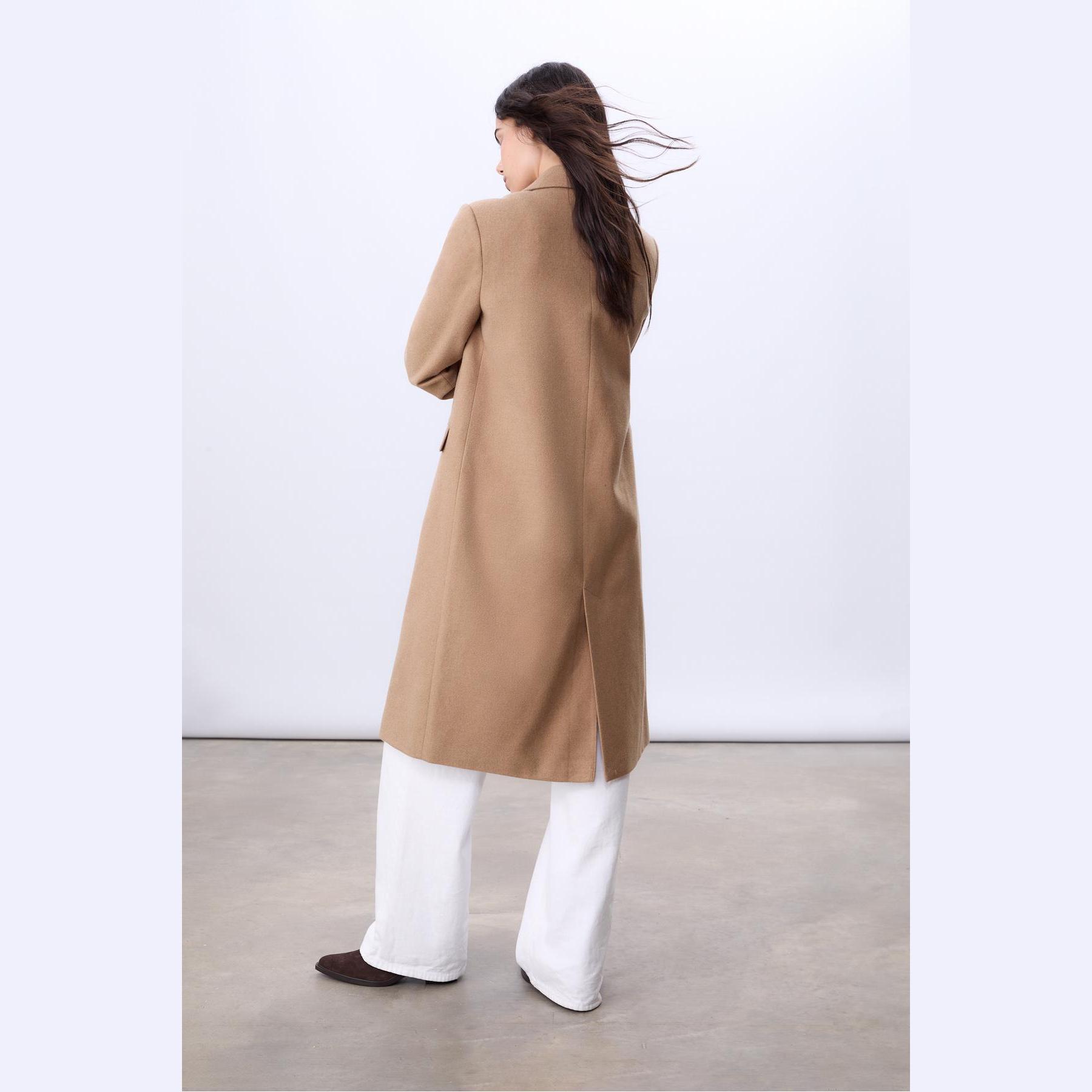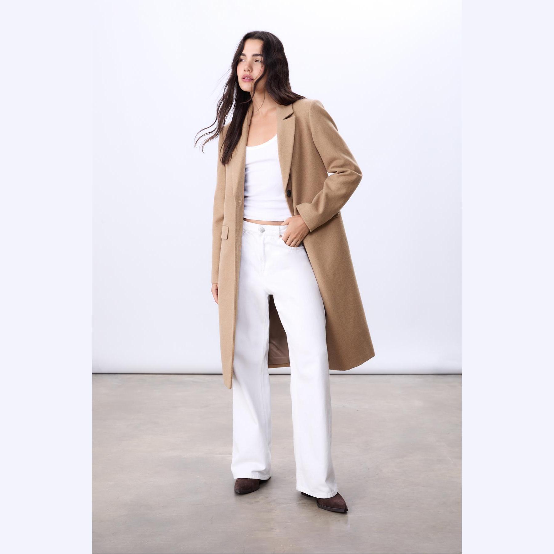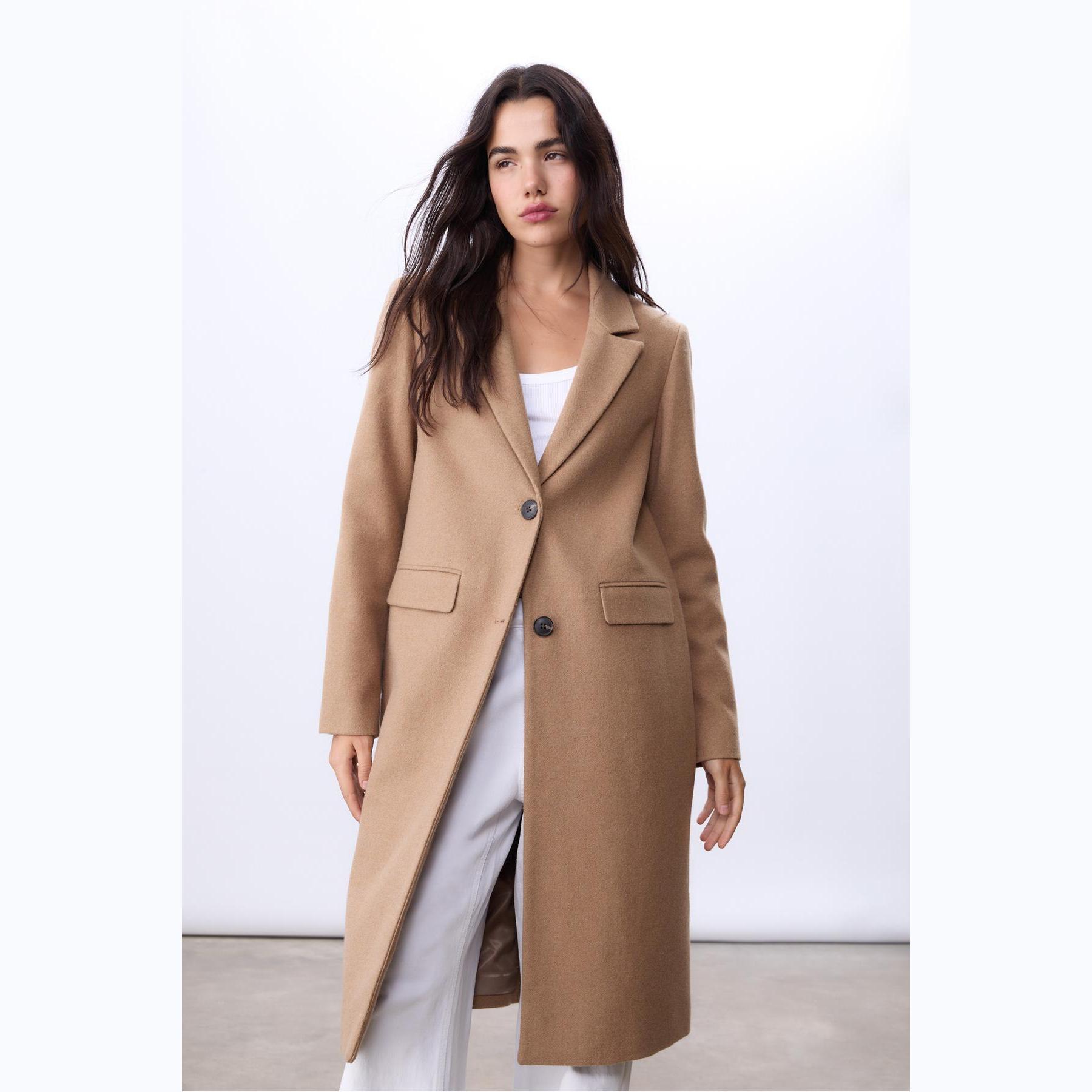 بالطو أنيق من Stradivarius بلون كاميل دافئ، مصنوع من خامة منسوجة ناعمة بتركيبة متعددة الألياف، بياقة جاكيت كلاسيكية وقصة مستقيمة، يتميز بإغلاق أمامي بالأزرار وجيوب بيات ديكورية، مثالي للتنسيق مع بناطيل رسمية أو جينز لإطلالة شتوية أنيقة وعملية.
