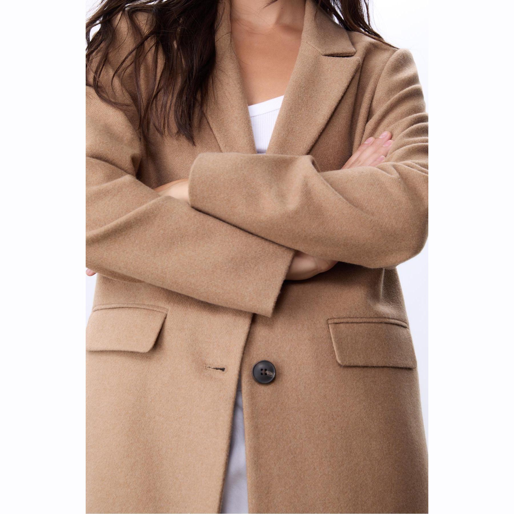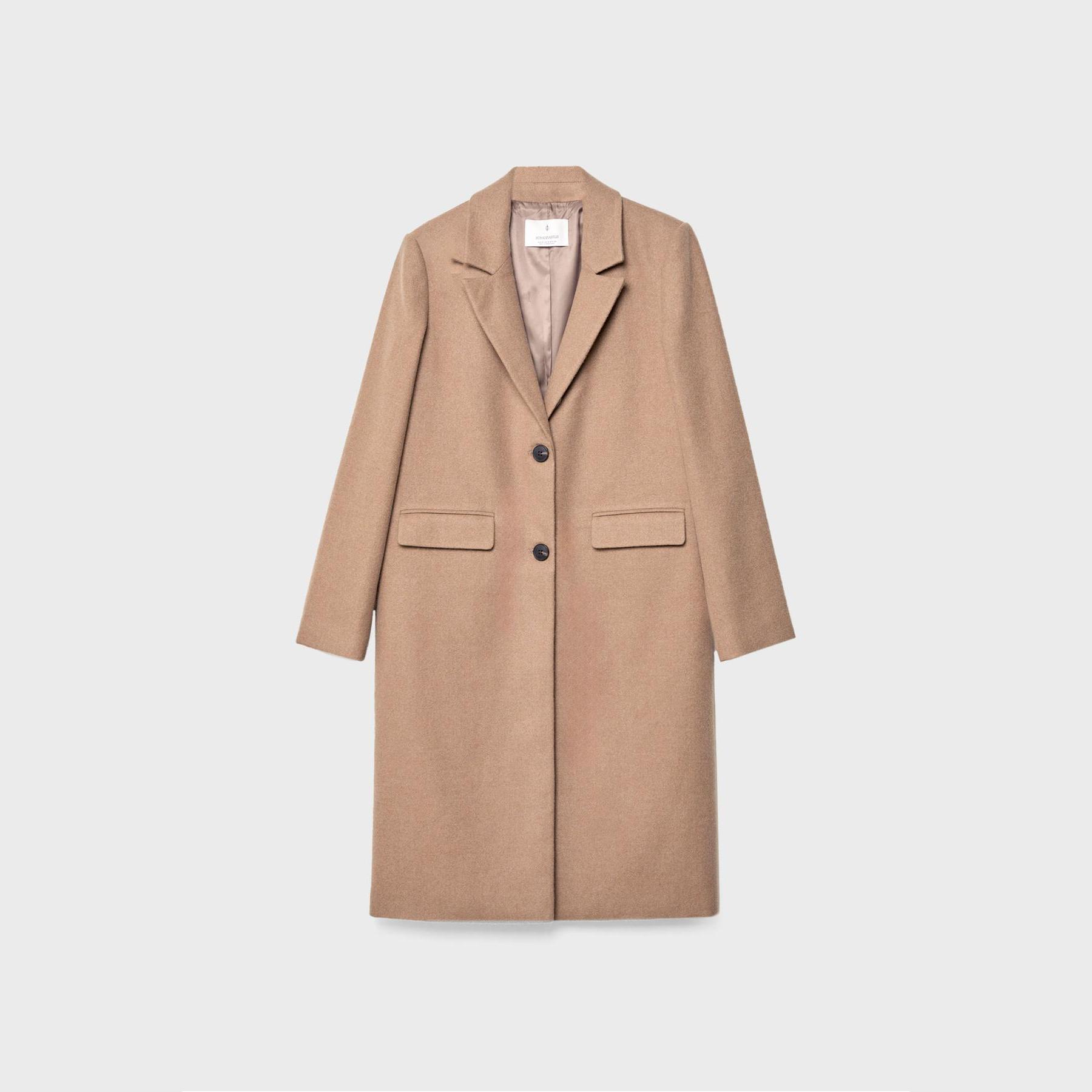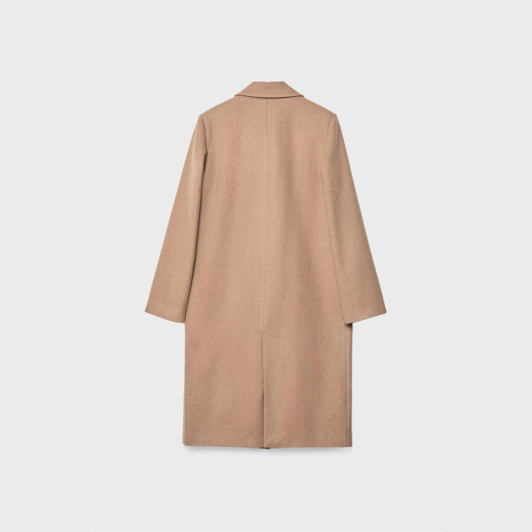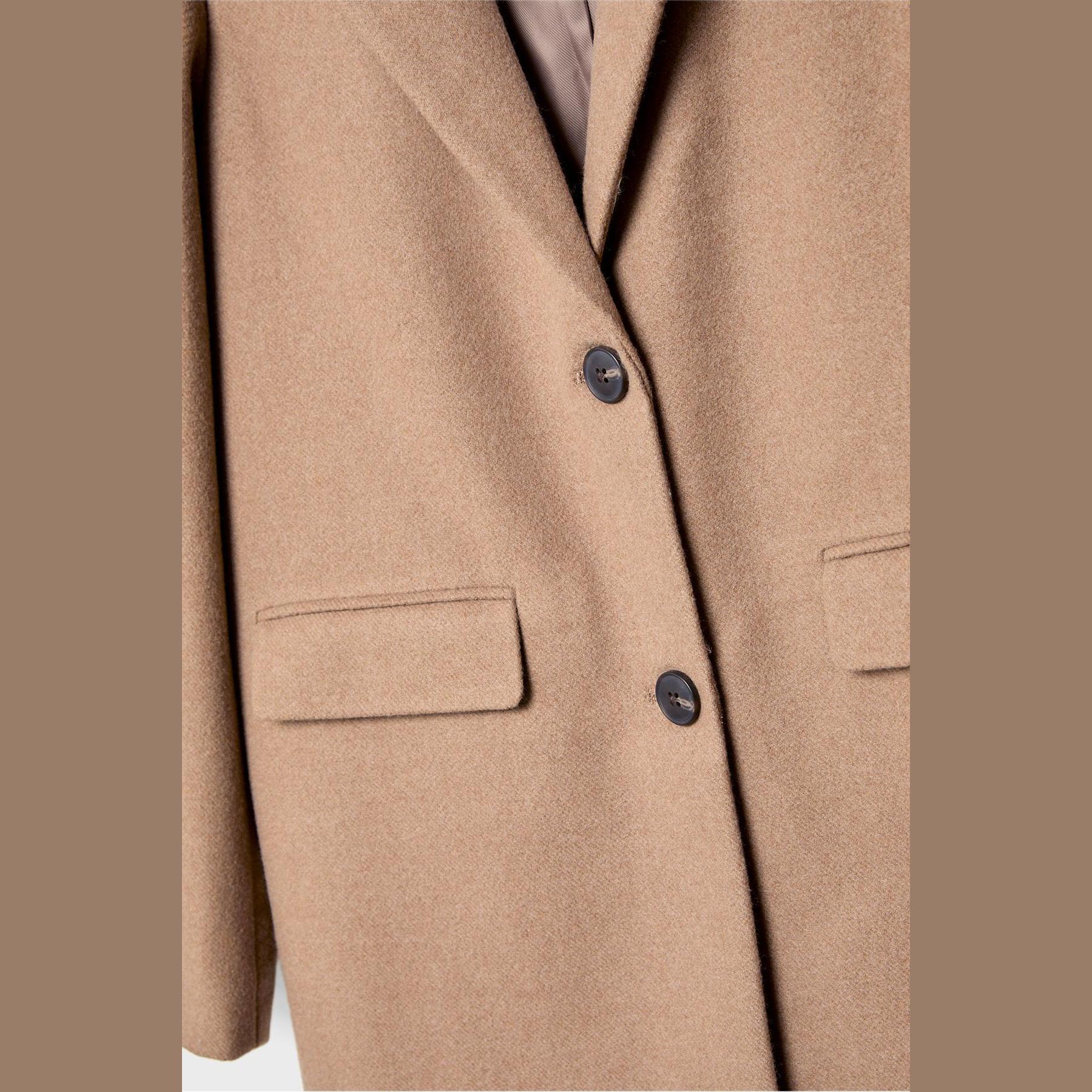 بالطو أنيق من Stradivarius بلون كاميل دافئ، مصنوع من خامة منسوجة ناعمة بتركيبة متعددة الألياف، بياقة جاكيت كلاسيكية وقصة مستقيمة، يتميز بإغلاق أمامي بالأزرار وجيوب بيات ديكورية، مثالي للتنسيق مع بناطيل رسمية أو جينز لإطلالة شتوية أنيقة وعملية.