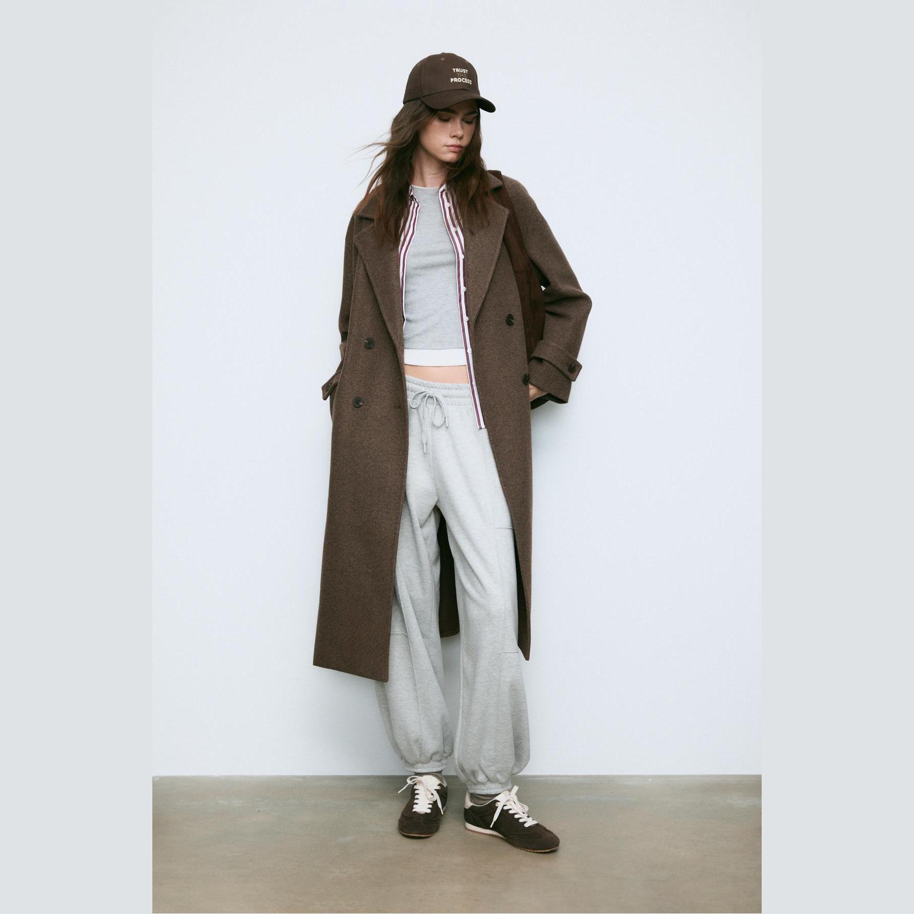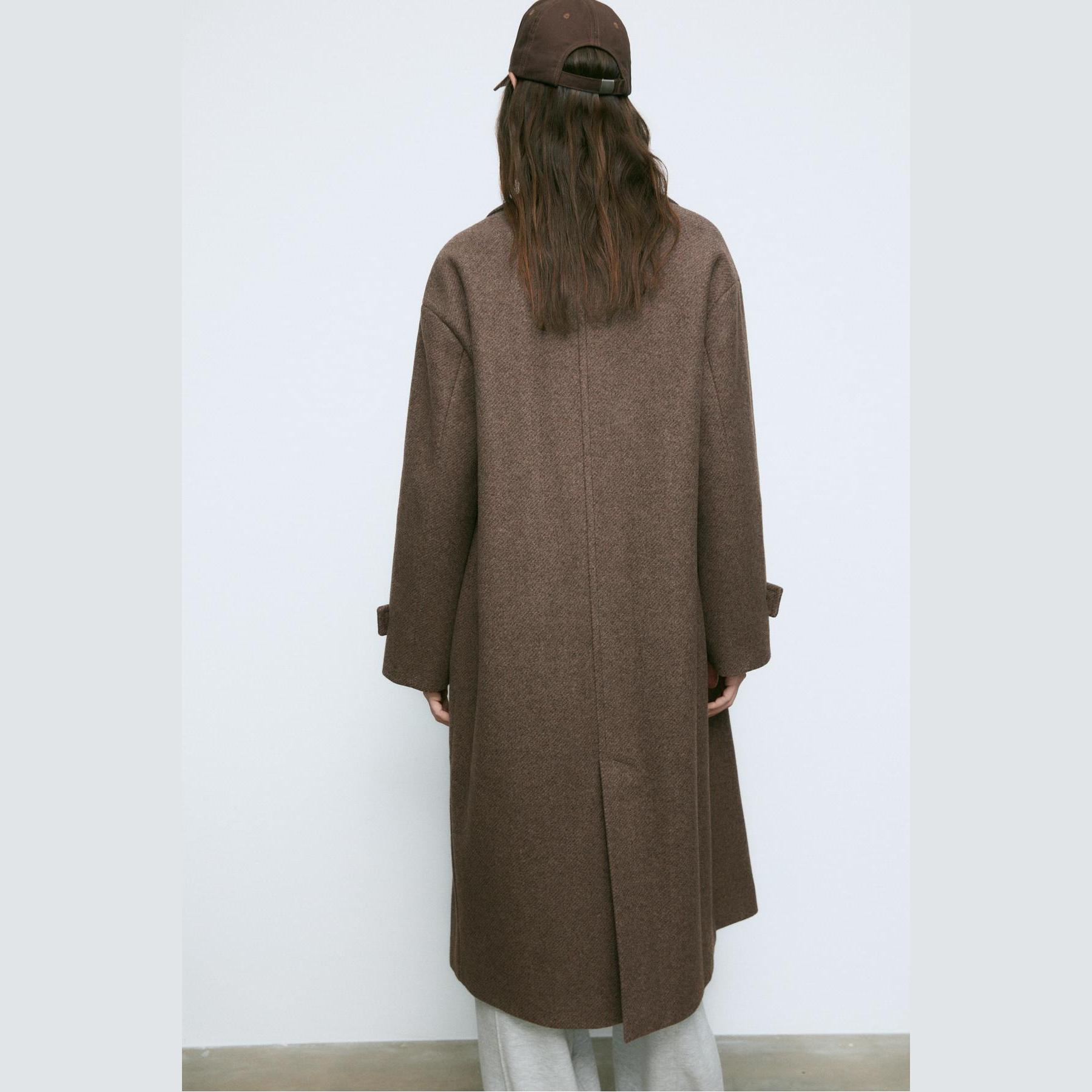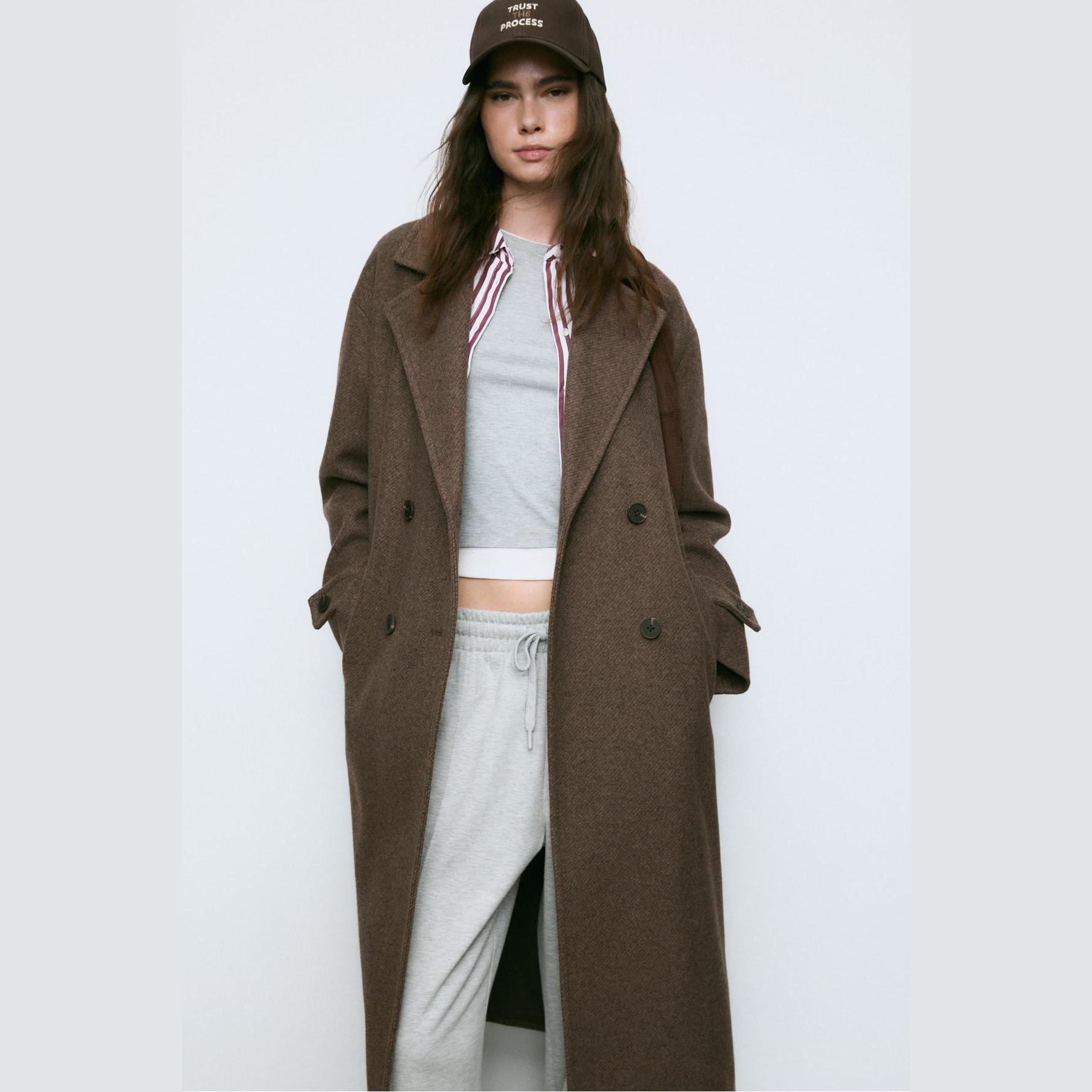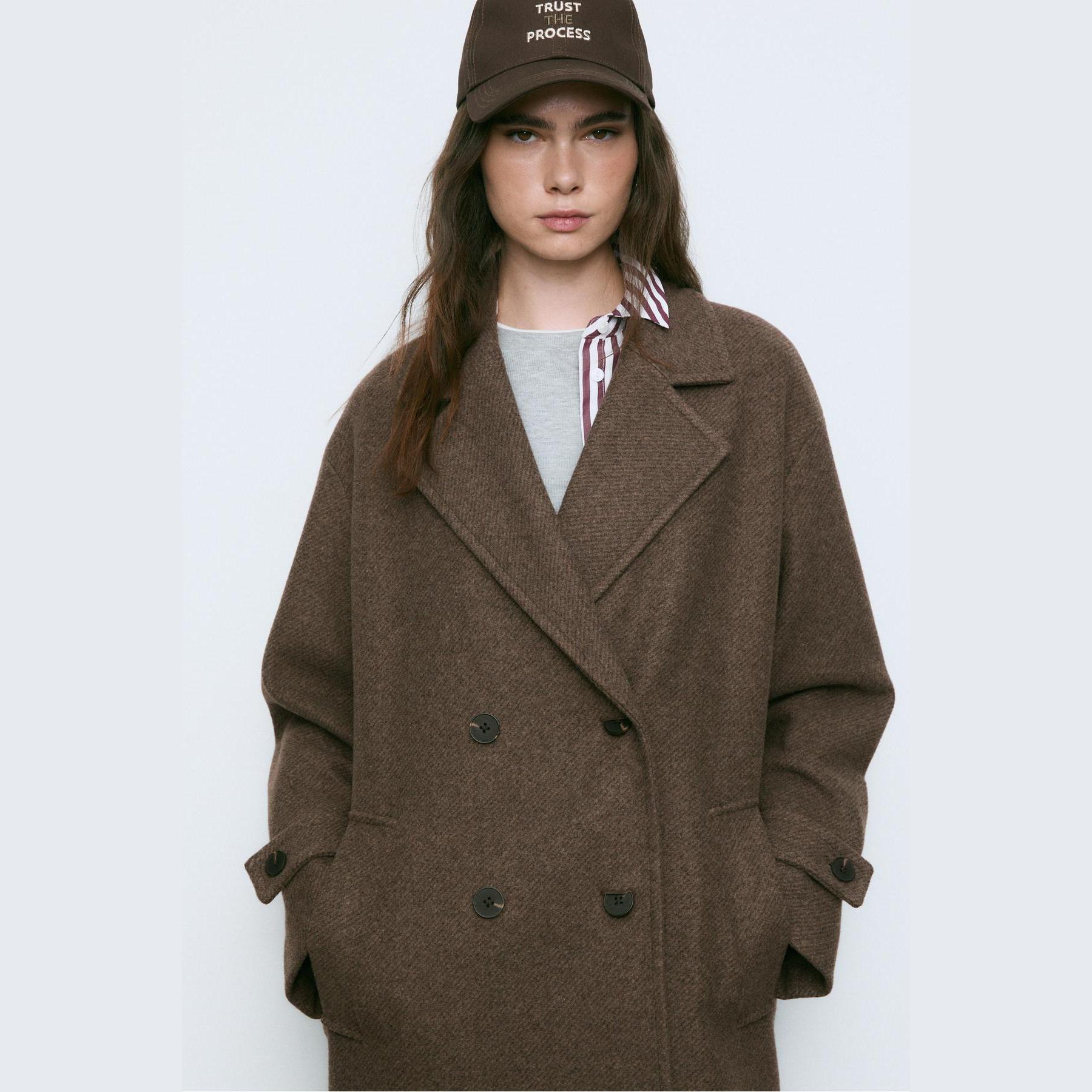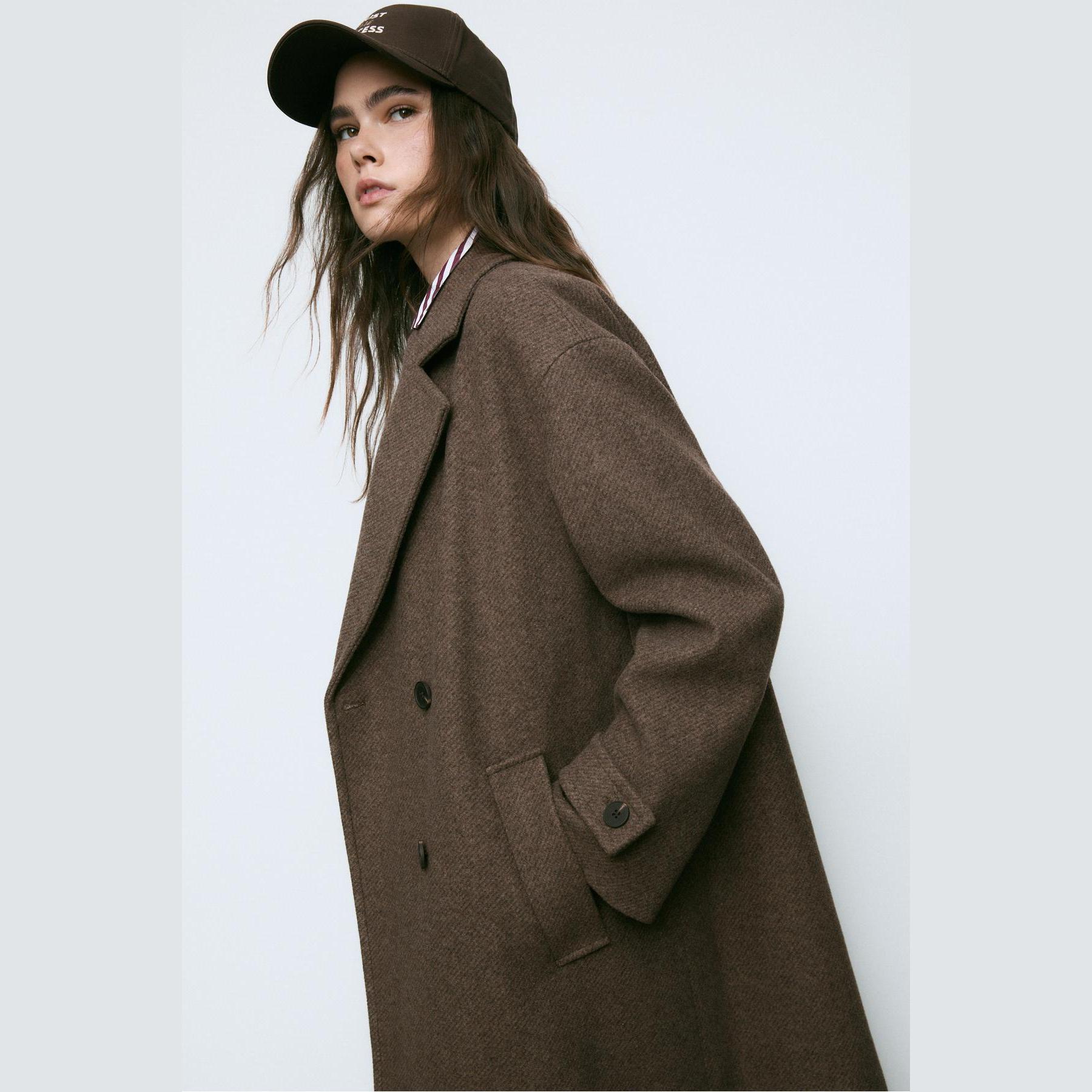 كابان أنيق من Stradivarius بلون بني دافئ، مصنوع من خامة منسوجة ناعمة 100% بوليستر، بياقة كروڤاز وقصة Oversize تمنحك مظهرًا عصريًا وراحة مثالية، يتميز بأزرار أمامية وجيوب جانبية مخفية، مثالي للتنسيق مع بناطيل جينز أو قطع رسمية لإطلالة شتوية مريحة ومتناسقة.
