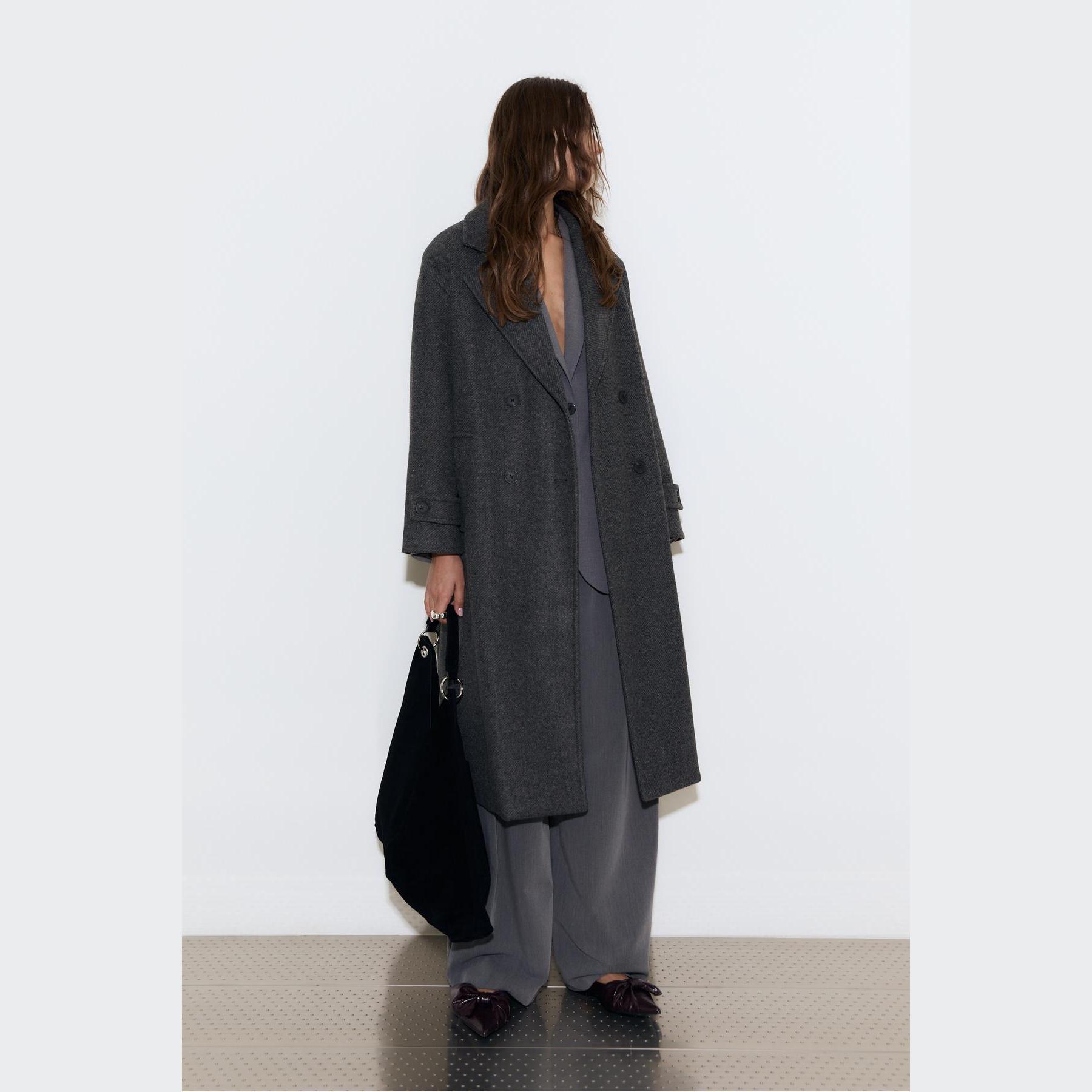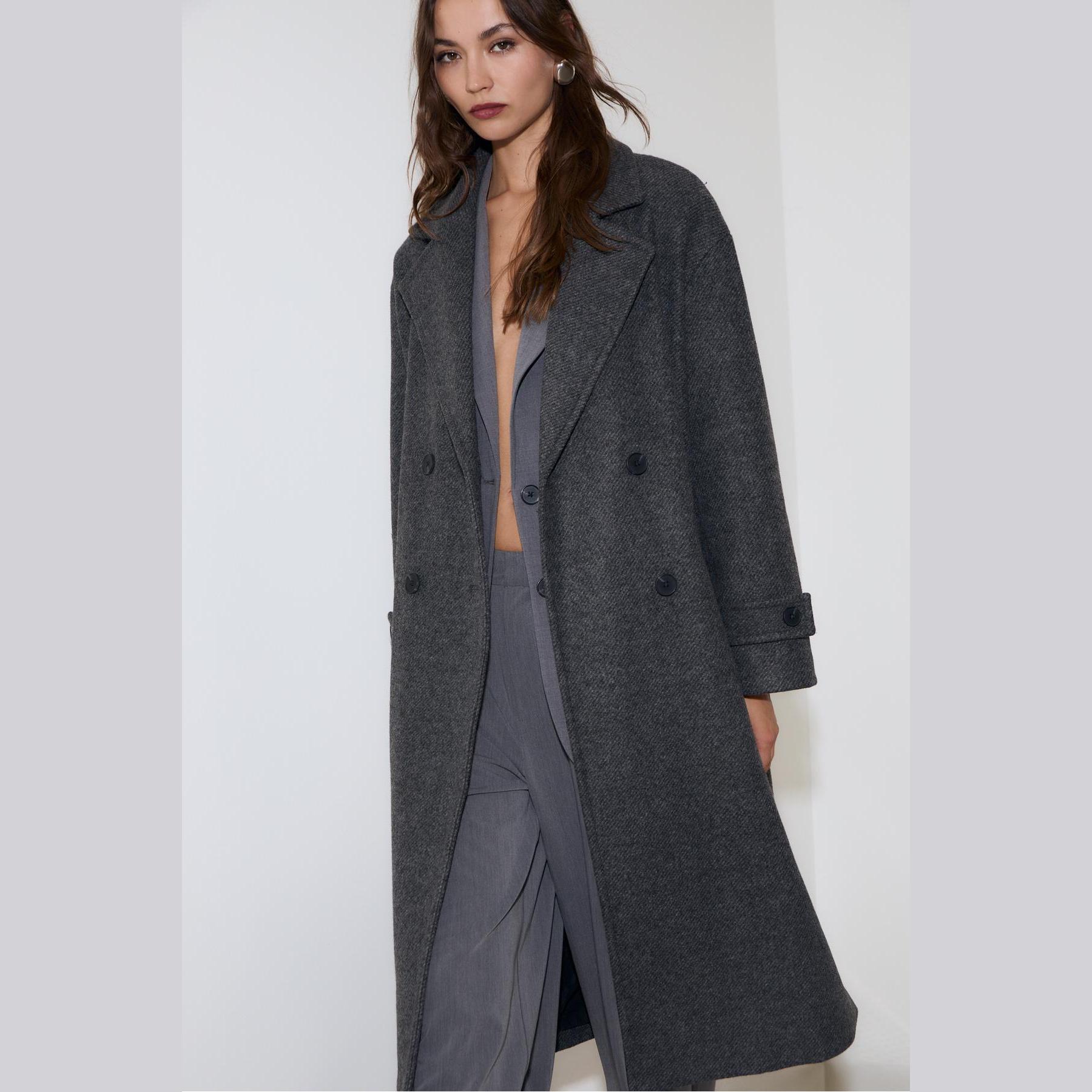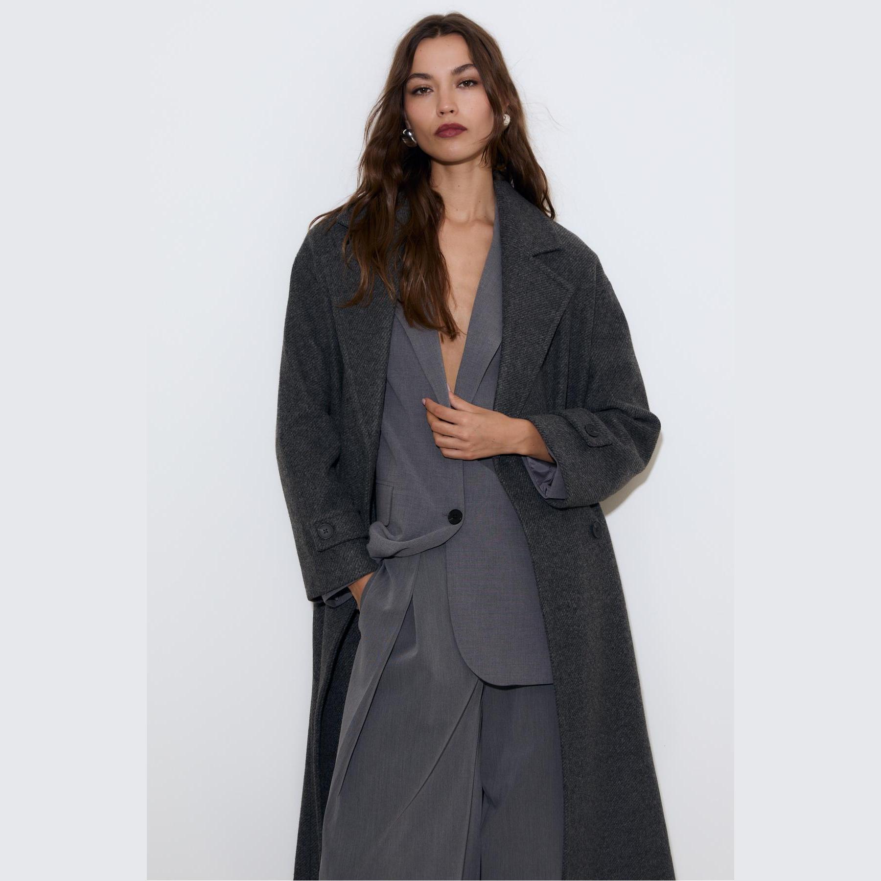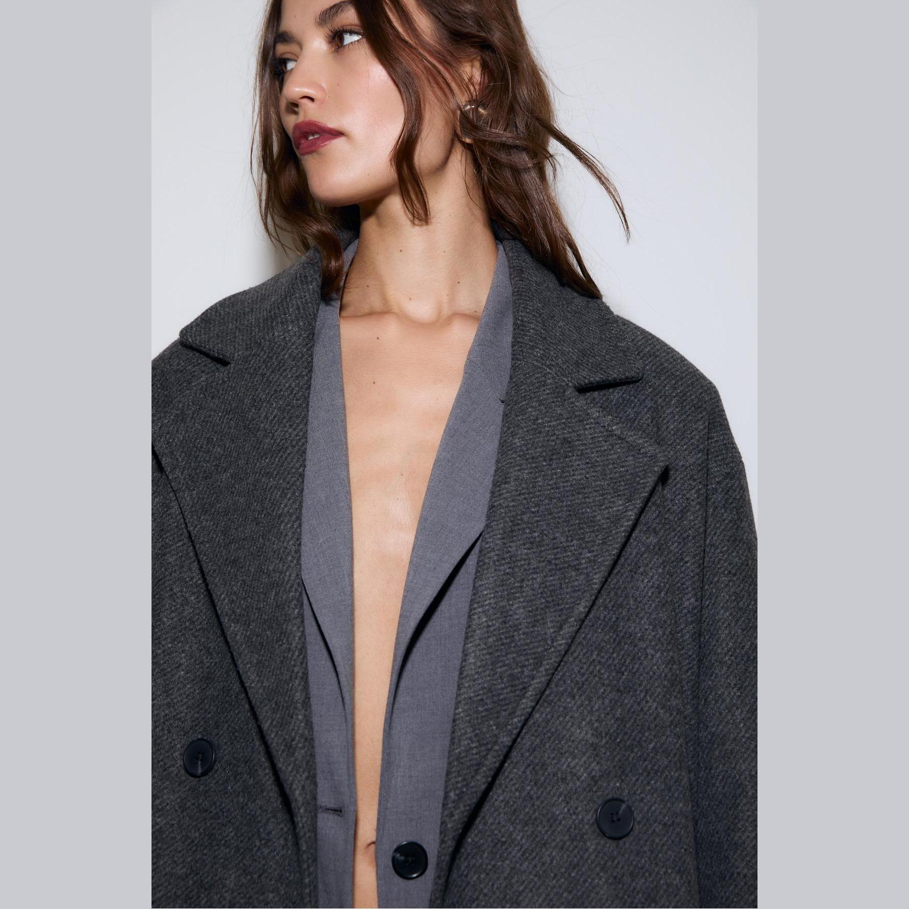 كابان أنيق من Stradivarius بلون رمادي غامق، مصنوع من خامة منسوجة ناعمة 100% بوليستر، بياقة كروڤاز كلاسيكية وقصة Oversize تمنحك مظهرًا عصريًا وراحة مثالية، يتميز بأزرار أمامية، أكمام طويلة بأطراف مشدودة وزر، وجيوب جانبية بيات، مثالي للتنسيق مع بناطيل جينز أو قطع رسمية لإطلالة شتوية مريحة ومتناسقة.