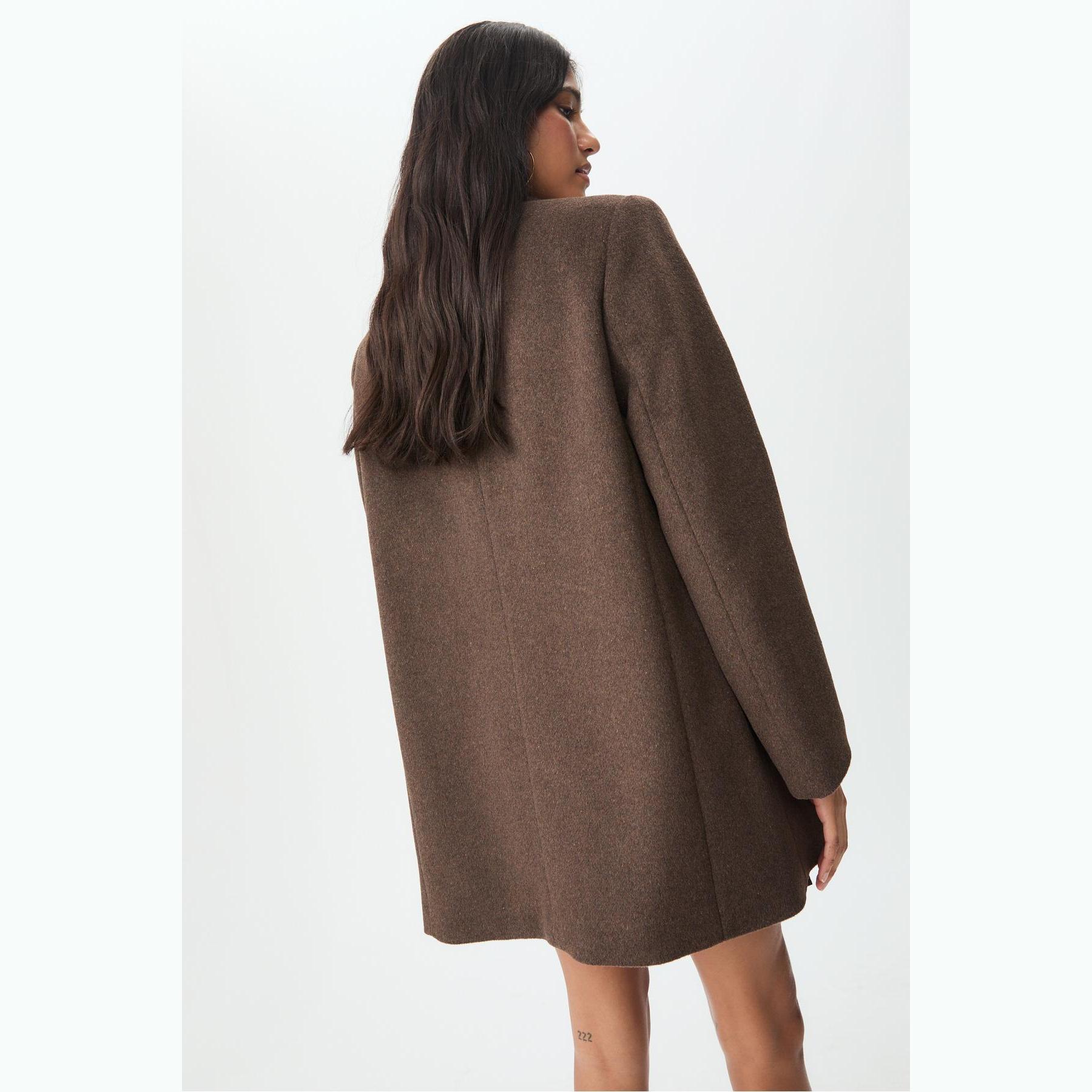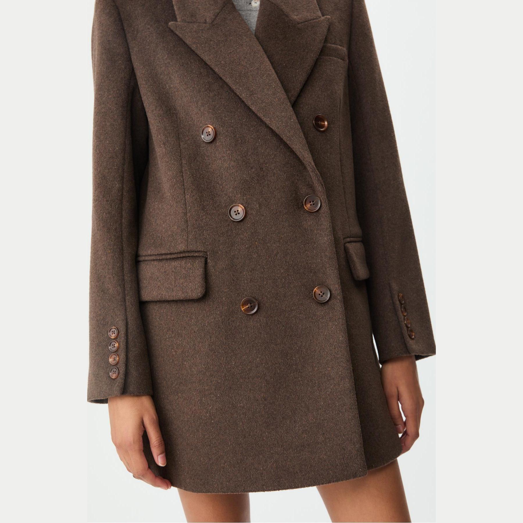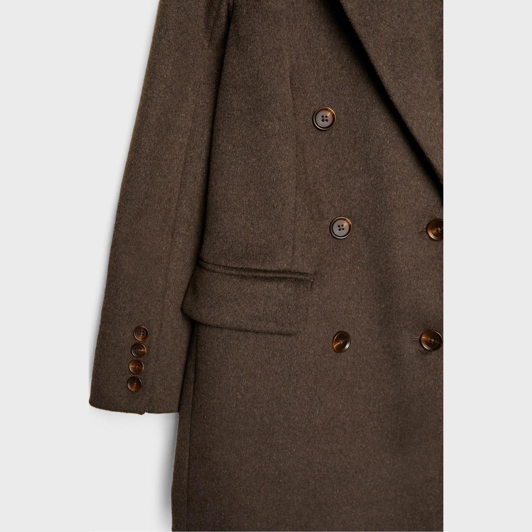 بالطو أنيق من Stradivarius بلون بني دافئ، مصنوع من خامة منسوجة ناعمة بتركيبة غنية بالصوف، بياقة كروڤاز كلاسيكية وقصة مستقيمة، يتميز بإغلاق أمامي مزدوج بالأزرار وجيوب بيات بغطاء، مثالي للتنسيق مع بناطيل رسمية أو جينز لإطلالة شتوية أنيقة وعملية.