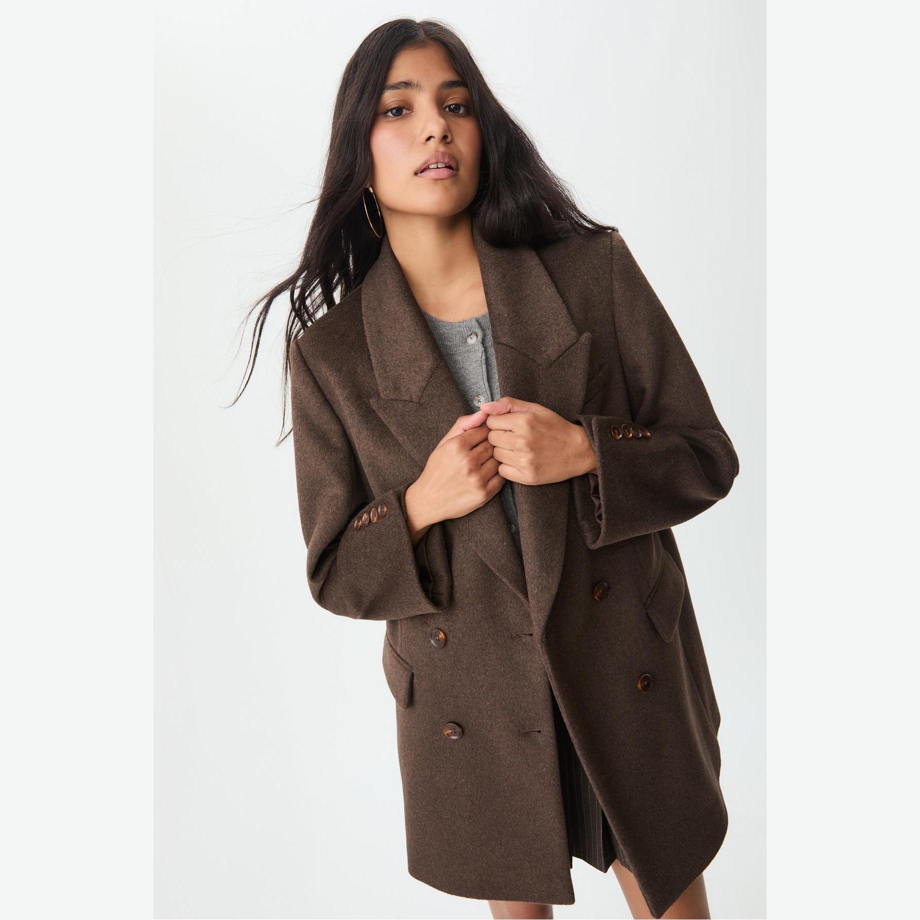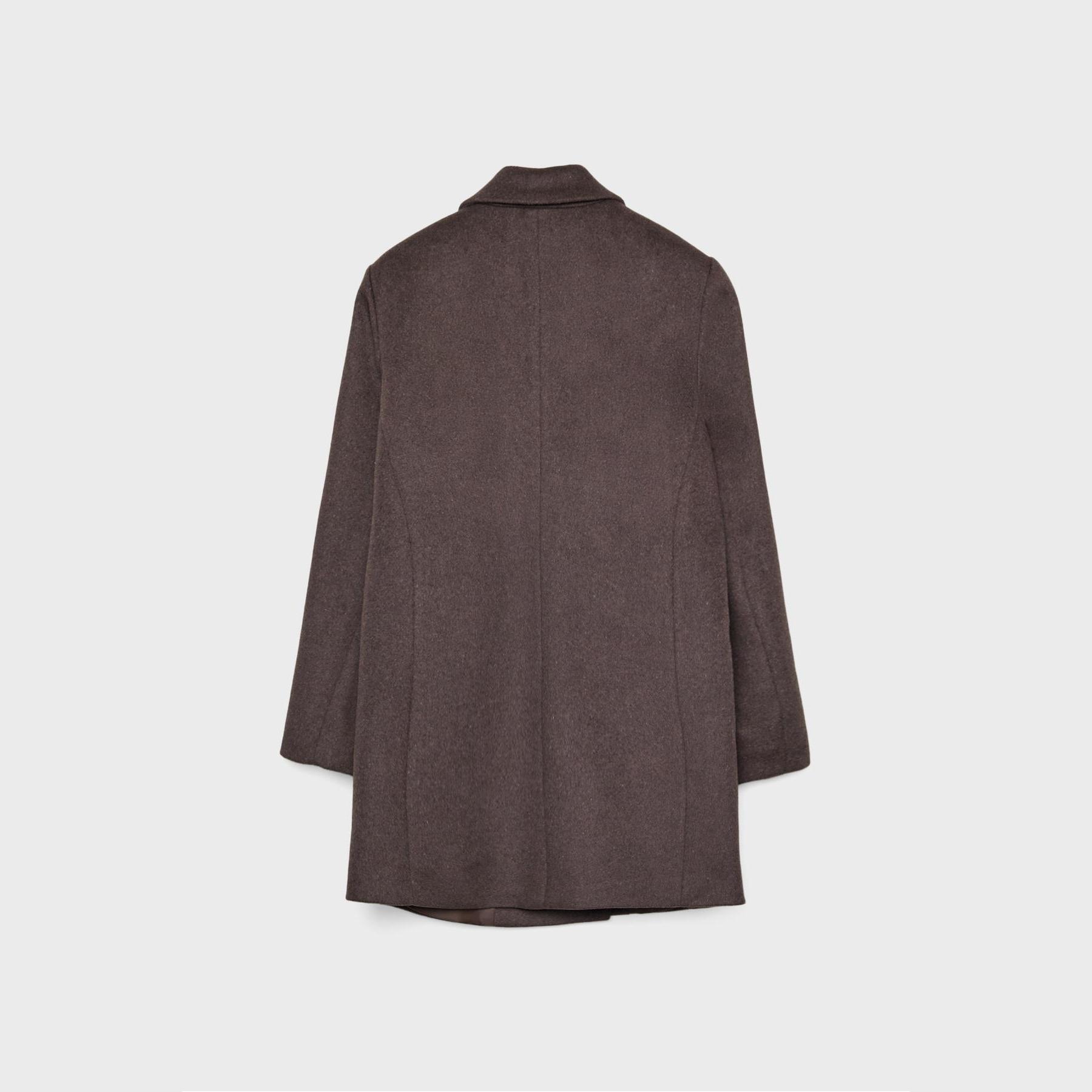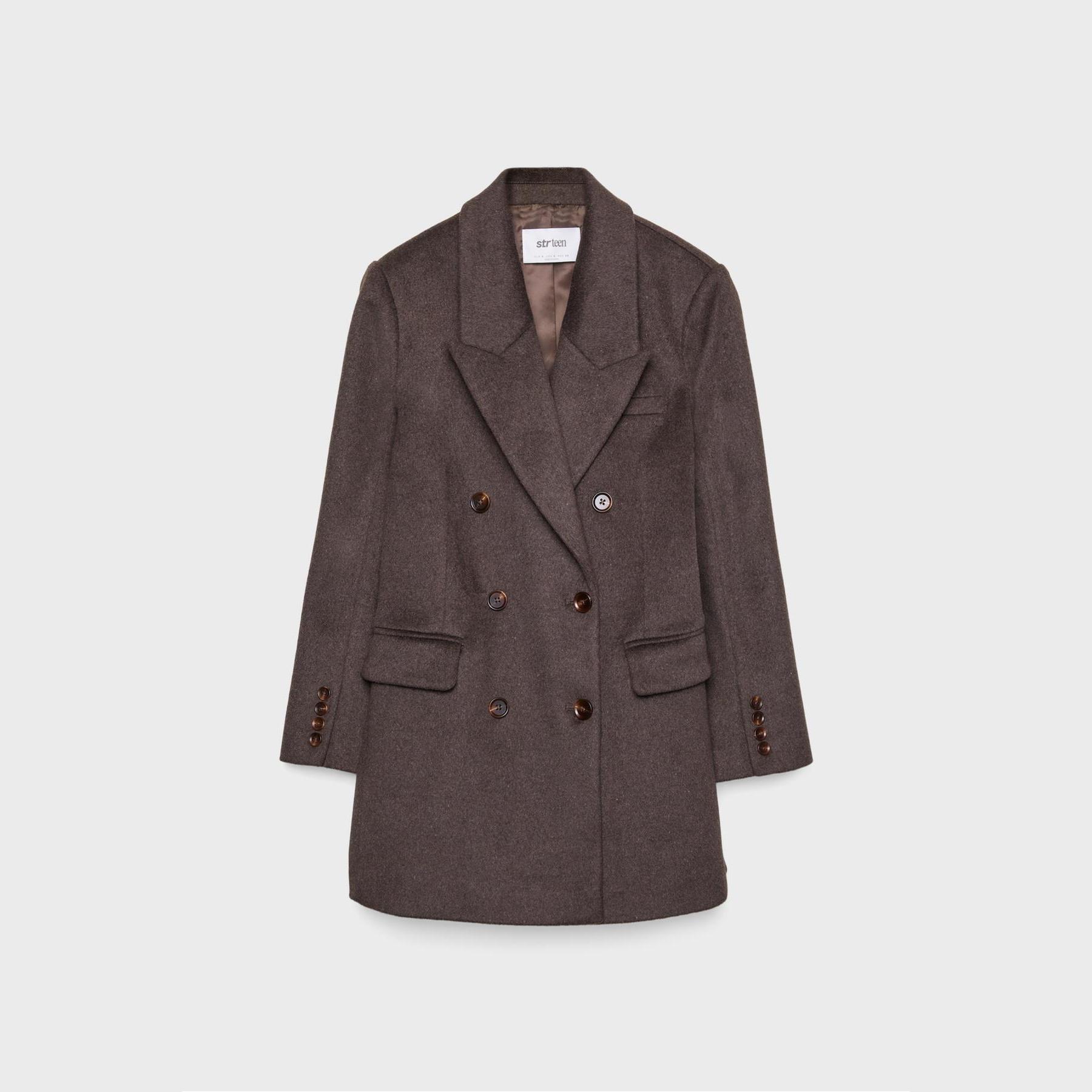 بالطو أنيق من Stradivarius بلون بني دافئ، مصنوع من خامة منسوجة ناعمة بتركيبة غنية بالصوف، بياقة كروڤاز كلاسيكية وقصة مستقيمة، يتميز بإغلاق أمامي مزدوج بالأزرار وجيوب بيات بغطاء، مثالي للتنسيق مع بناطيل رسمية أو جينز لإطلالة شتوية أنيقة وعملية.