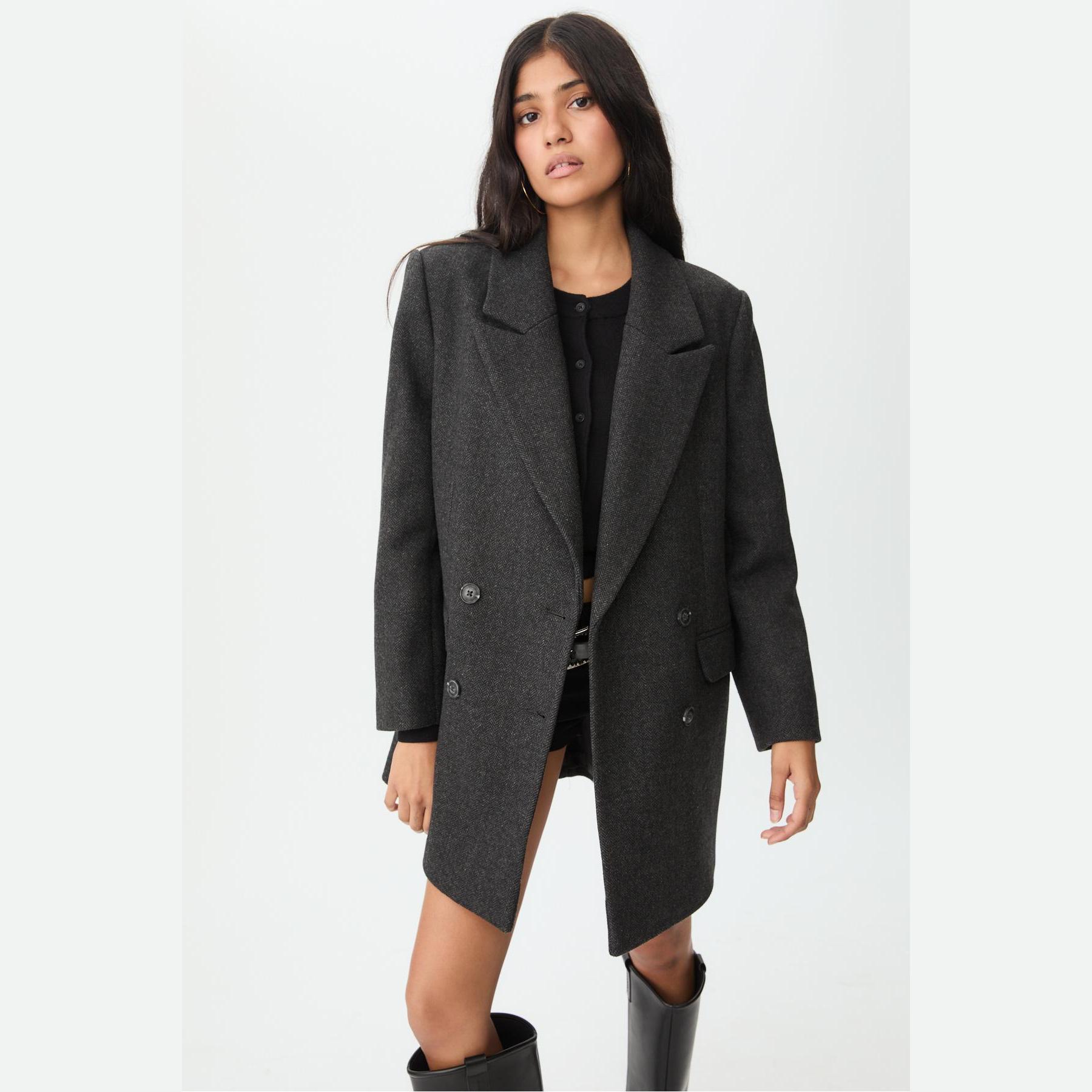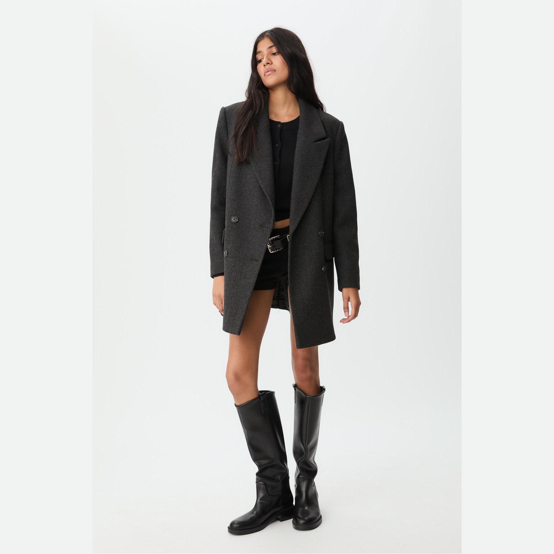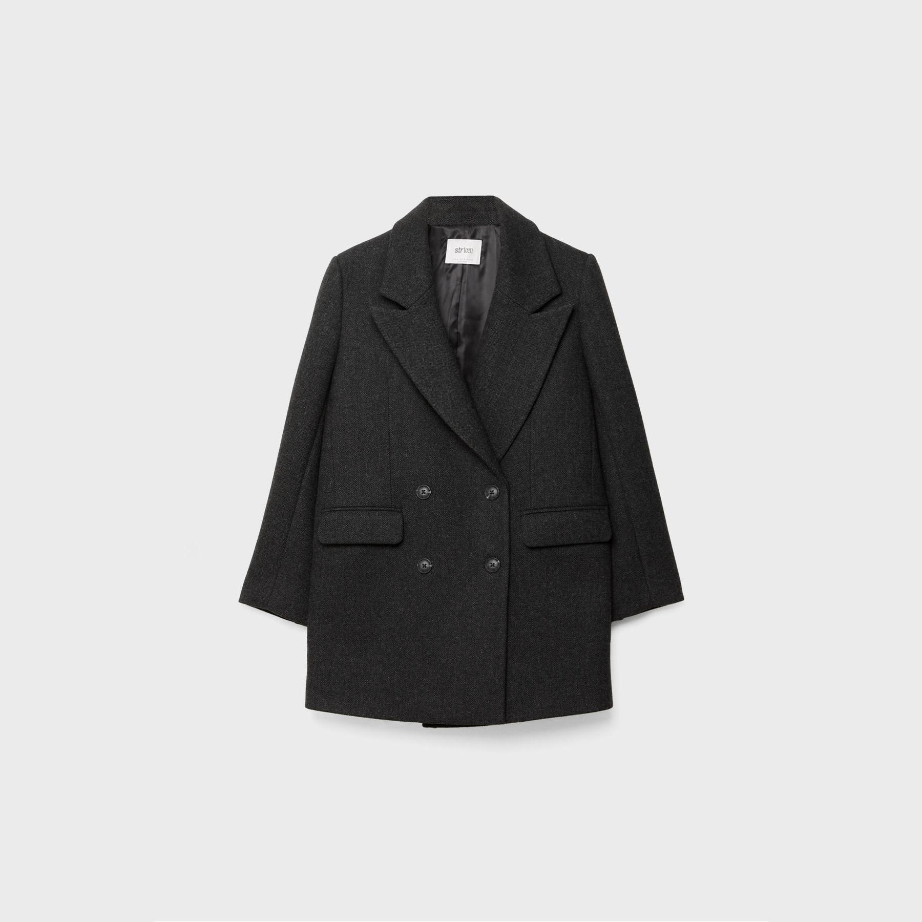 بالطو أنيق من Stradivarius بلون رمادي هادئ، مصنوع من خامة منسوجة بنقشة البالِك سِرتي بتركيبة غنية بالصوف، بياقة كروڤاز كلاسيكية وقصة مستقيمة، يتميز بإغلاق أمامي مزدوج بالأزرار وجيوب بيات بغطاء، مثالي للتنسيق مع بناطيل رسمية أو جينز لإطلالة شتوية أنيقة وعملية.