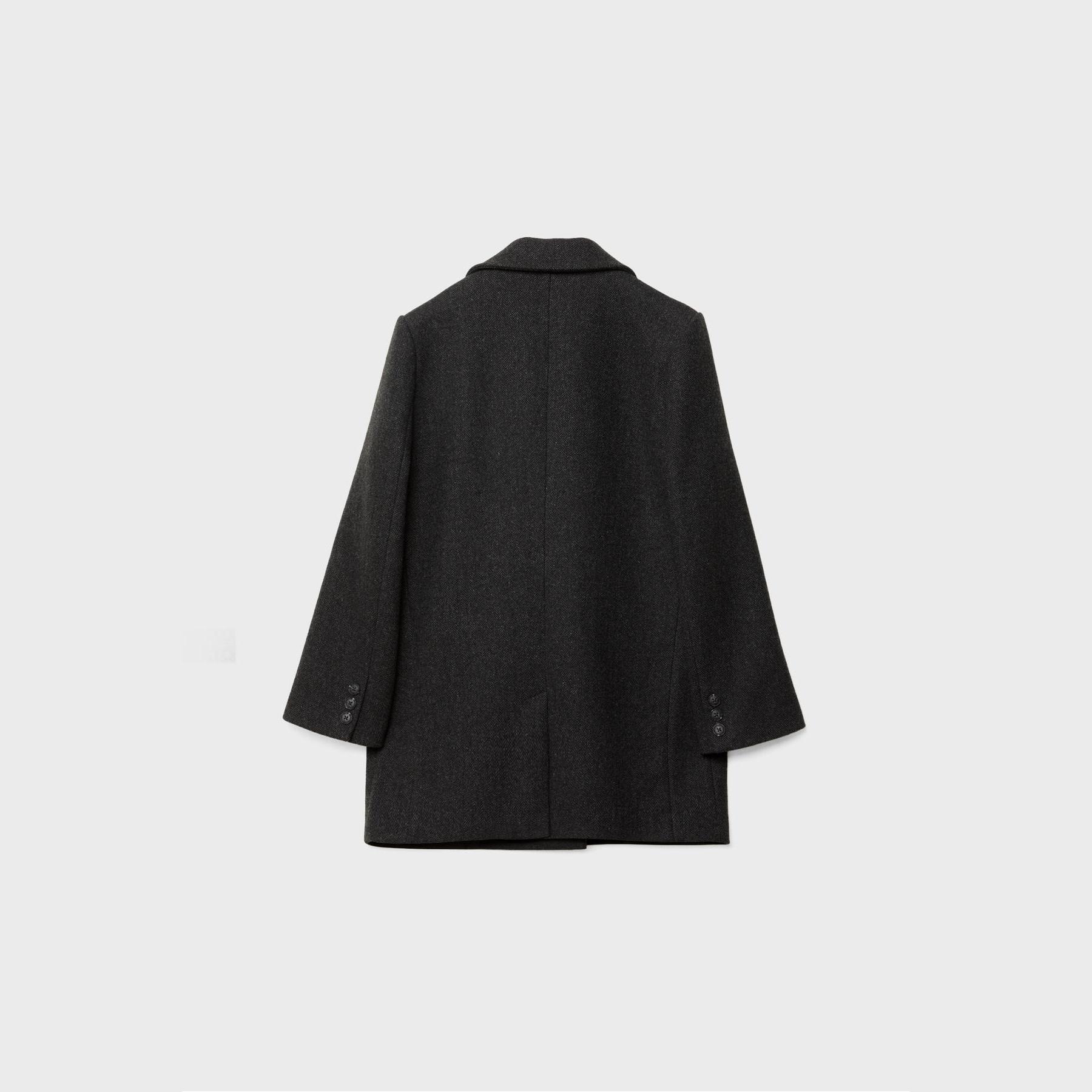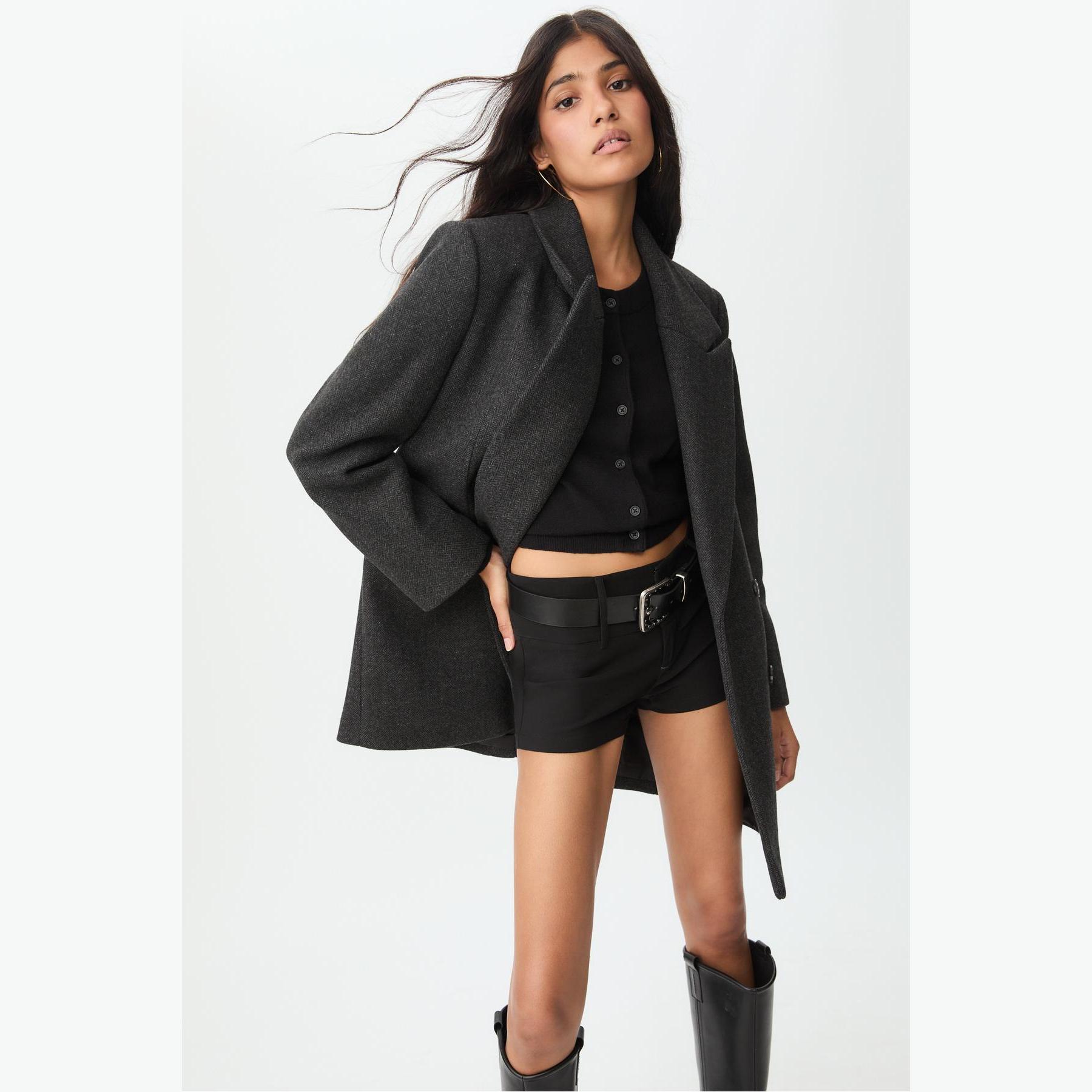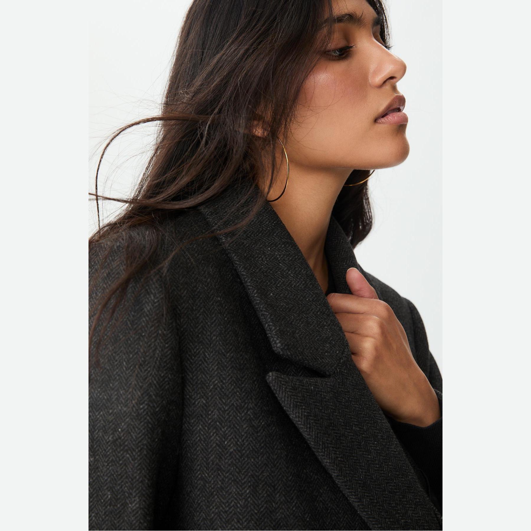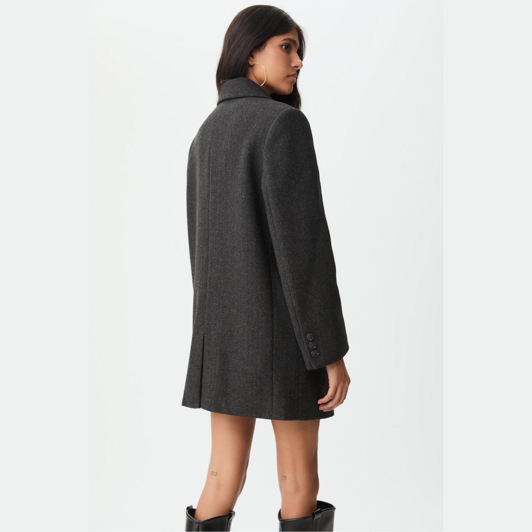 بالطو أنيق من Stradivarius بلون رمادي هادئ، مصنوع من خامة منسوجة بنقشة البالِك سِرتي بتركيبة غنية بالصوف، بياقة كروڤاز كلاسيكية وقصة مستقيمة، يتميز بإغلاق أمامي مزدوج بالأزرار وجيوب بيات بغطاء، مثالي للتنسيق مع بناطيل رسمية أو جينز لإطلالة شتوية أنيقة وعملية.