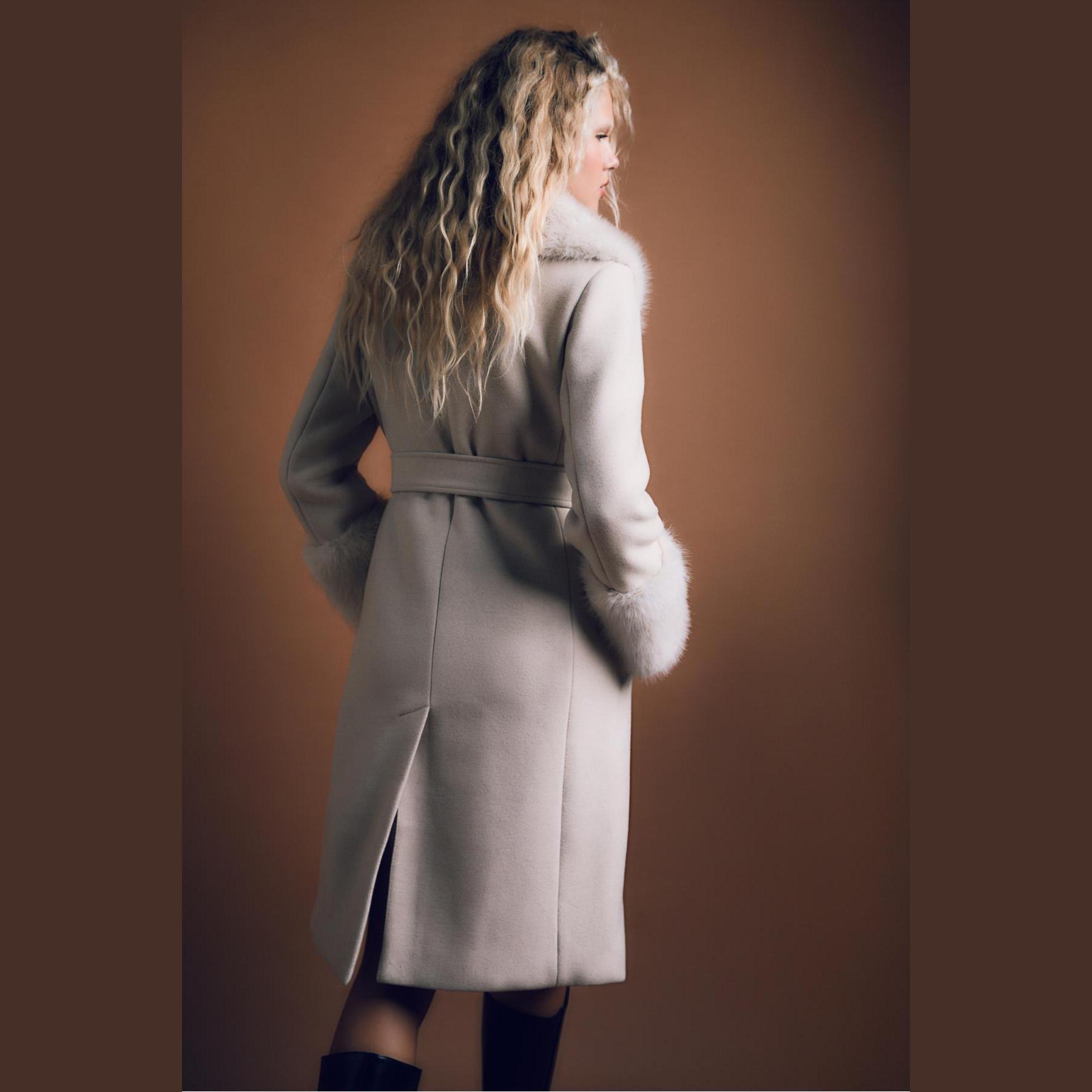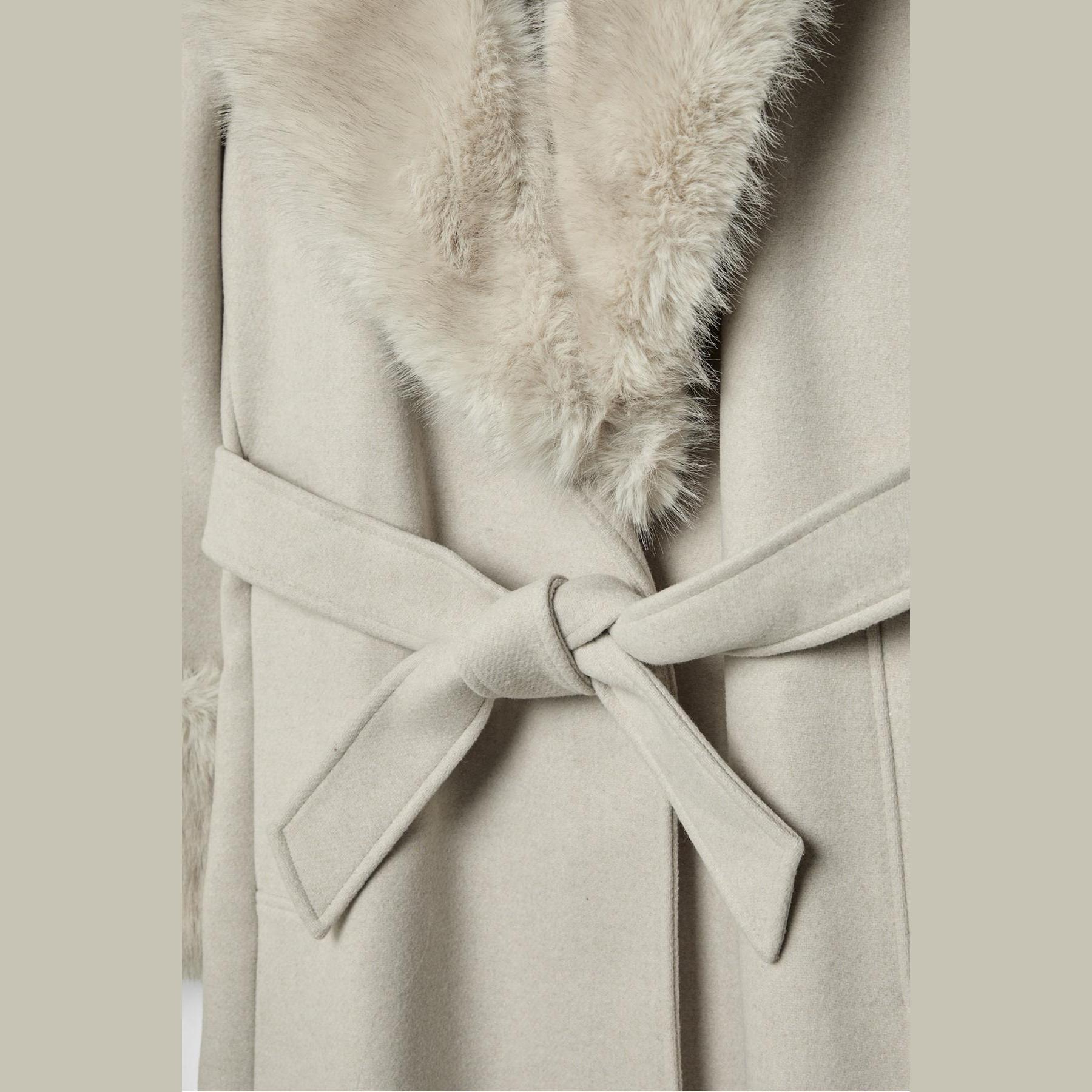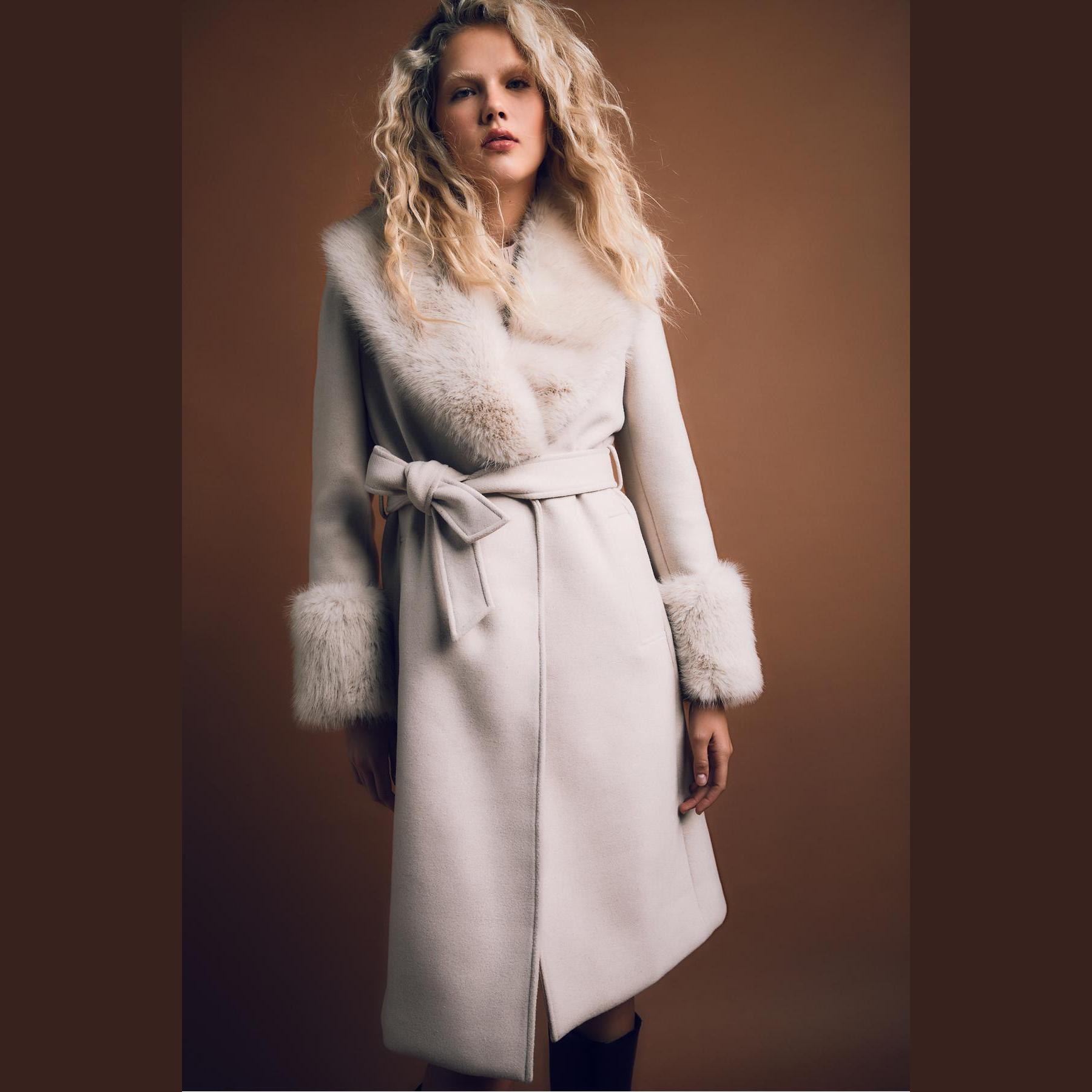 • التصميم: كابان طويل، بياقة عالية، بأكمام طويلة، حزام خصر، تفاصيل فرو قابلة للإزالة